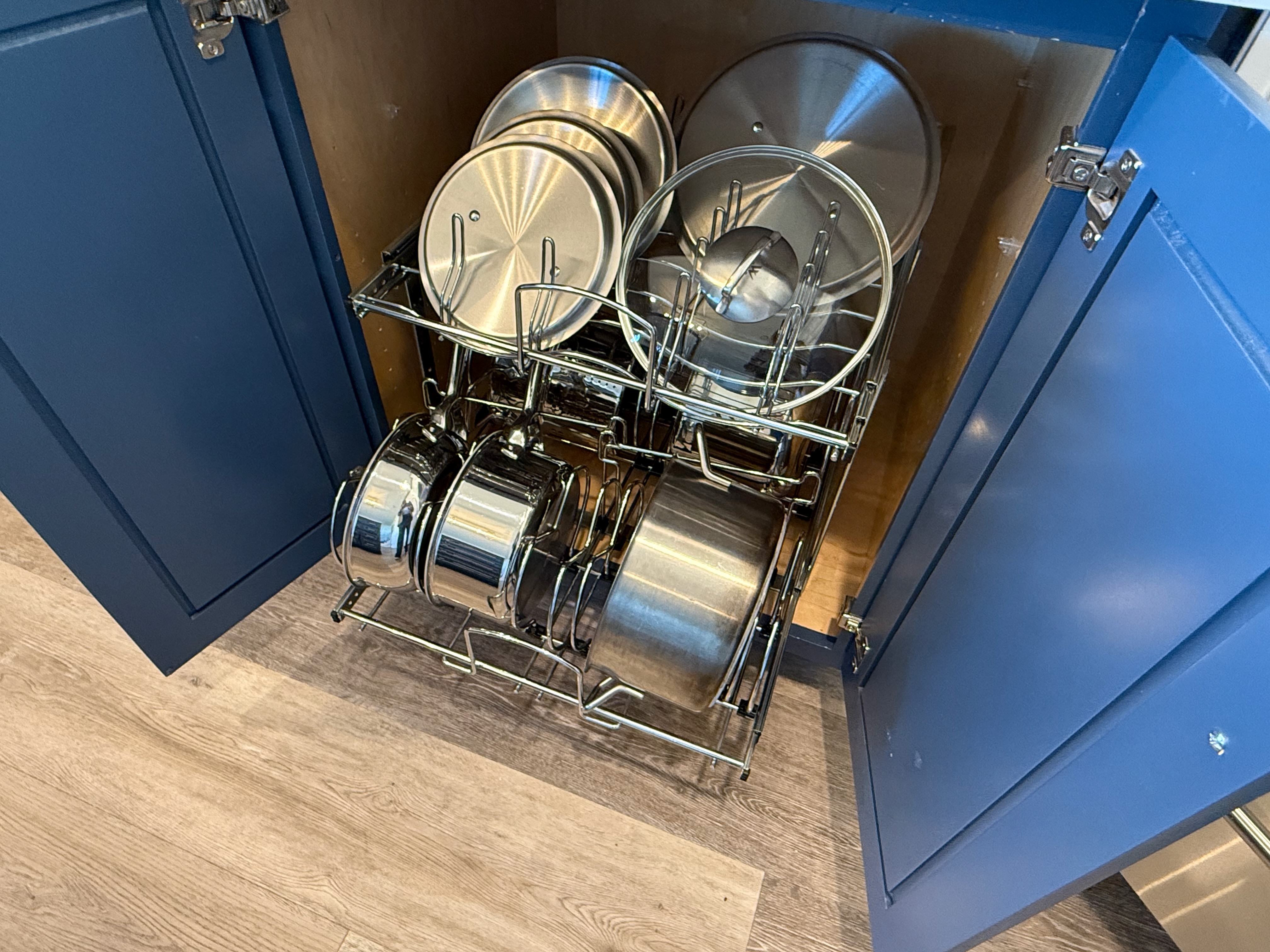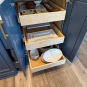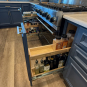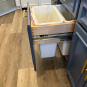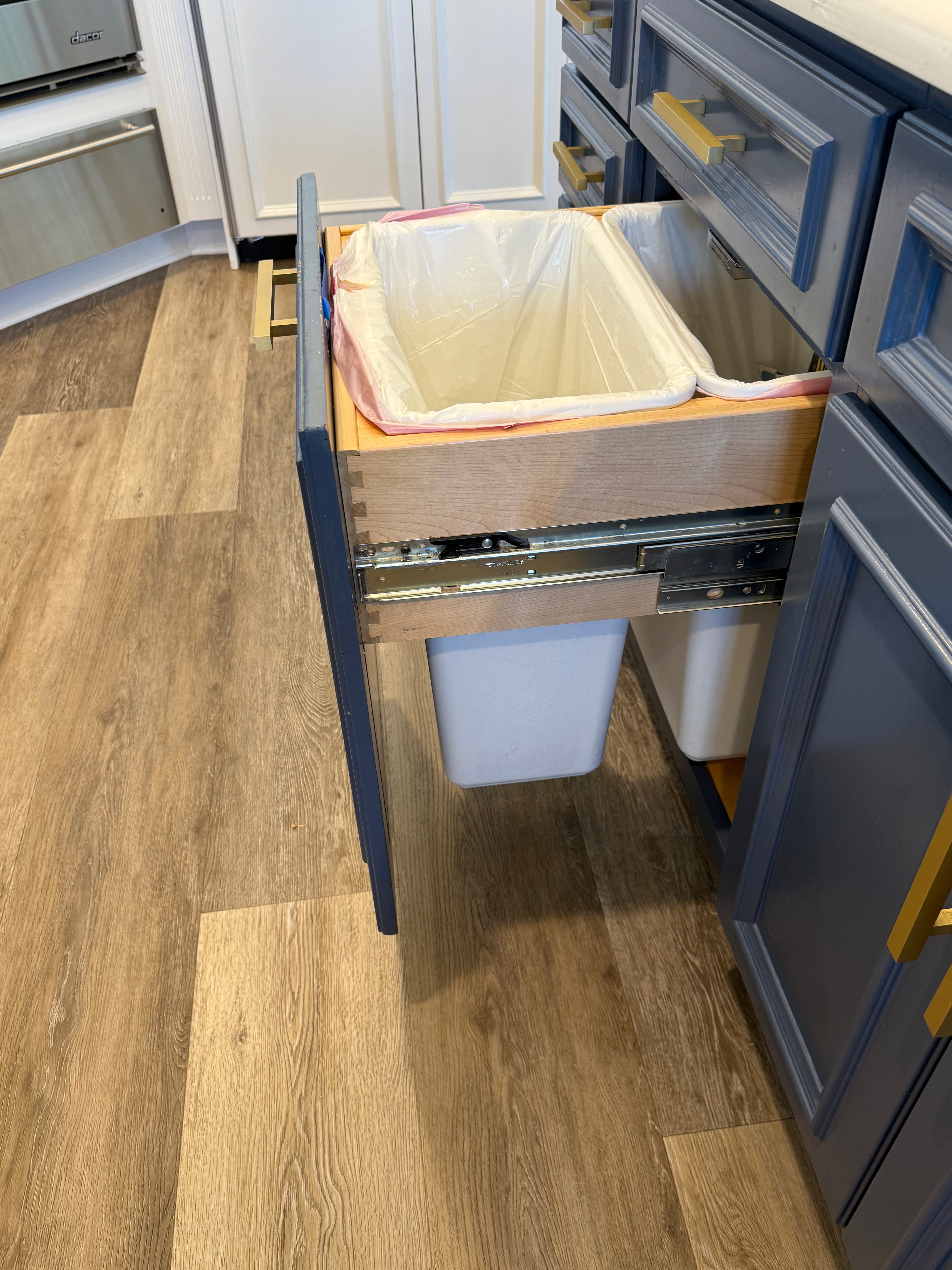 1-One drawer, One door base cabinet w/ two trash cans inside Dim.: 21”w x 34 1/2” cabinet/ 36”h w/ crown x 24”d