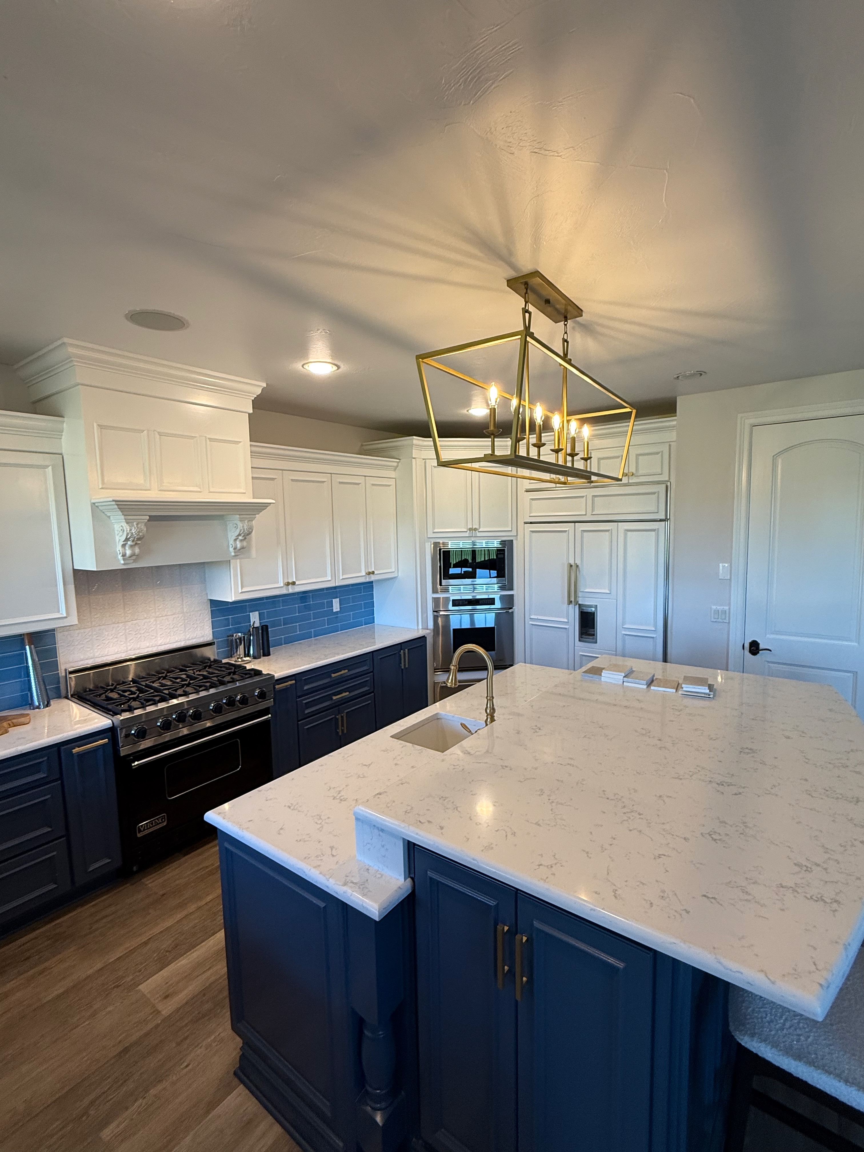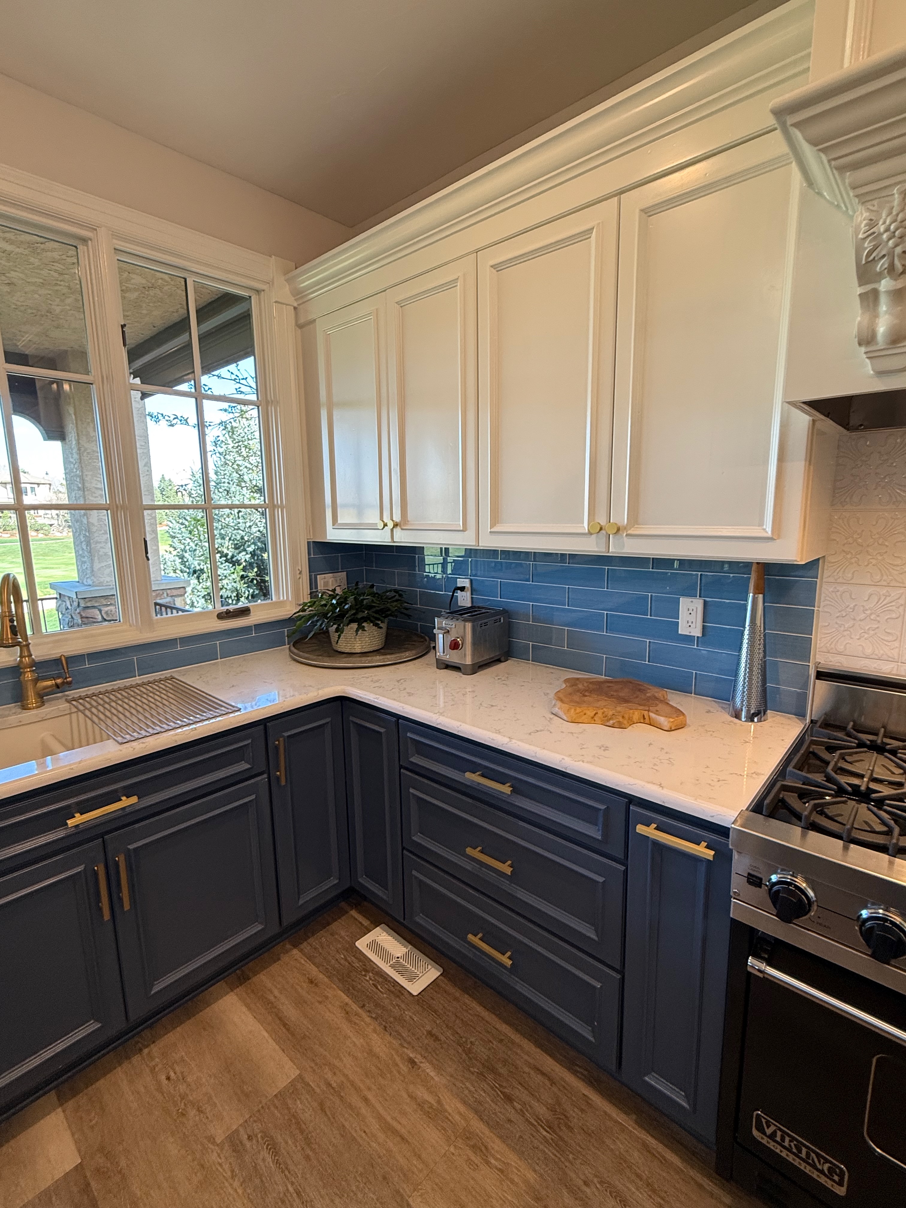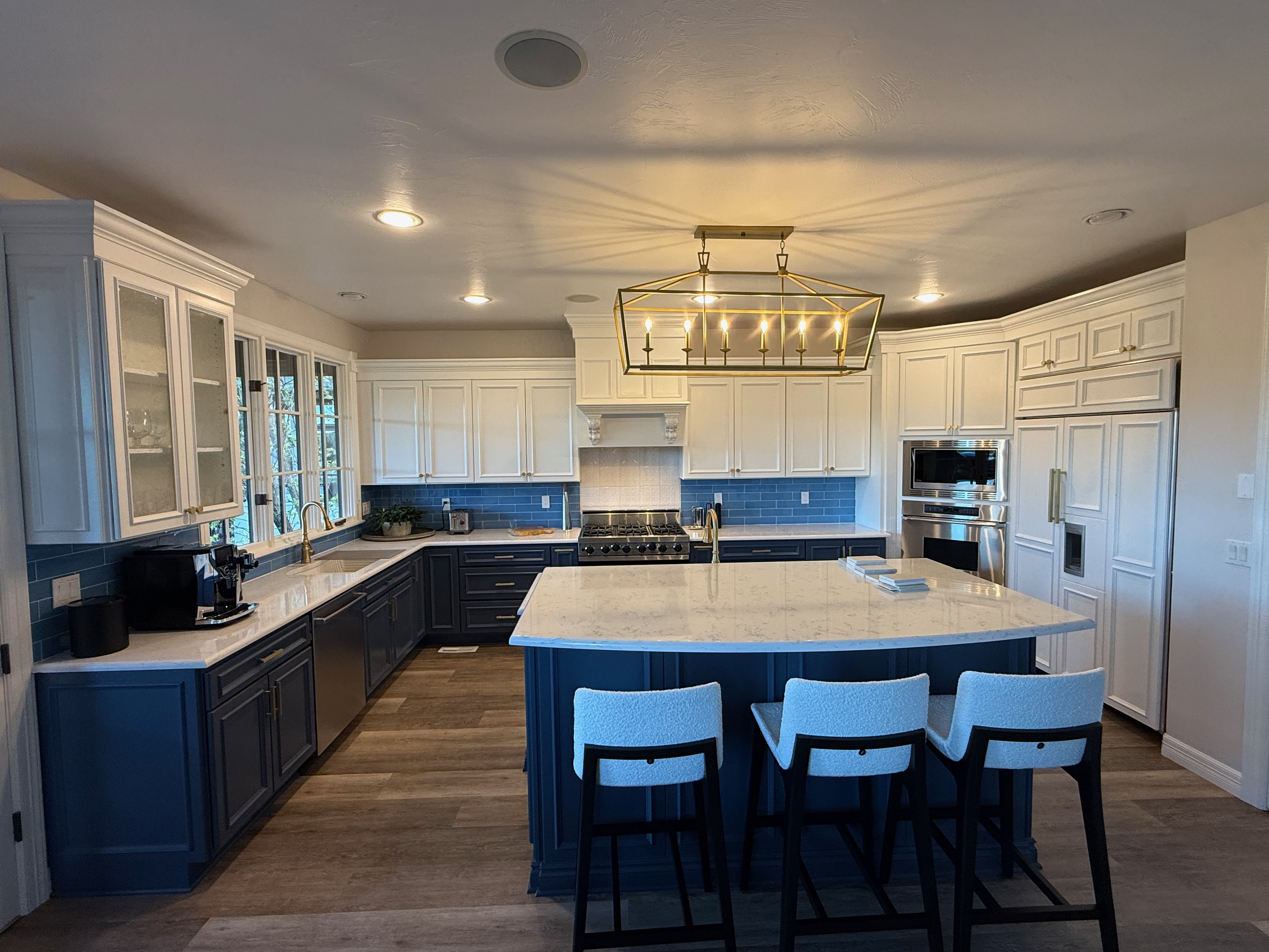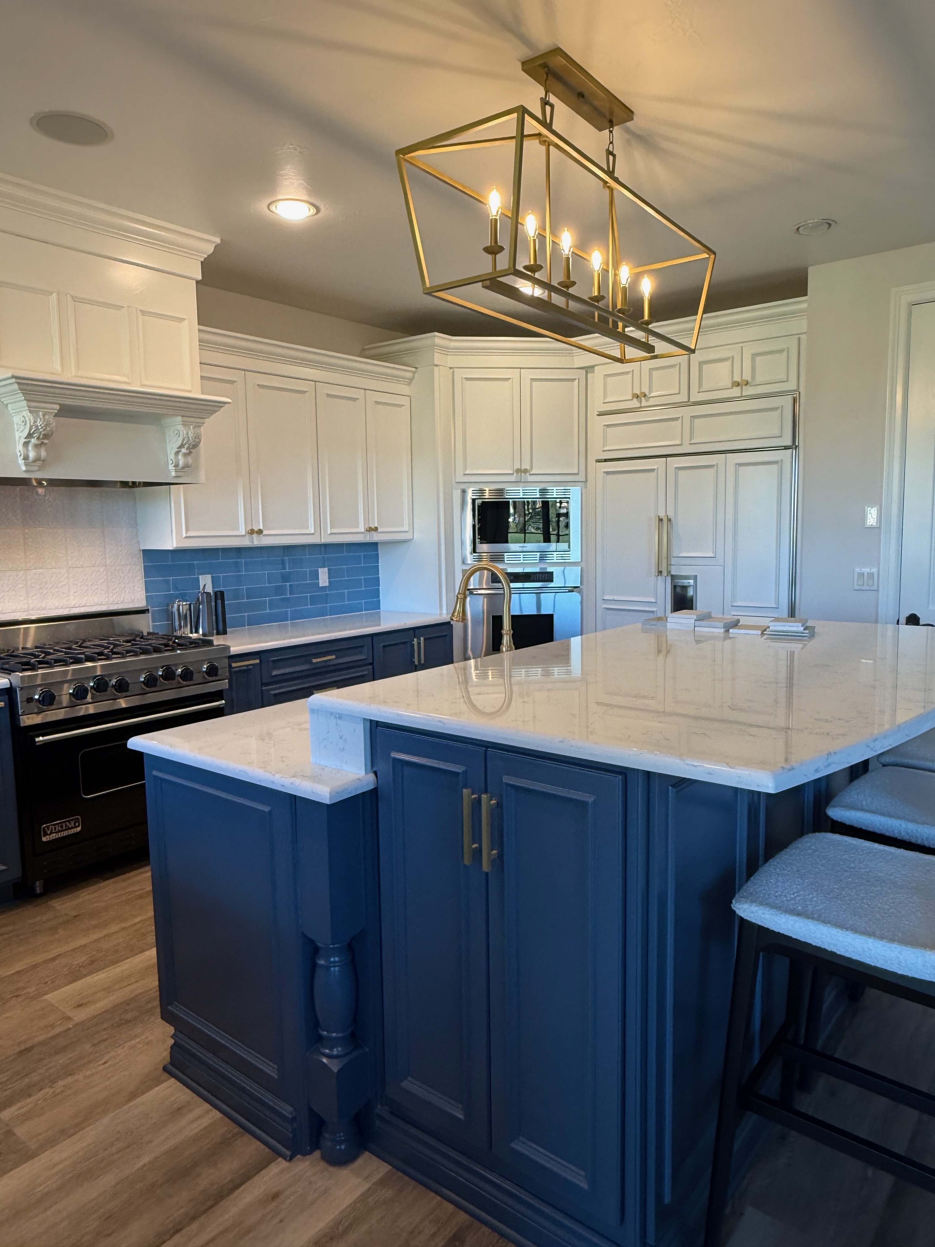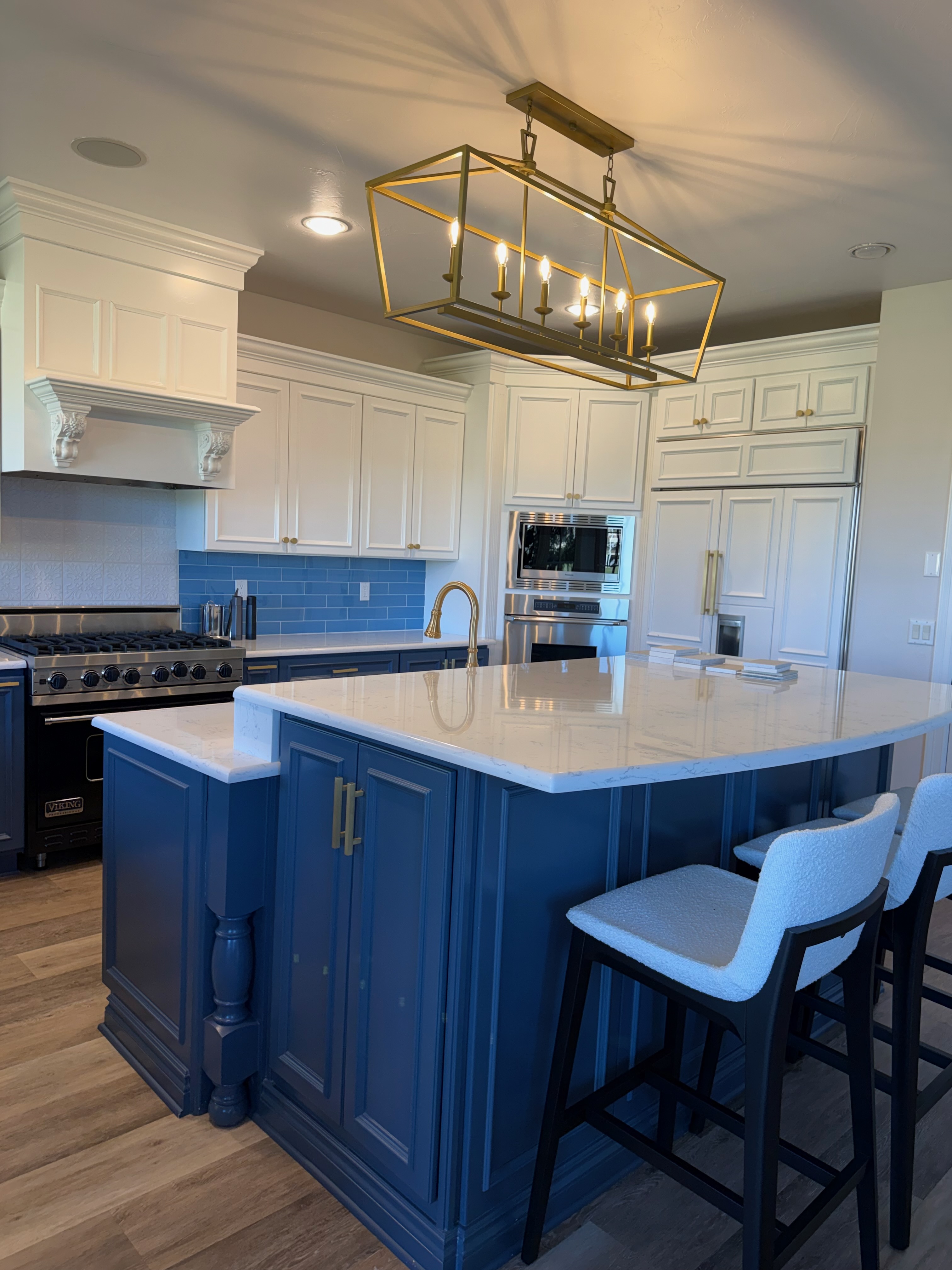This transitional, modern style kitchen features shaker style cabinets which are timeless and versatile with a classic white upper cabinet with lower cabinets in a popular blue sophisticated contrast. The quartz countertops and brushed brass door hardware lends a traditional elegant feel. The kitchen package comes with luxury Viking, Sub-Zero and Dacor appliances. Available early July tbd. Price for the package below. Available tbd early July.