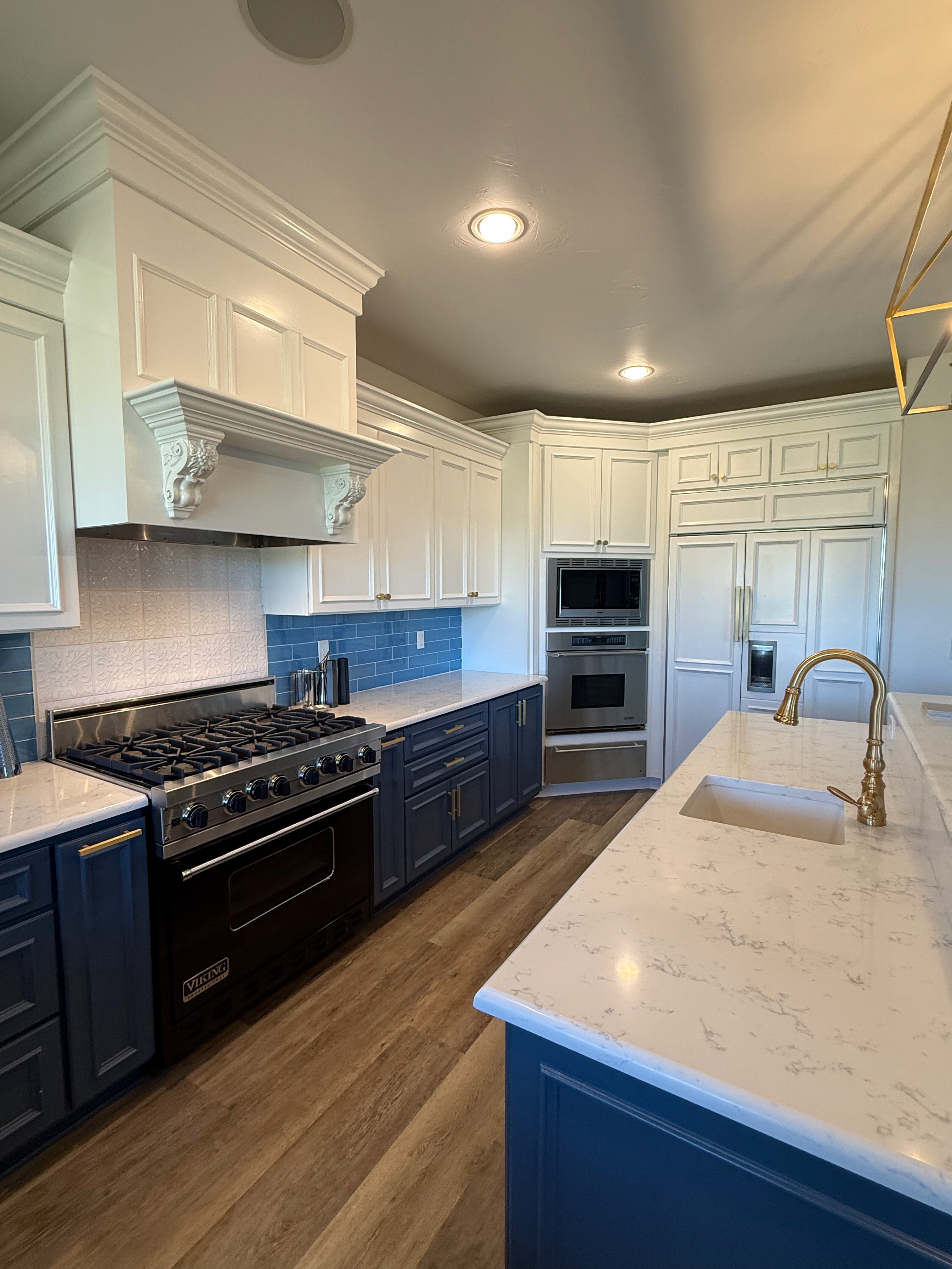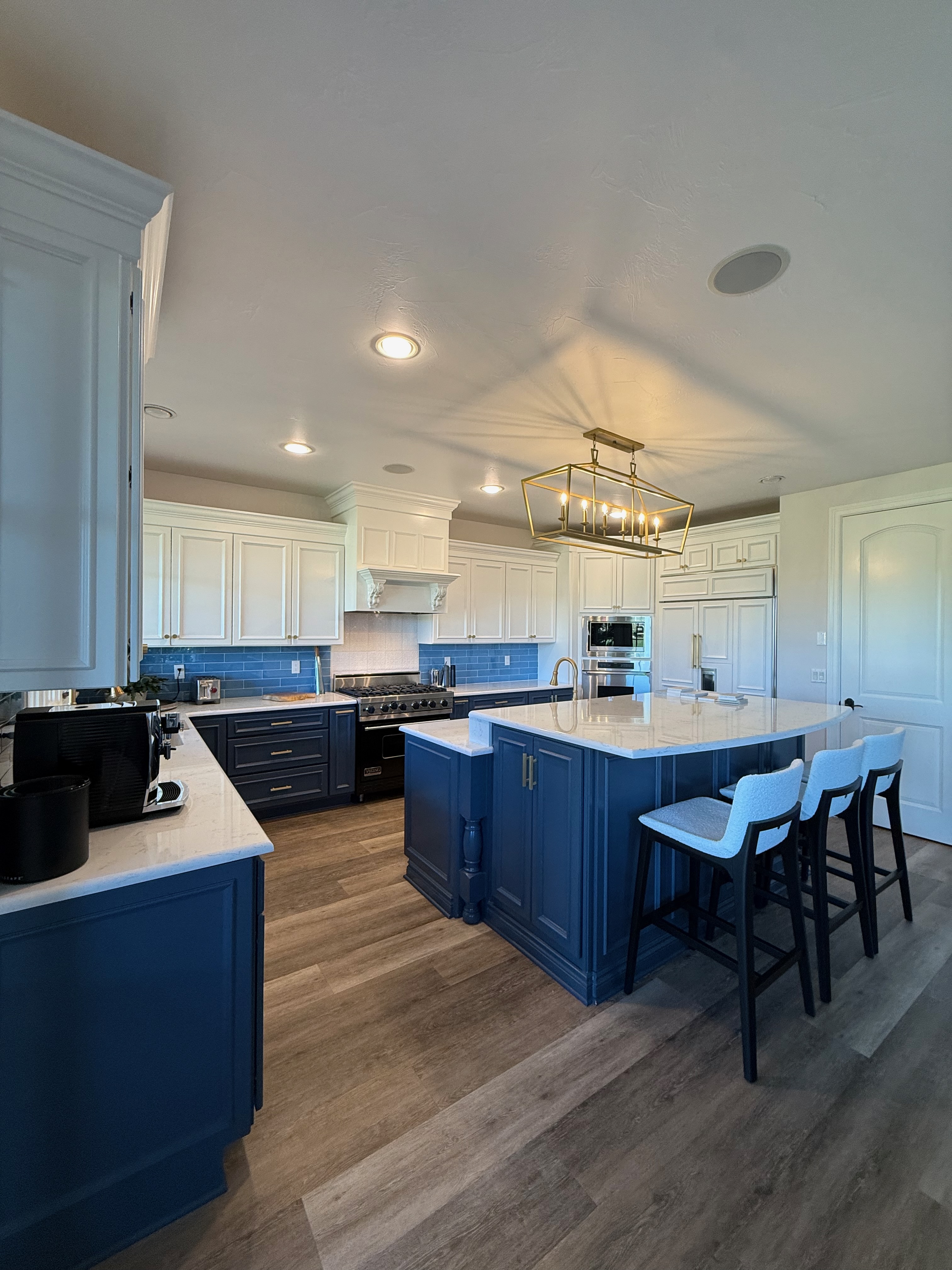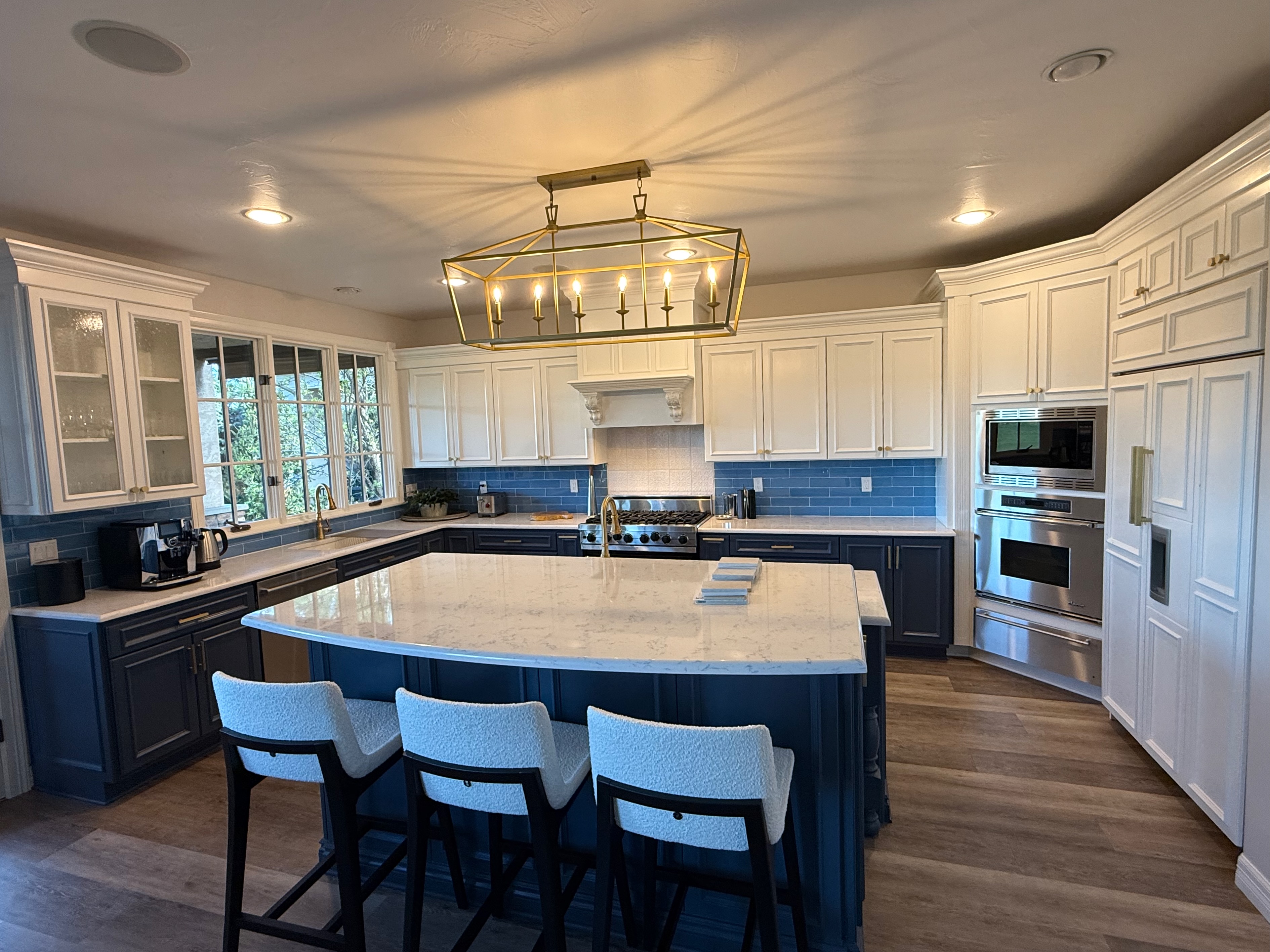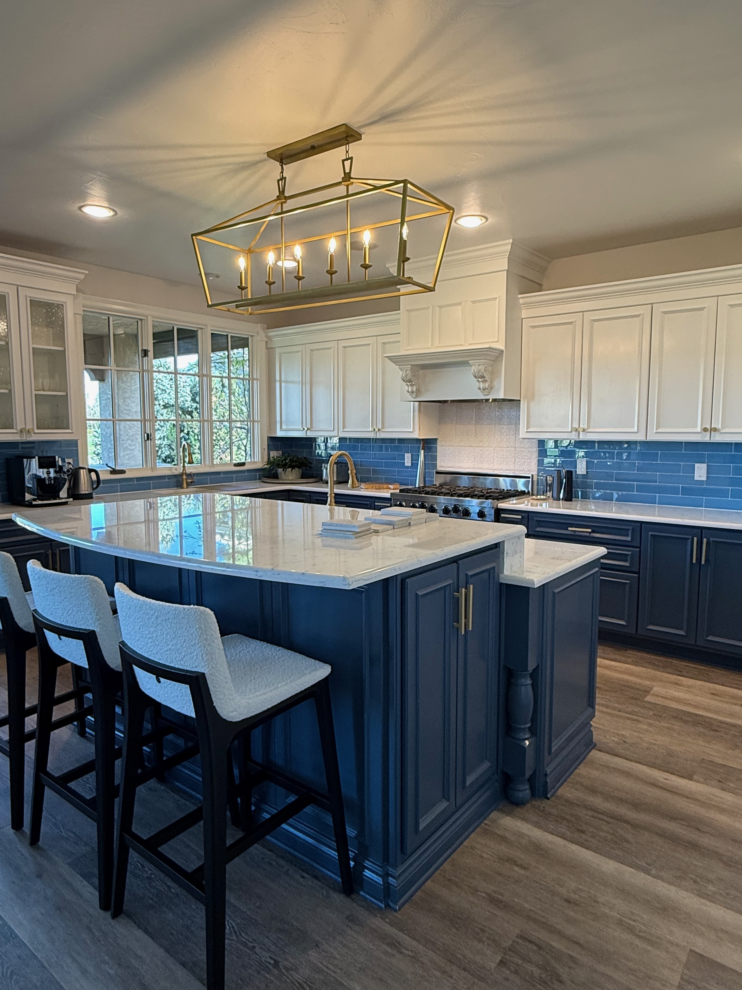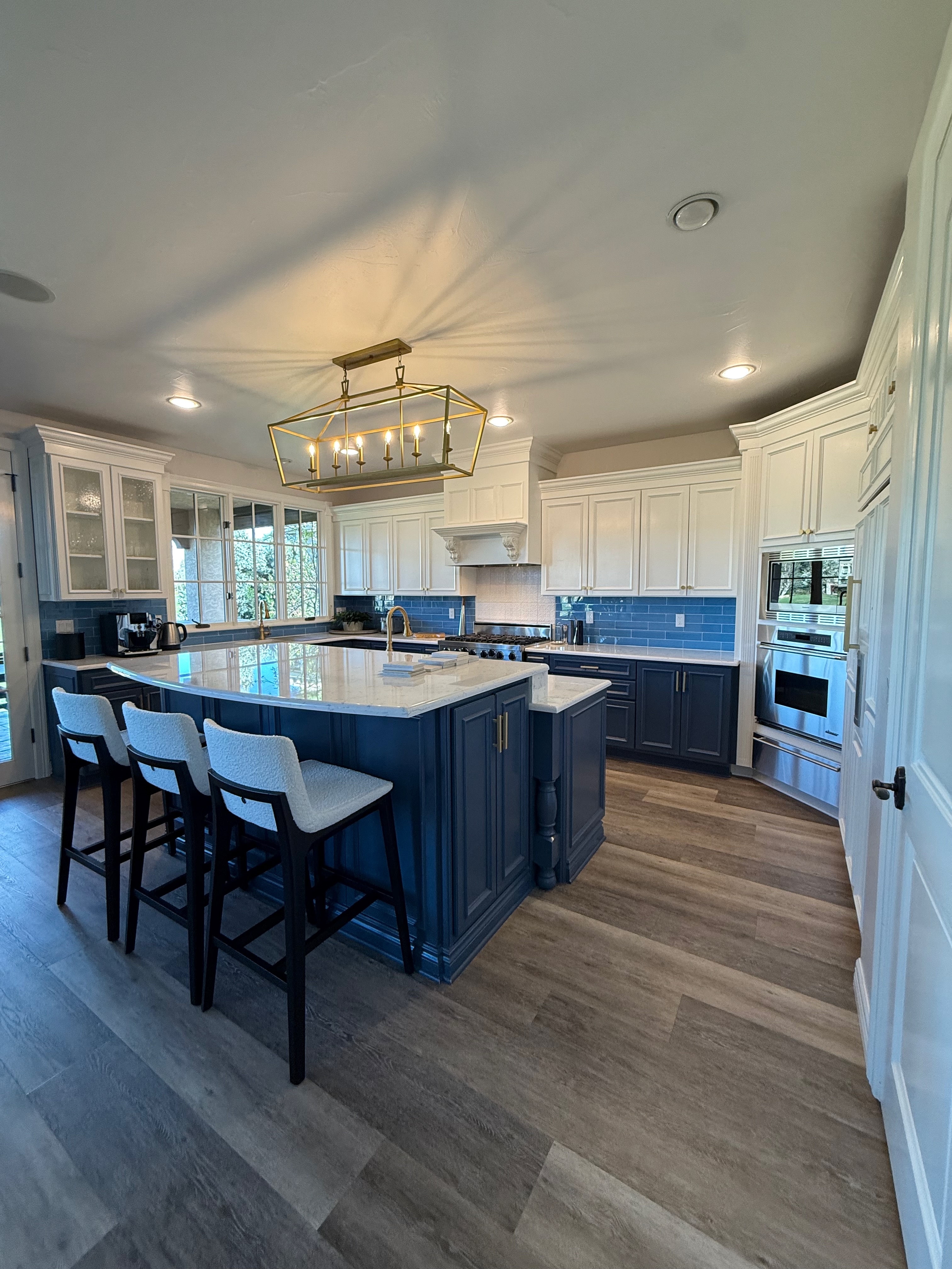 This transitional, modern style kitchen features shaker style cabinets which are timeless and versatile with a classic white upper cabinet with lower cabinets in a popular blue sophisticated contrast. The quartz countertops and brushed brass door hardware lends a traditional elegant feel. The kitchen package comes with luxury Viking, Sub-Zero and Dacor appliances. Available early July tbd. Price for the package below. Available tbd early July.