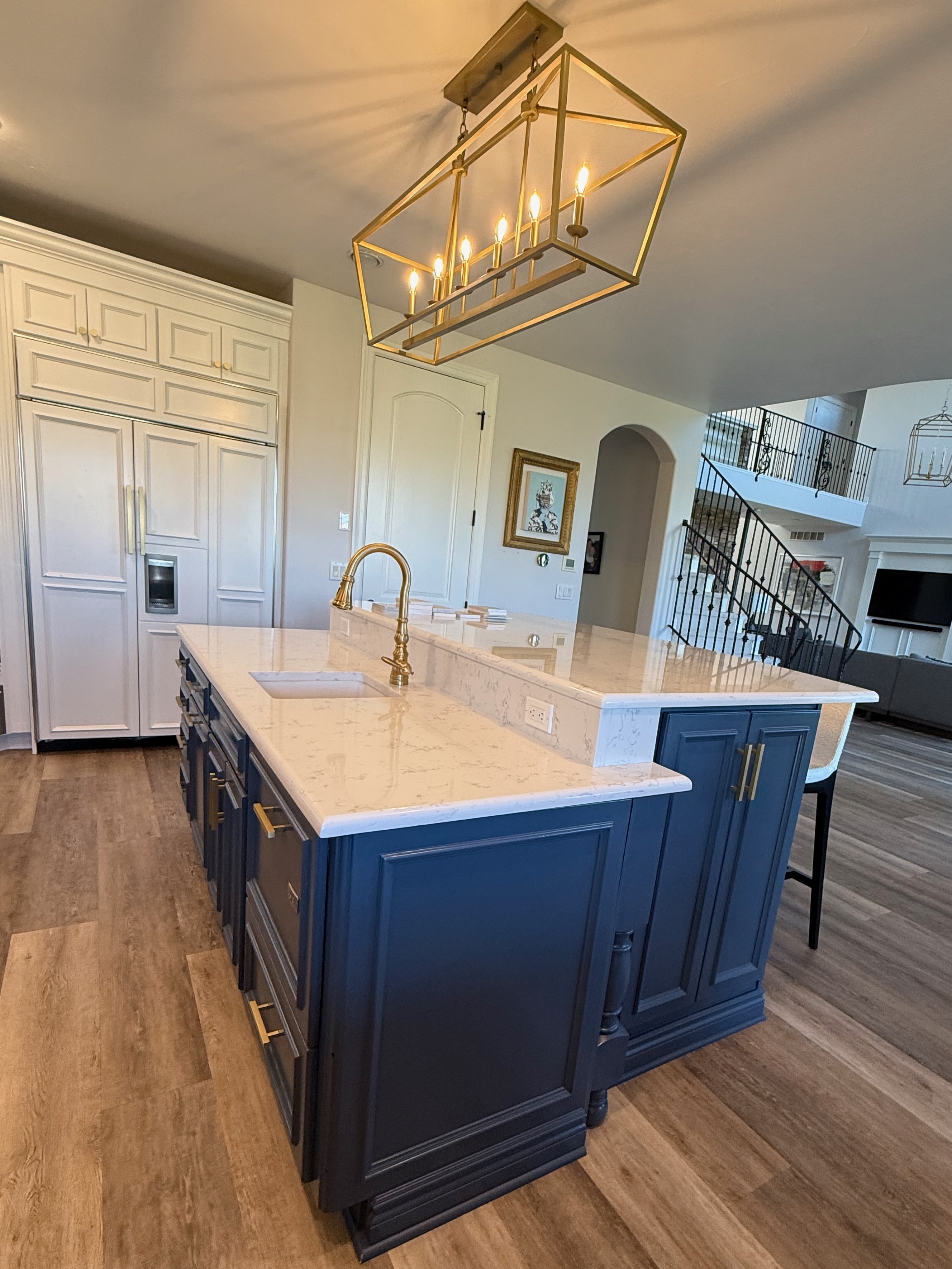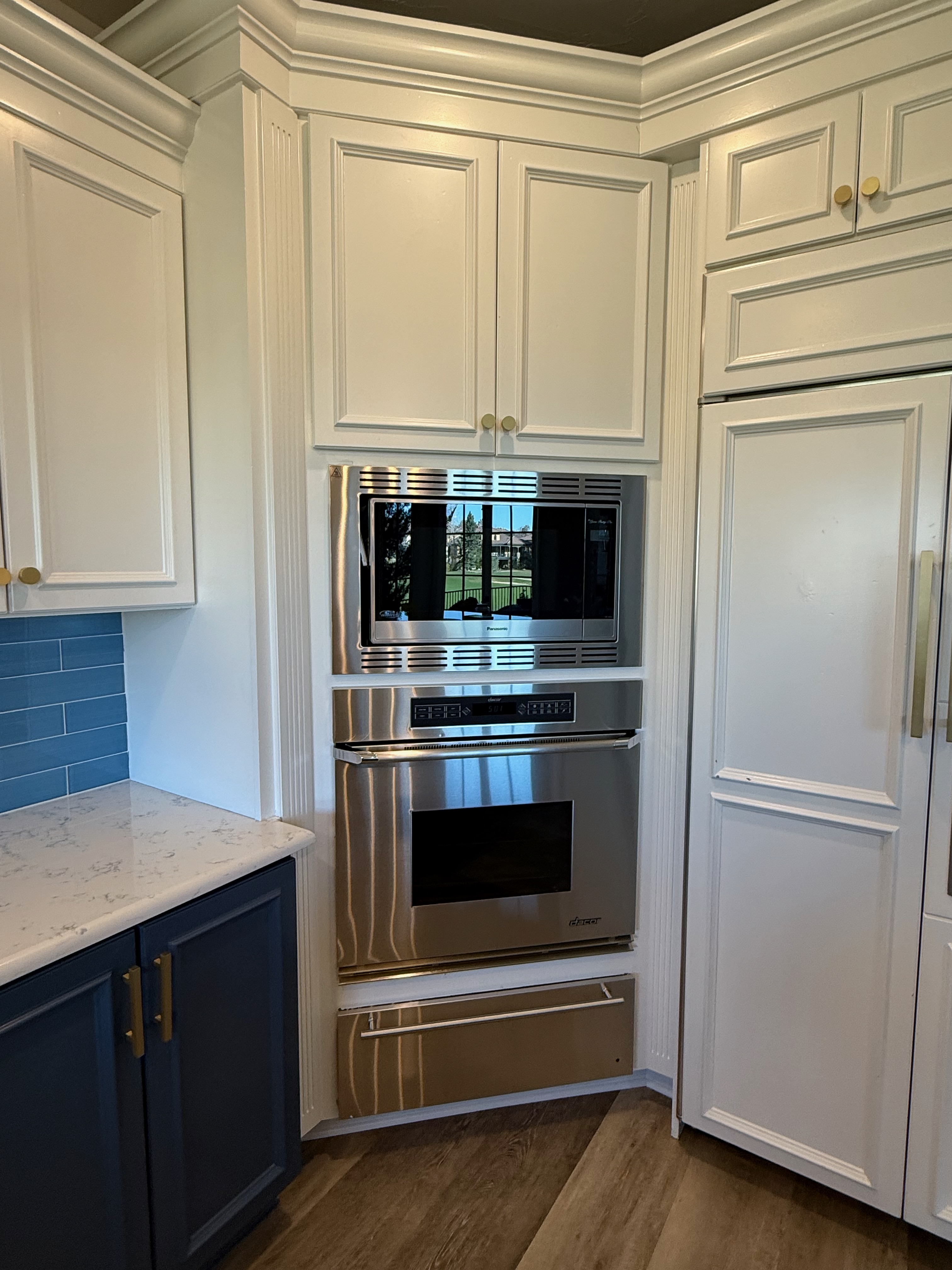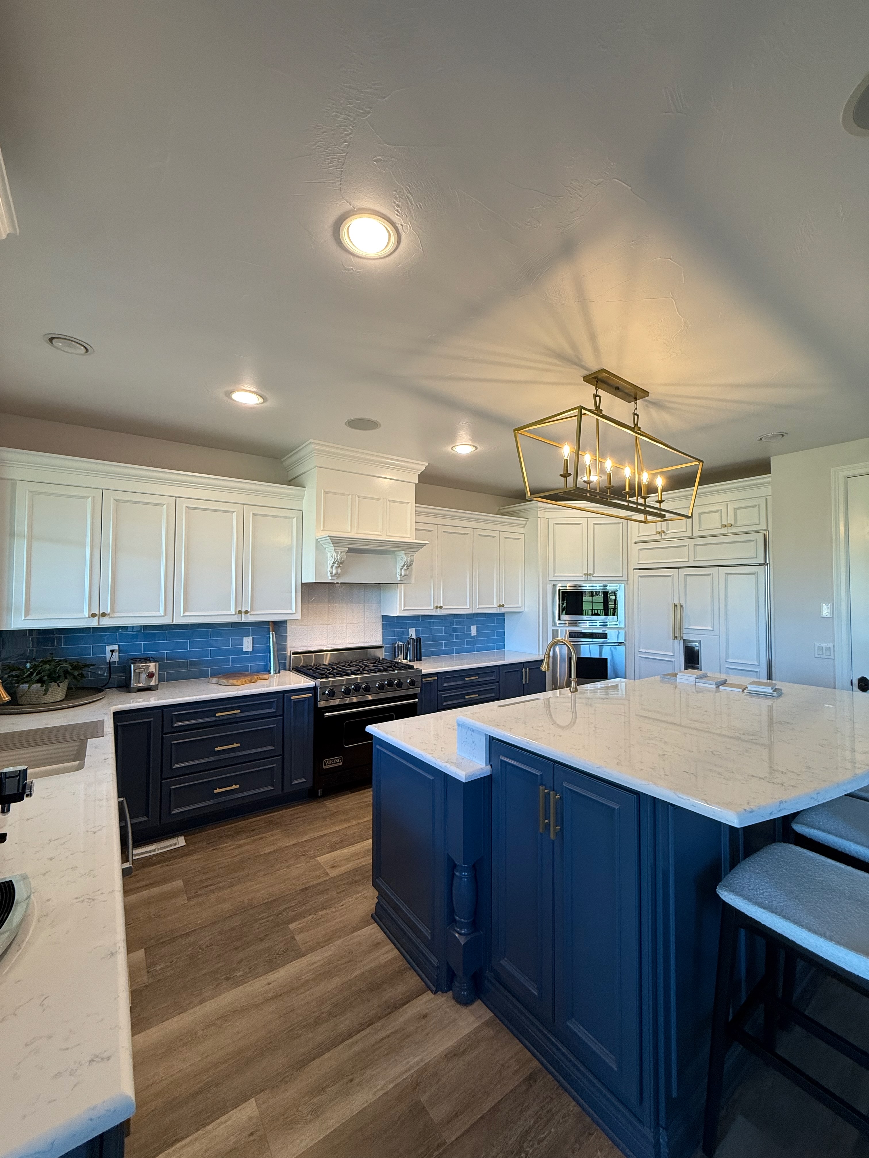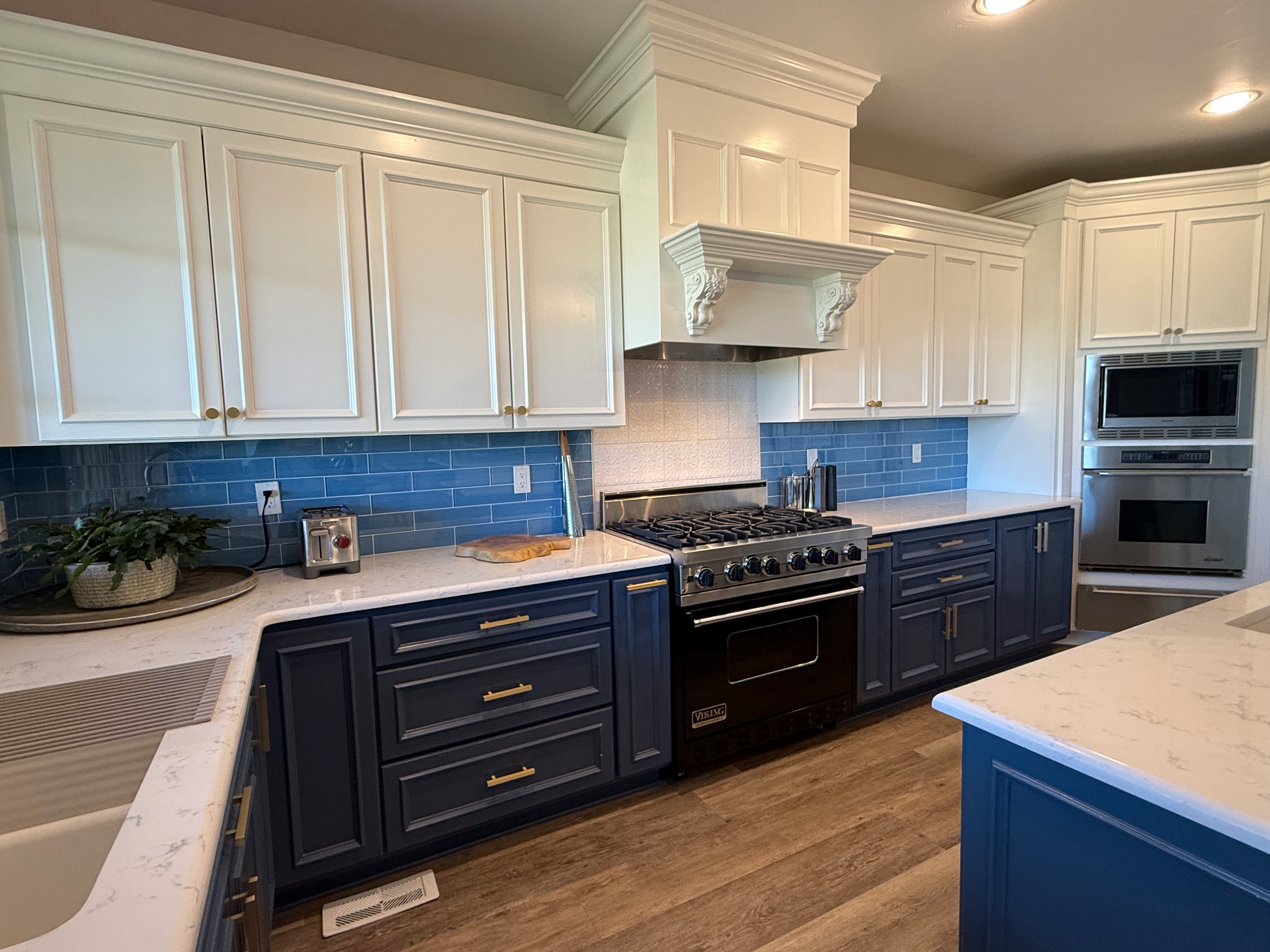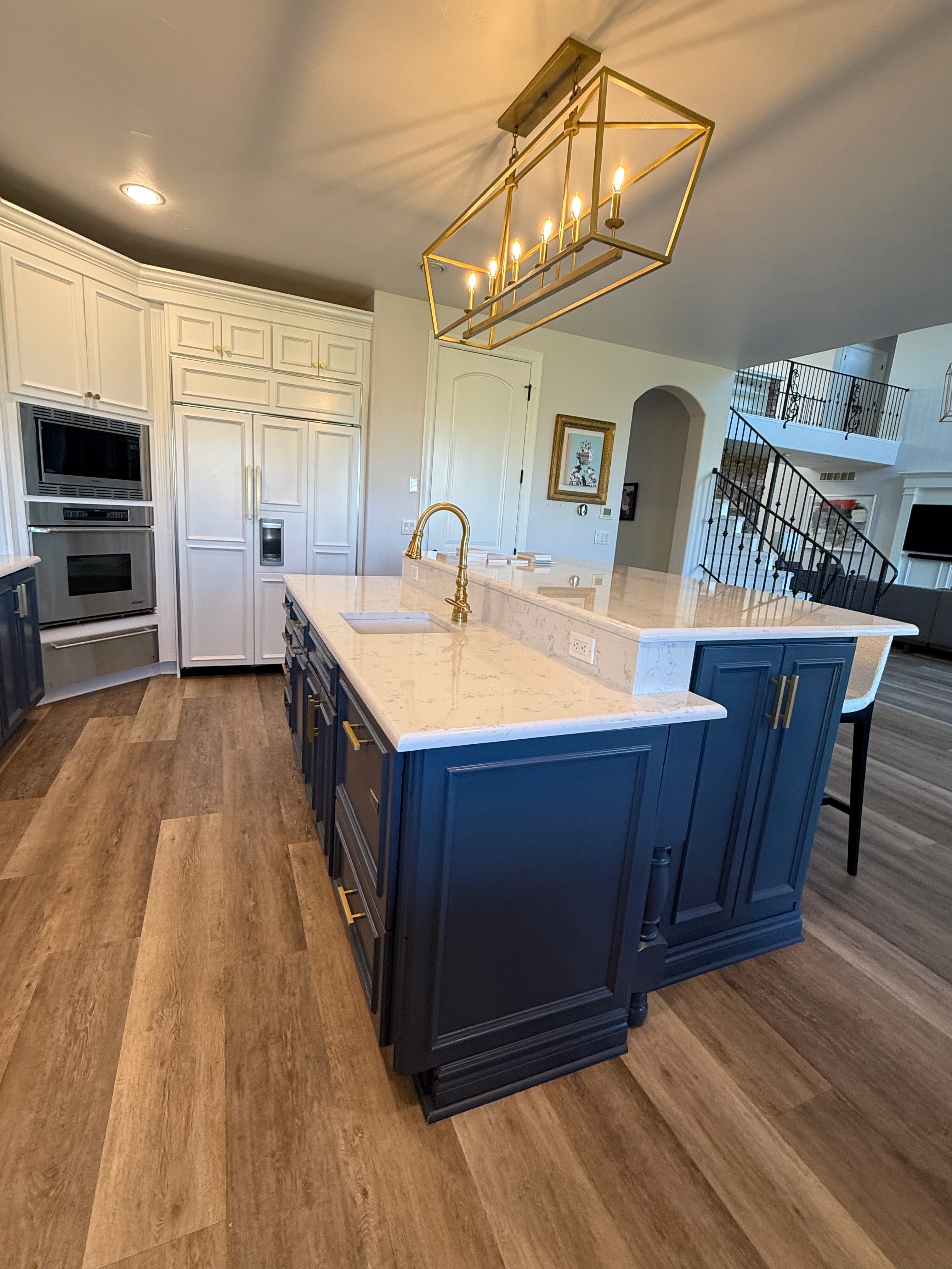 This transitional, modern style kitchen features shaker style cabinets which are timeless and versatile with a classic white upper cabinet with lower cabinets in a popular blue sophisticated contrast. The quartz countertops and brushed brass door hardware lends a traditional elegant feel. The kitchen package comes with luxury Viking, Sub-Zero and Dacor appliances. Available early July tbd. Price for the package below. Available tbd early July.