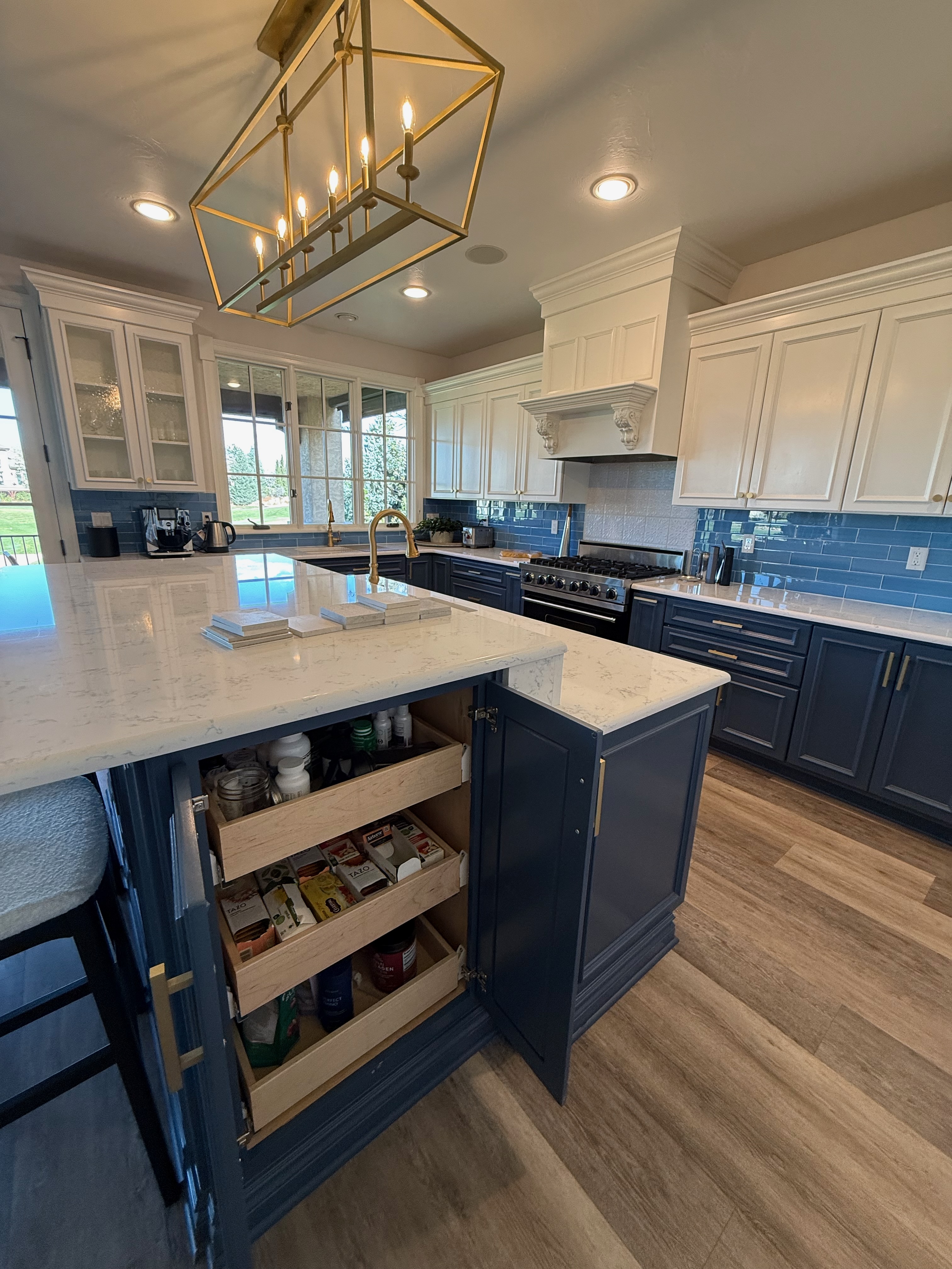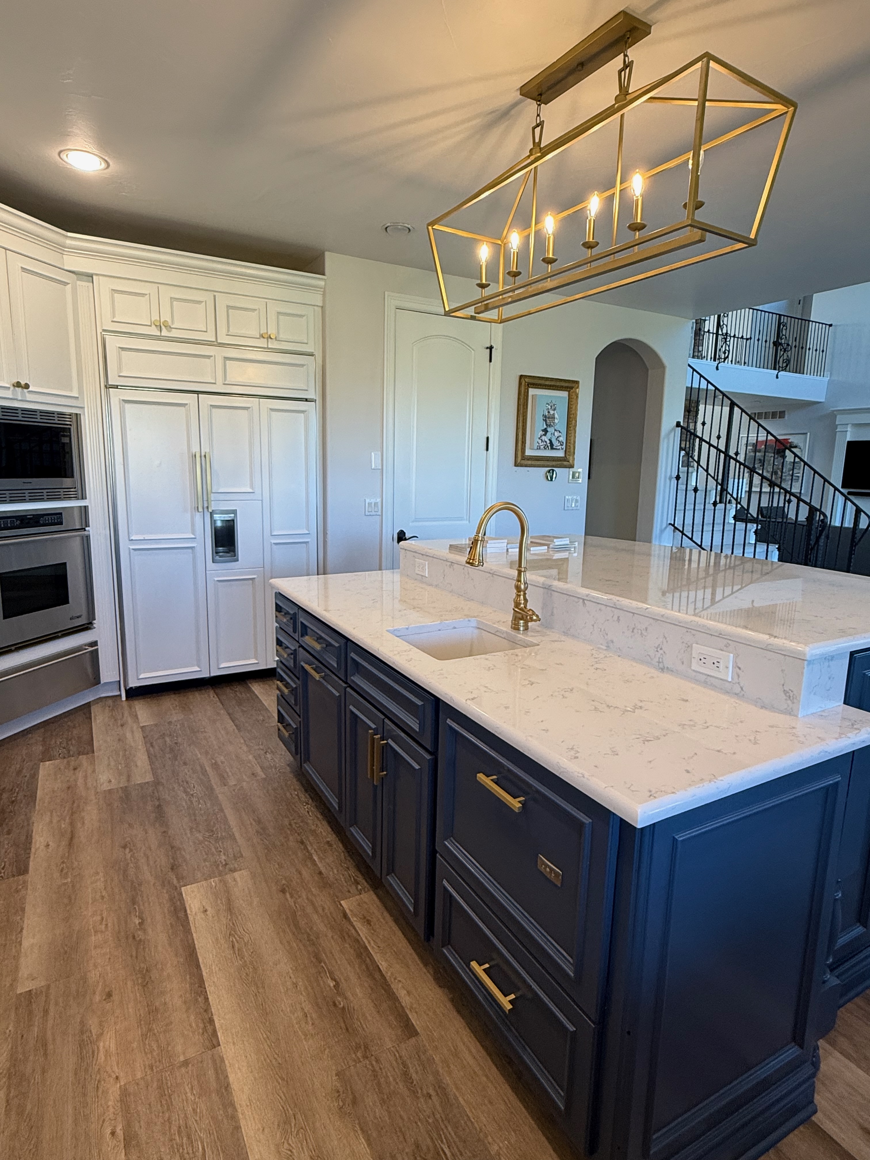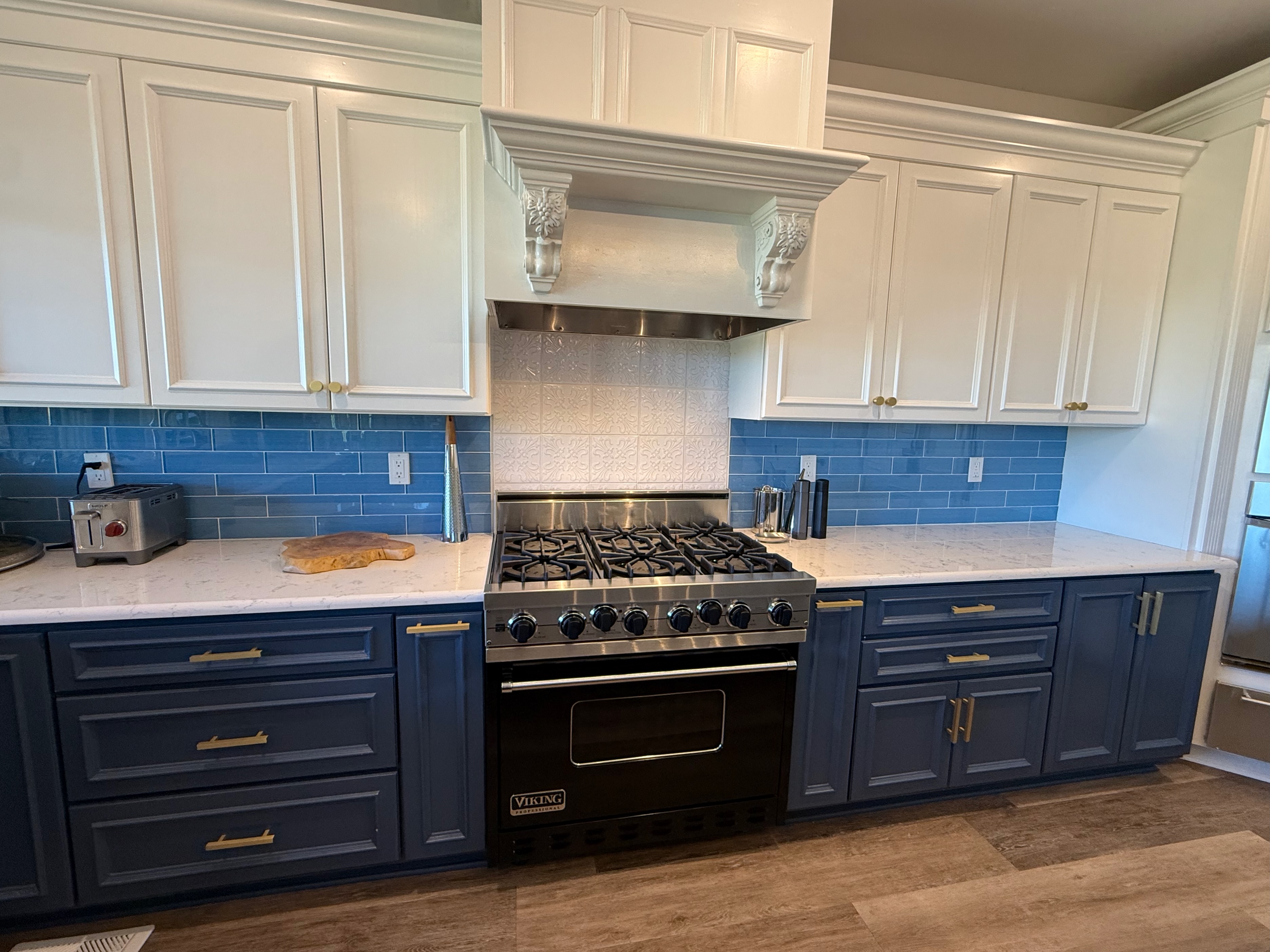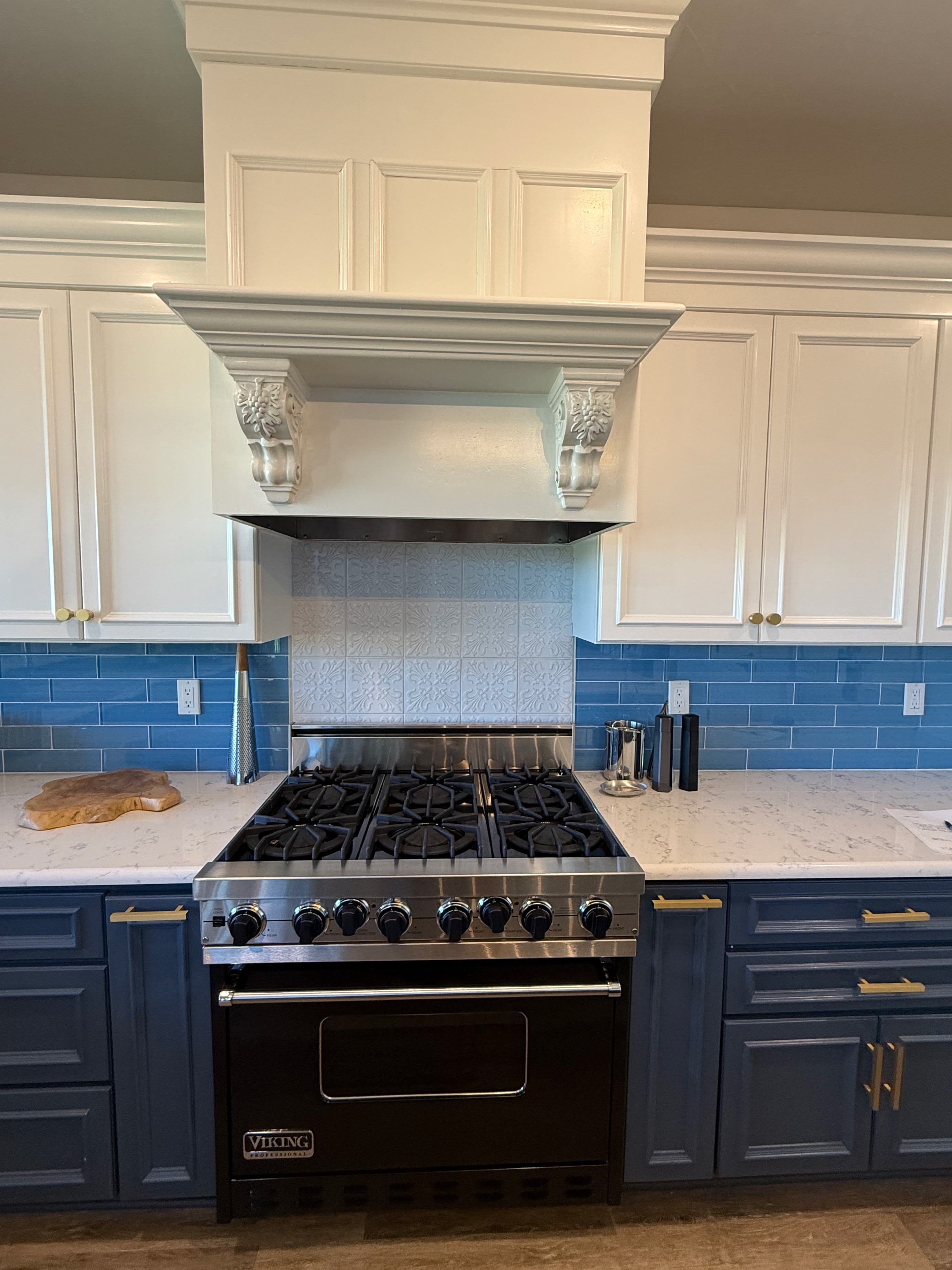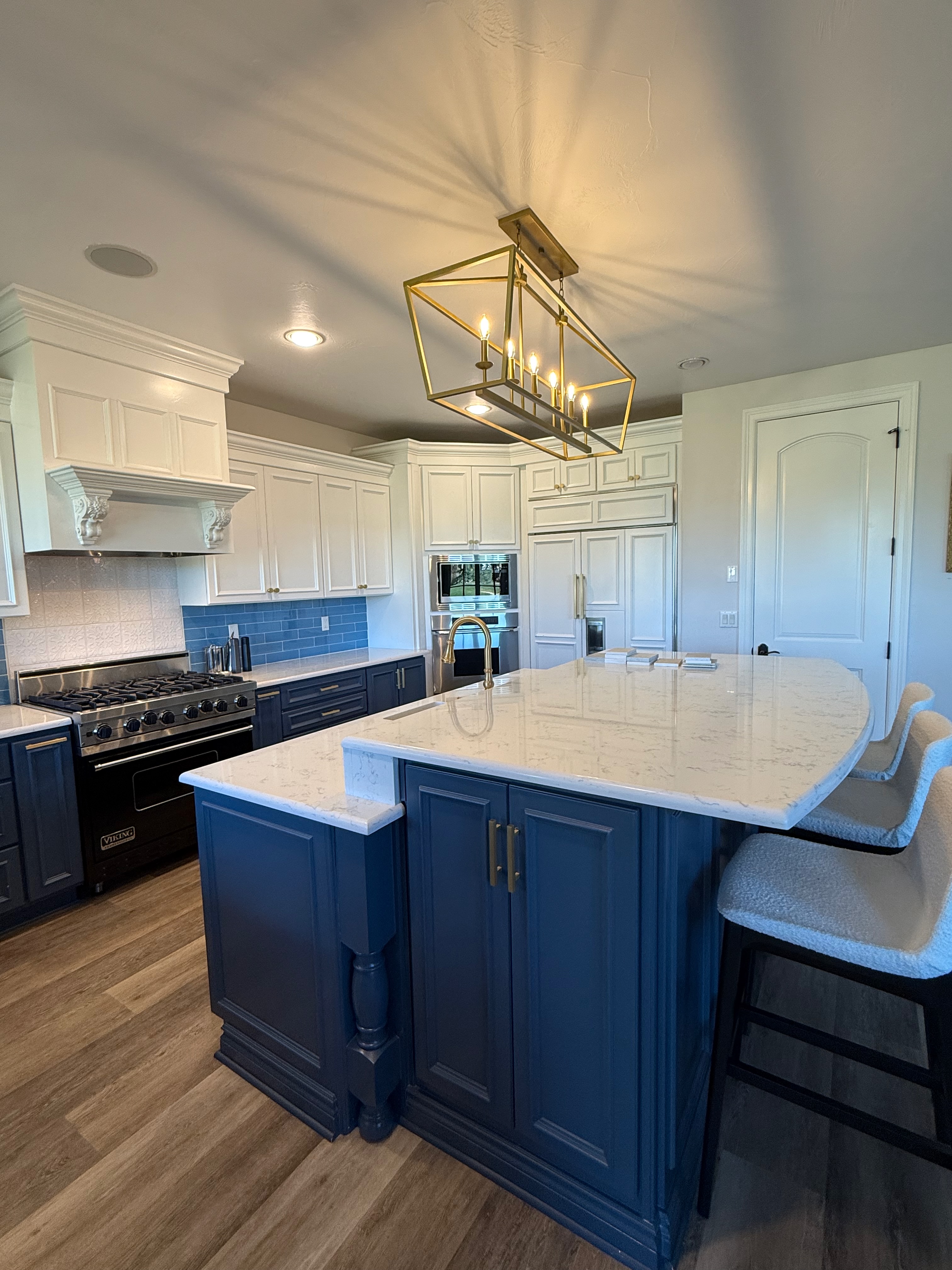 This transitional, modern style kitchen features shaker style cabinets which are timeless and versatile with a classic white upper cabinet with lower cabinets in a popular blue sophisticated contrast. The quartz countertops and brushed brass door hardware lends a traditional elegant feel. The kitchen package comes with luxury Viking, Sub-Zero and Dacor appliances. Available early July tbd. Price for the package below. Available tbd early July.