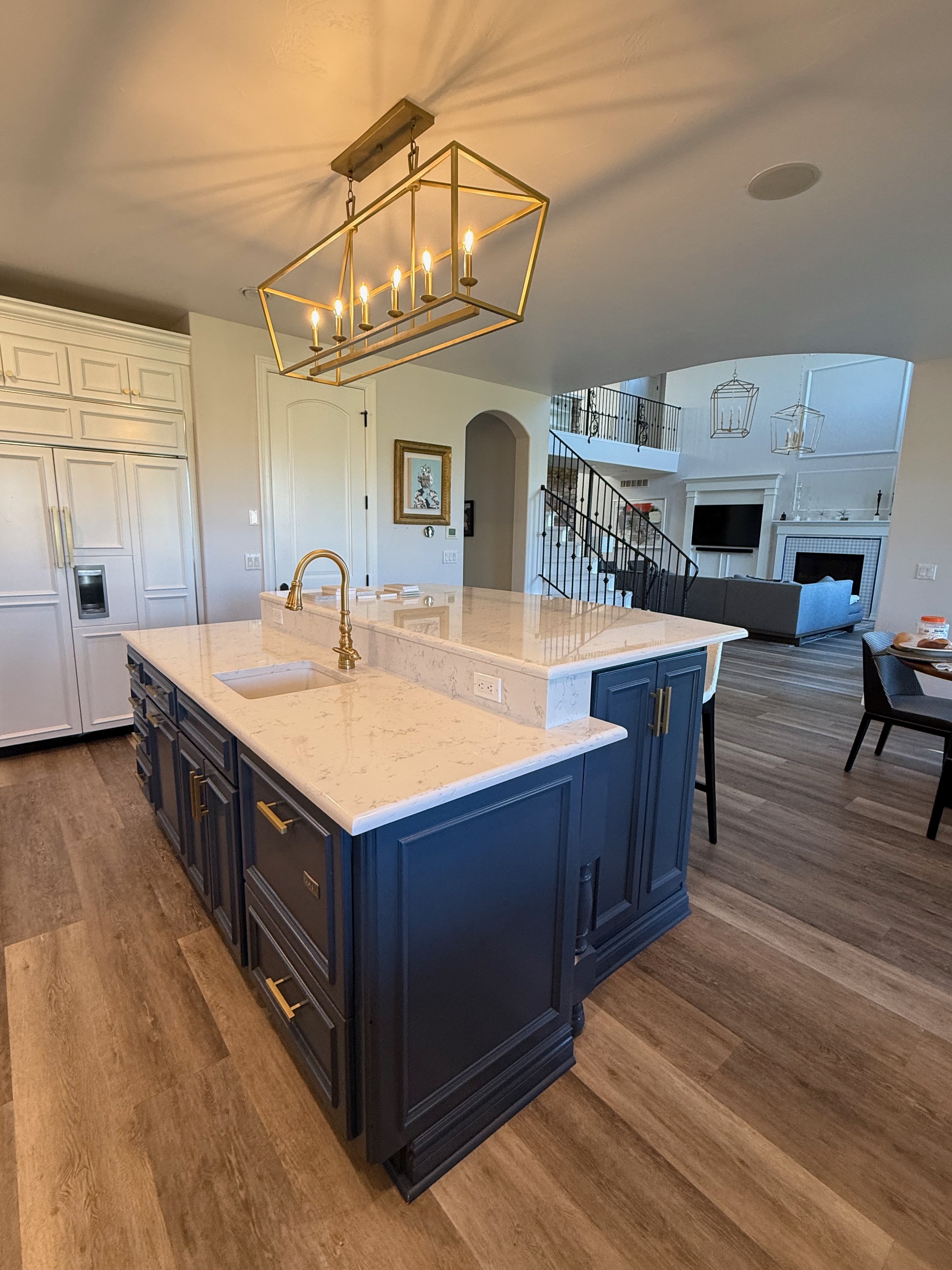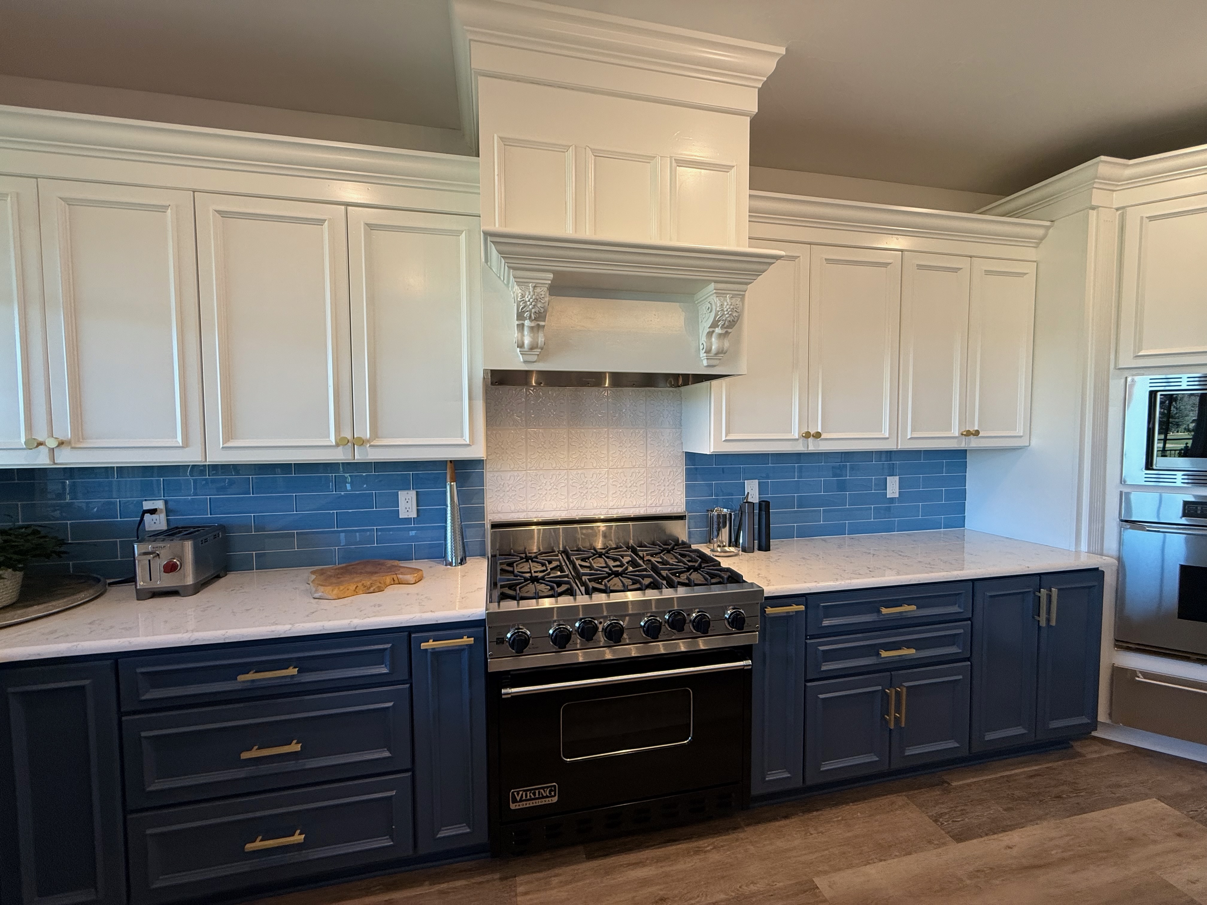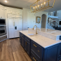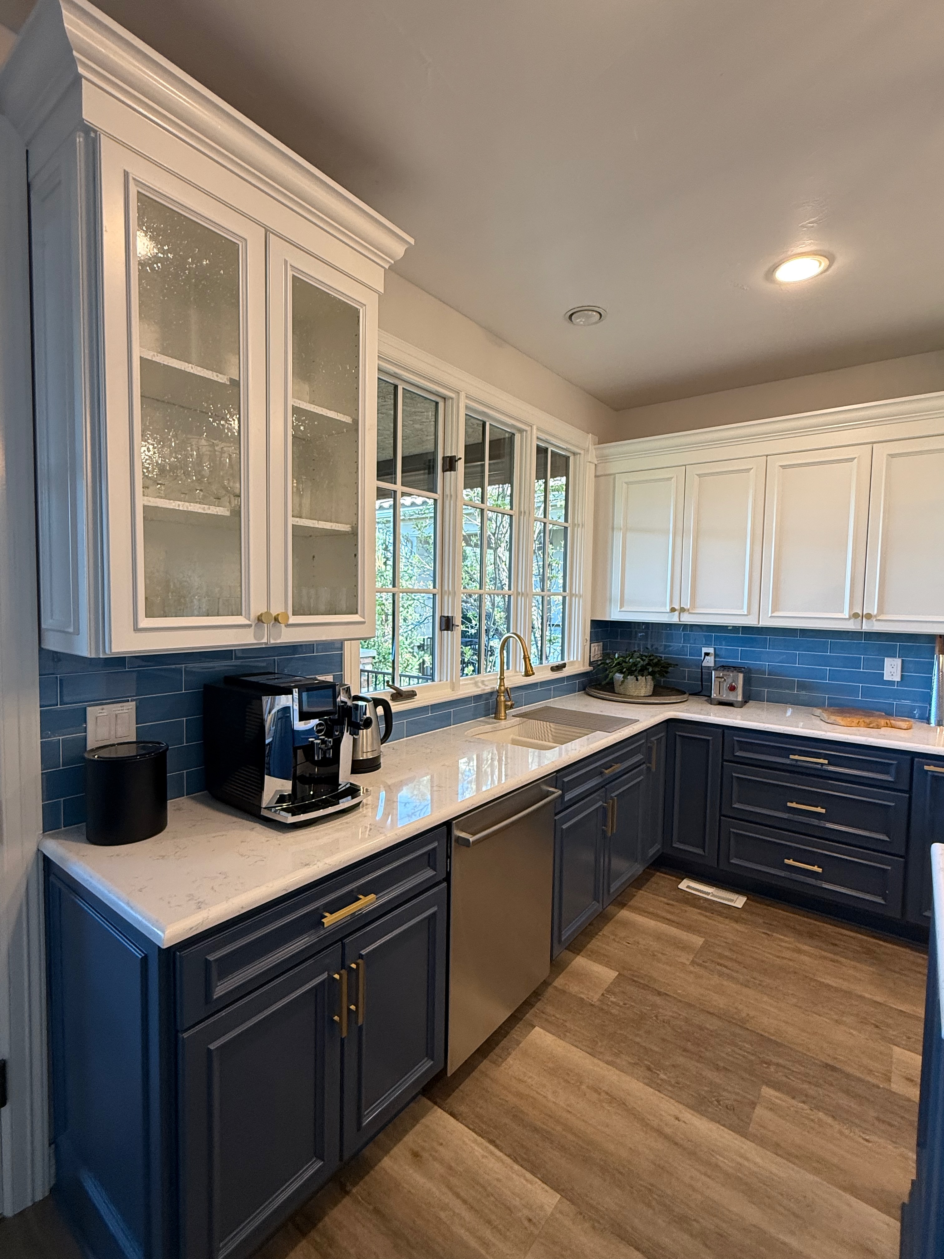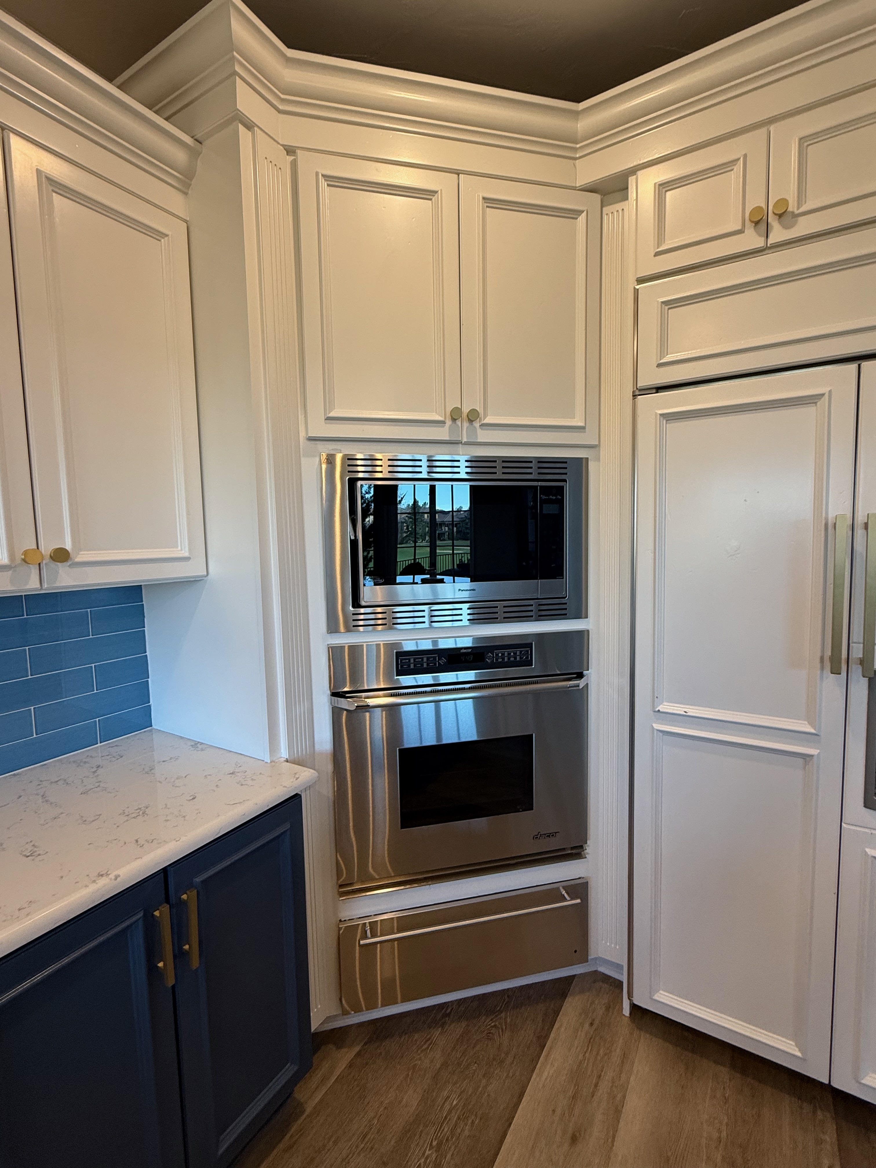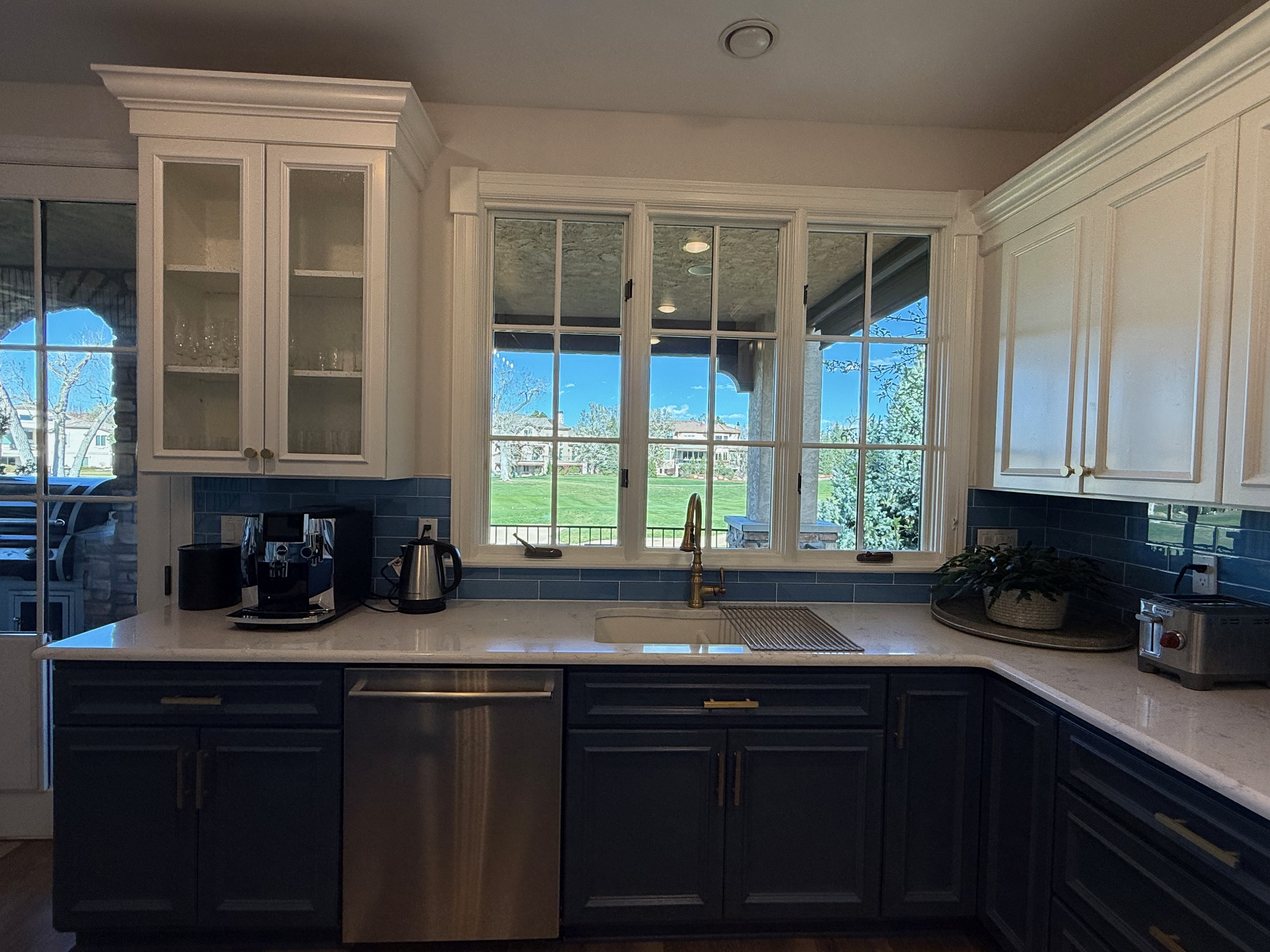 This transitional, modern style kitchen features shaker style cabinets which are timeless and versatile with a classic white upper cabinet with lower cabinets in a popular blue sophisticated contrast. The quartz countertops and brushed brass door hardware lends a traditional elegant feel. The kitchen package comes with luxury Viking, Sub-Zero and Dacor appliances. Available early July tbd. Price for the package below. Available tbd early July.
