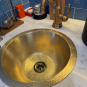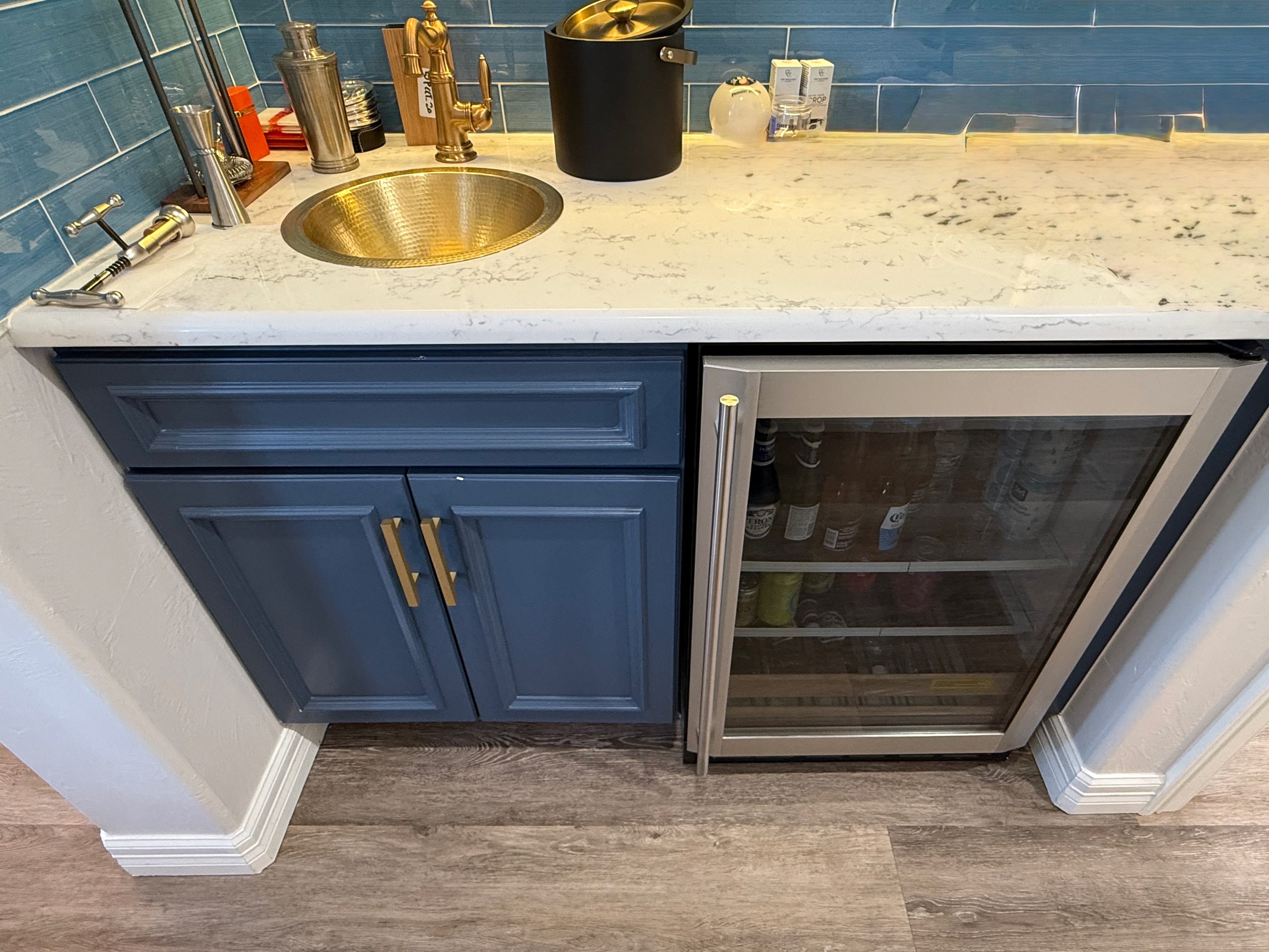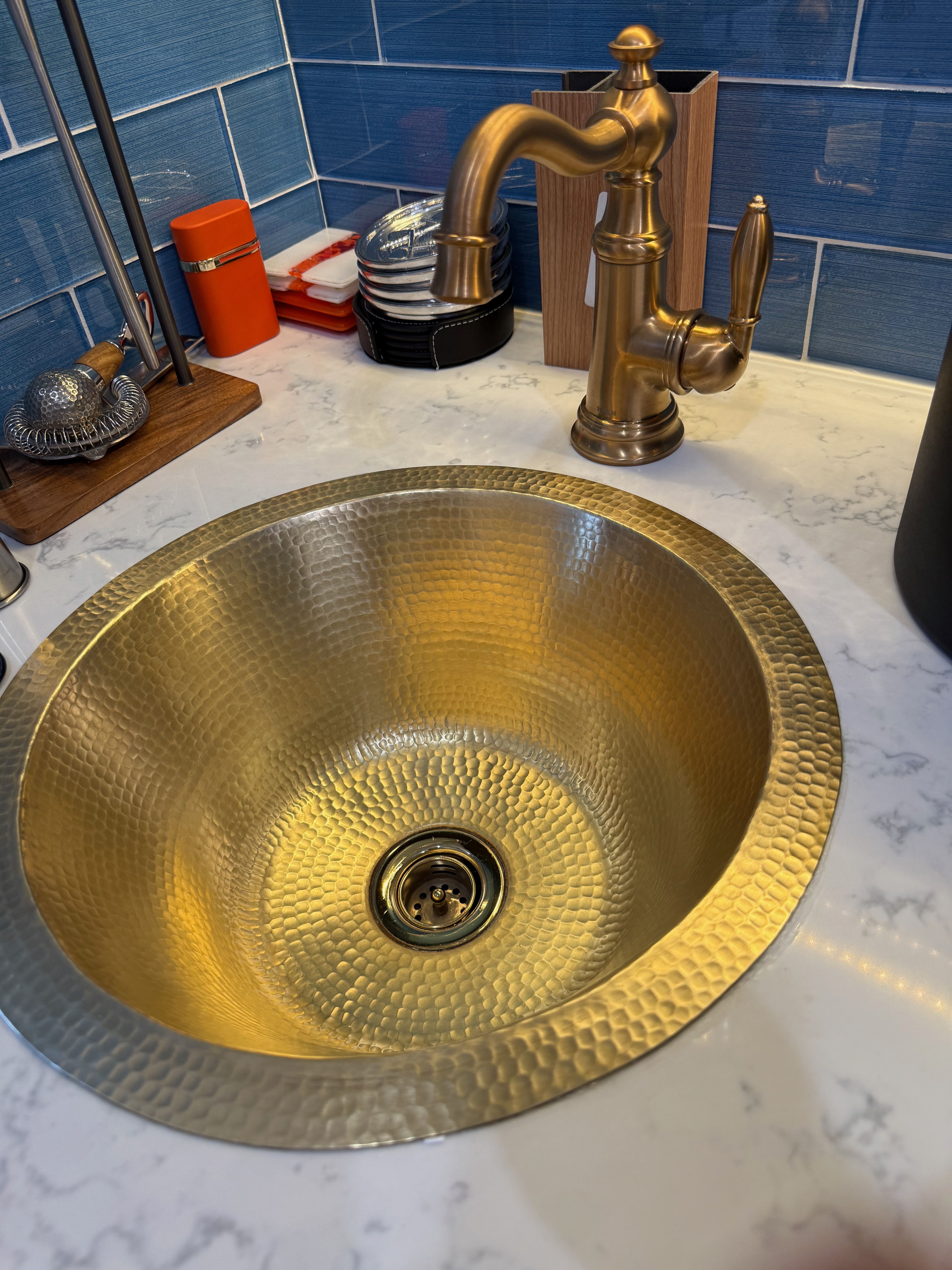 1-Two door sink base Dim.: 27”w x 34 1/2” cabinet/ 36”h w/ crown x 24”d, drop in hammered brass sink and faucet set