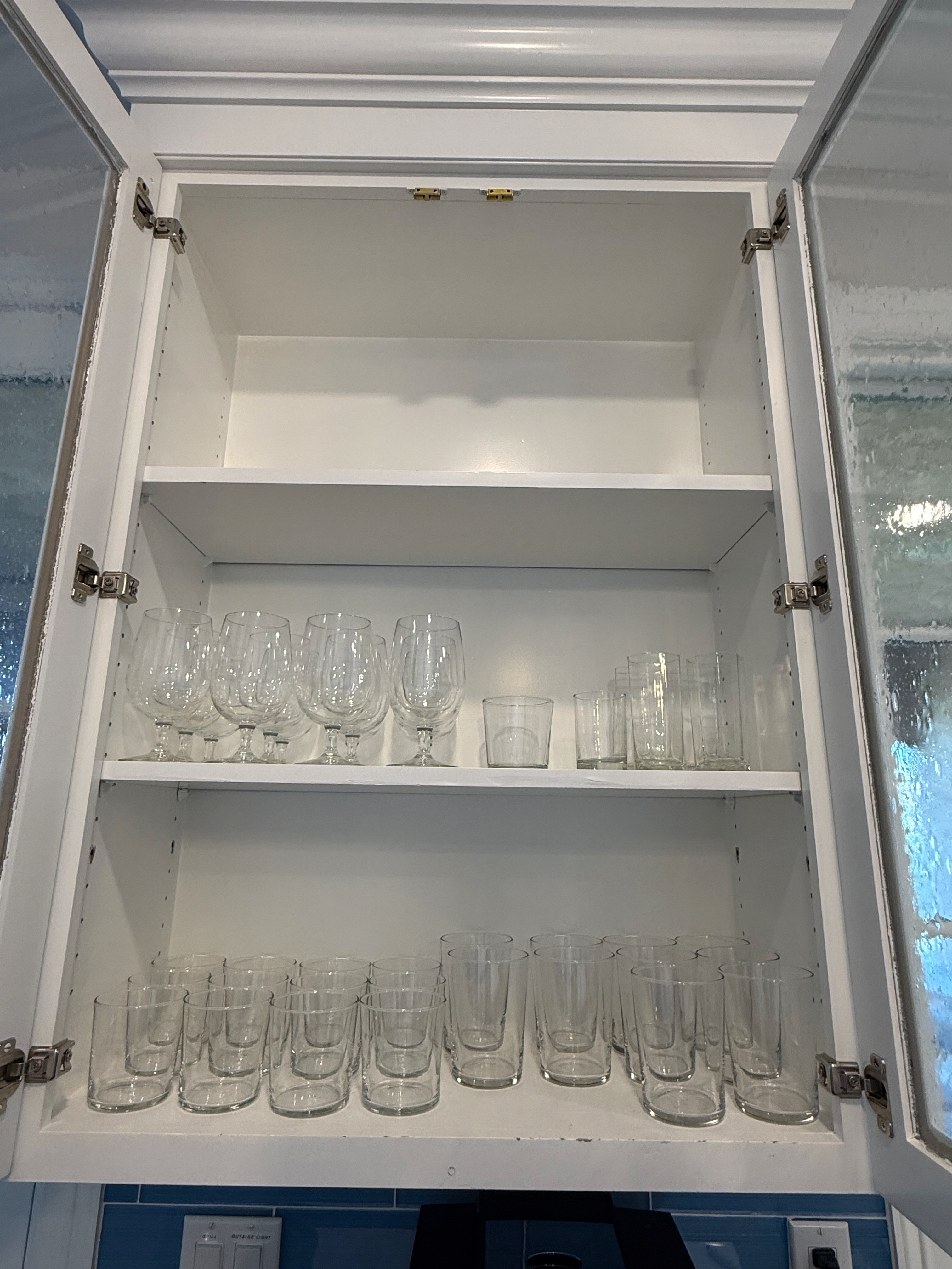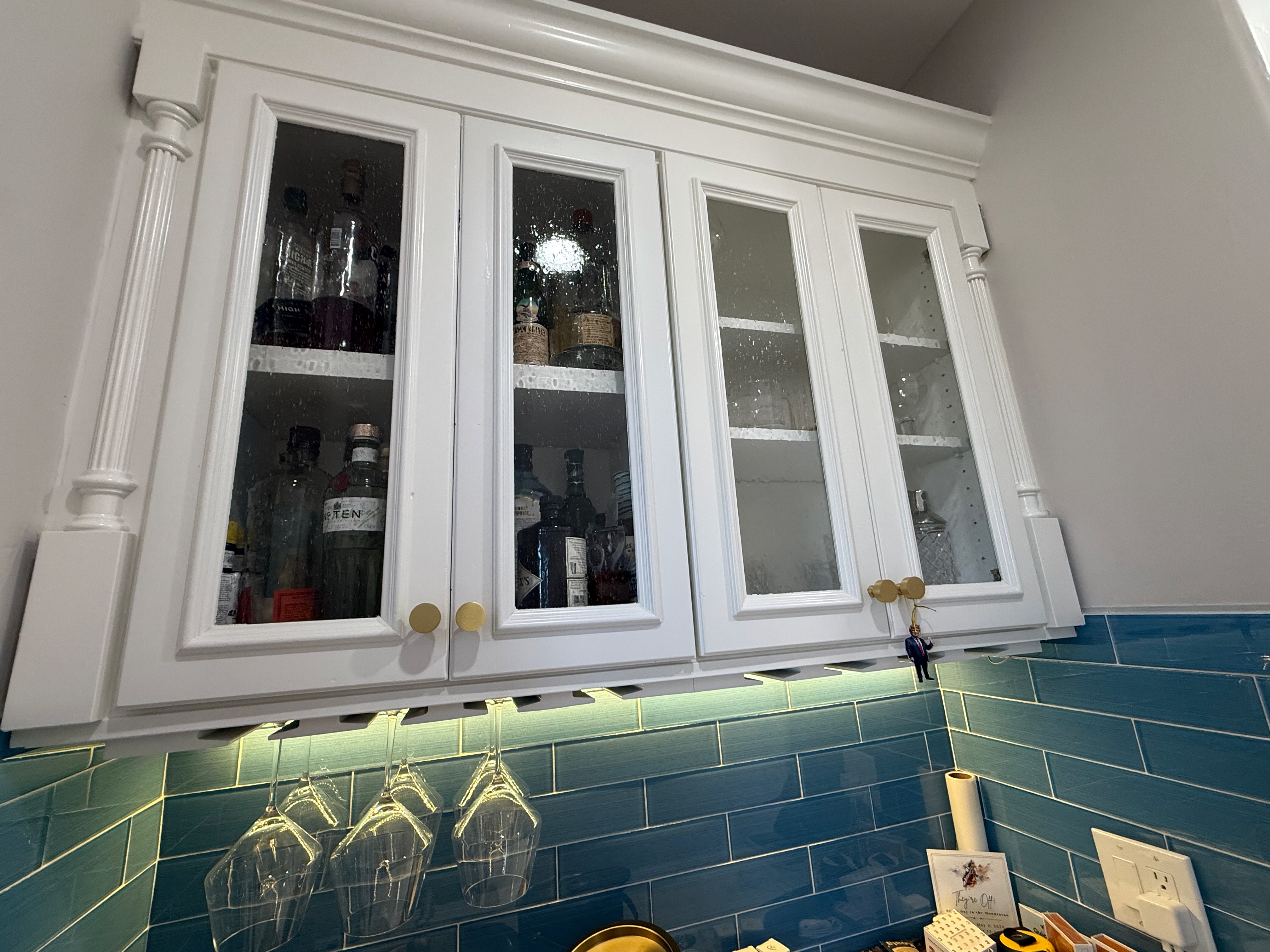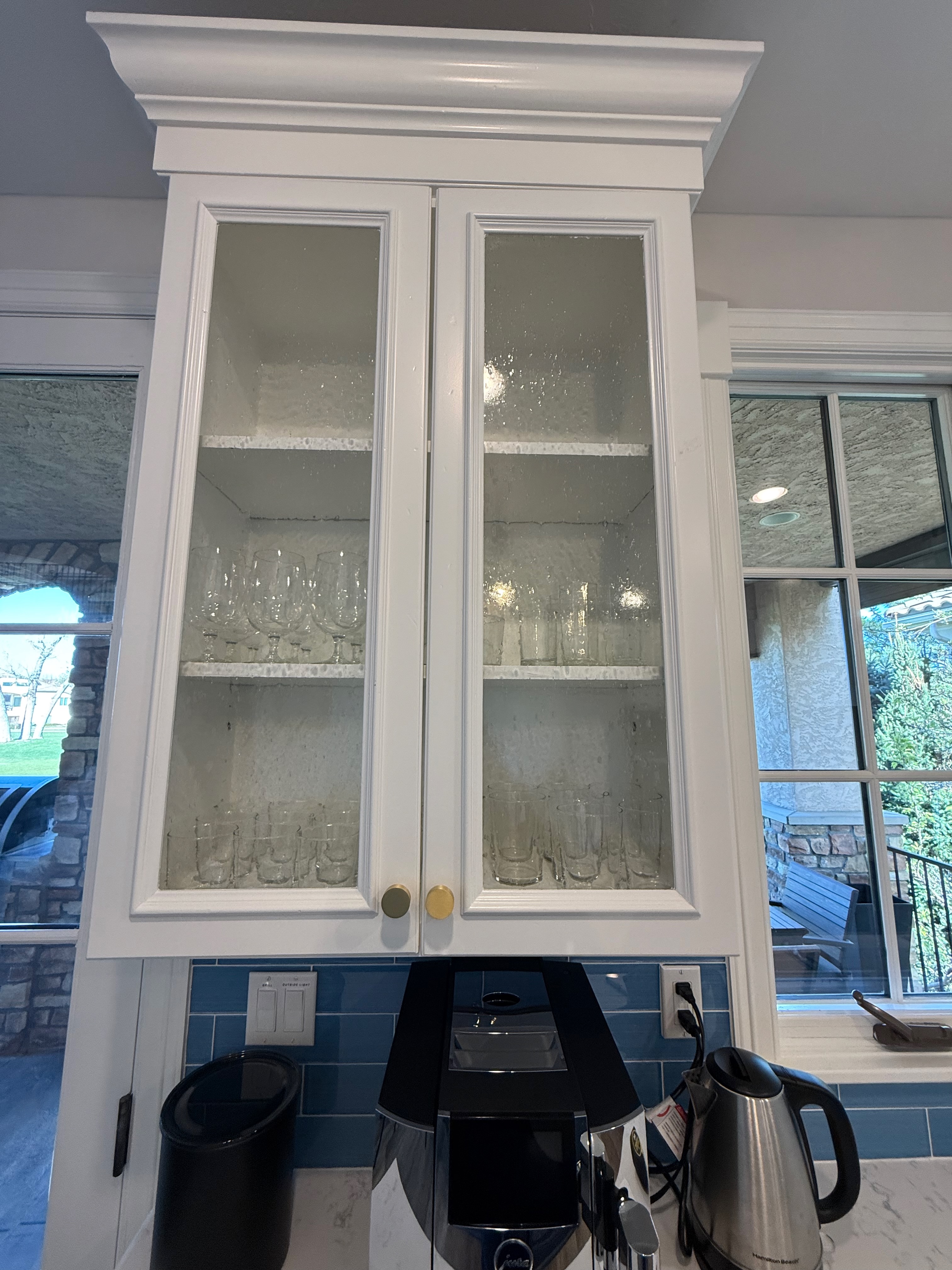 2-Two door glass front wall cabinets with wine glass holders below. Dim.: 24”w x 31”h cabinet only/ 39 ½” w/ crown x12”d
