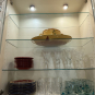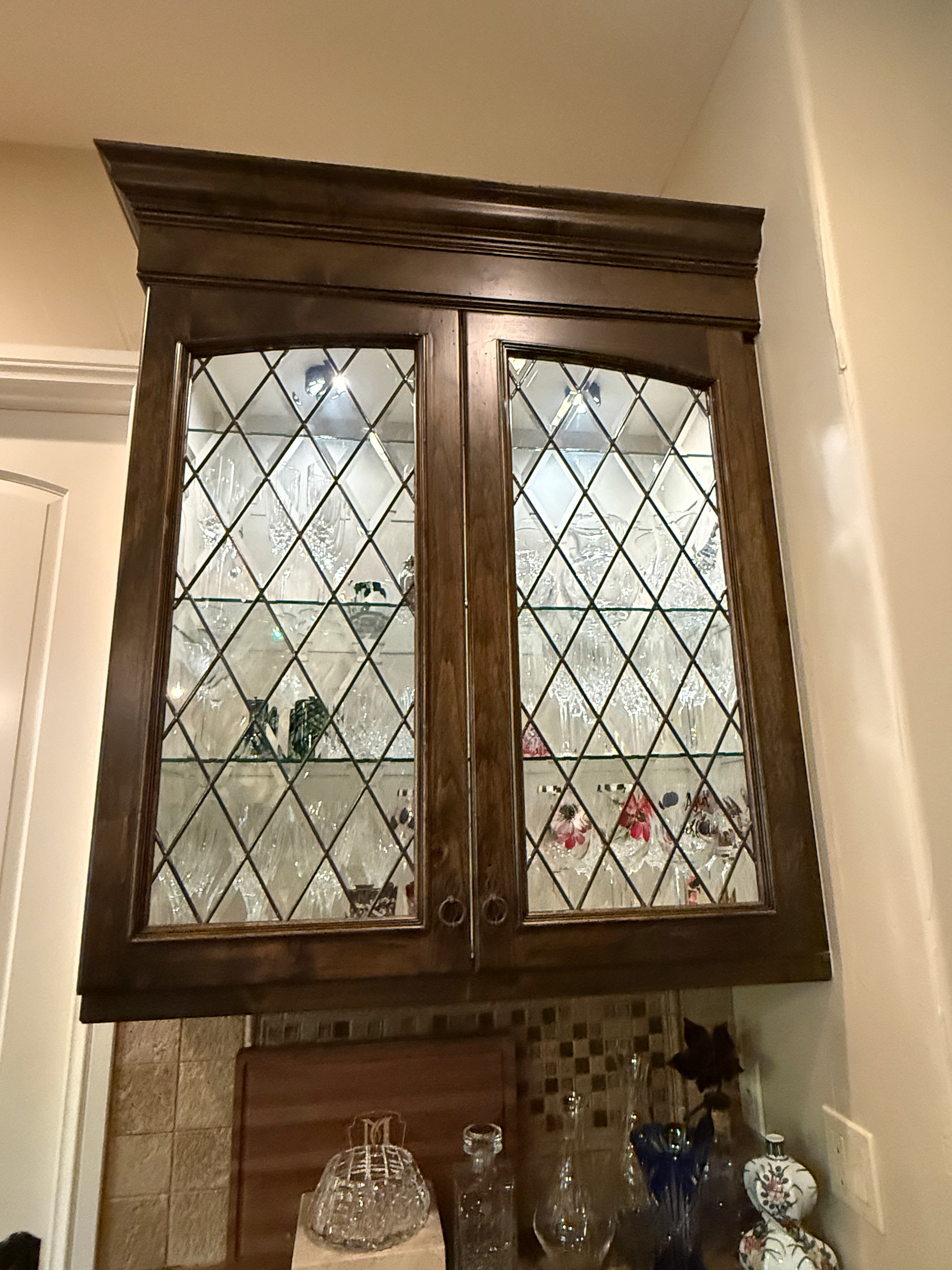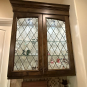 1-Two door leaded stain glass wall cabinets w/ glass shelves and puck lights inside Dim.: 38”w/40”w x 40”h cab. only/44”h to mid-crown/47 ½”h to top of crown/49”h with the bottom trim x 15”d