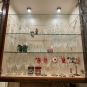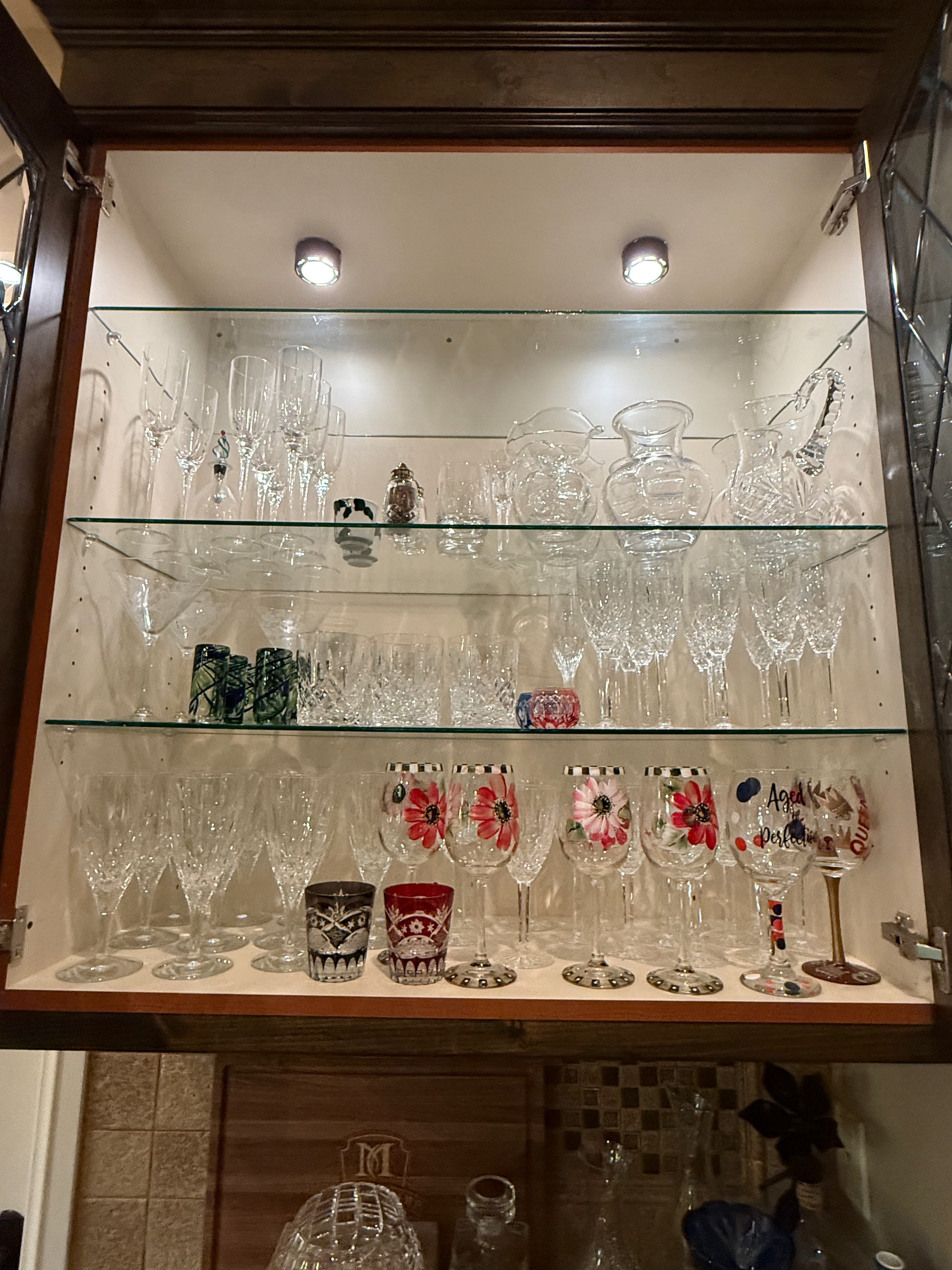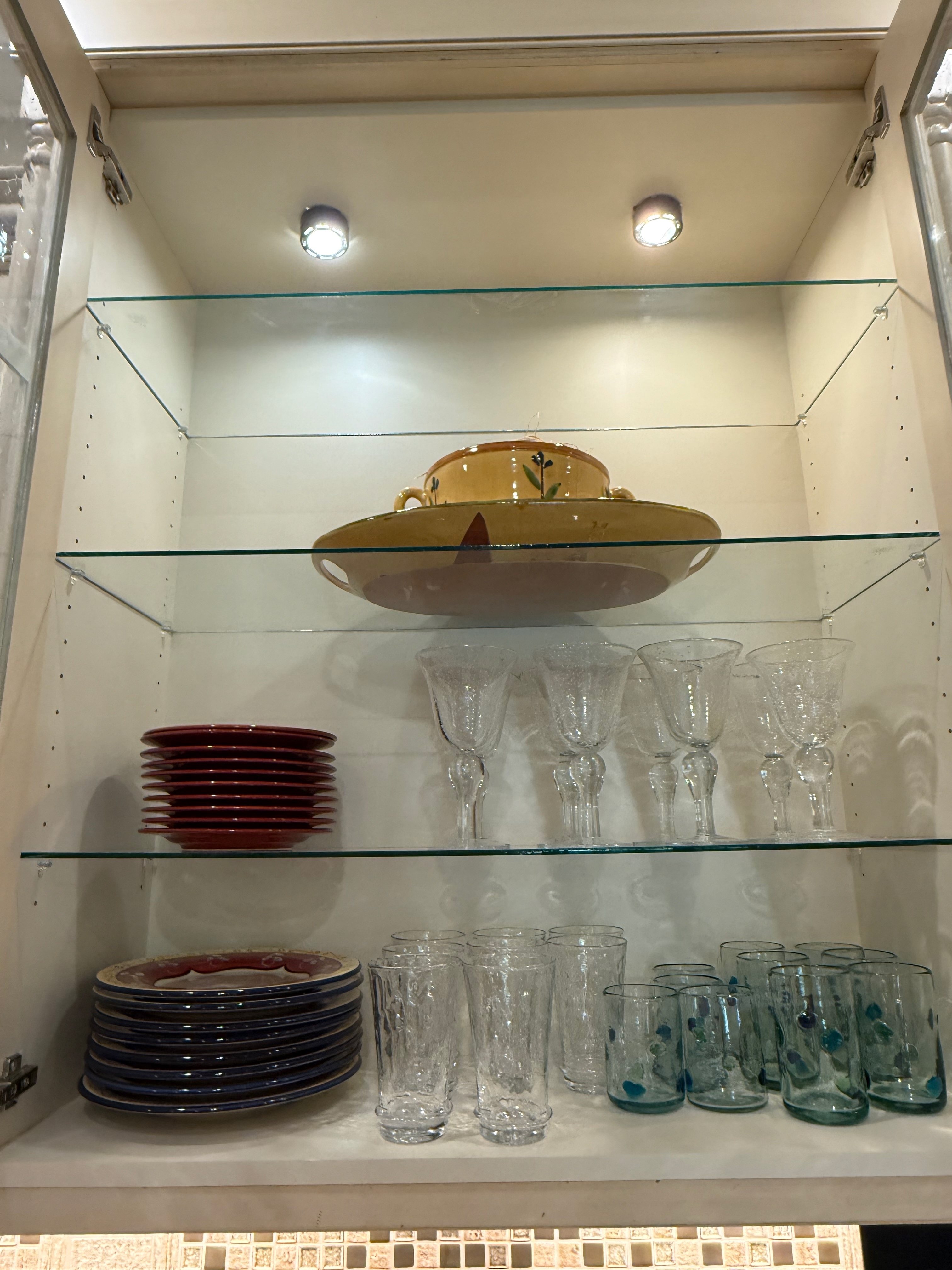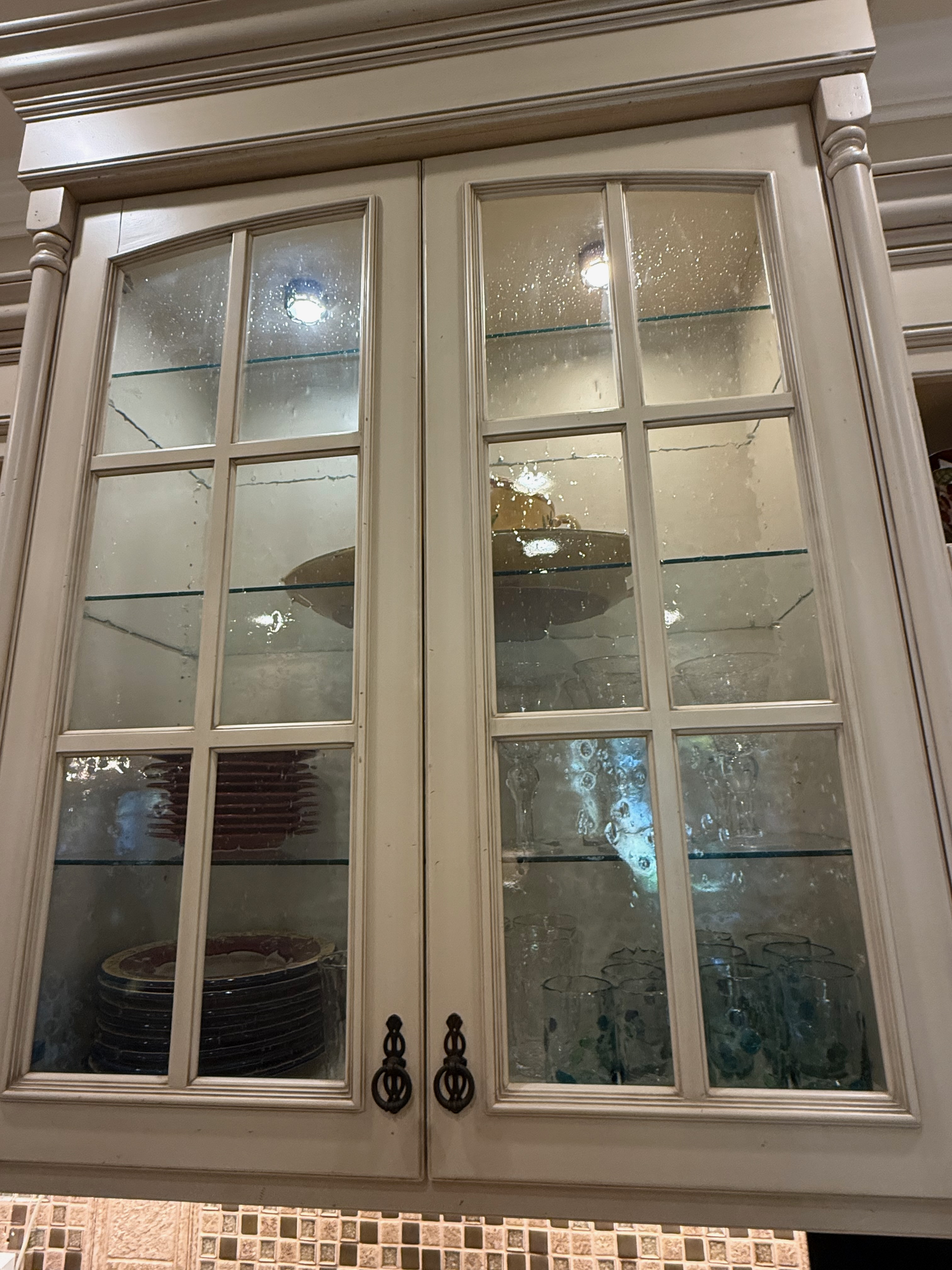 1-Two door glass front wall cabinet w/ glass shelves inside Dim.: 38”w/42” w with columns x 45”h cabinet only/49”h mid-crown/53”h w/ full crown/54 ½” with bottom trim with puck lights inside x 15”d