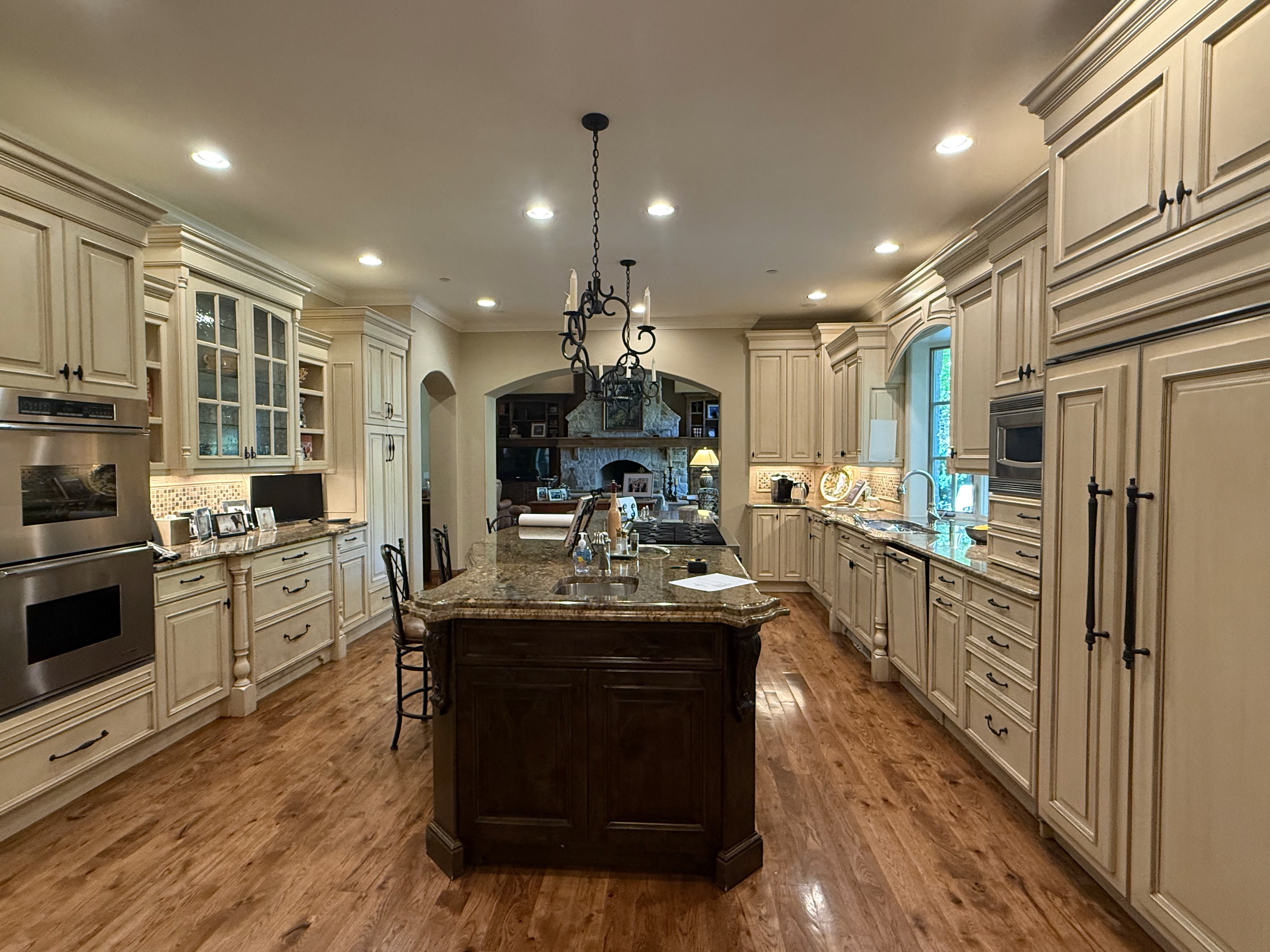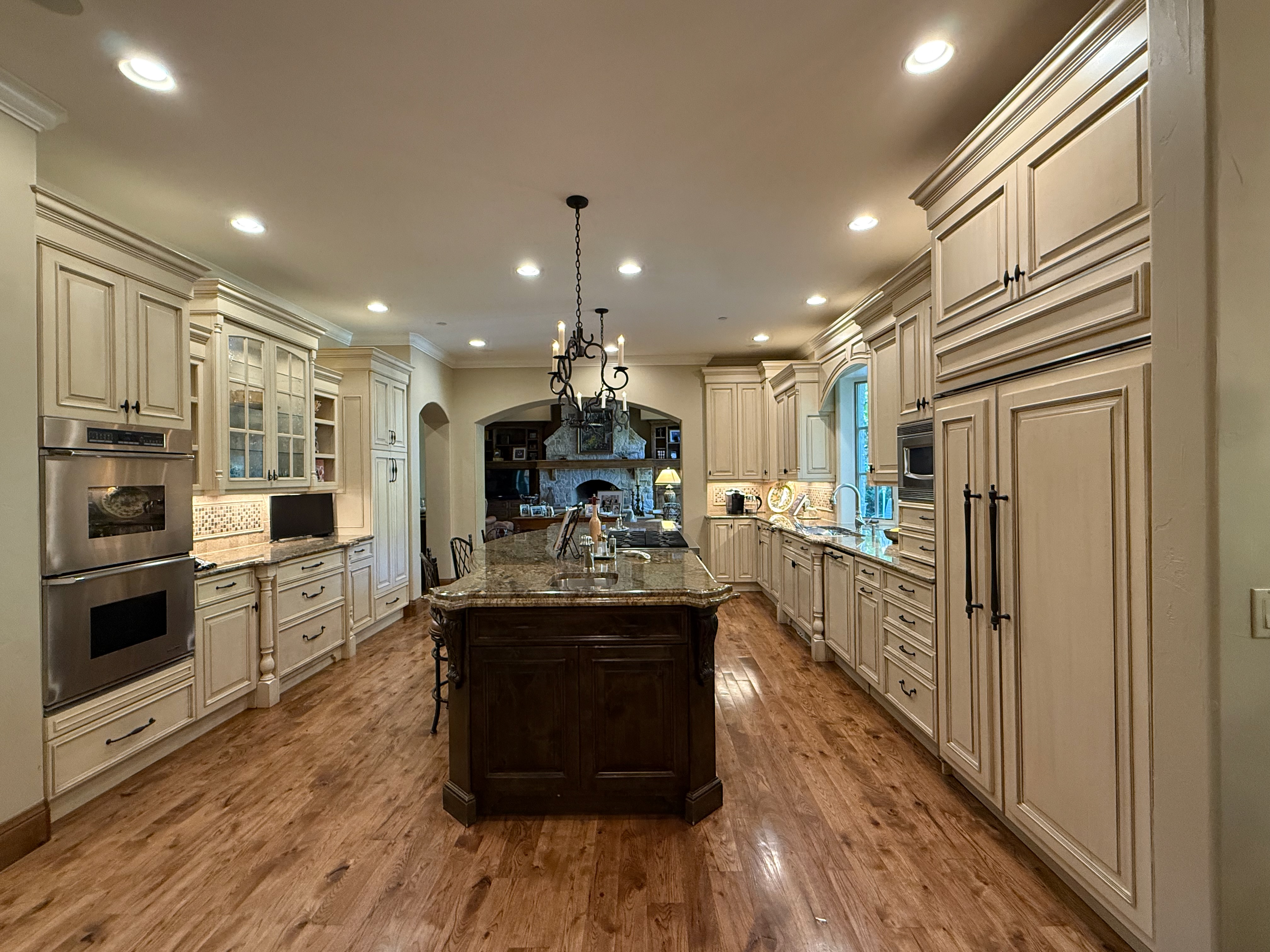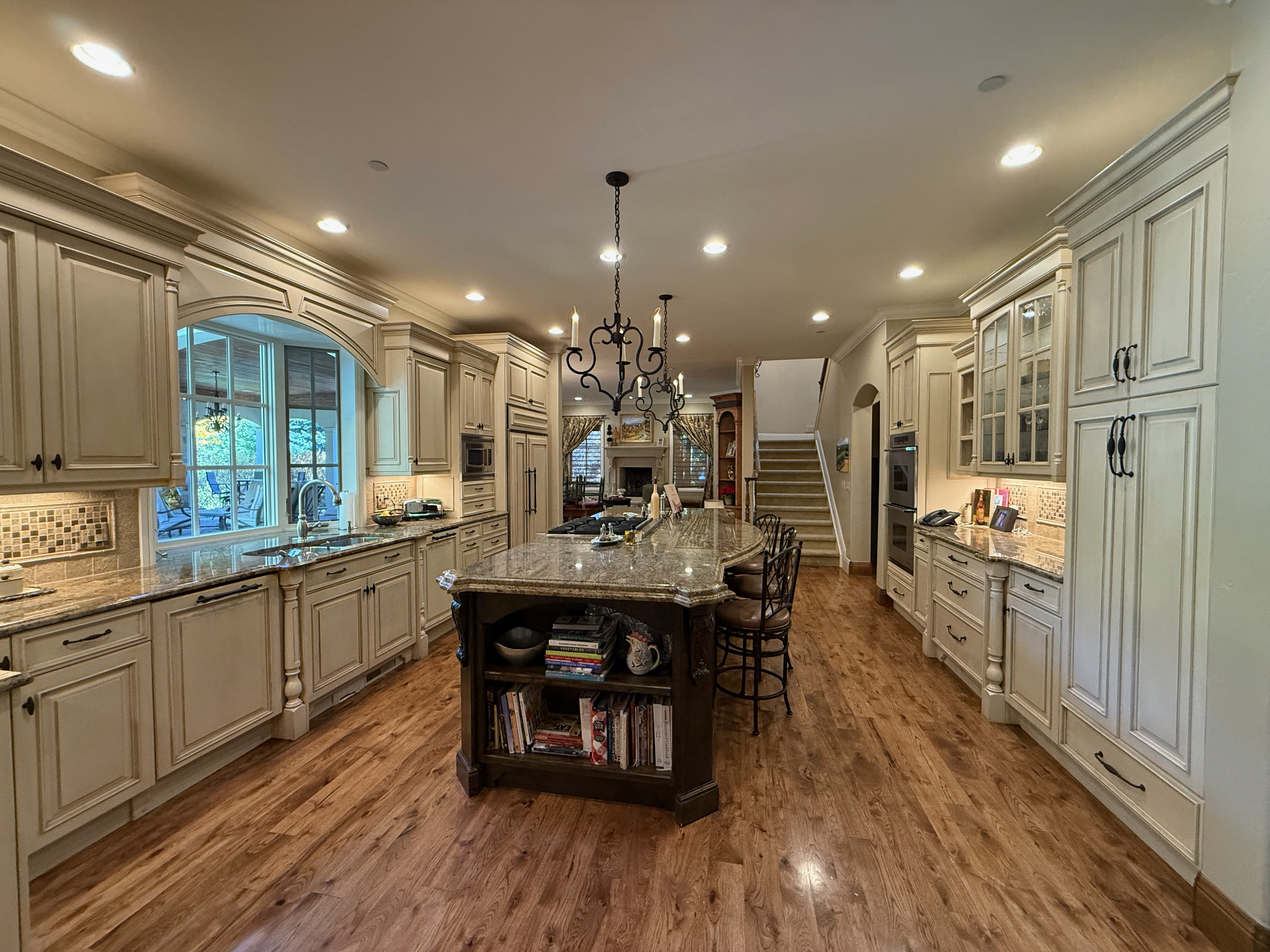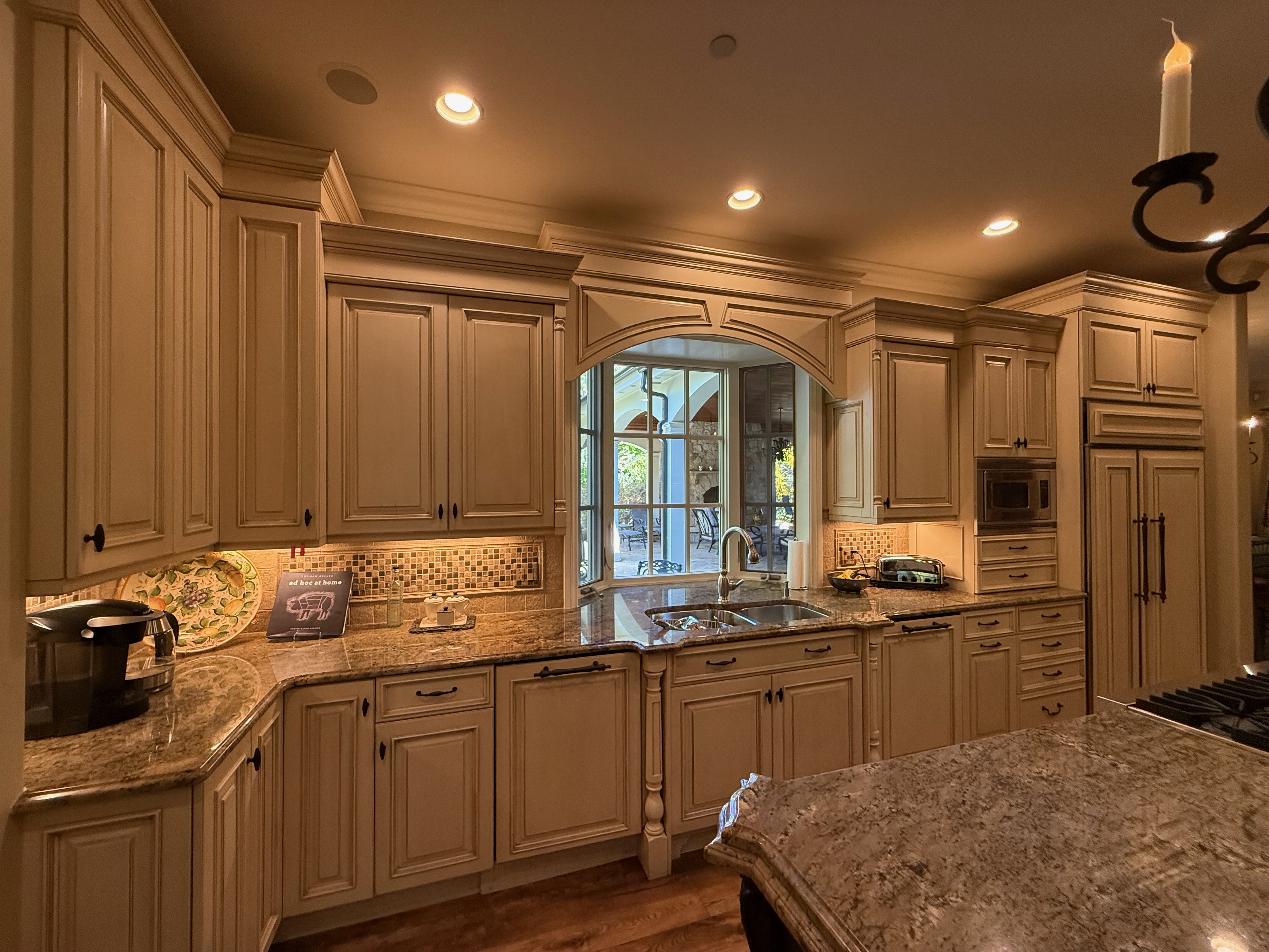 Beautiful William Ohs style, custom made kitchen cabinetry in a warm off-white/cream finish with raised panels. There is a nice large Knotty Alder Wood contrasting island, being the central gathering place of the kitchen. The cabinet drawers have the soft close feature and dove tail joinery. The kitchen package comes with Sub-Zero,Viking, Dacor and KitchenAid appliances. Also included are the slab granite countertops, sinks, faucet sets, disposals, under cabinet lighting and pendant lights. Everything is available to be removed, tbd mid-January 2026, by a licensed contractor or we have licensed contractors available to hire to remove the kitchen and move it to your home. Pricing below.
