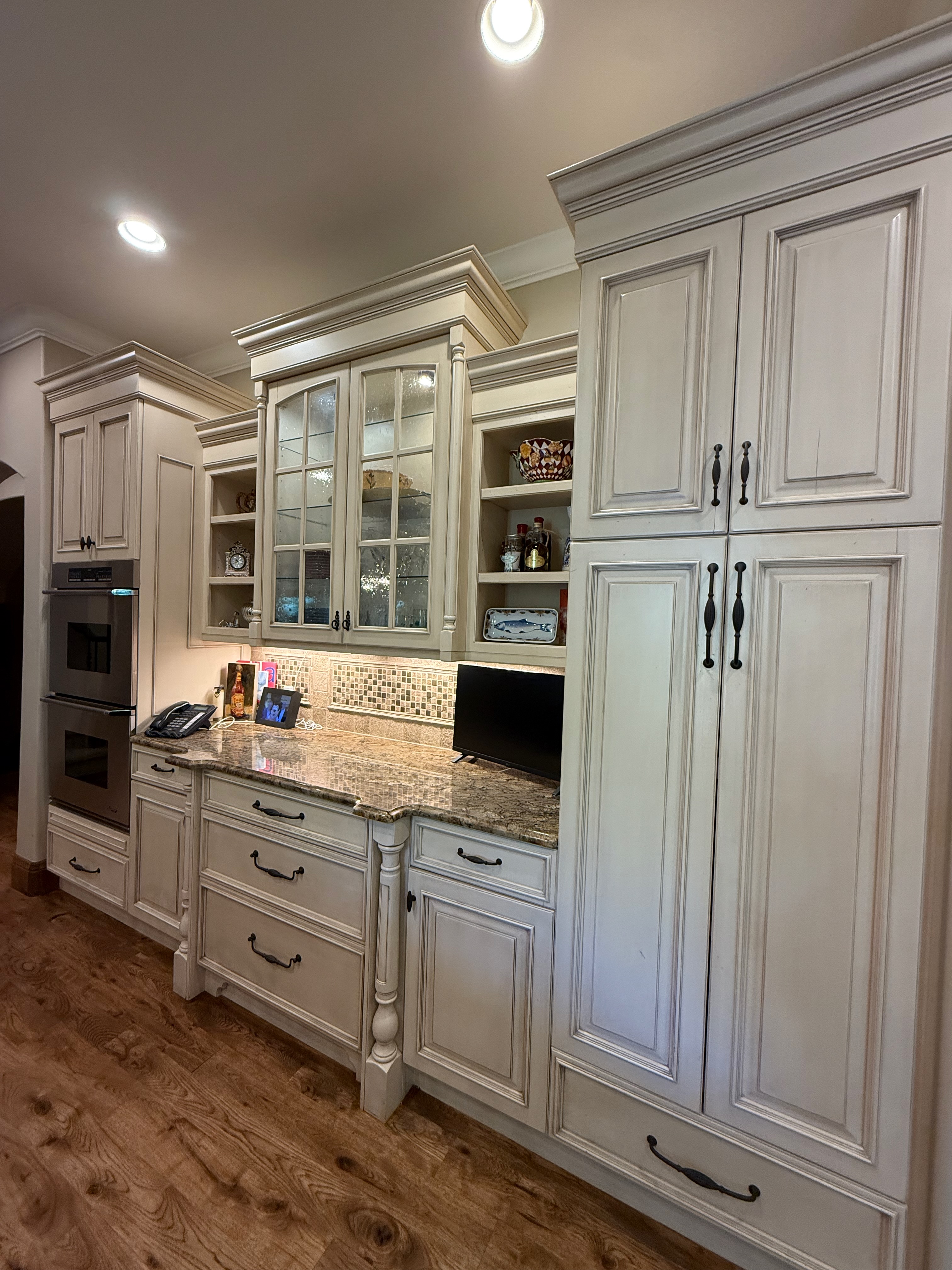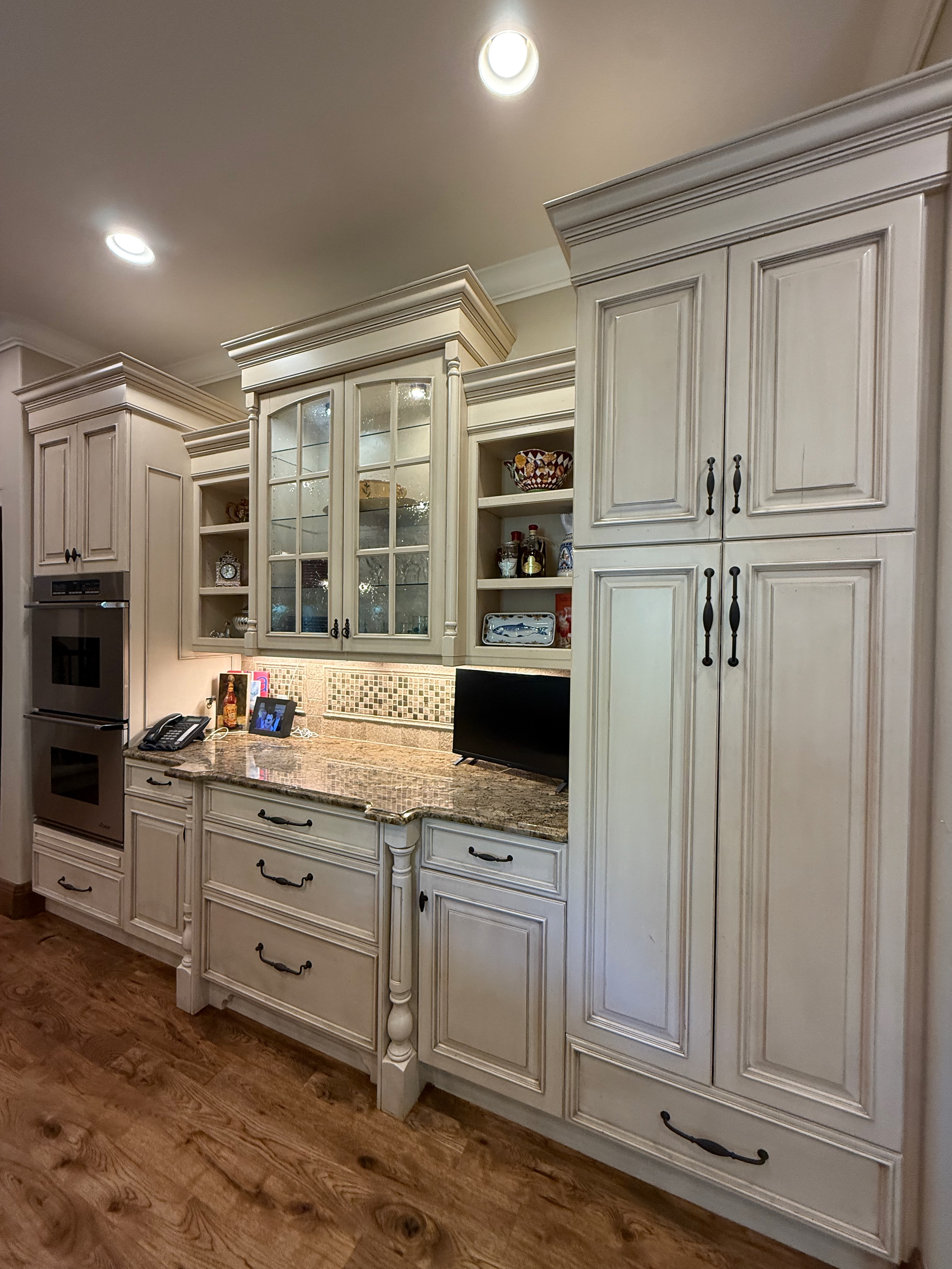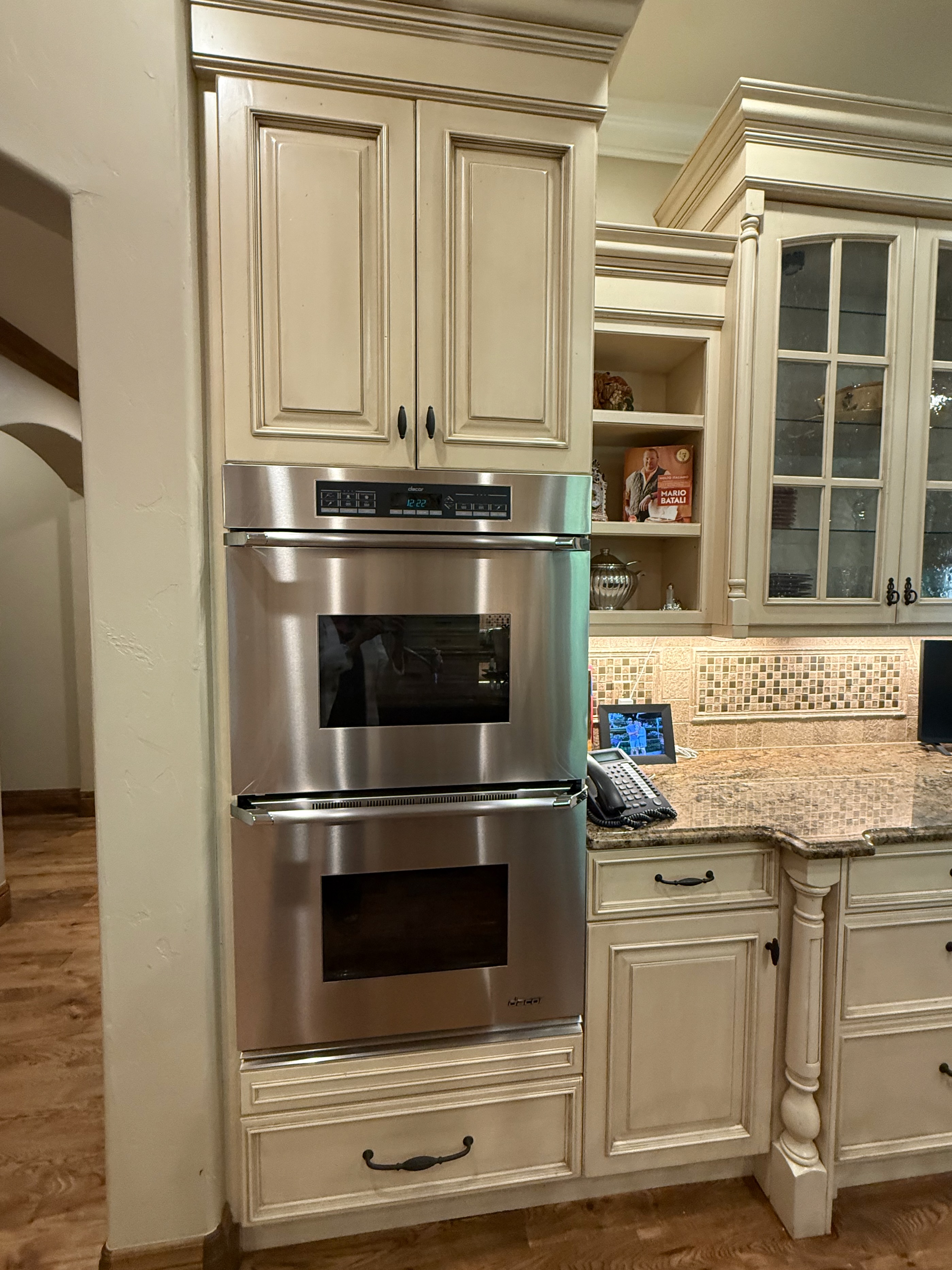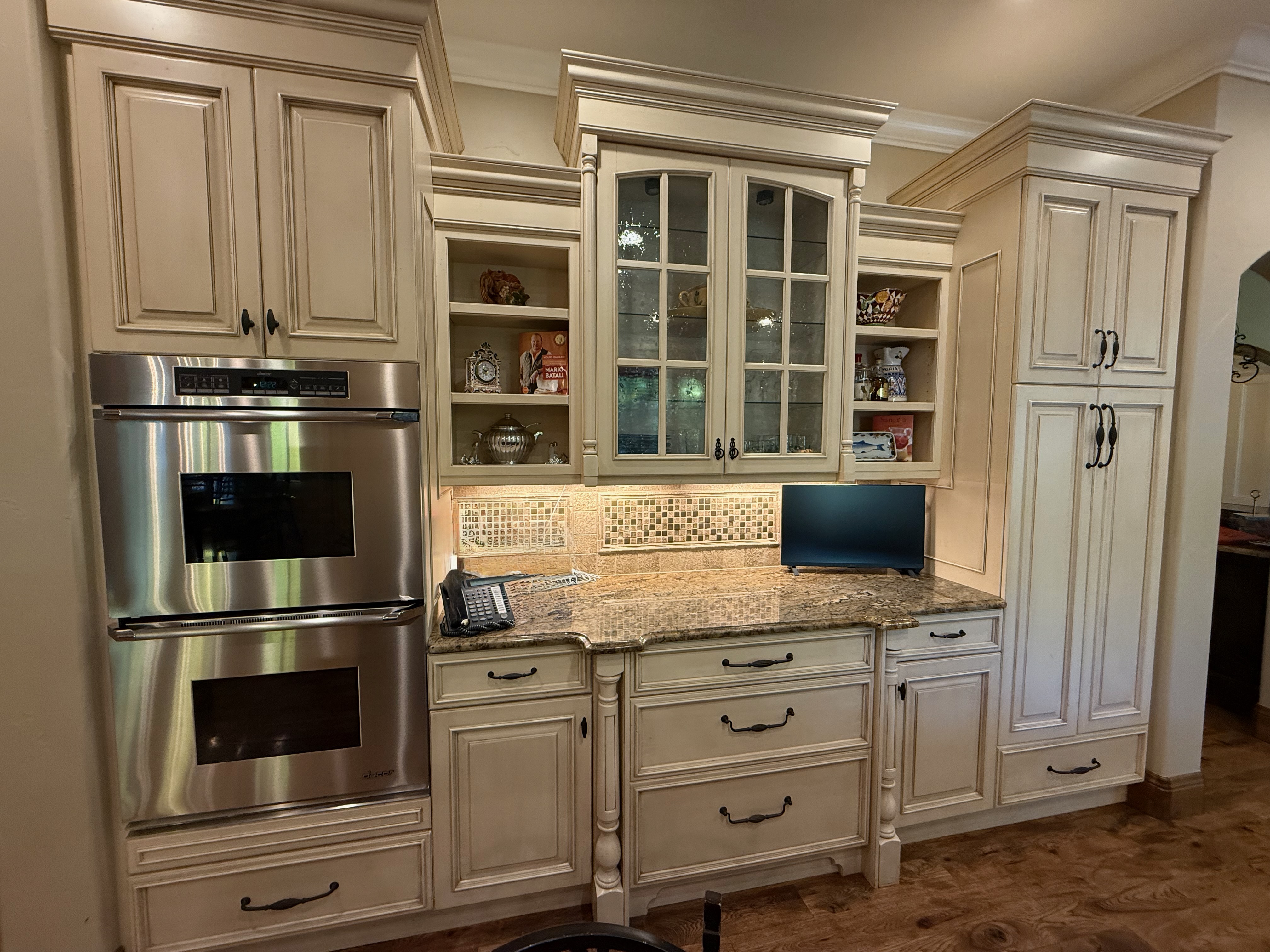 1-Two door, one drawer tall cabinet for a Double Oven Dim.: 30” w x 97 ¾”h cabinet only/102”h to center crown/106”h to the top crown x 24” d