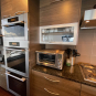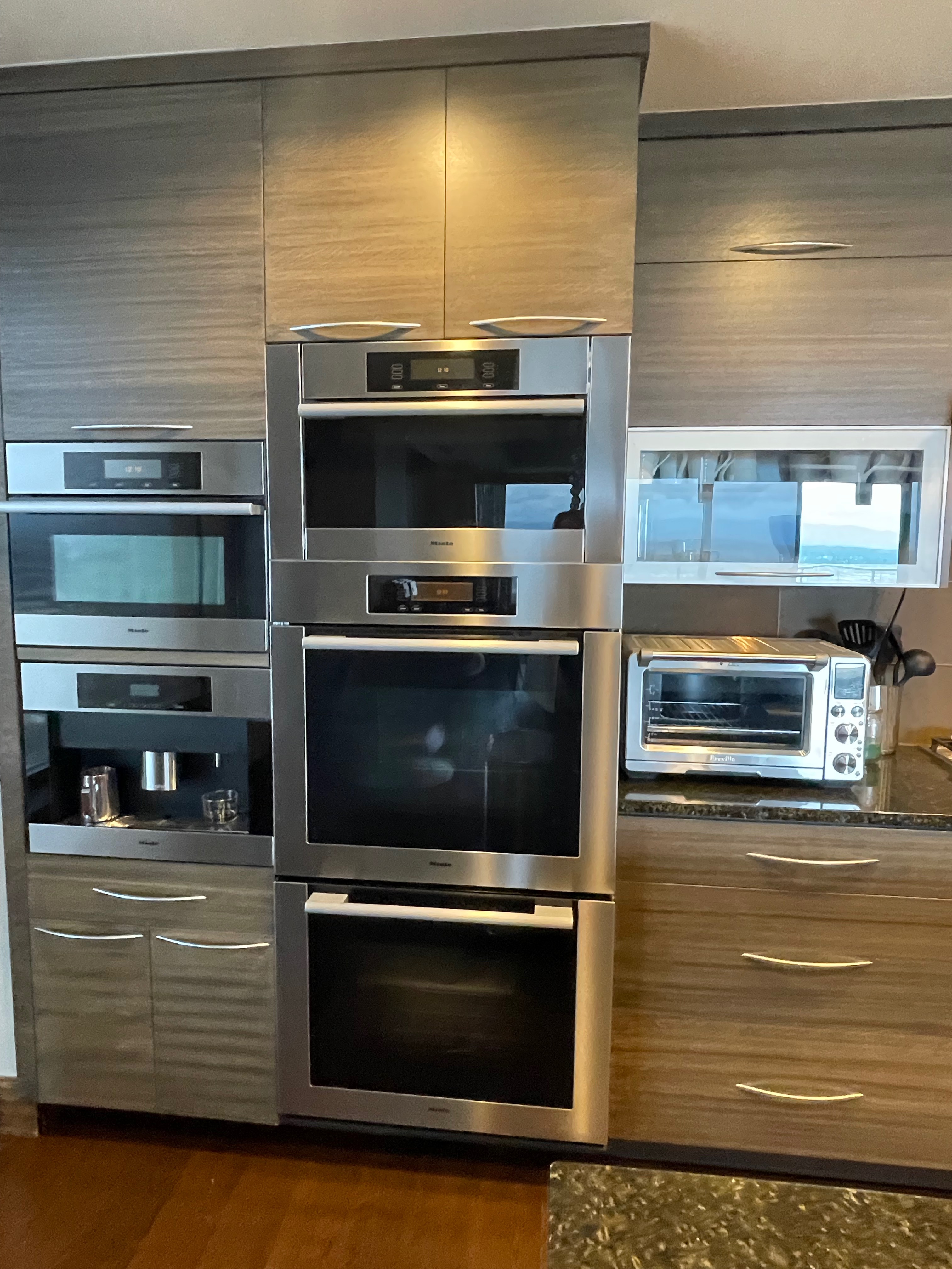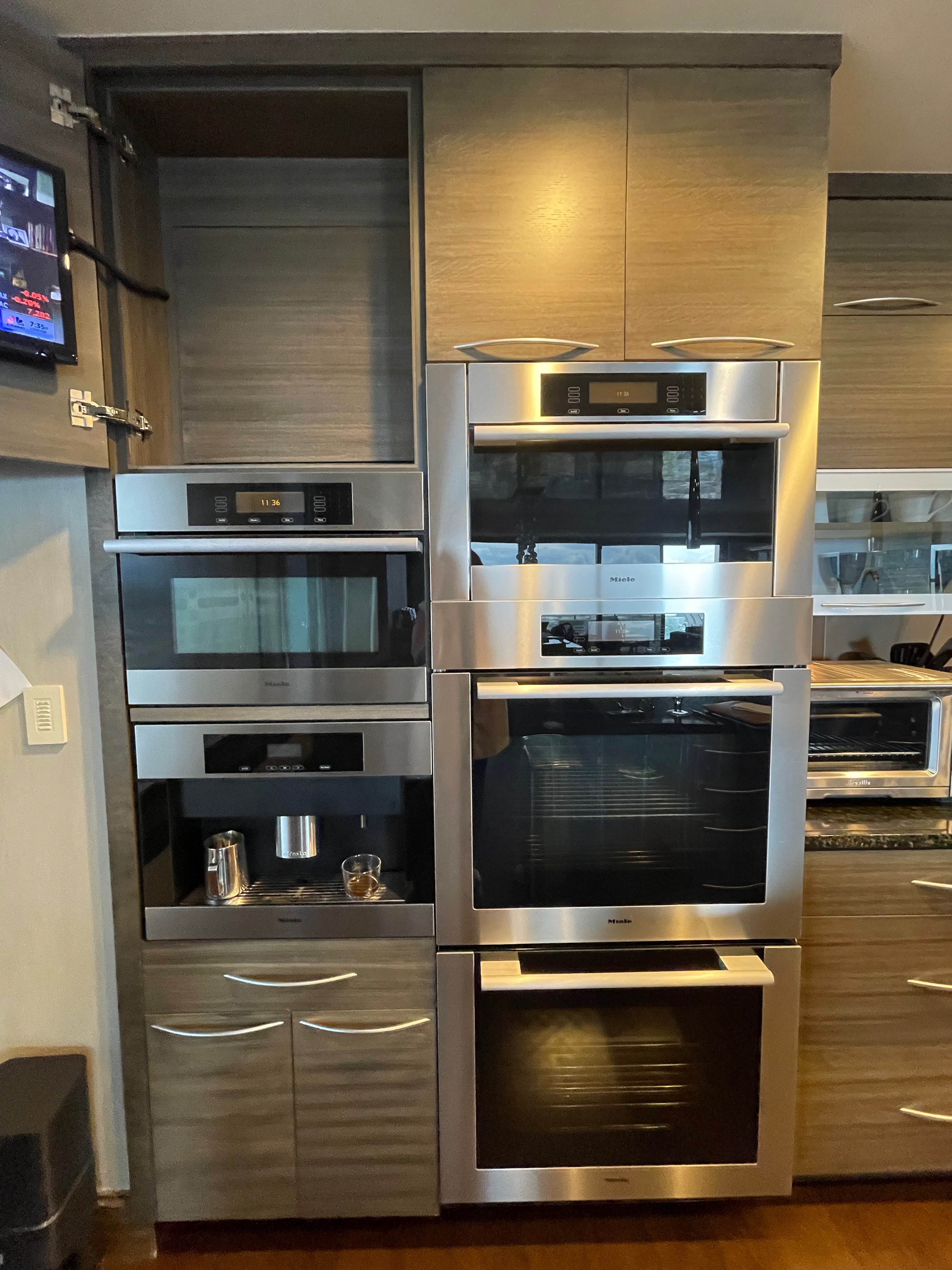 1-Two door double tall cabinets, holds speed oven & double oven Dim.: 30” w x 95”h/ 97 1/2”h w/crown x 24” d