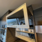 1-One door bi-fold lift up glass wall cabinet w/ one cabinet above. Dim.:33”w x 41”h/ 43 1/2”h/ w/crown x 13 1/2”d