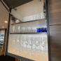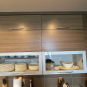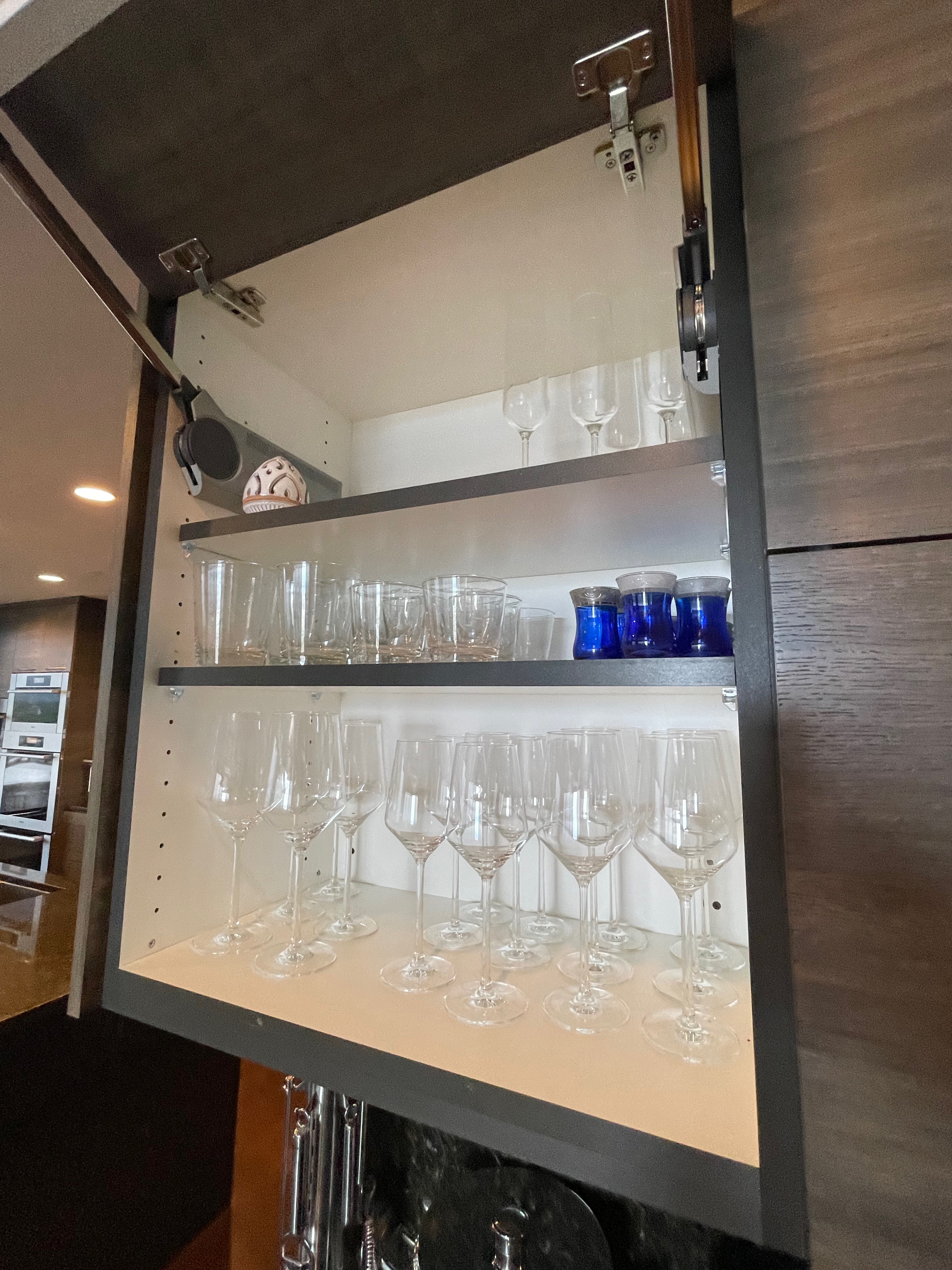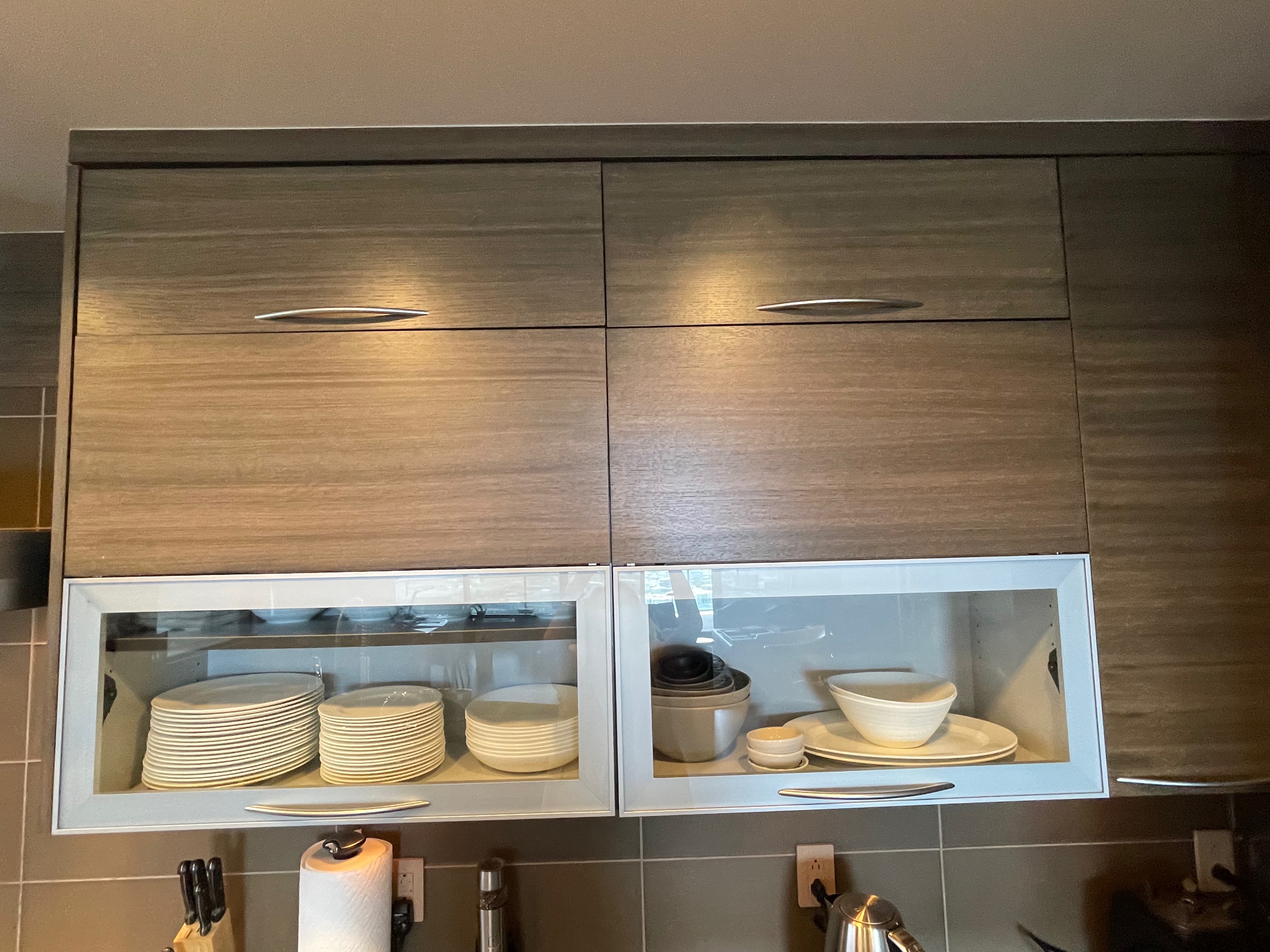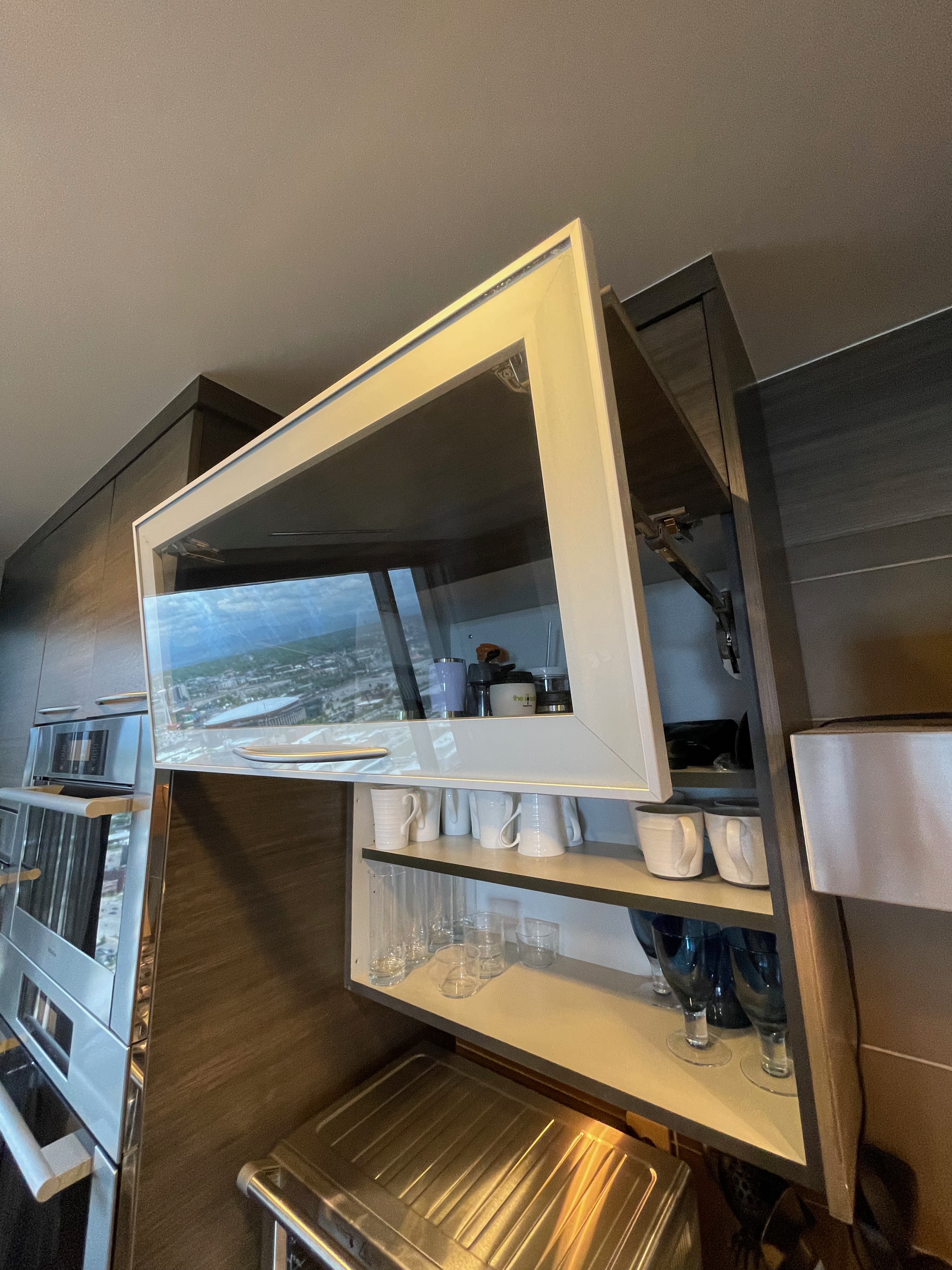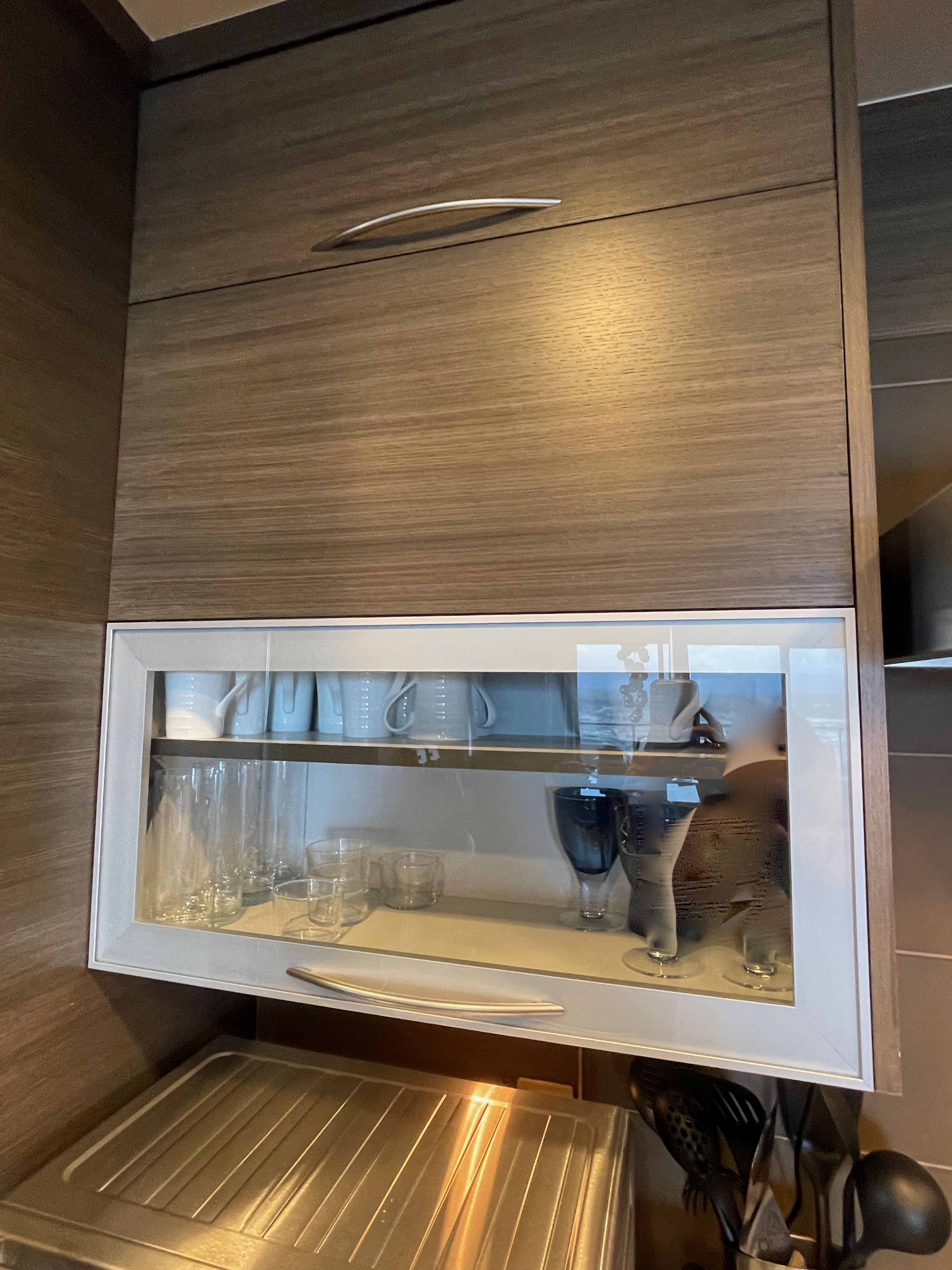 1-One door bi-fold lift up glass wall cabinet w/ one cabinet above. Dim.:30 ¾”w x 41”h/ 43 1/2”h w/crown x 13 1/2”d