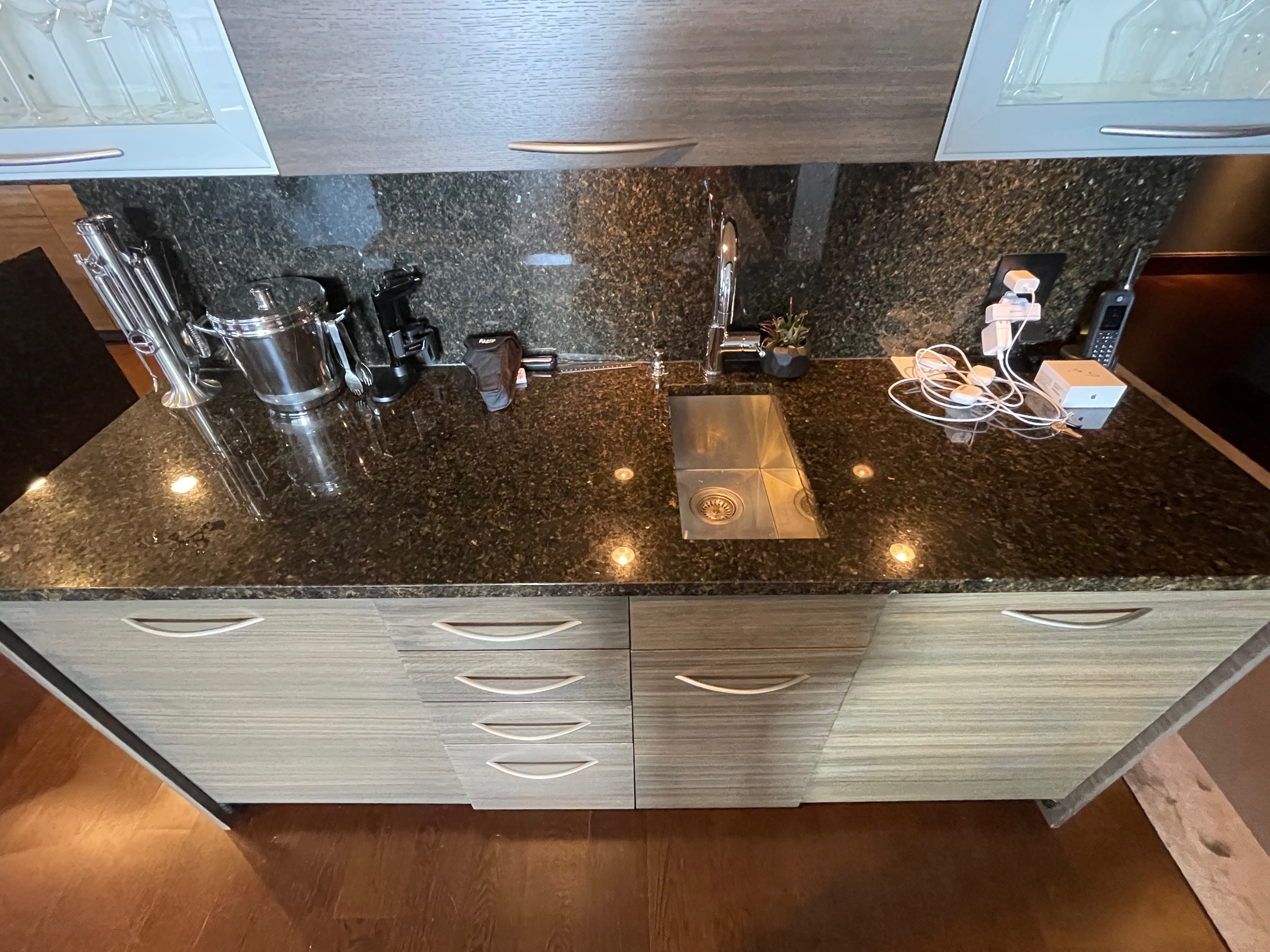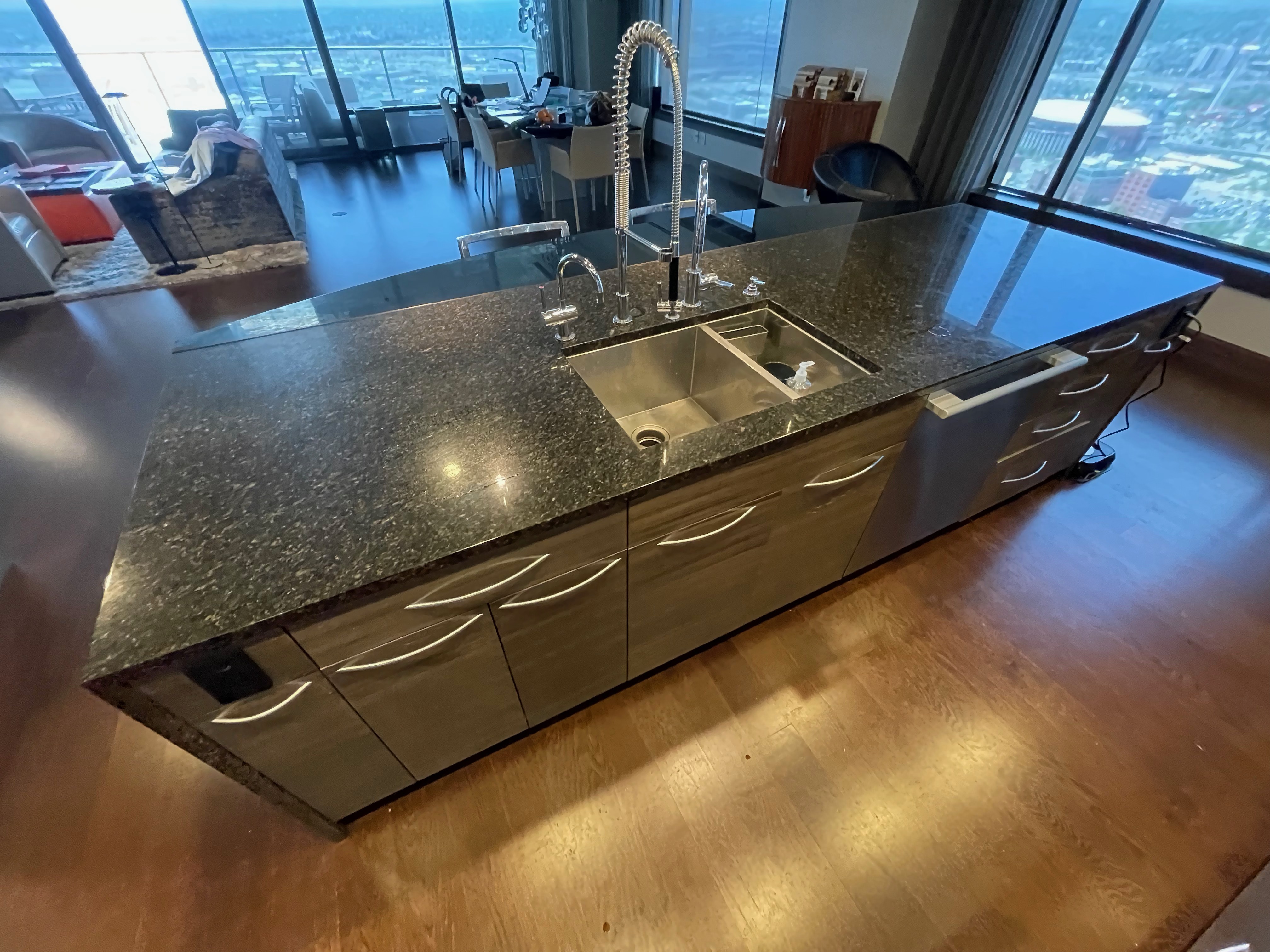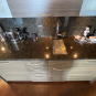 Black galaxy island countertops Overall 120” w x 55”d the center x 42”w ea. end