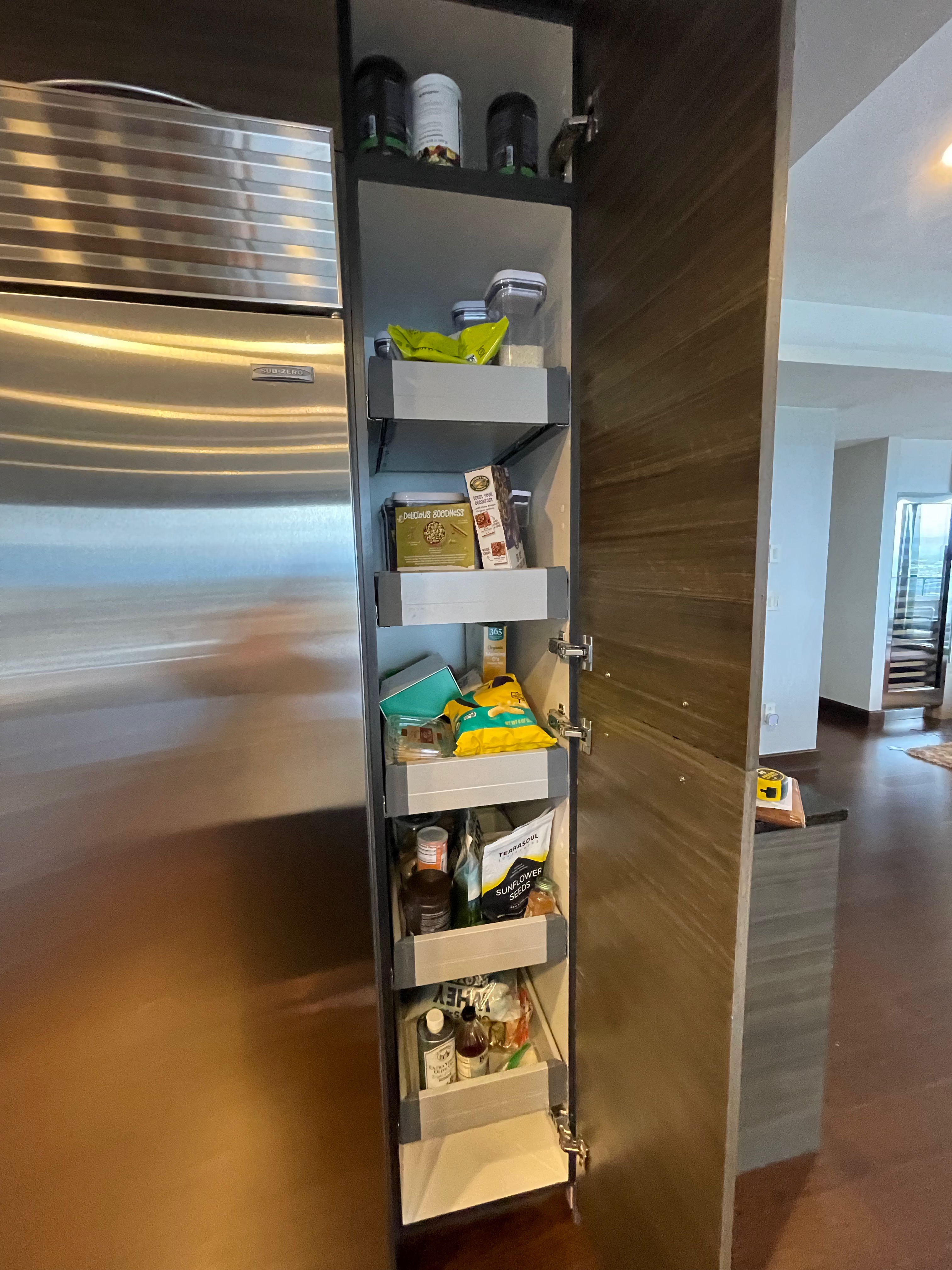1-One door pantry w/ 5 pullout drawers Dim.: 16” w x 95”h/ 97 1/4”h w/crown x 24” d