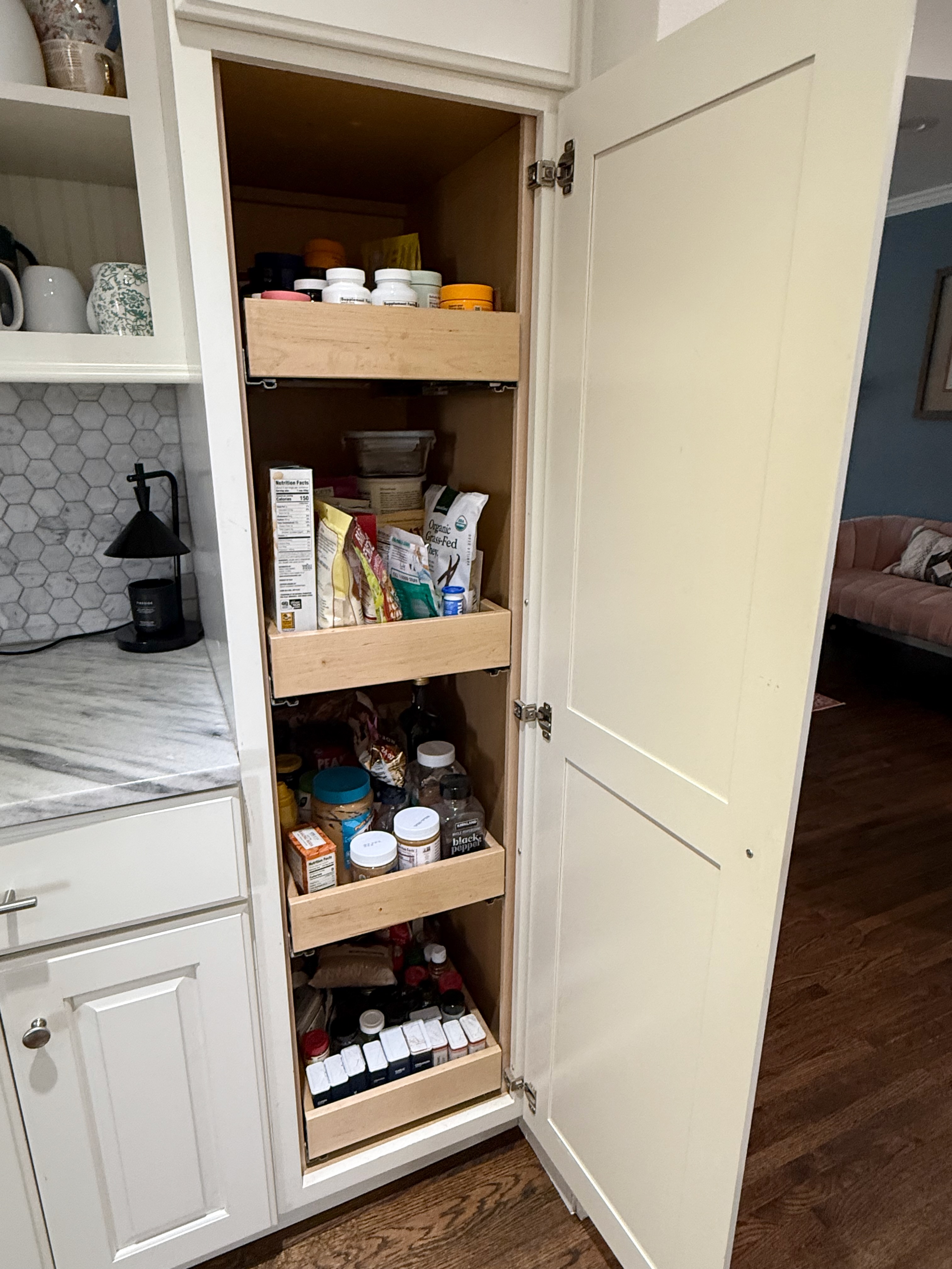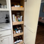 1-Two door double tall pantry cabinet w/ 5 roll-out drawers inside Dim.: 18”w/19’w with filler x 89”h x 24”d