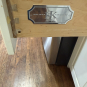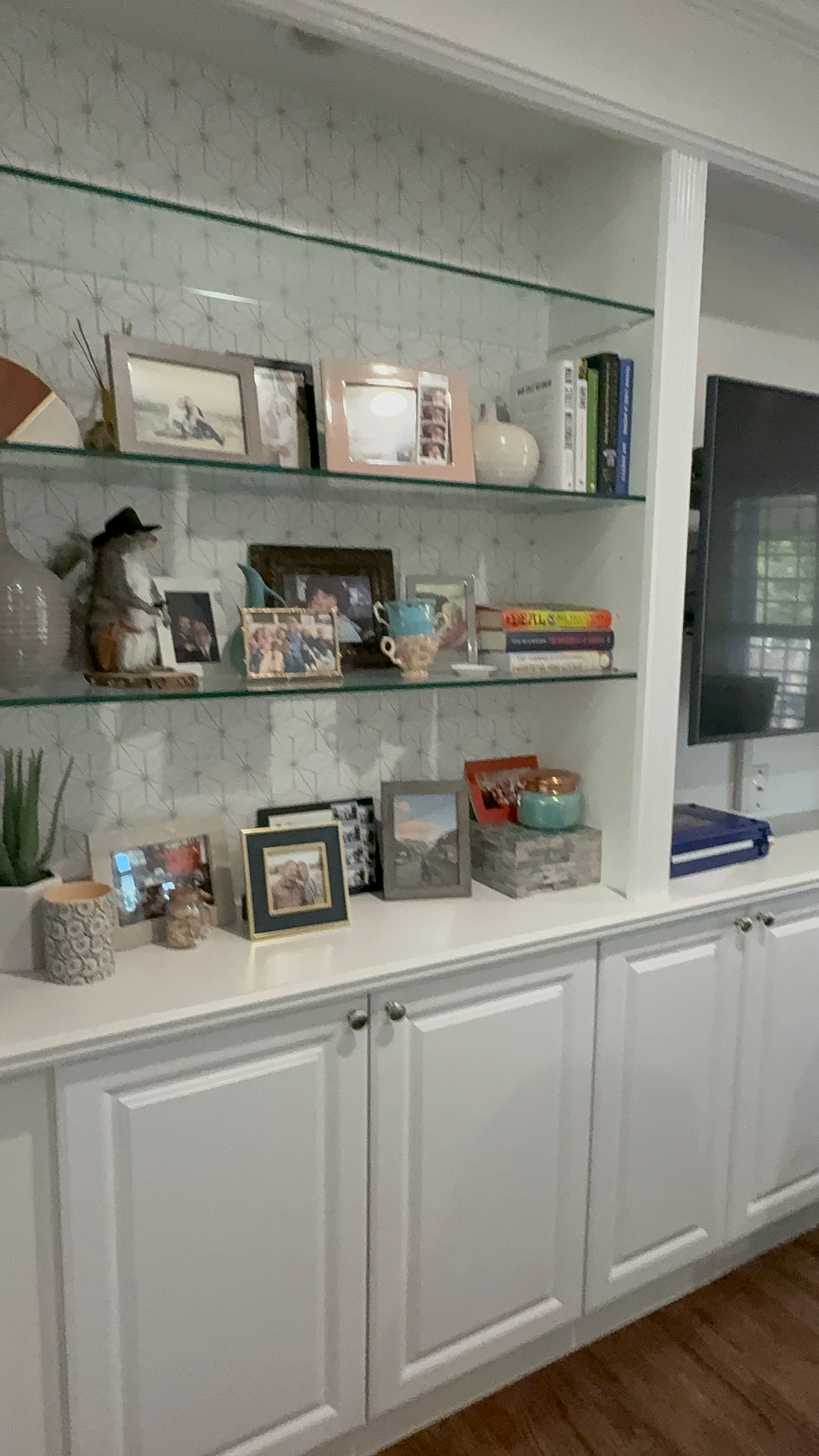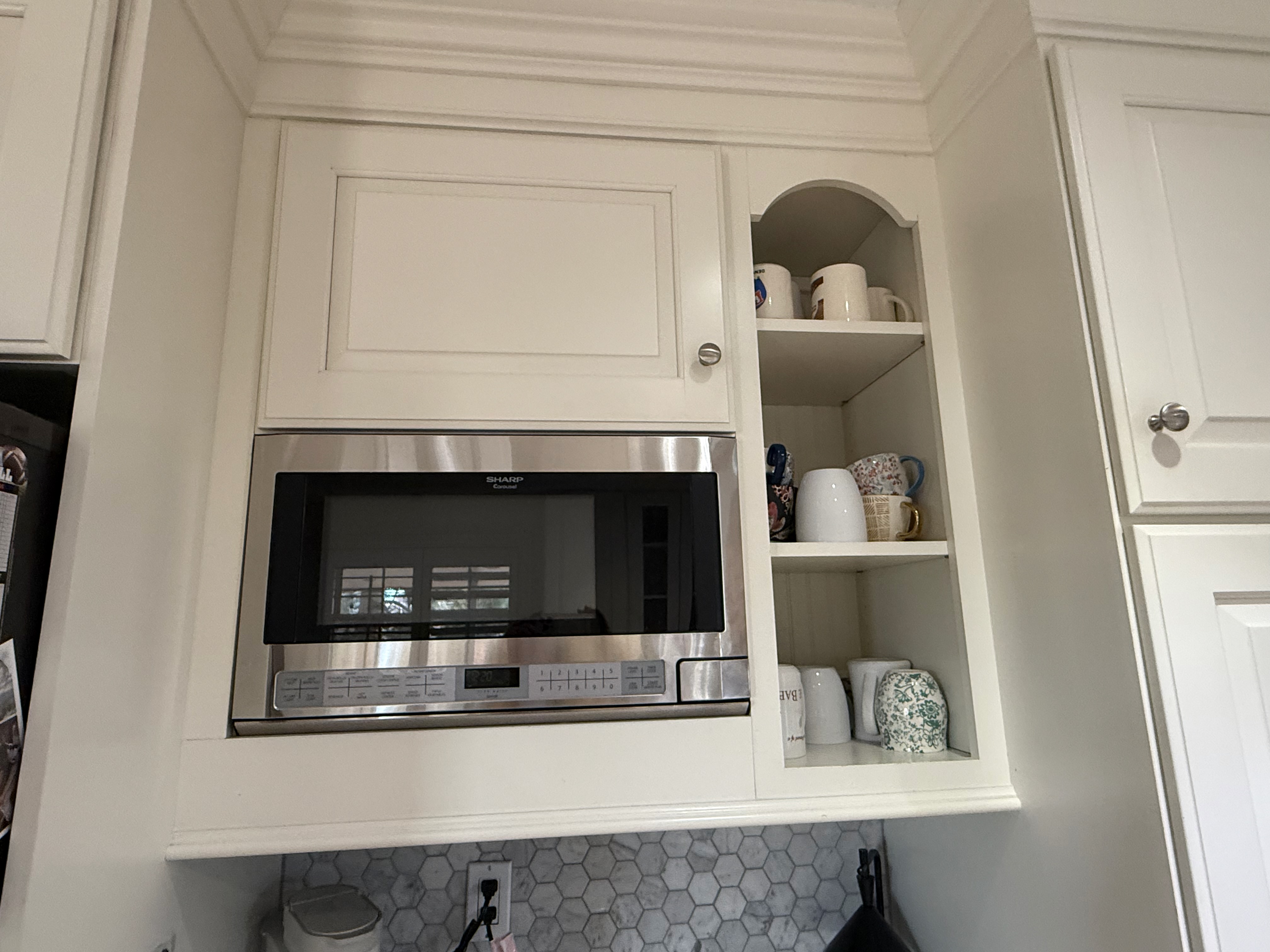 1-One door upper cabinet that holds the microwave 26” w cabinet only/39”w/shelving to the right x 35”h/42”h w/ crown x 15”d