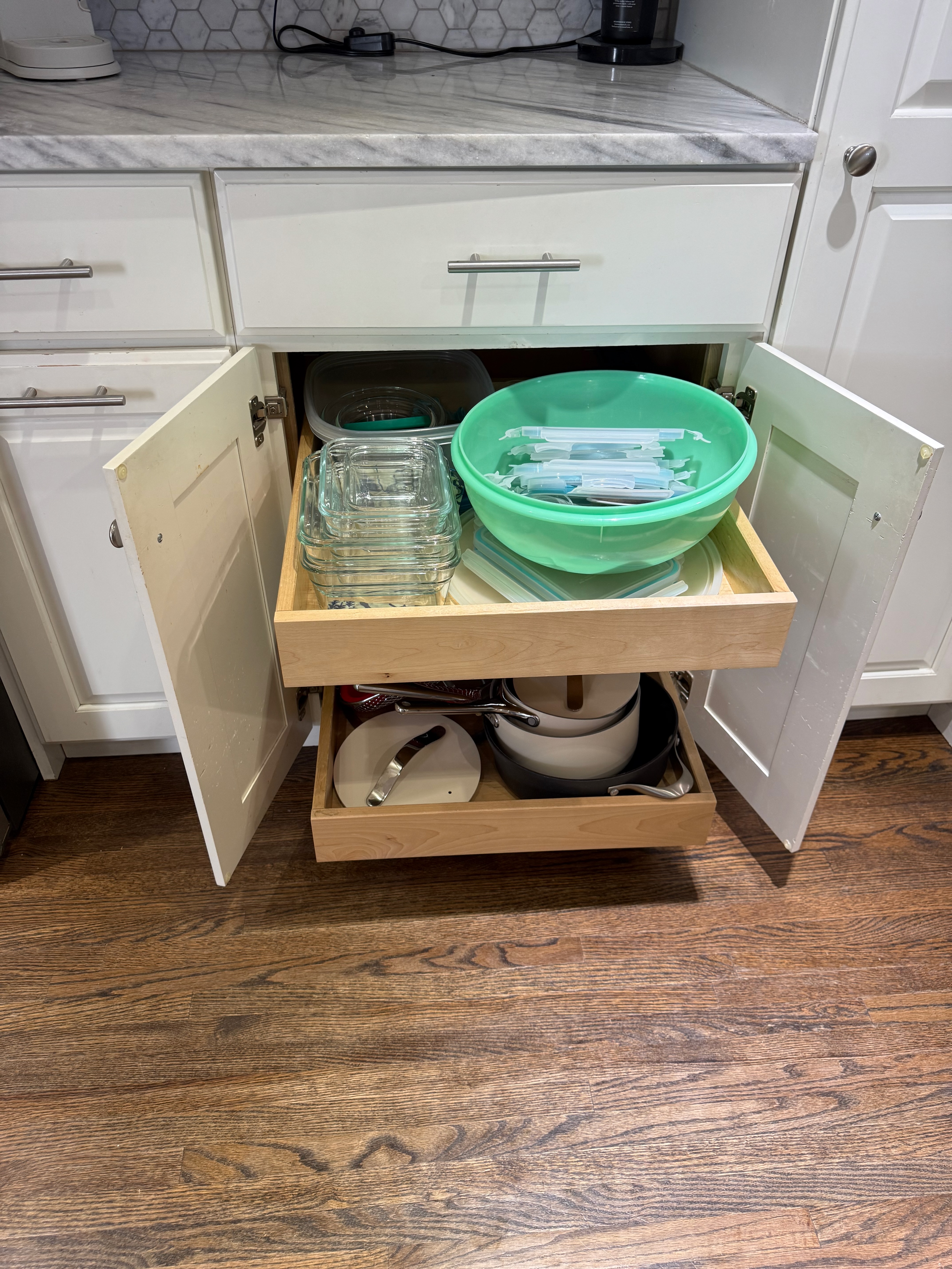 1-One drawer, two door base cabinet, two pull-out drawers inside Dim.: 24”d x 36”h x 24”d