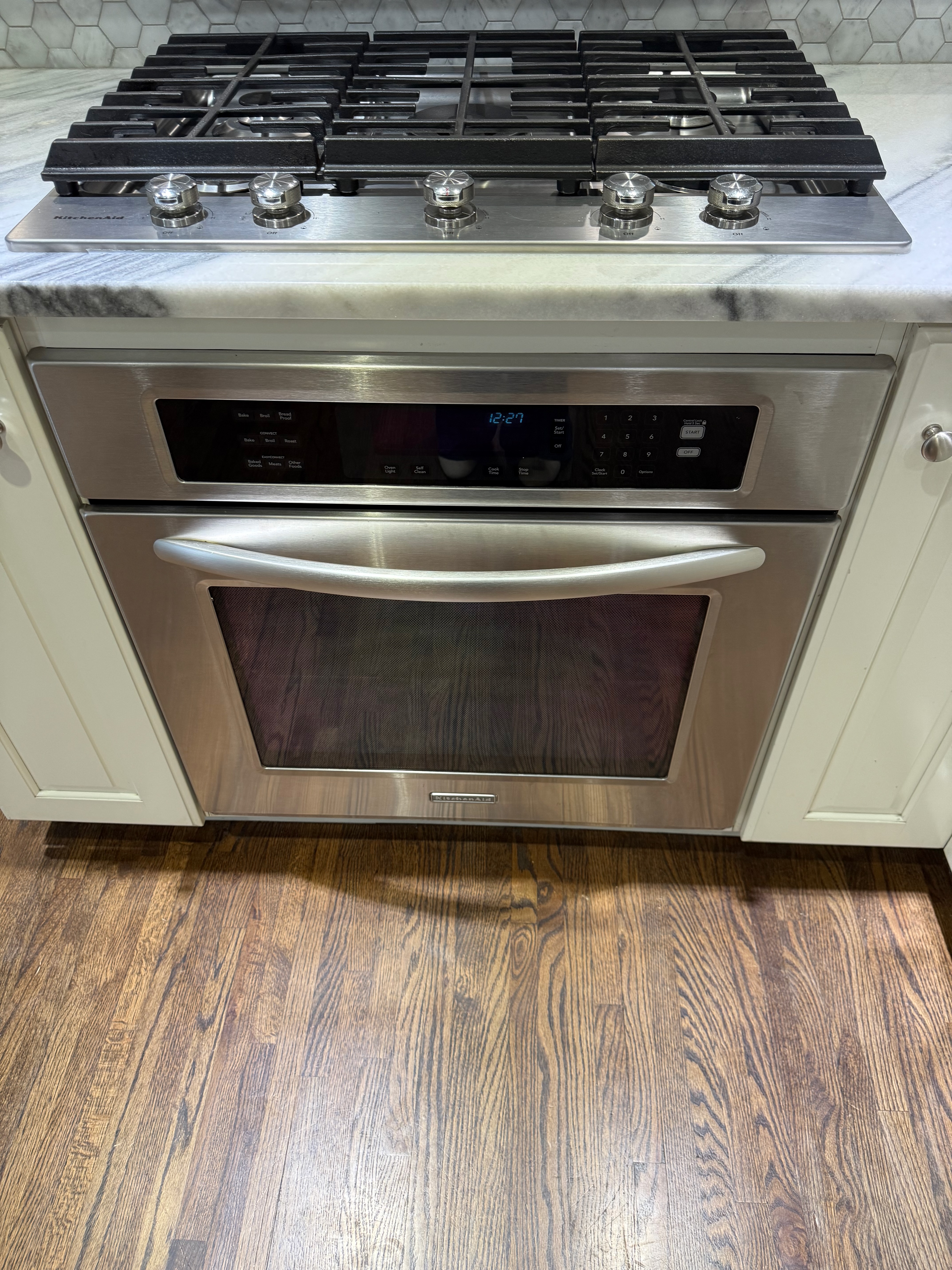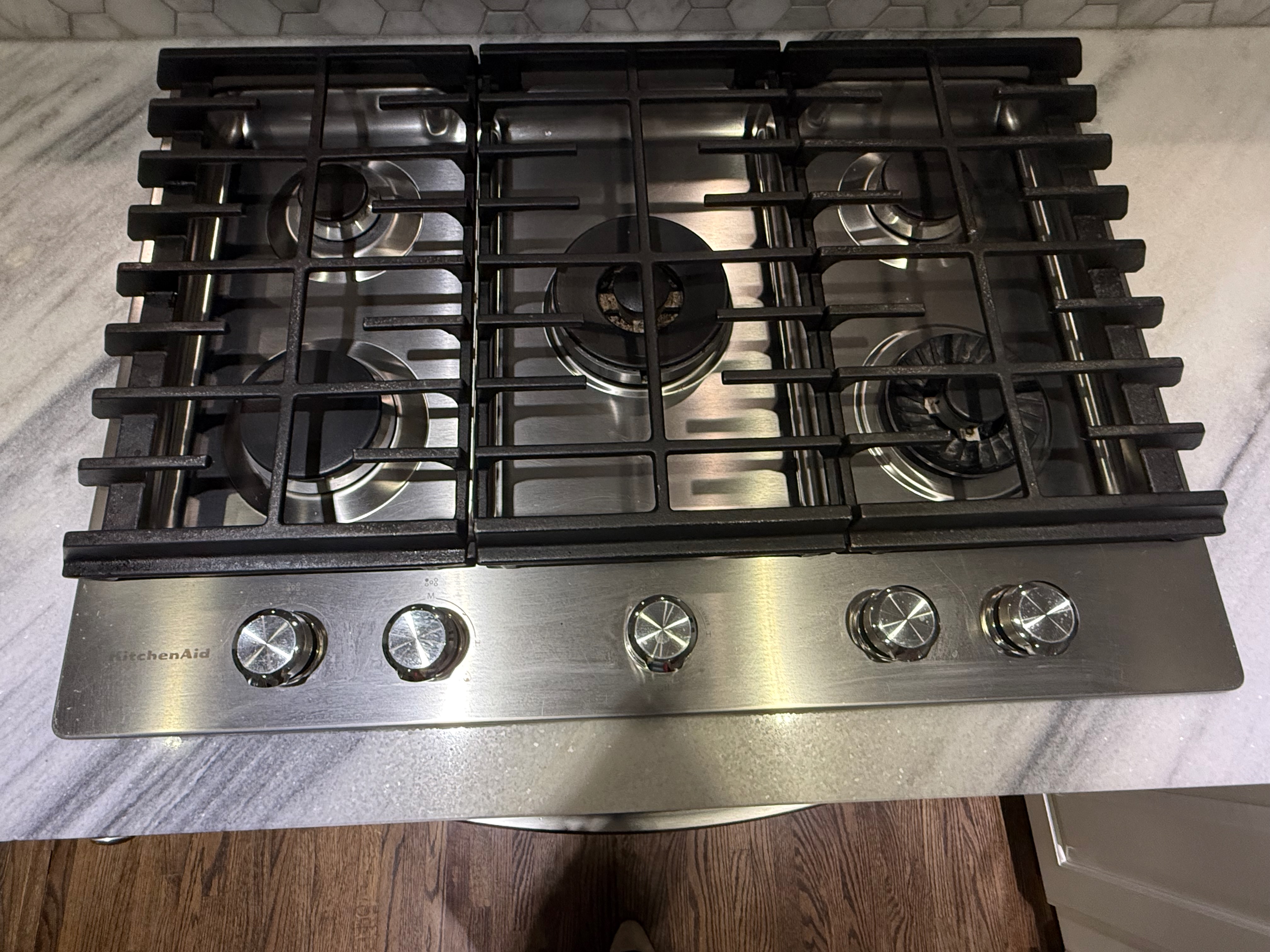 30” KitchenAid stainless-steel 5 burner gas cooktop Model # KCGS550ESS, Dim.: 30”w x 21”d, Listing price new $1,699