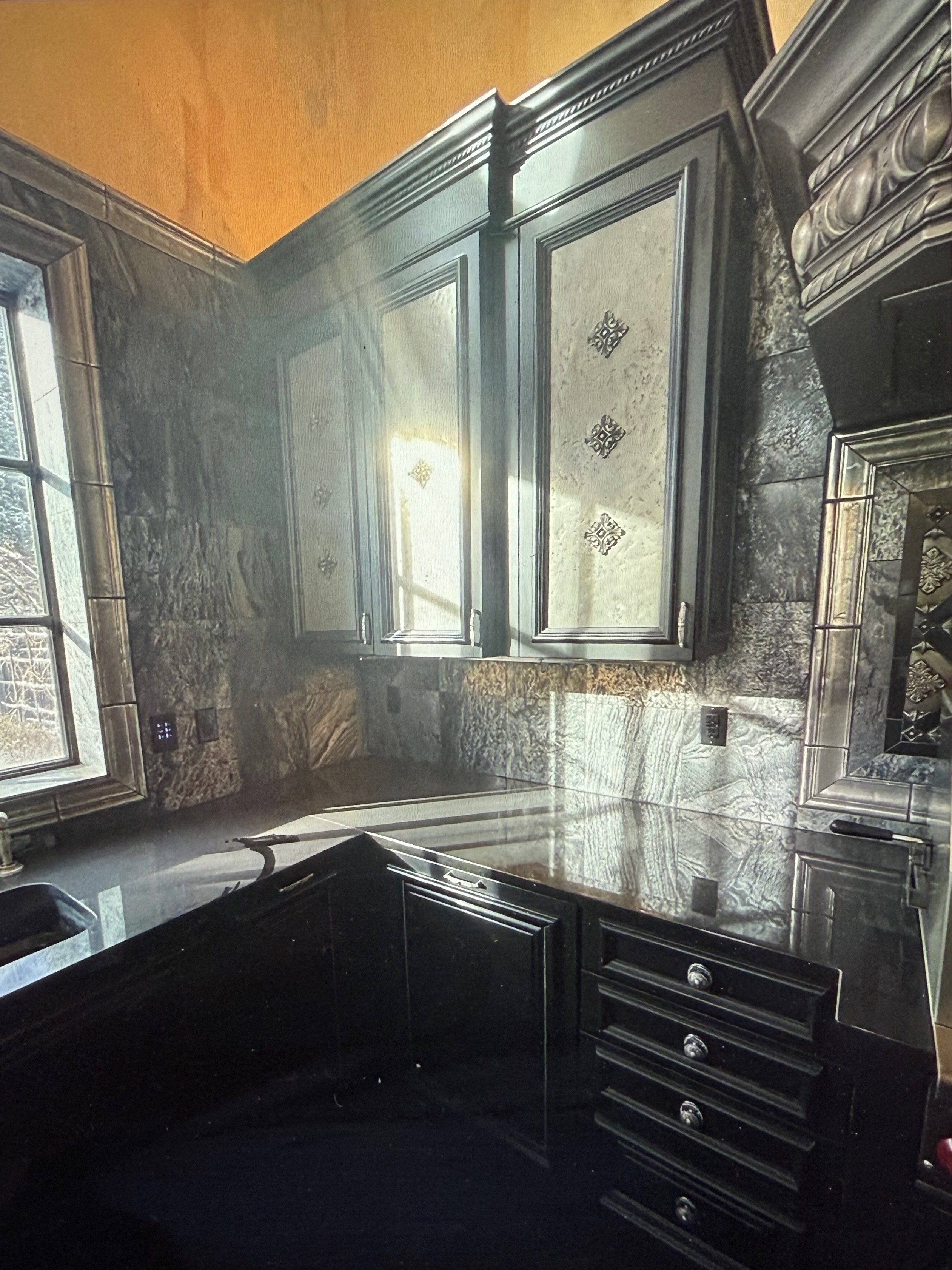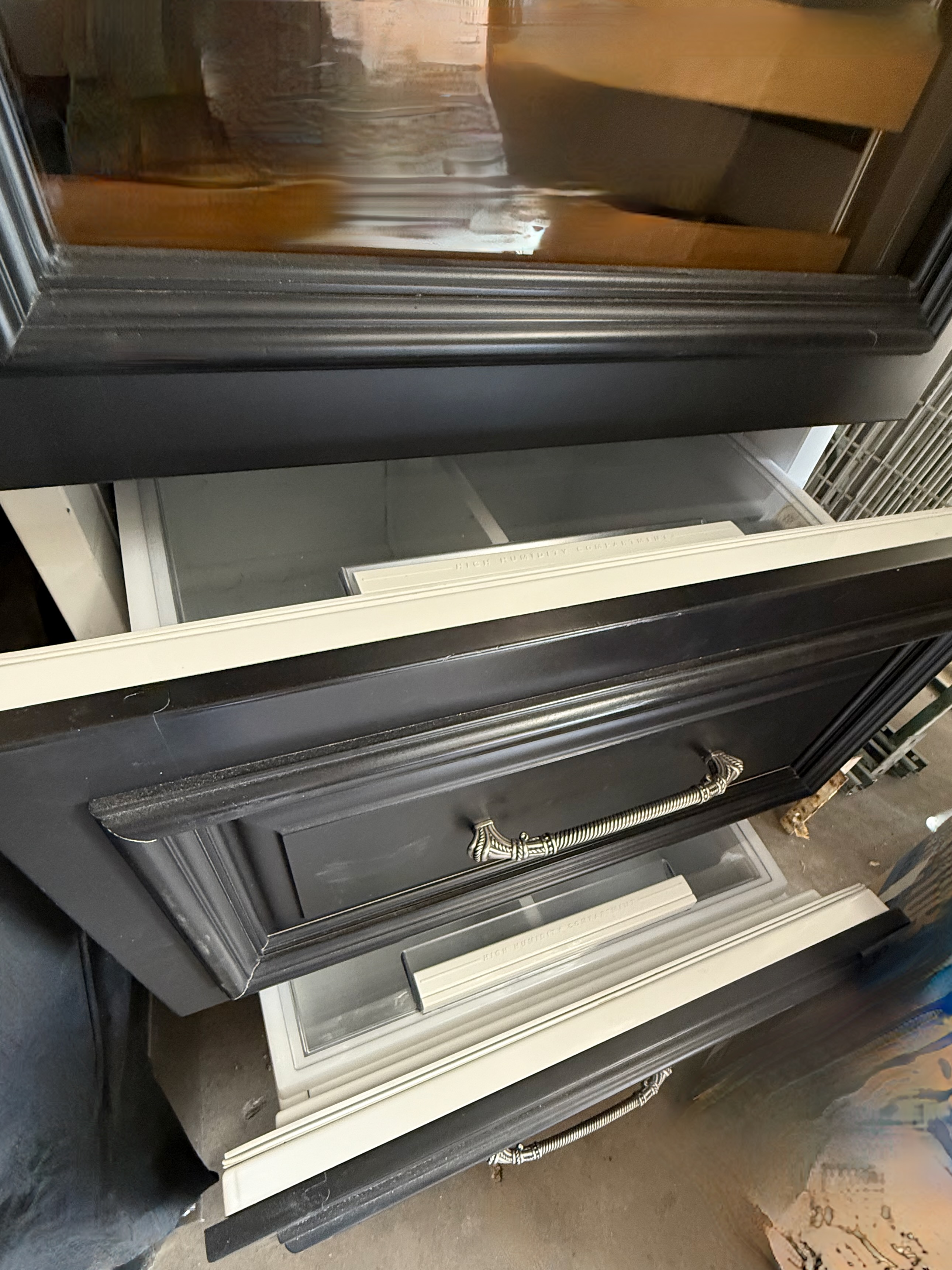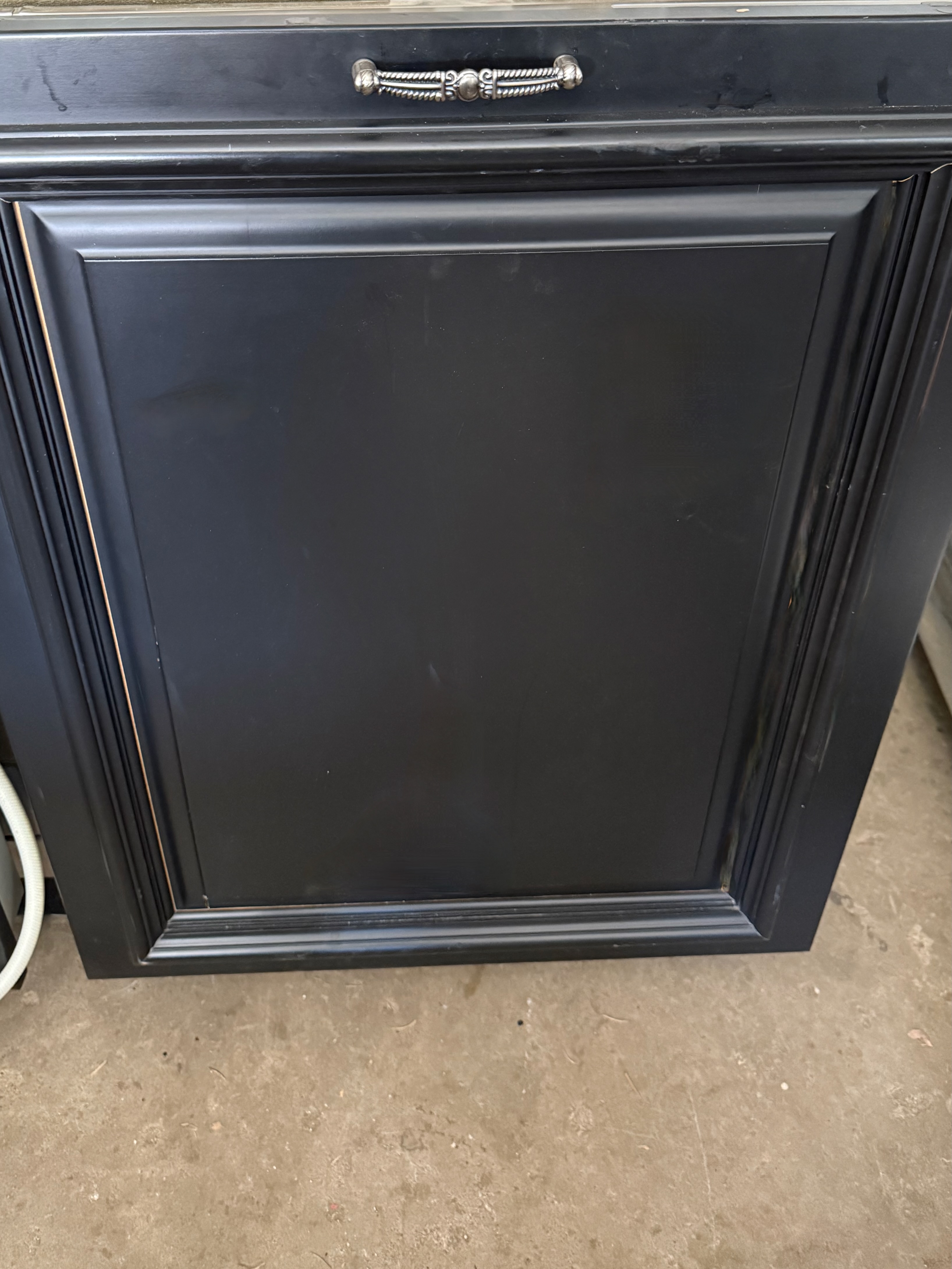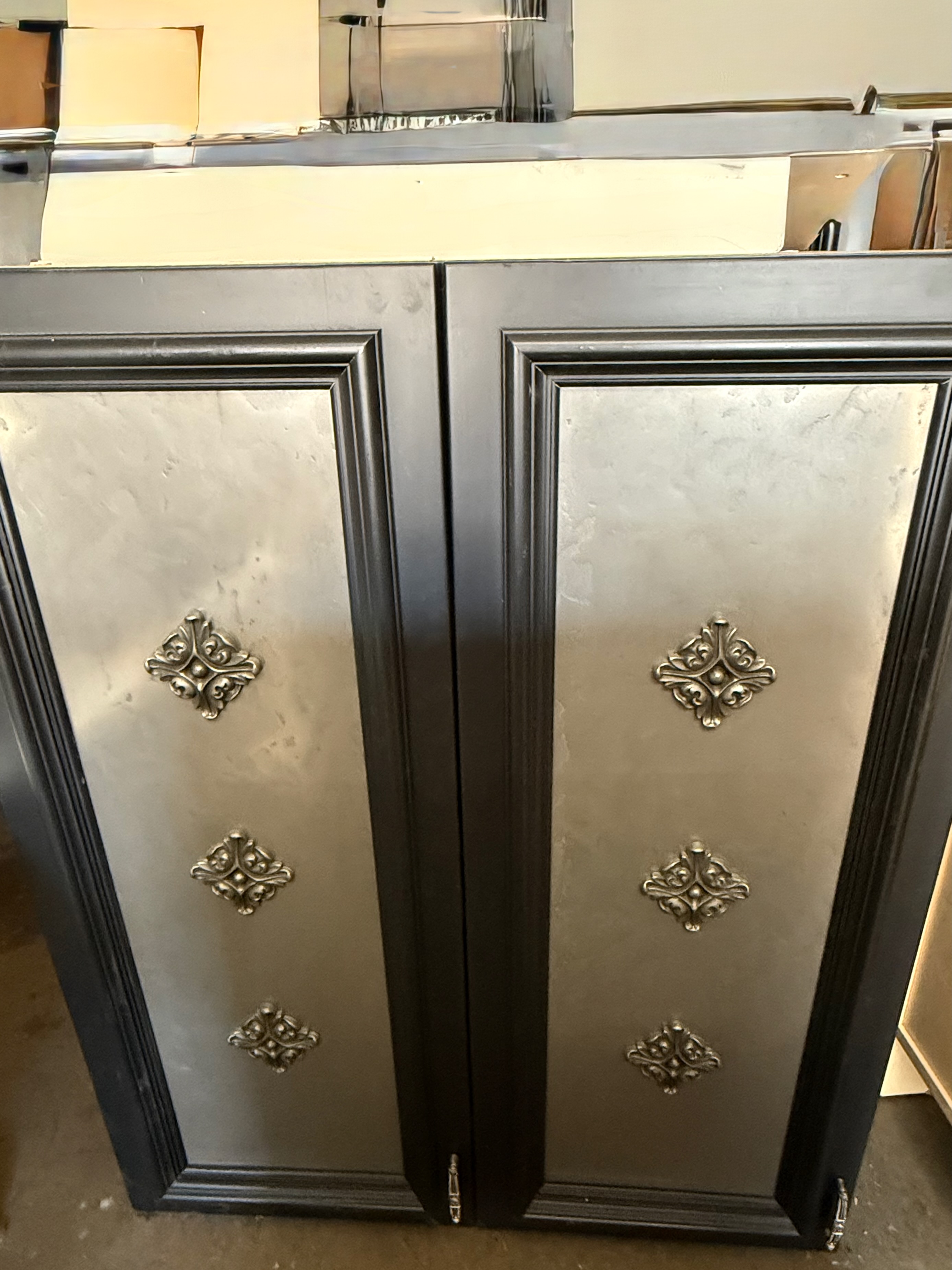 High-end Cuisine Laurier Kitchen cabinets full access frameless cabinets in the DuJardin door style in a black pepper-stained Maple wood with tin panel inserts and decorative medallions. The cabinets have soft-close, full extension and dove tail drawers. All cabinets are soft closing clip hinges with a 110-degree opening. The set comes with a Sub-Zero wine cooler, ice maker and Asko dishwasher. This was a kitchen/ bar in a multi-million dollar 35,000 sq. ft. estate in Cherry Hills. This would be a great small kitchen, wet bar, outdoor kitchen, kitchen for a tiny home or RV. Everything has been uninstalled, moved to storage and ready for pick up.