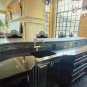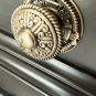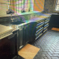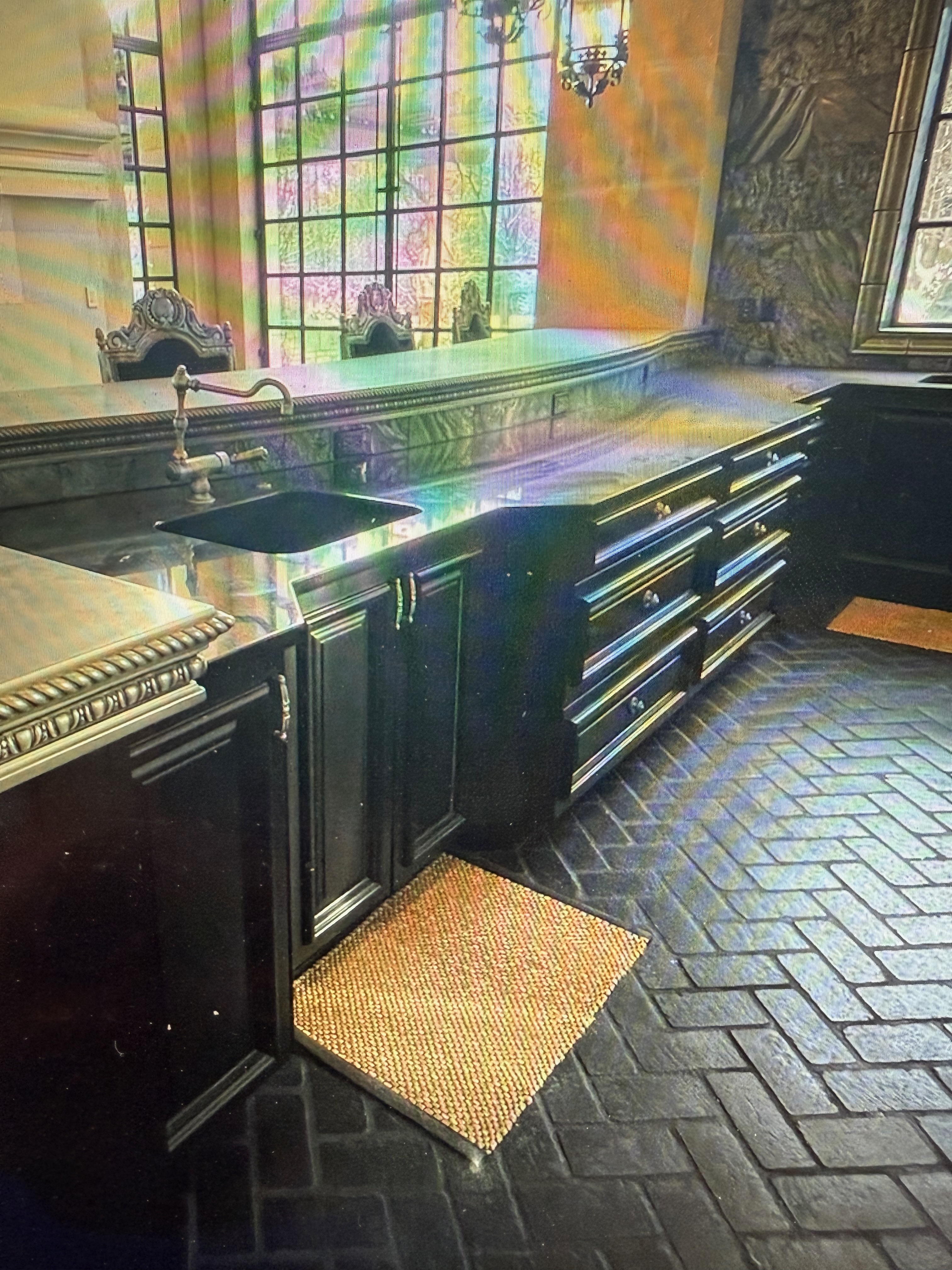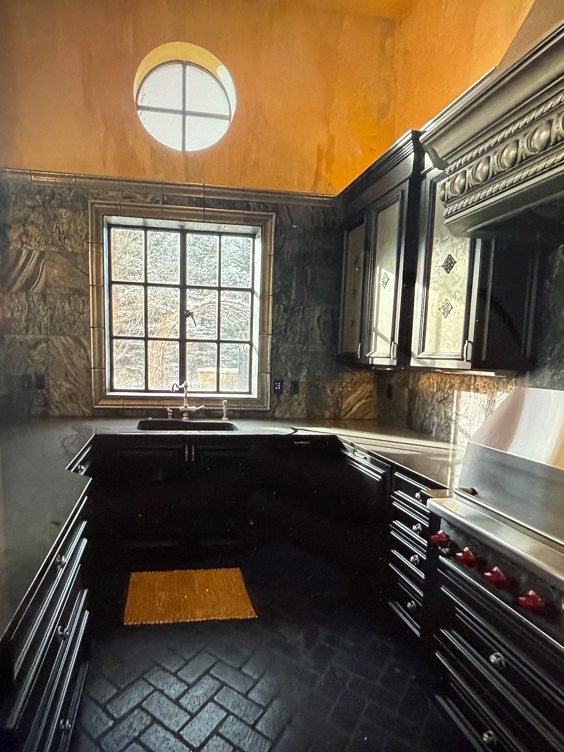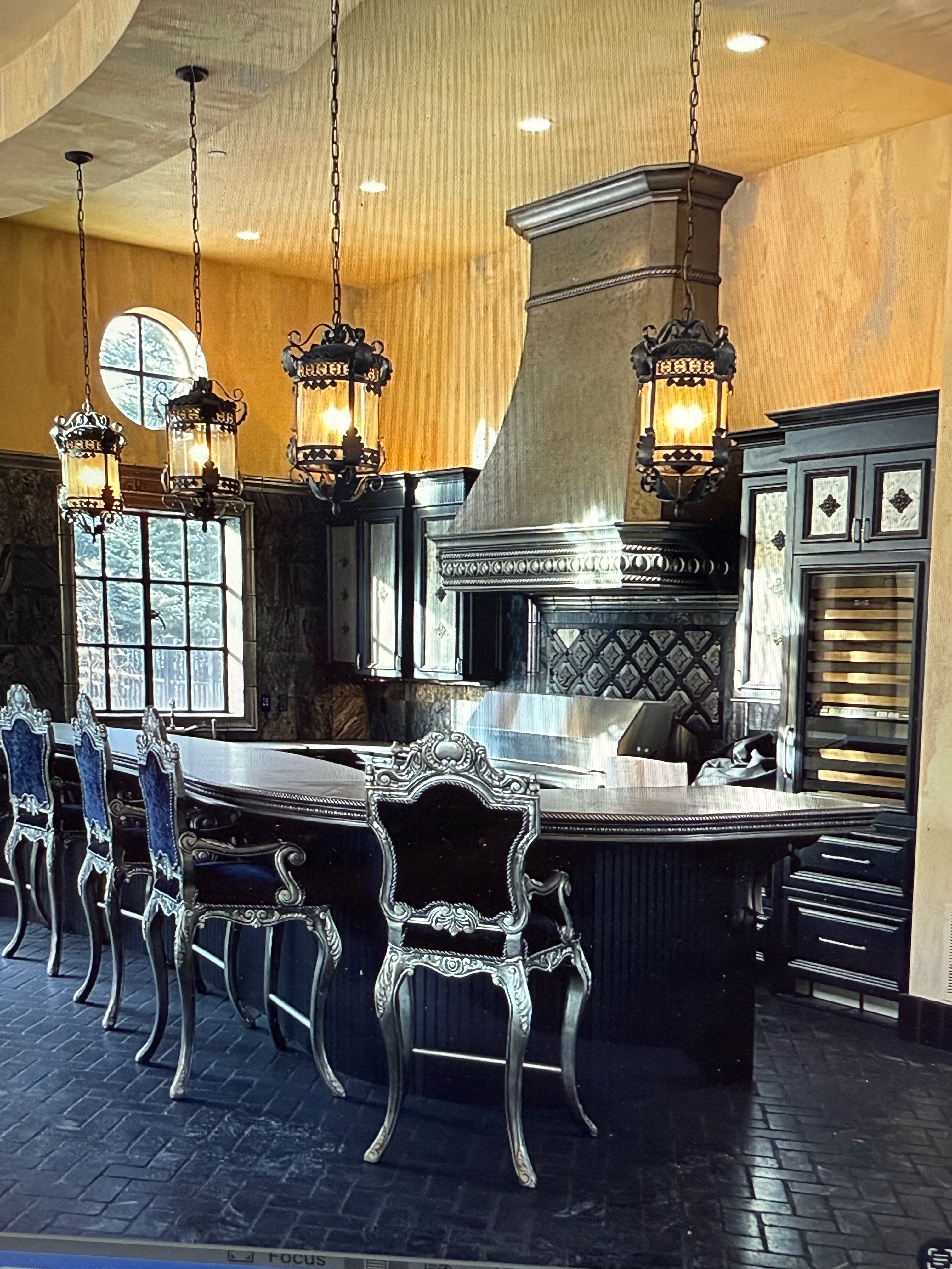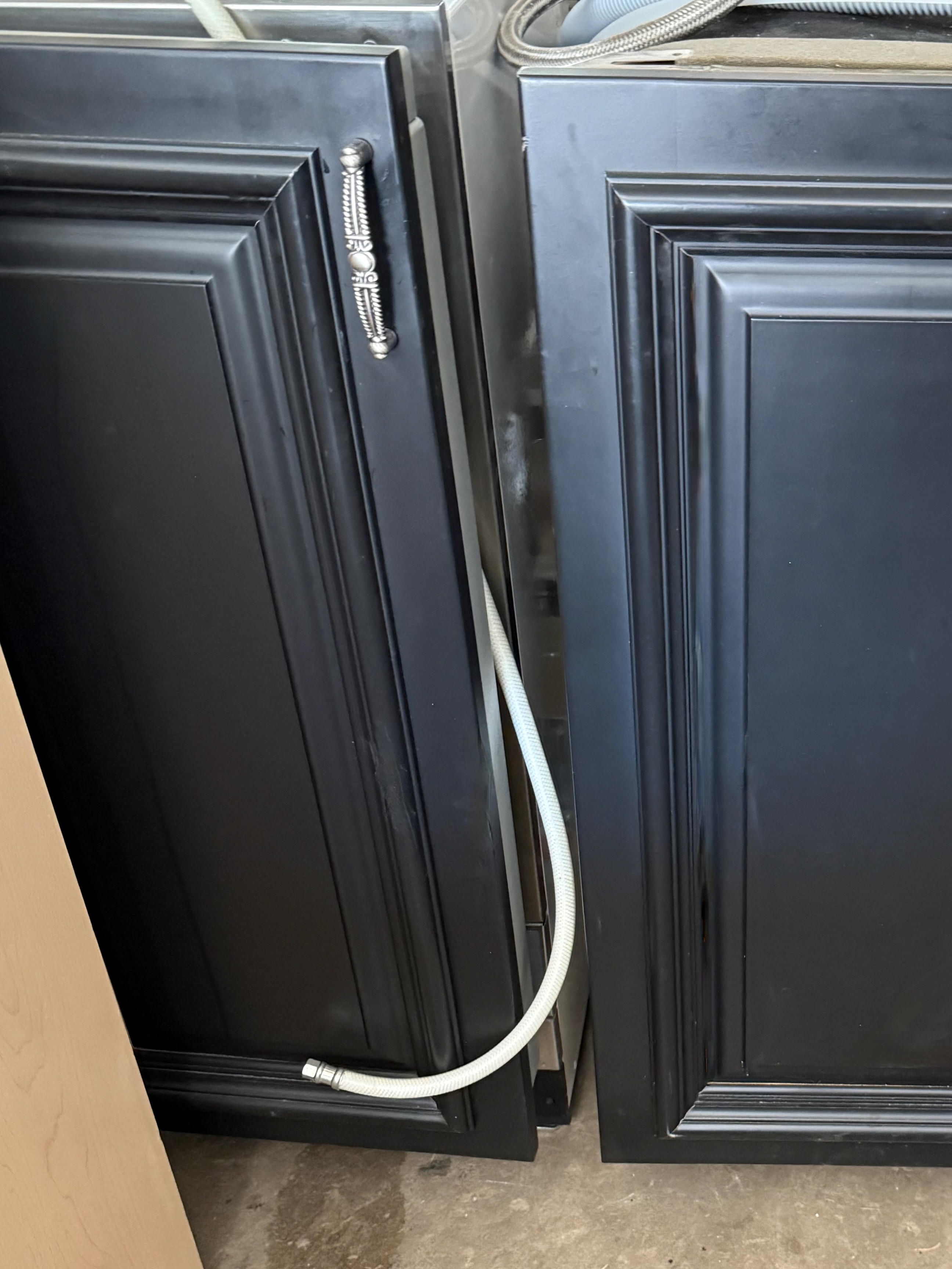 High-end Cuisine Laurier Kitchen cabinets full access frameless cabinets in the DuJardin door style in a black pepper-stained Maple wood with tin panel inserts and decorative medallions. The cabinets have soft-close, full extension and dove tail drawers. All cabinets are soft closing clip hinges with a 110-degree opening. The set comes with a Sub-Zero wine cooler, ice maker and Asko dishwasher. This was a kitchen/ bar in a multi-million dollar 35,000 sq. ft. estate in Cherry Hills. This would be a great small kitchen, wet bar, outdoor kitchen, kitchen for a tiny home or RV. Everything has been uninstalled, moved to storage and ready for pick up.