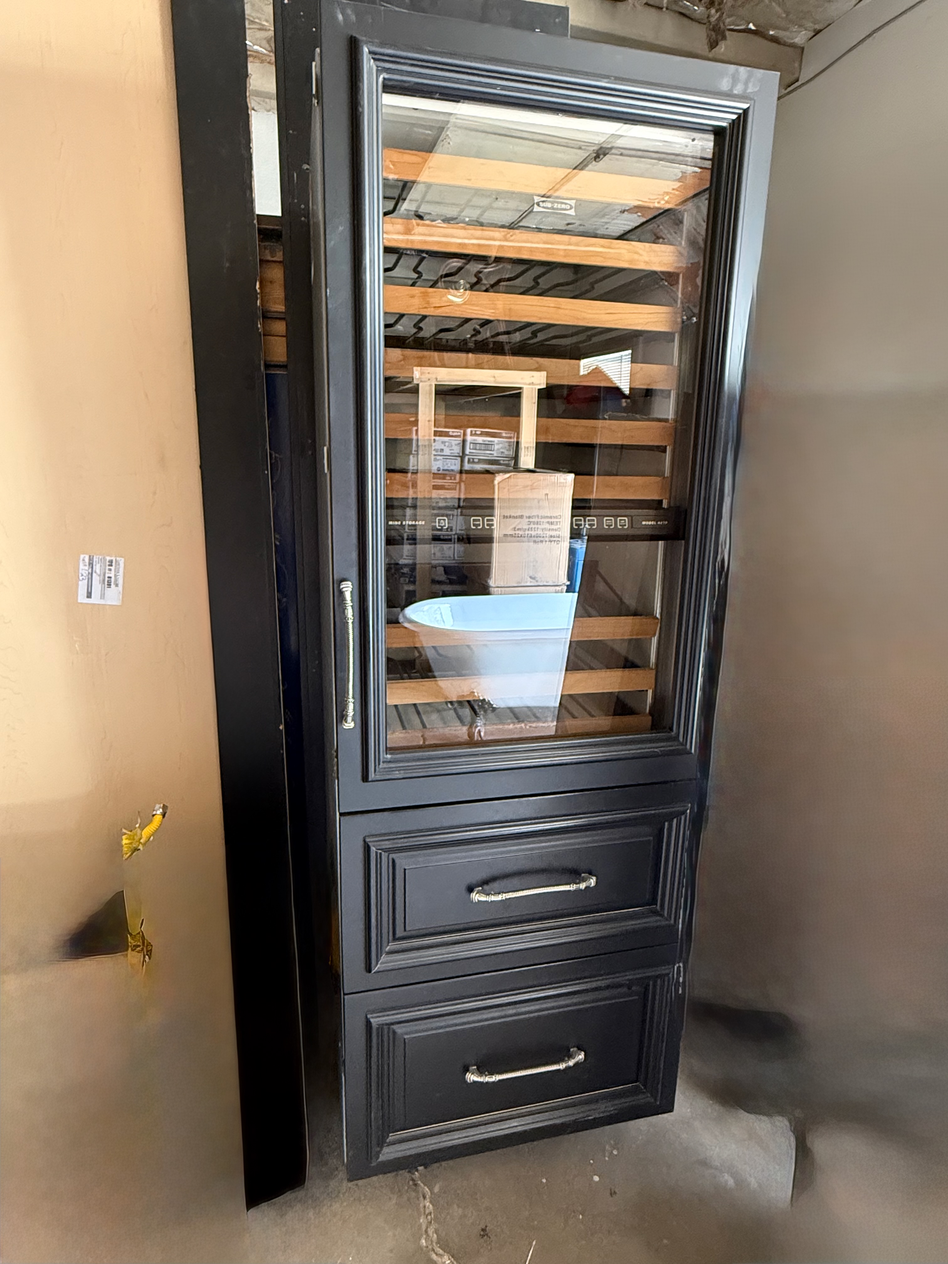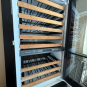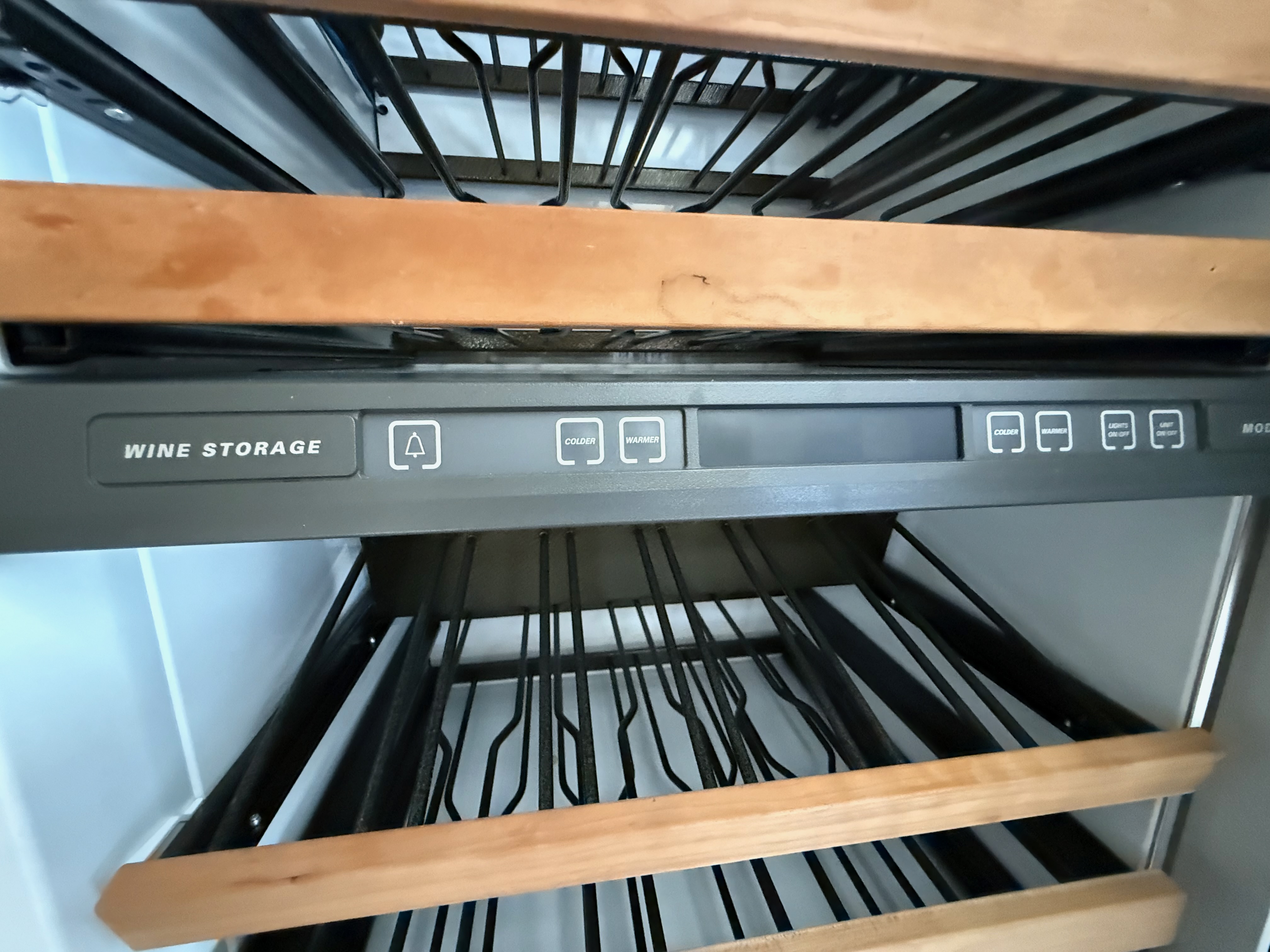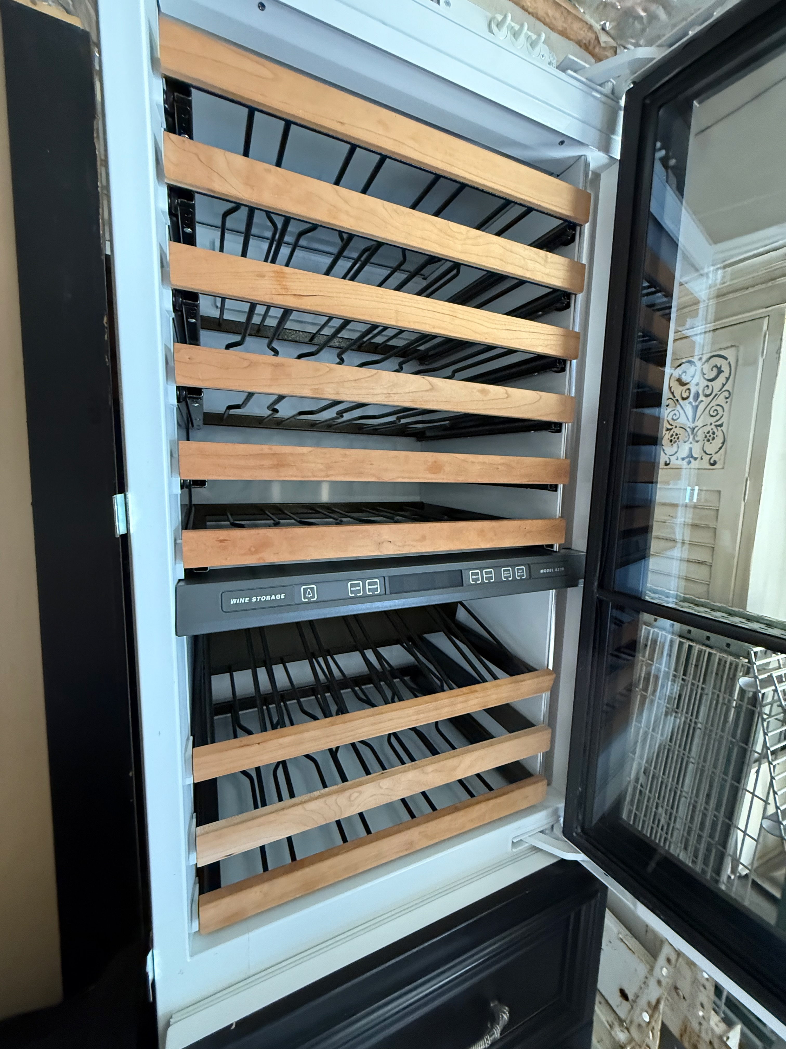27” Sub-Zero wine cooler Inch Built-in Tri Zone Wine/Refrigerator Storage with 78-Bottle Capacity, 9 Compartment Shelves, Roller-Glide Shelves, Cherry Wood Facing, Glass Door and Requires Custom Panels/Handles: Right Hinge Door Swing Model #427RHAG, Serial #F2822752 02/08, New listing price $7,400