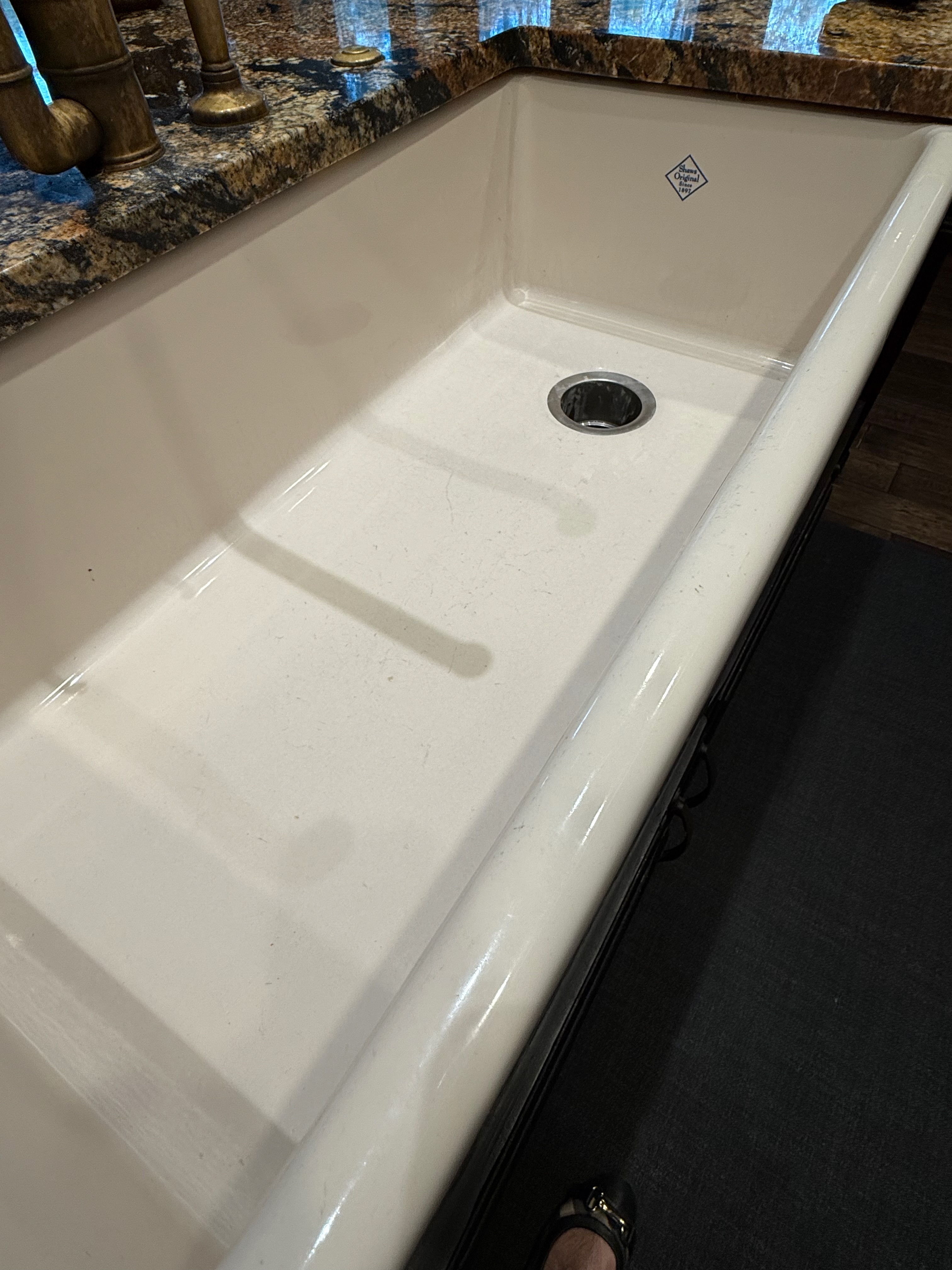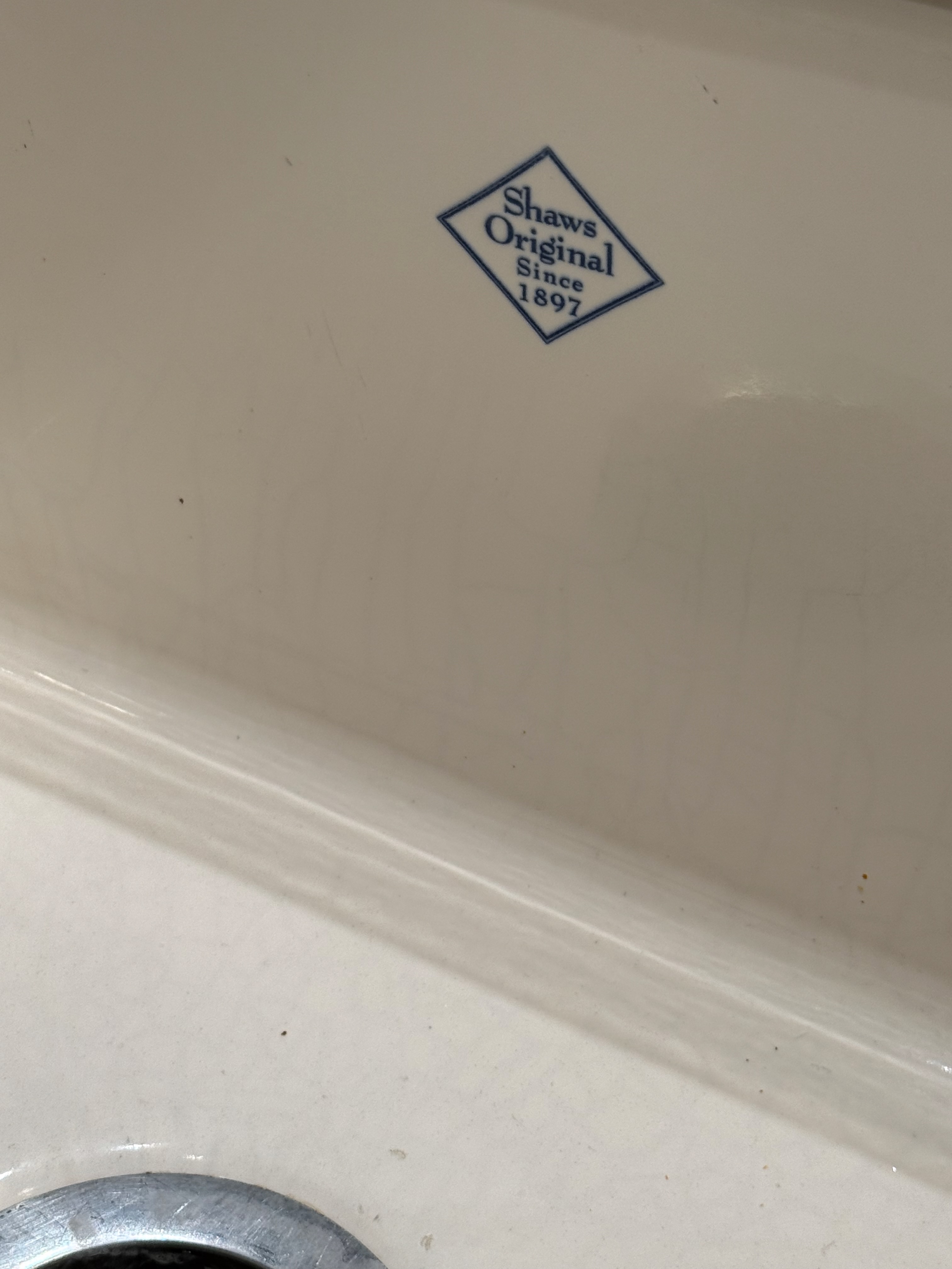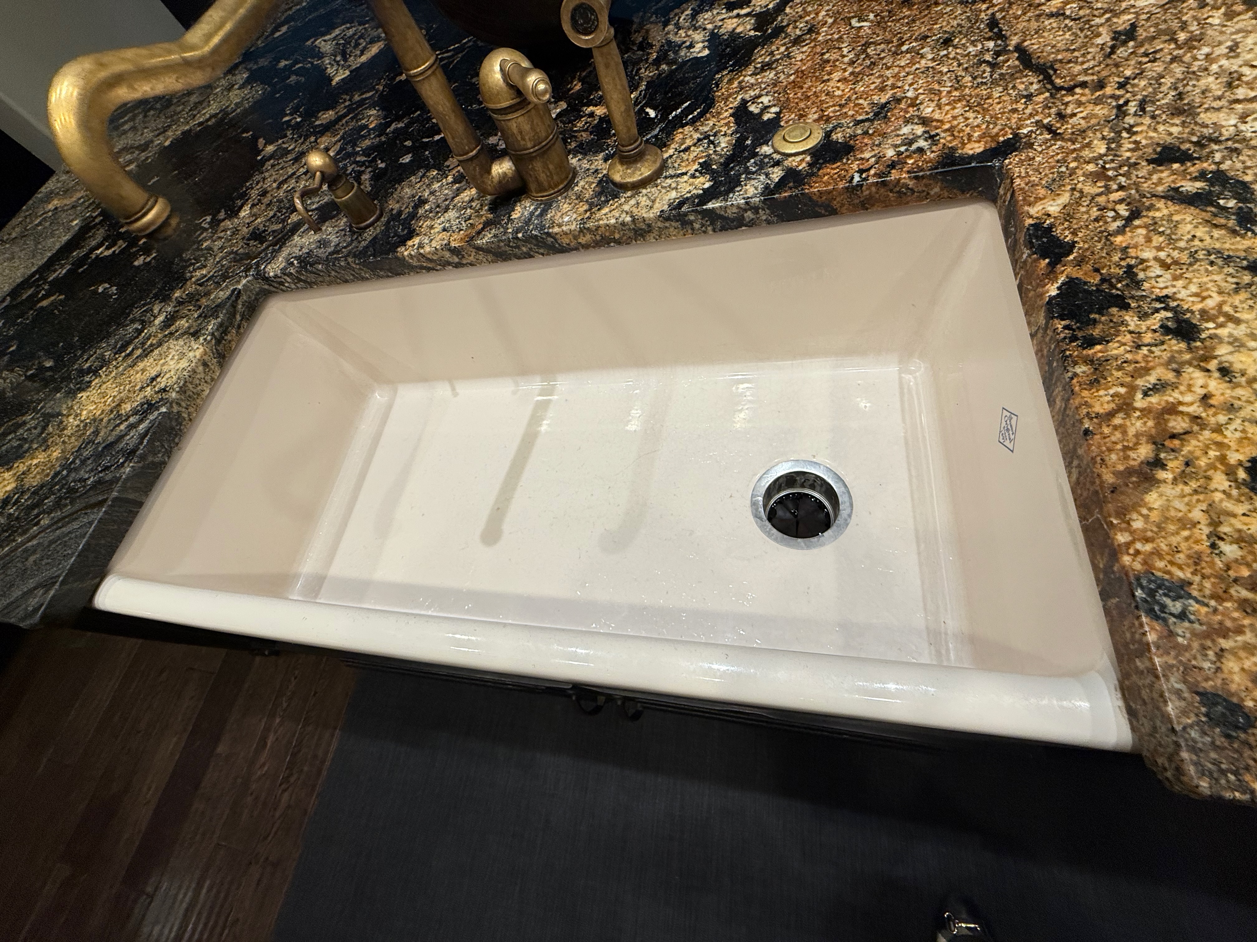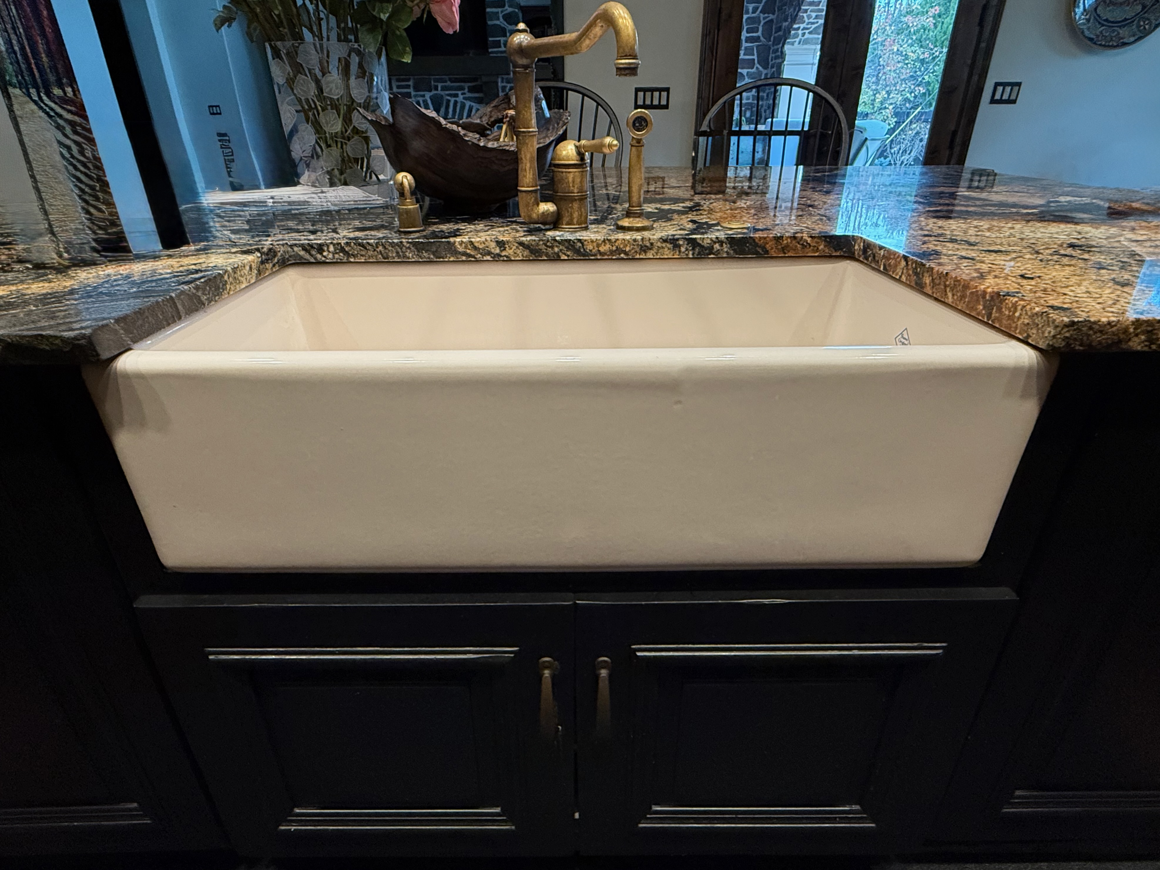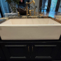 36”w Shaw apron/Farmhouse sink, listing price new $1,999 and Antique brass faucet set x 18”d x 9”h