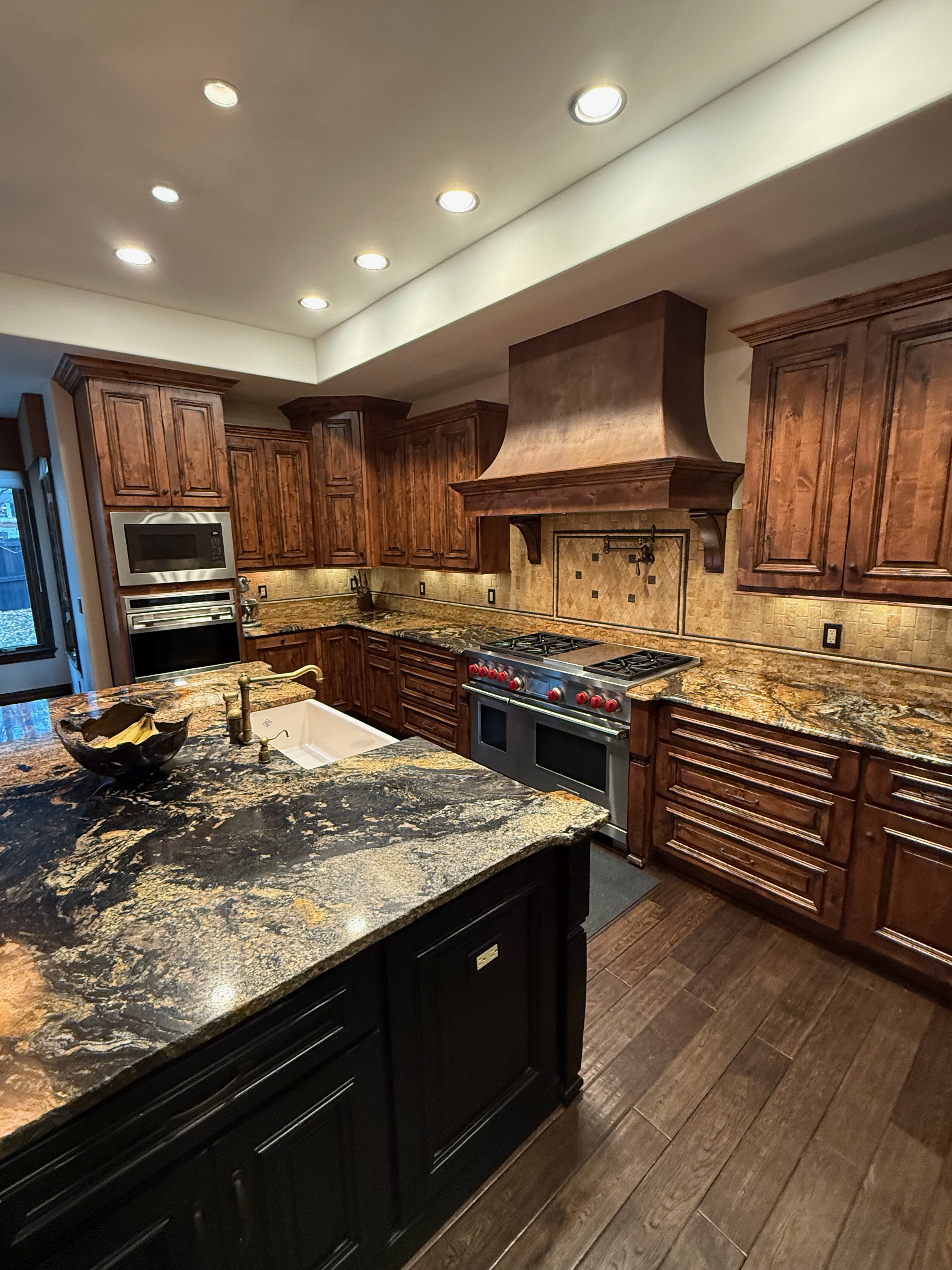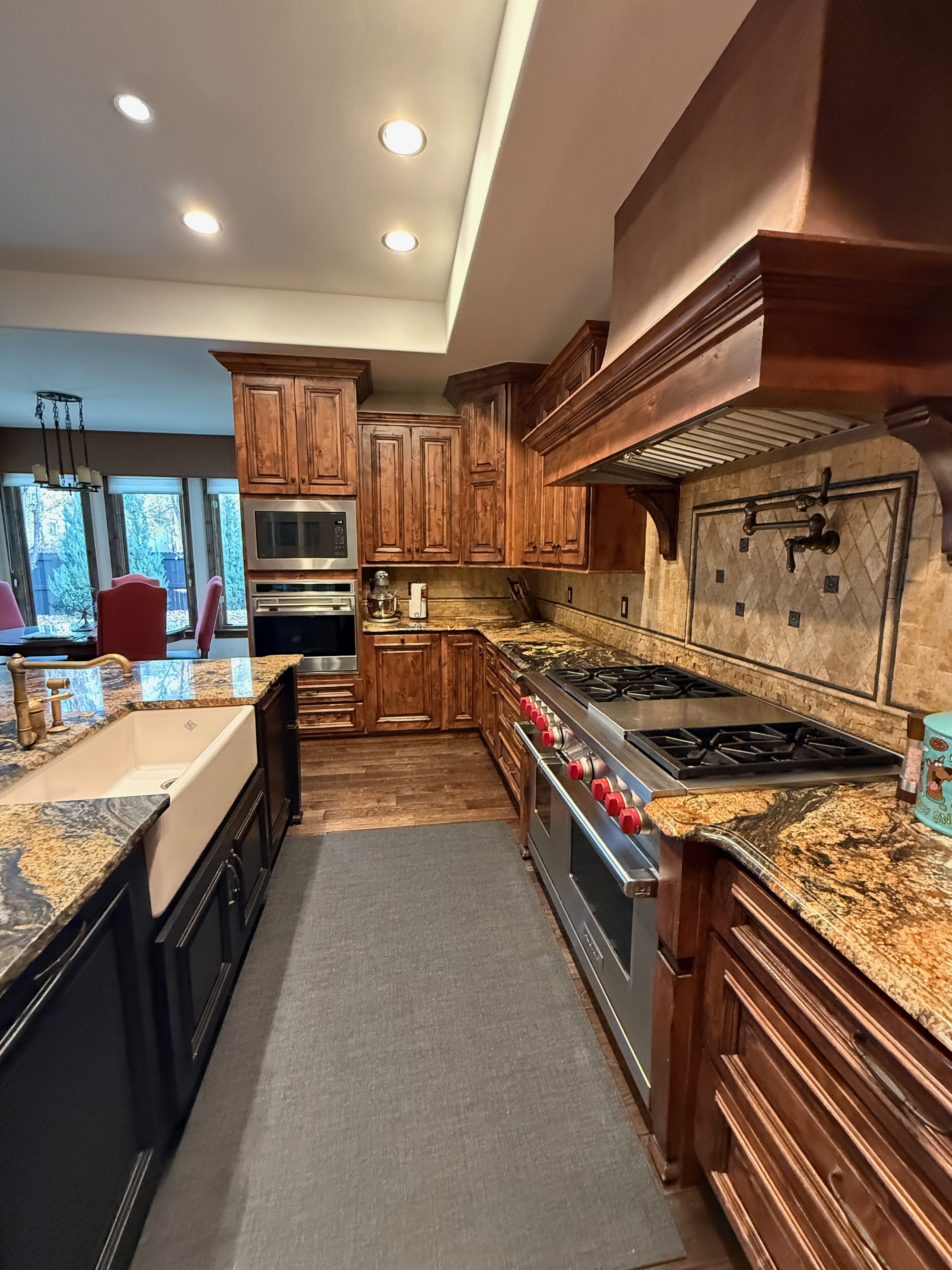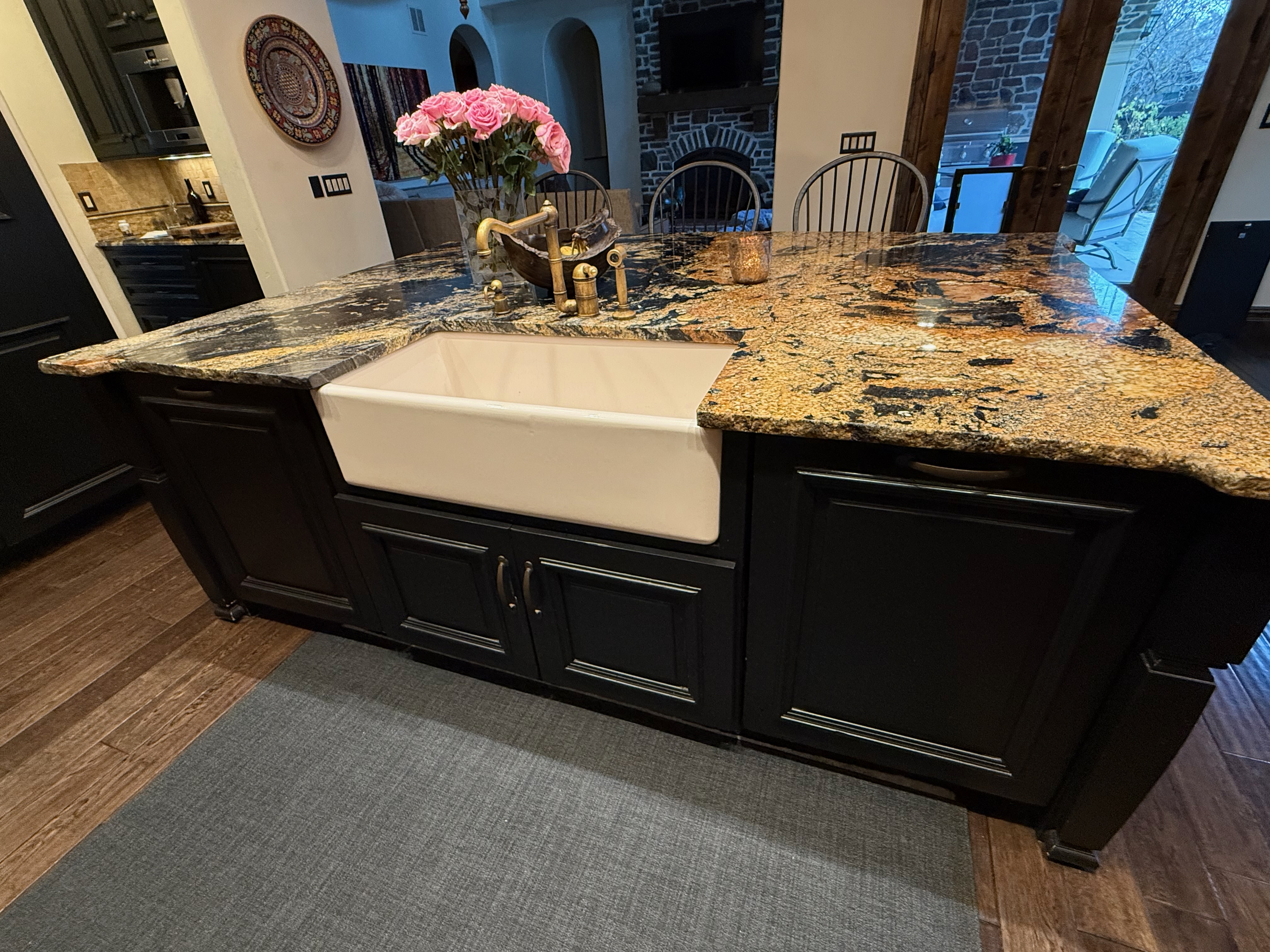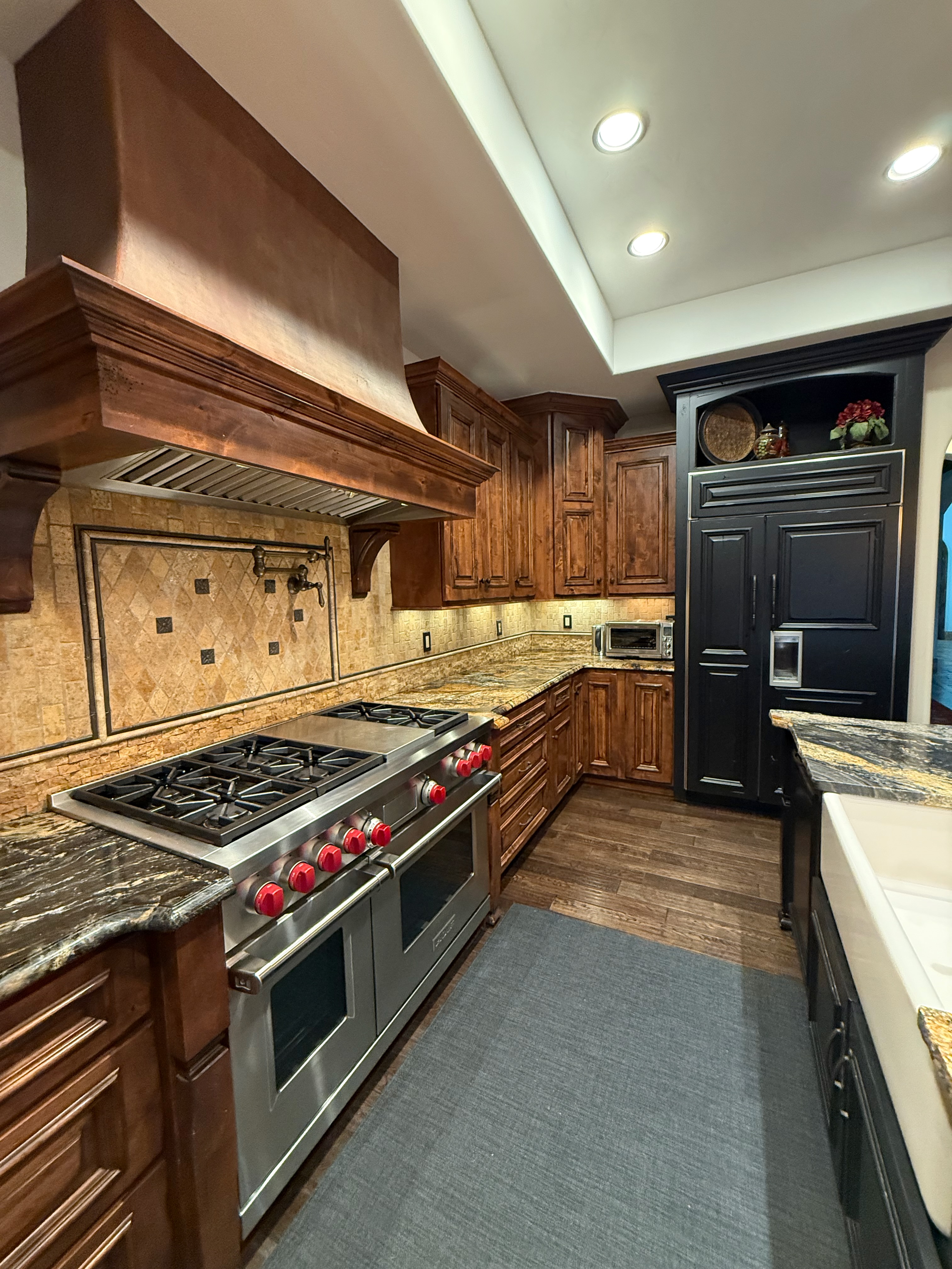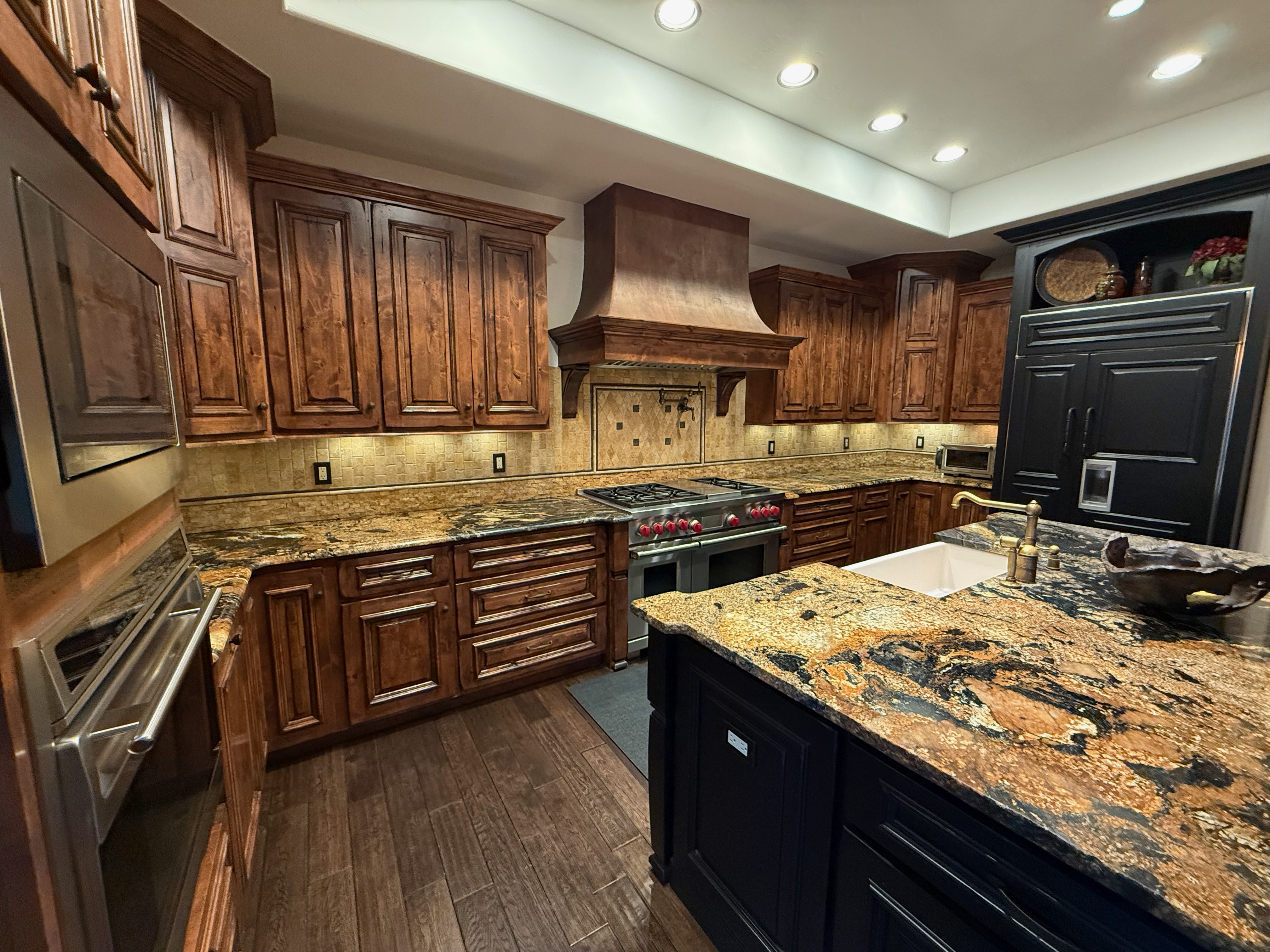 High-end Custom-made Knotty Alder Wood Kitchen Cabinetry with a contrasting black island. The cabinet drawers have the soft close feature with dove-tailed drawers. This Kitchen package comes with top-of-the-line Wolf range, oven and Sub-Zero Appliances. Stunning dramatic very durable Magma Gold granite countertops. The island has a “Shaw” apron/Farmhouse sink. This kitchen package will be ready to be removed Saturday January 17th 2026 by a qualified buyer or licensed contractors are available to hire. Price for the set below.