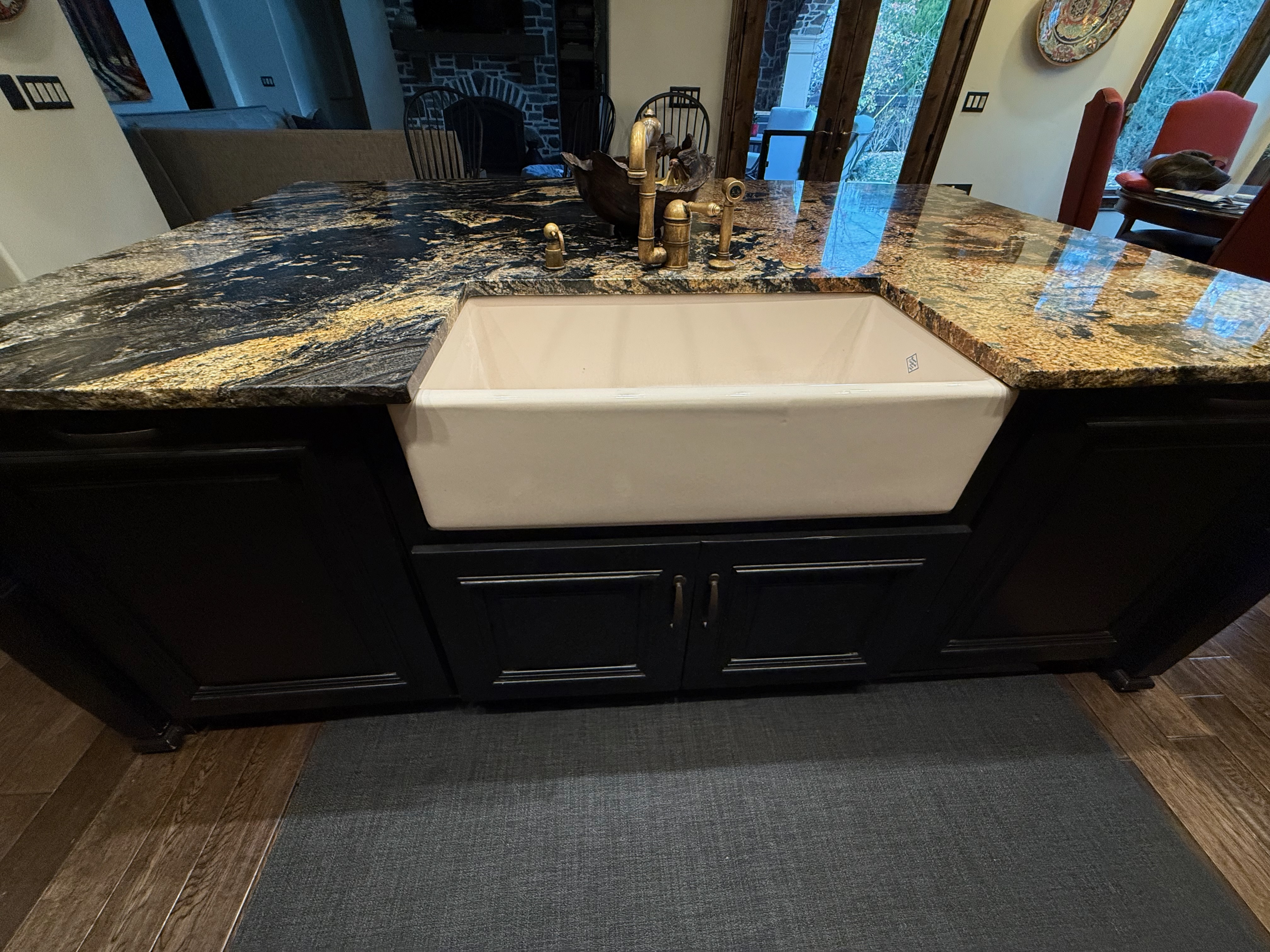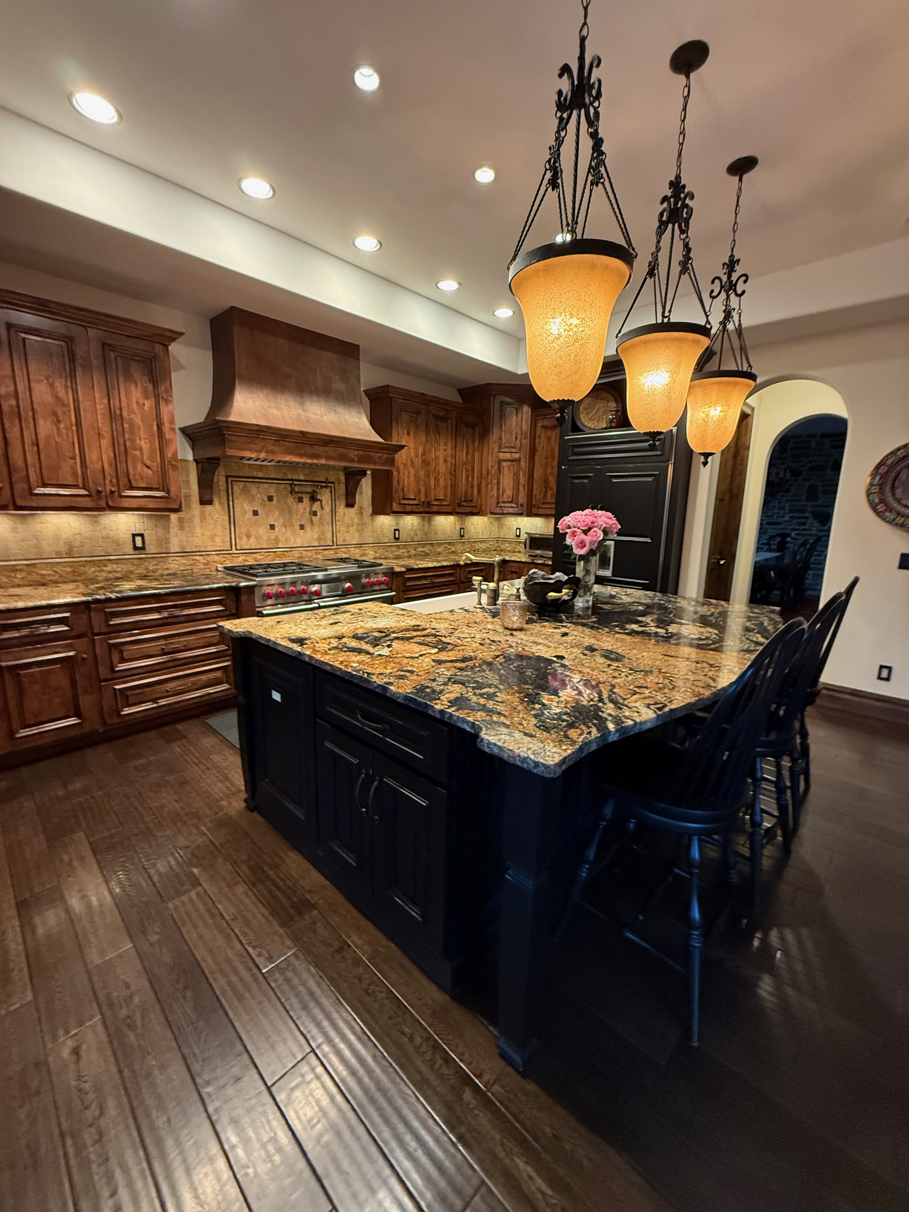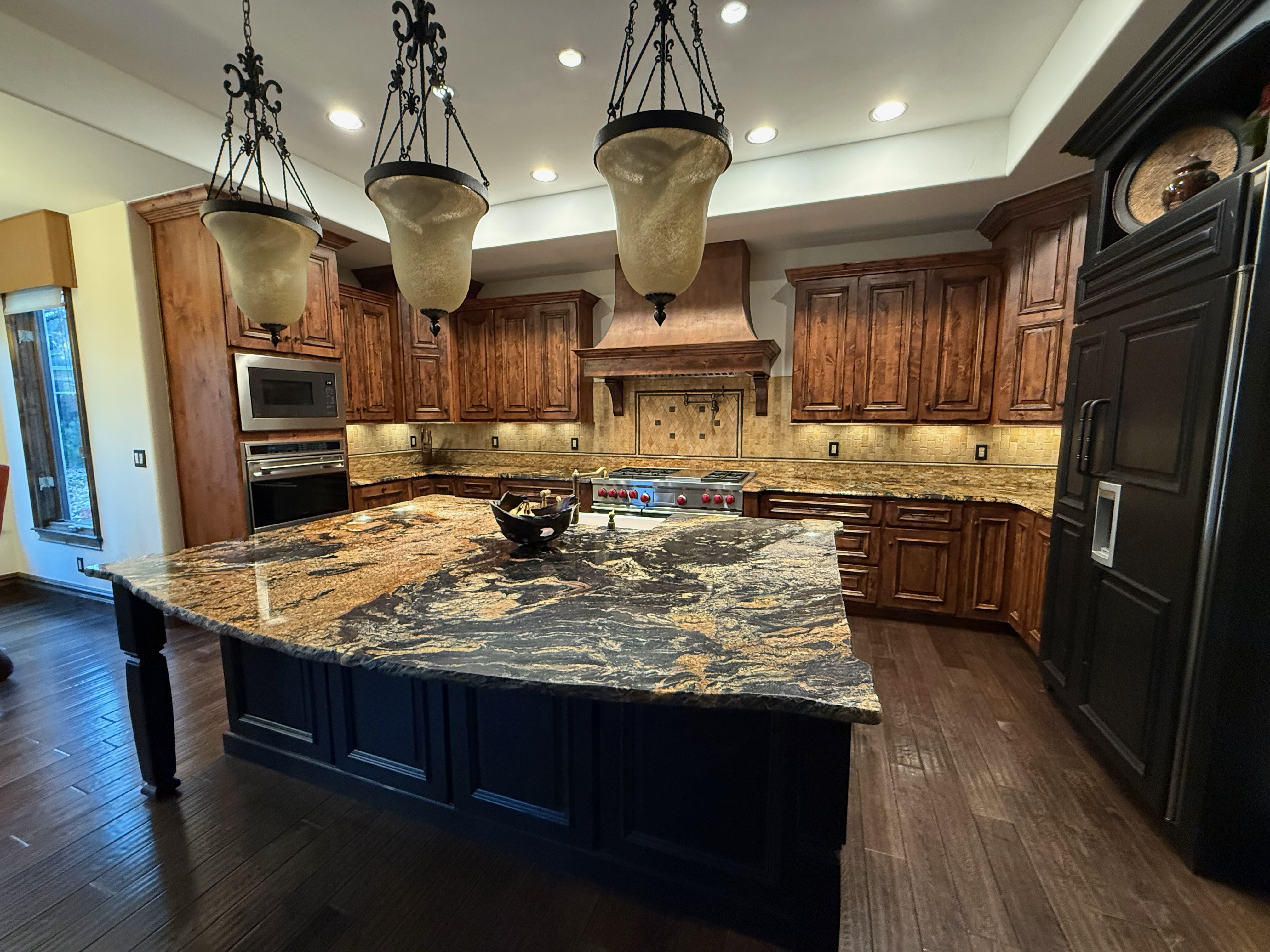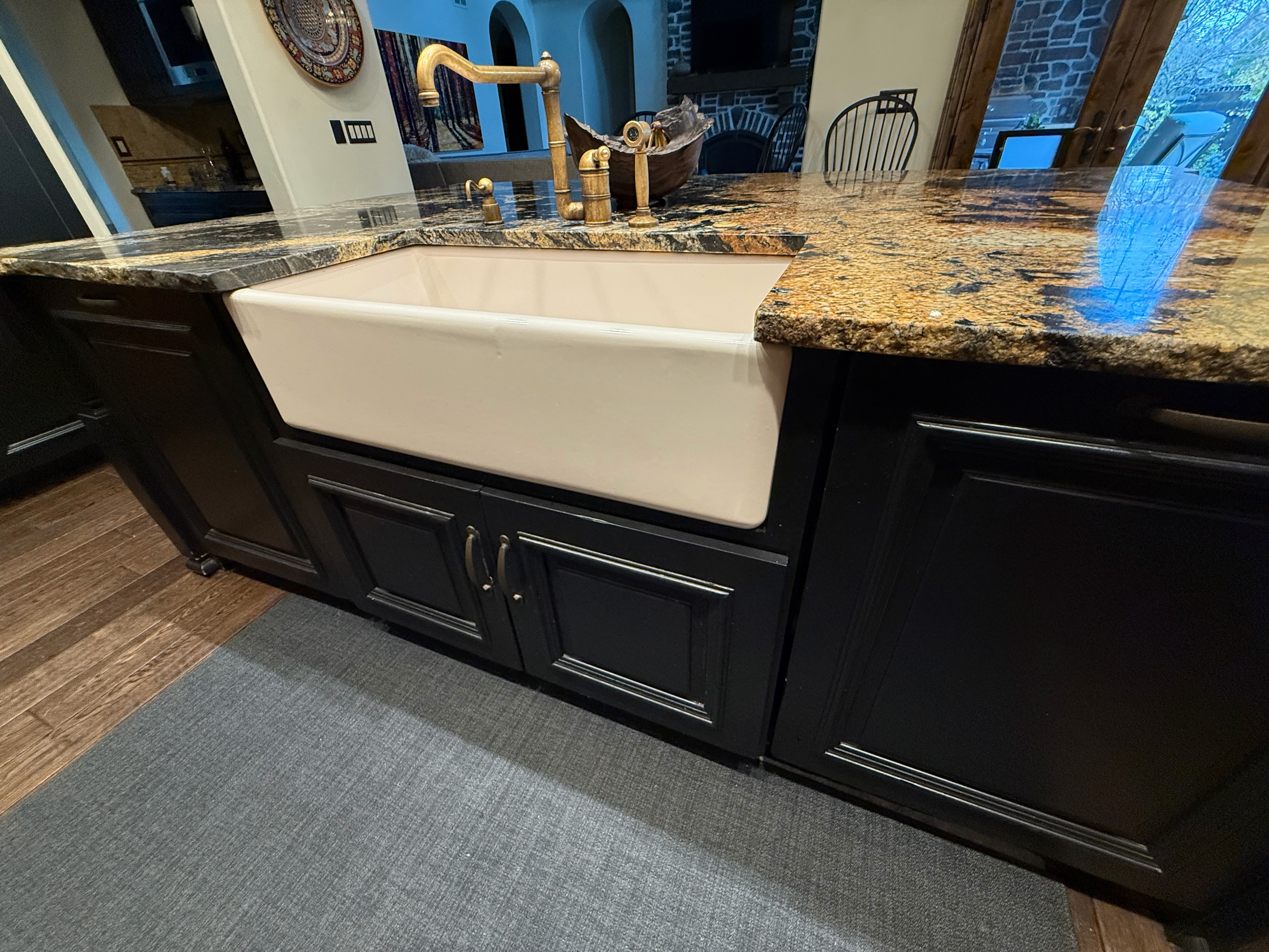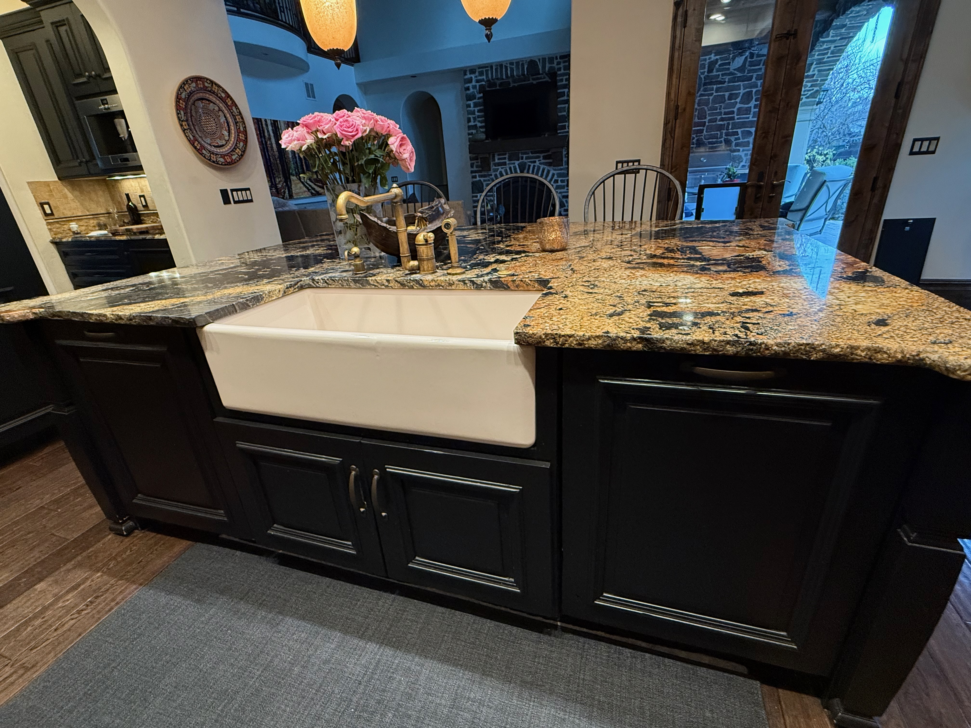 High-end Custom-made Knotty Alder Wood Kitchen Cabinetry with a contrasting black island. The cabinet drawers have the soft close feature with dove-tailed drawers. This Kitchen package comes with top-of-the-line Wolf range, oven and Sub-Zero Appliances. Stunning dramatic very durable Magma Gold granite countertops. The island has a “Shaw” apron/Farmhouse sink. This kitchen package will be ready to be removed Saturday January 17th 2026 by a qualified buyer or licensed contractors are available to hire. Price for the set below.