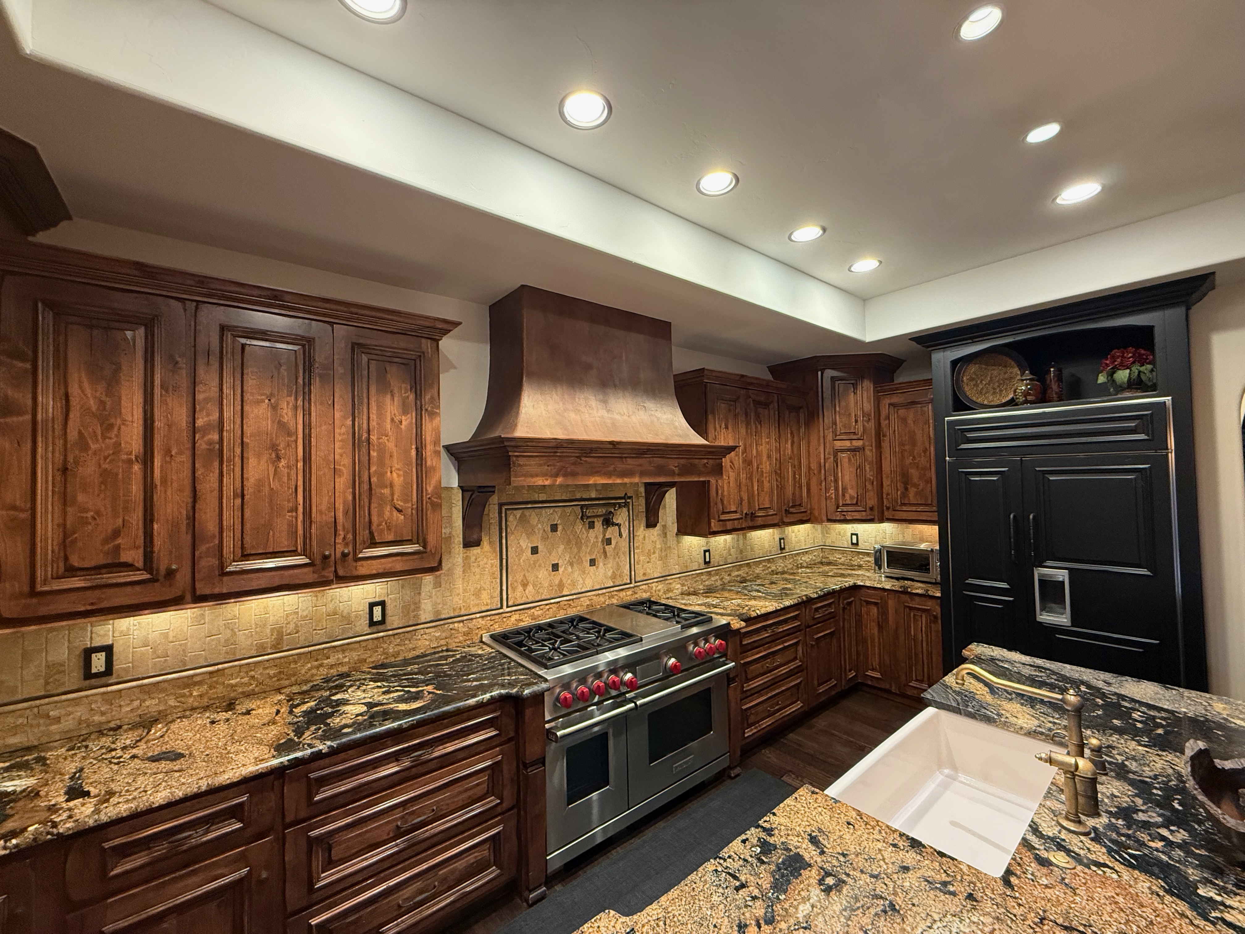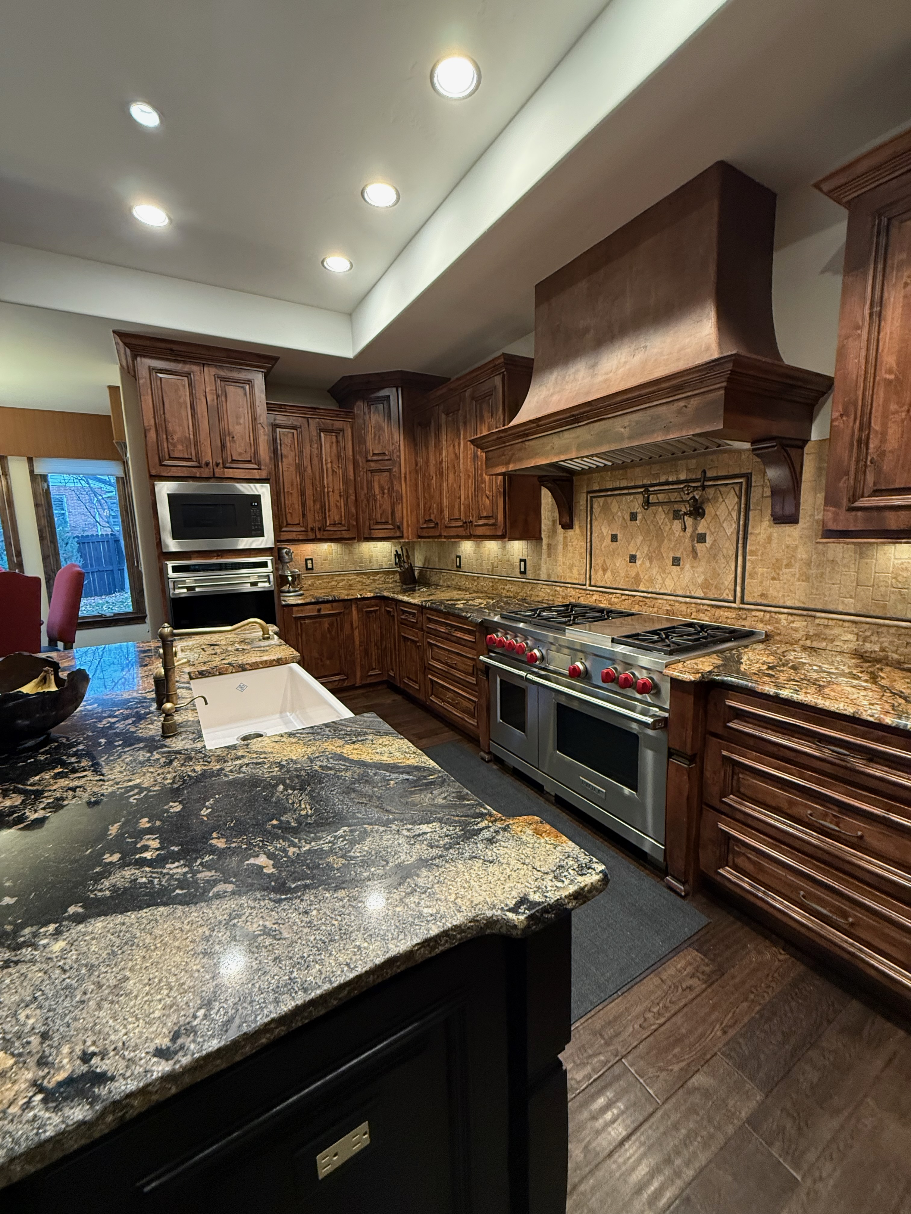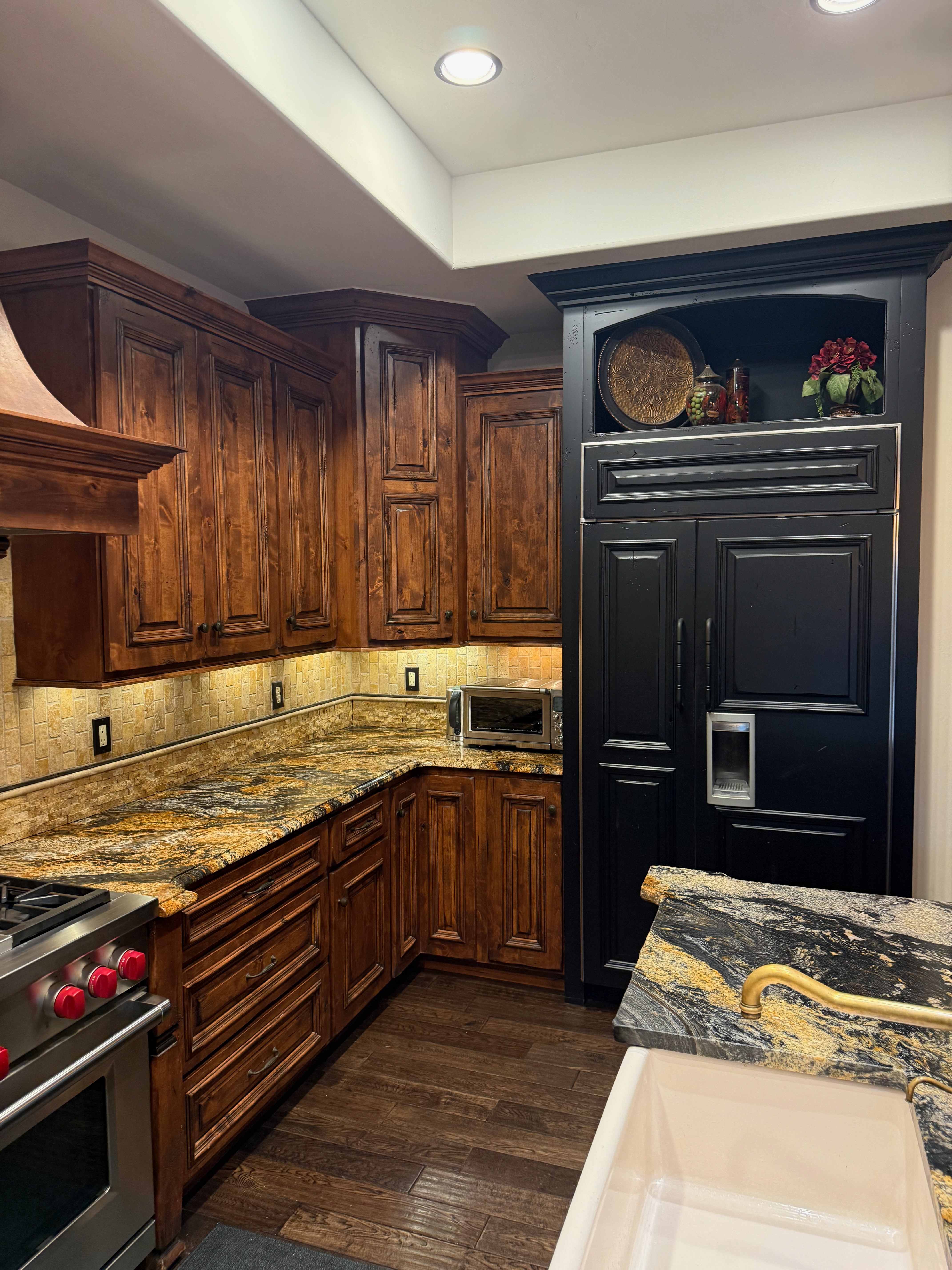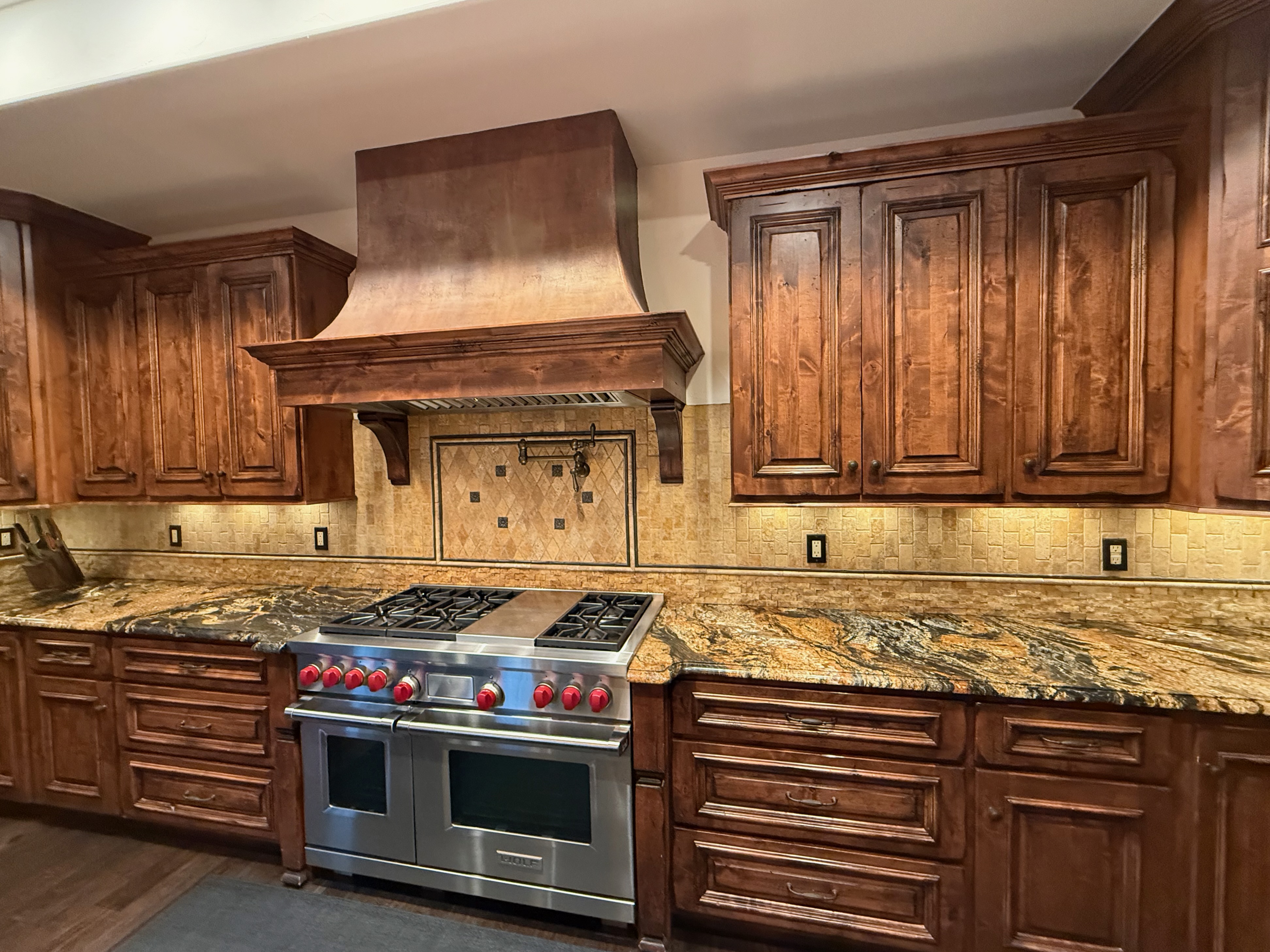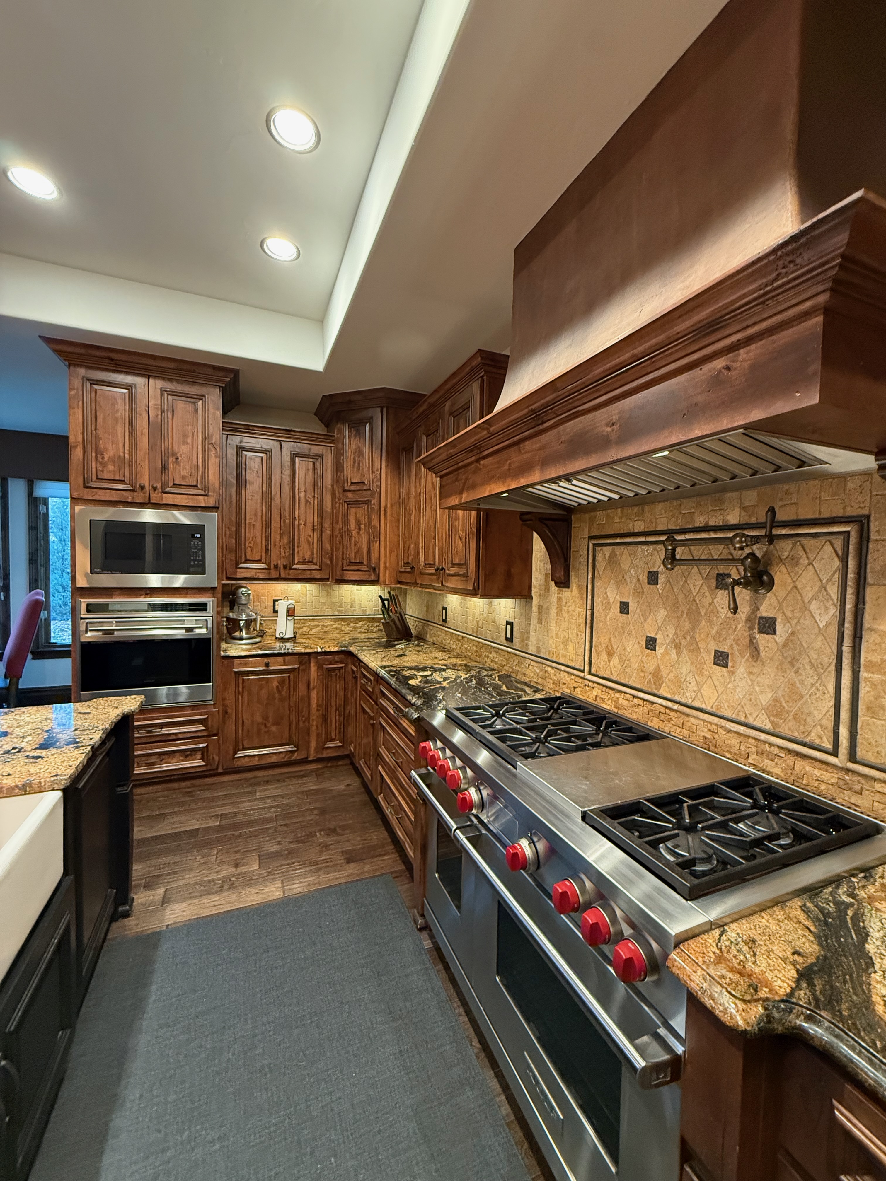 High-end Custom-made Knotty Alder Wood Kitchen Cabinetry with a contrasting black island. The cabinet drawers have the soft close feature with dove-tailed drawers. This Kitchen package comes with top-of-the-line Wolf range, oven and Sub-Zero Appliances. Stunning dramatic very durable Magma Gold granite countertops. The island has a “Shaw” apron/Farmhouse sink. This kitchen package will be ready to be removed Saturday January 17th 2026 by a qualified buyer or licensed contractors are available to hire. Price for the set below.