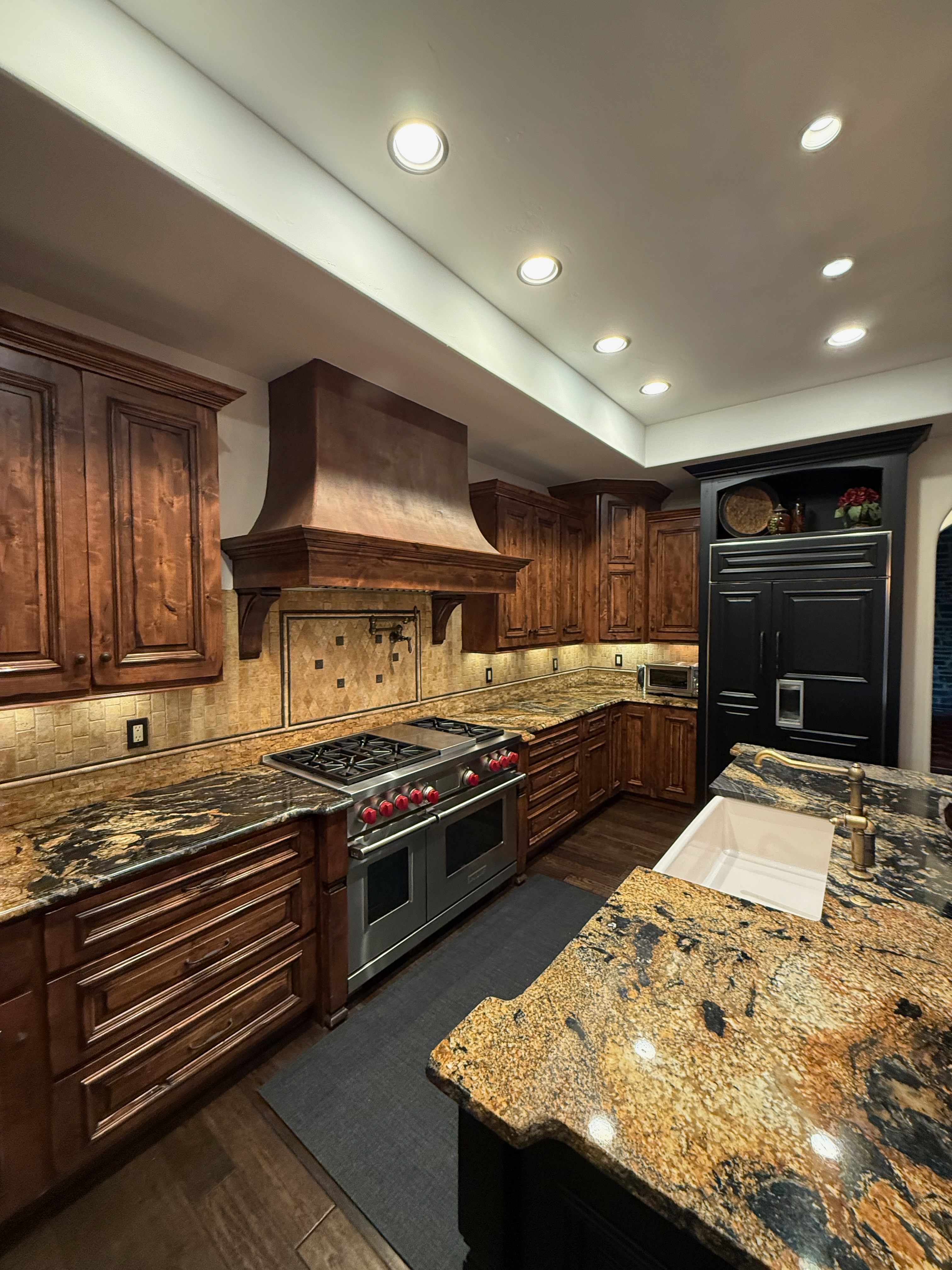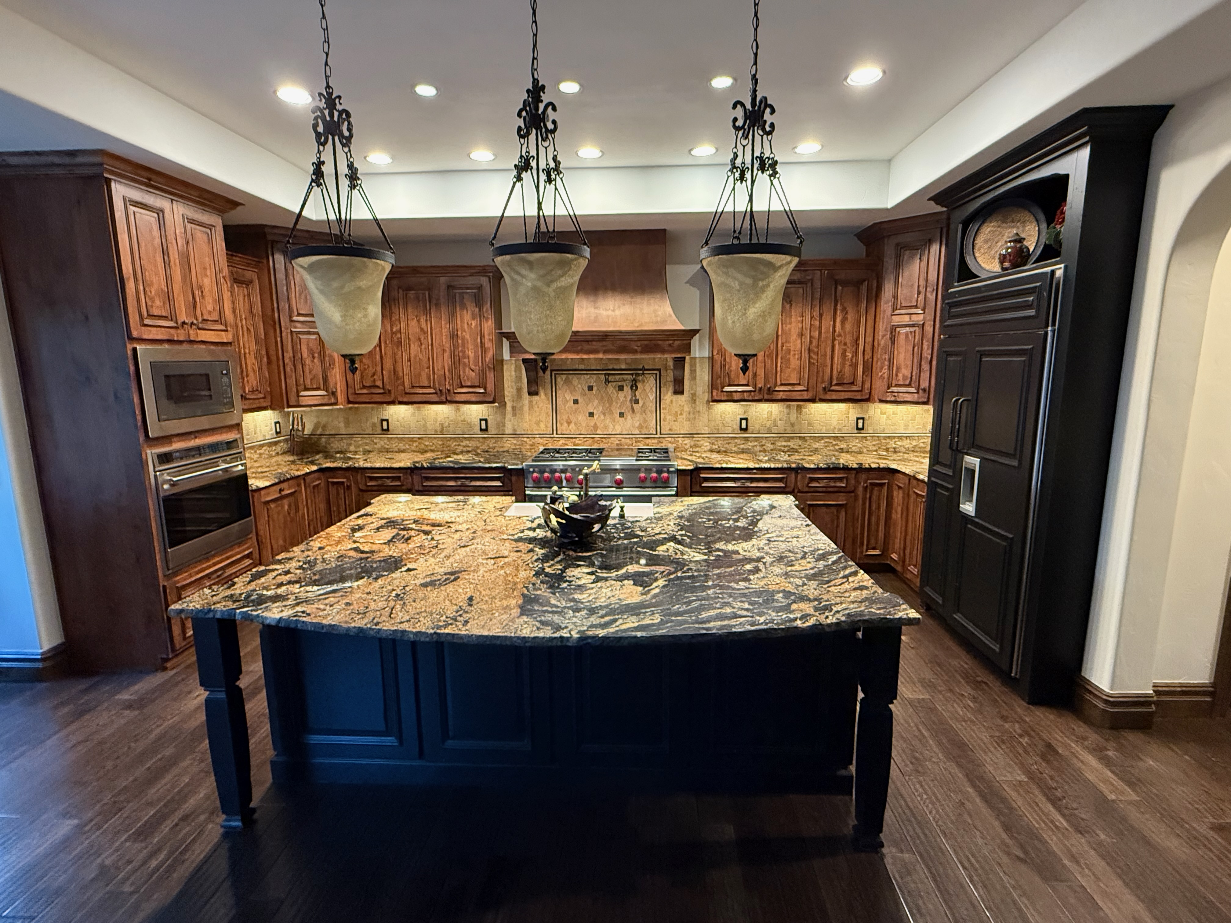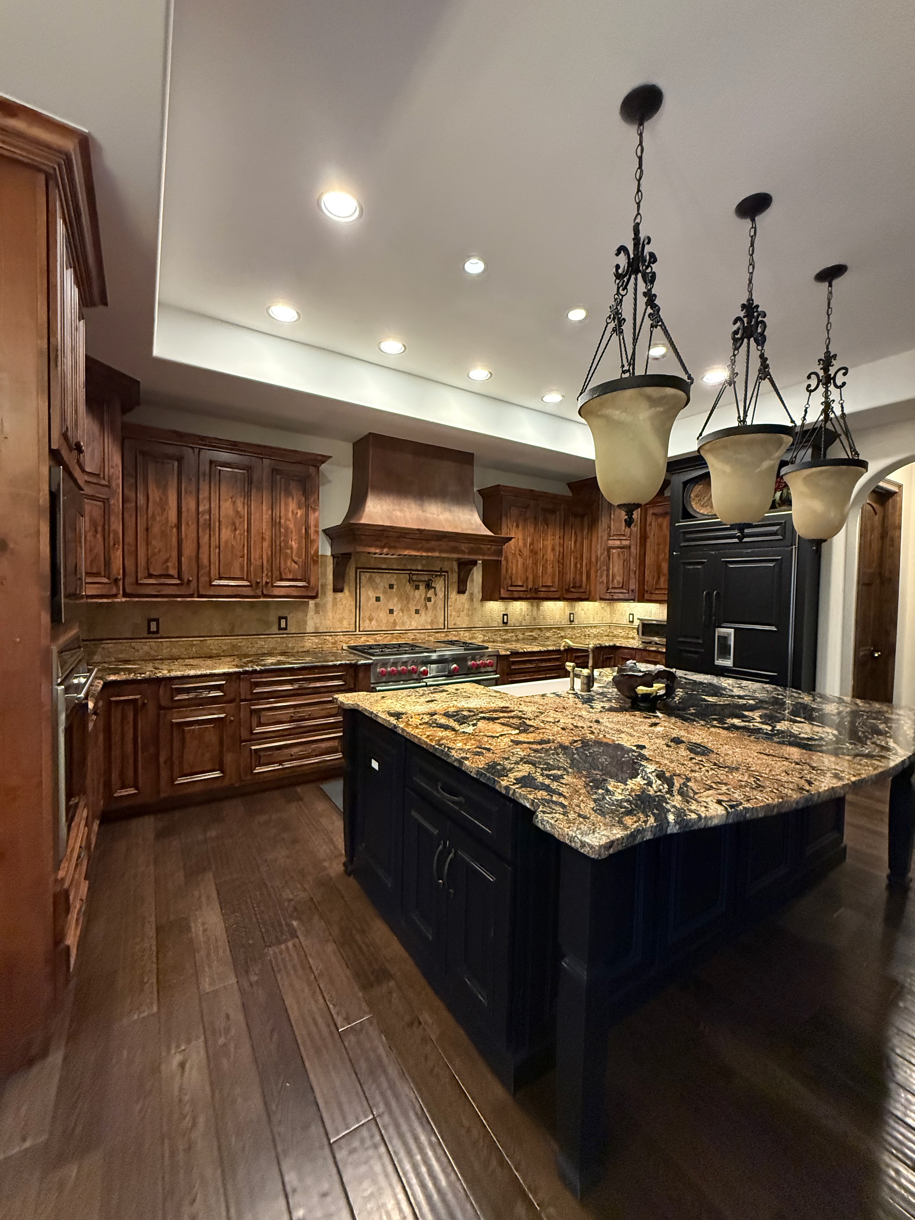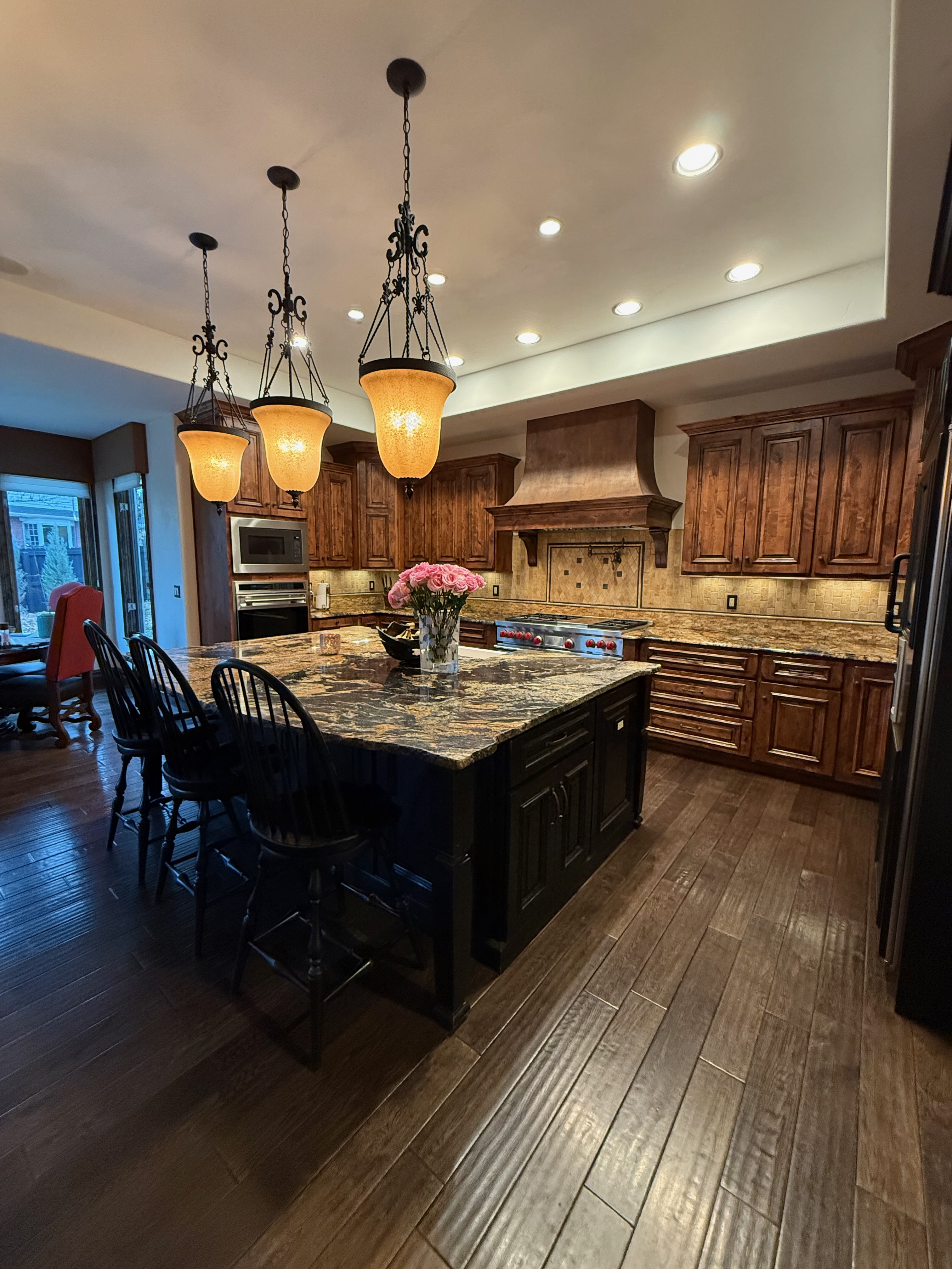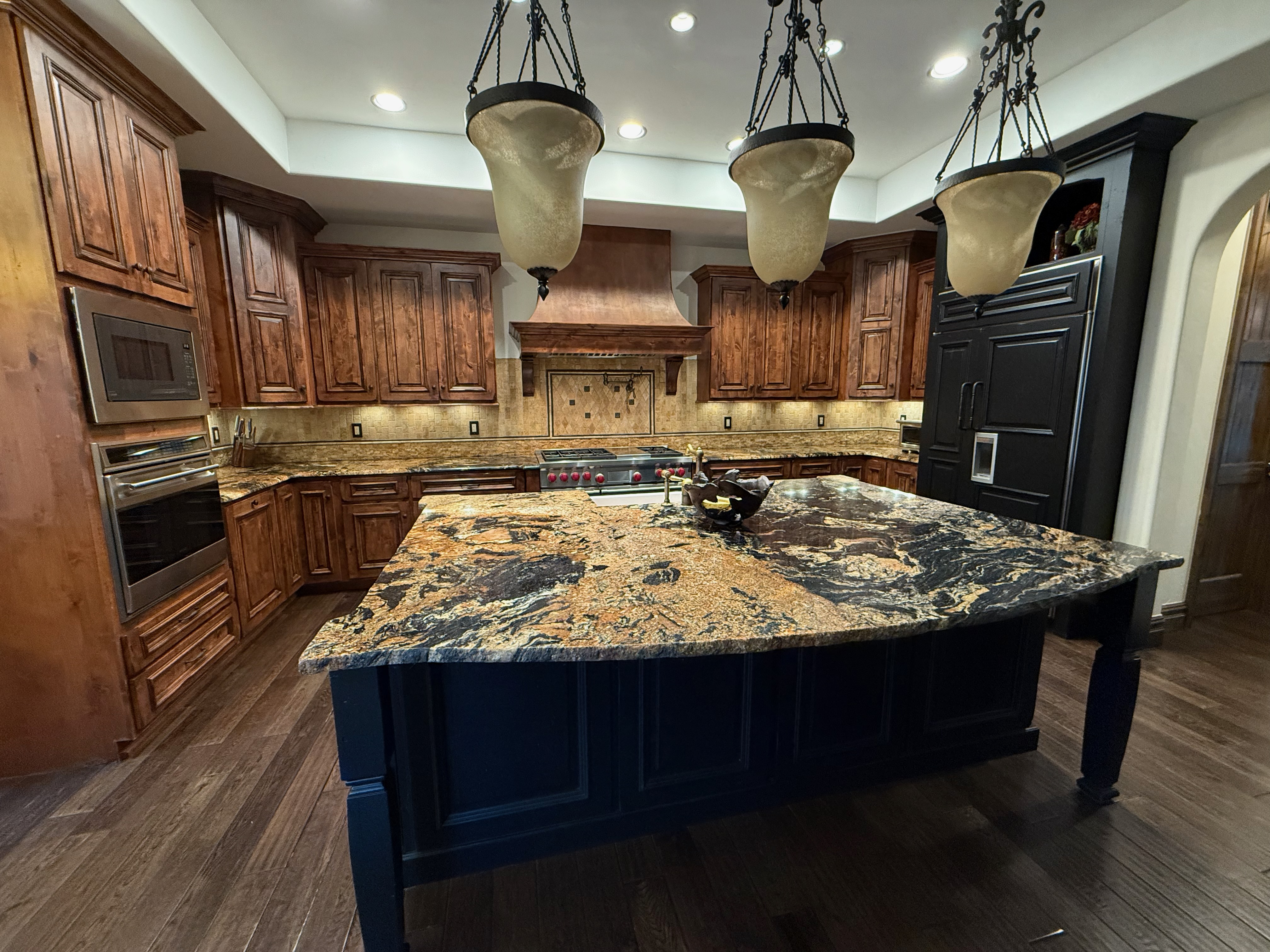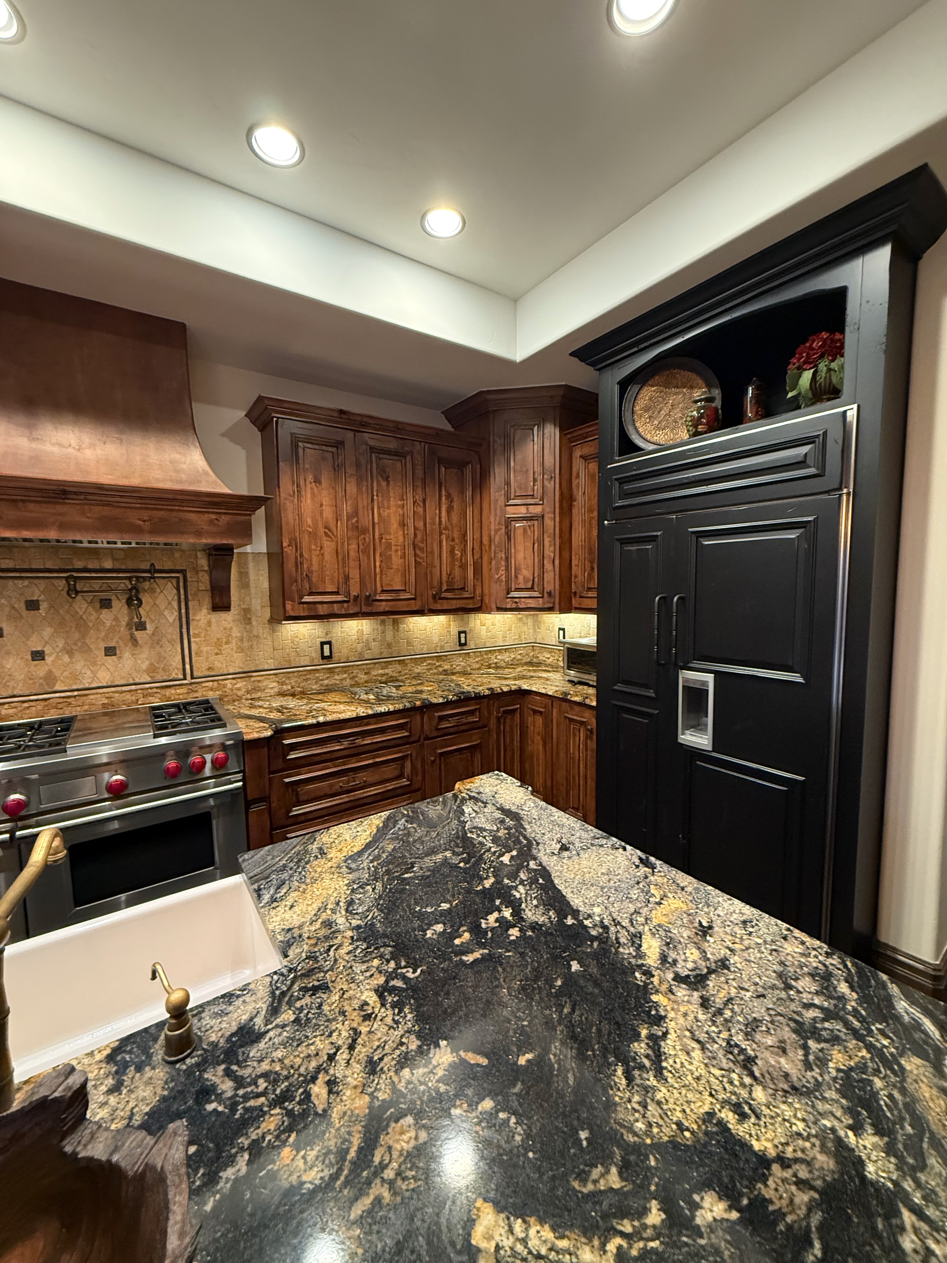 High-end Custom-made Knotty Alder Wood Kitchen Cabinetry with a contrasting black island. The cabinet drawers have the soft close feature with dove-tailed drawers. This Kitchen package comes with top-of-the-line Wolf range, oven and Sub-Zero Appliances. Stunning dramatic very durable Magma Gold granite countertops. The island has a “Shaw” apron/Farmhouse sink. This kitchen package will be ready to be removed Saturday January 17th 2026 by a qualified buyer or licensed contractors are available to hire. Price for the set below.