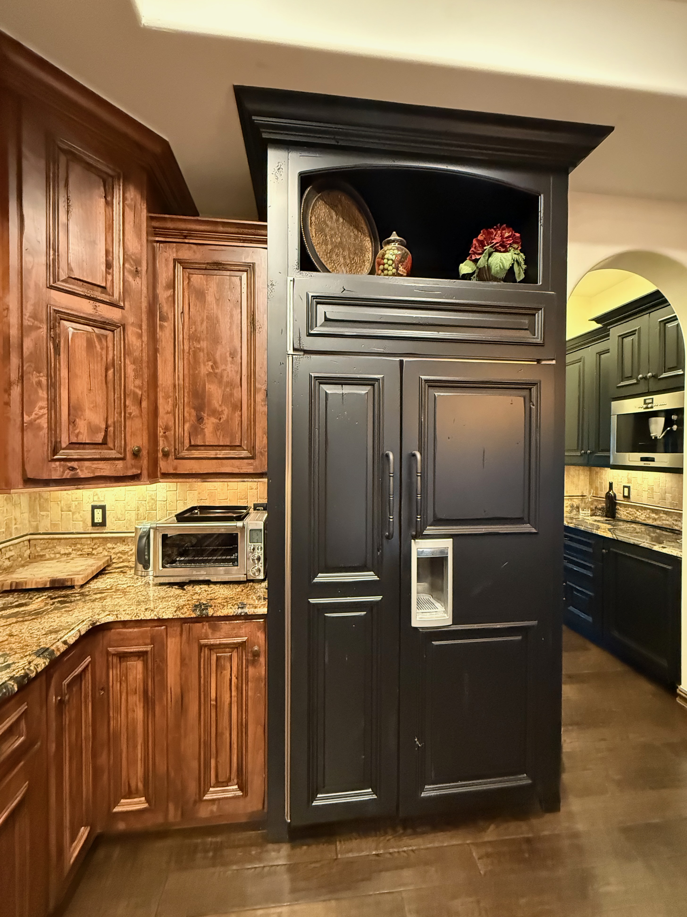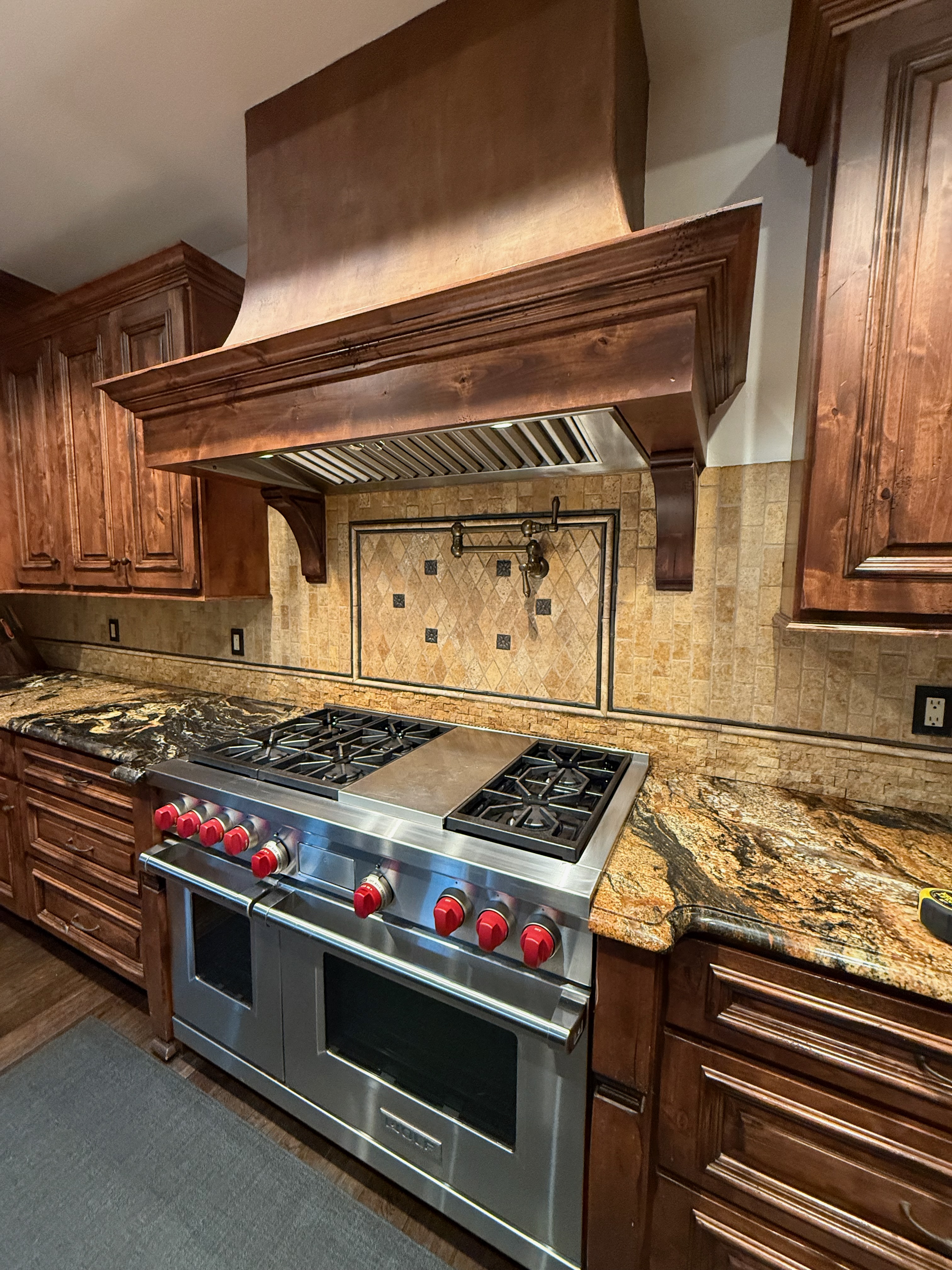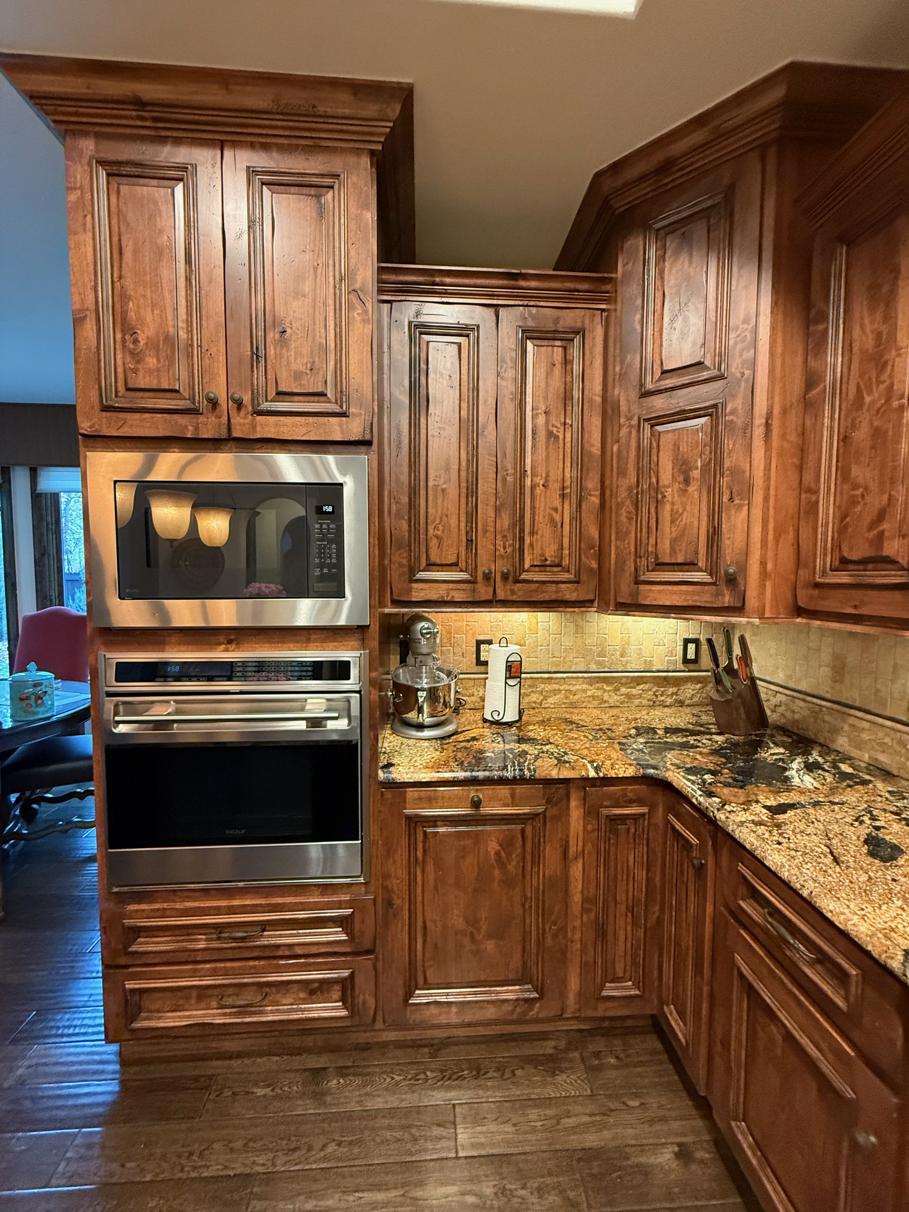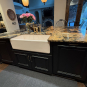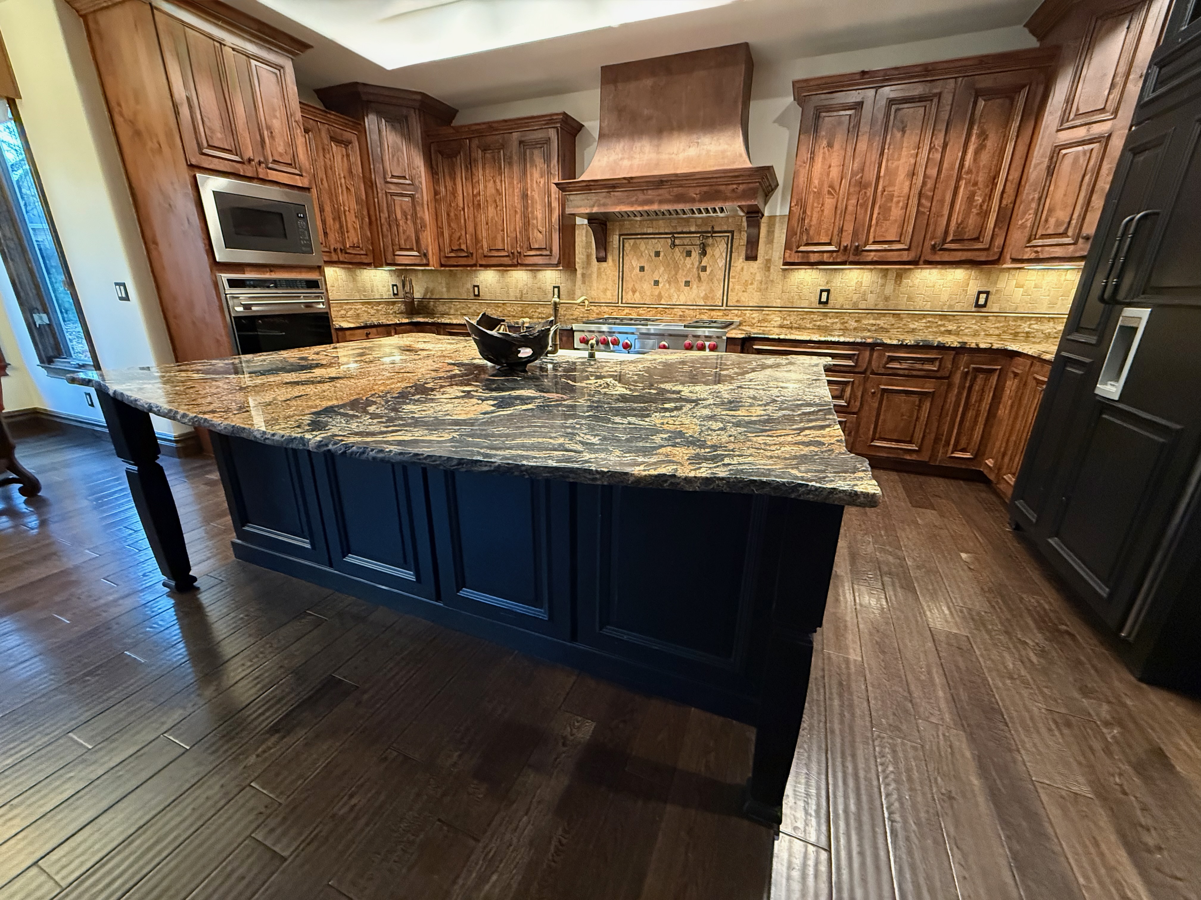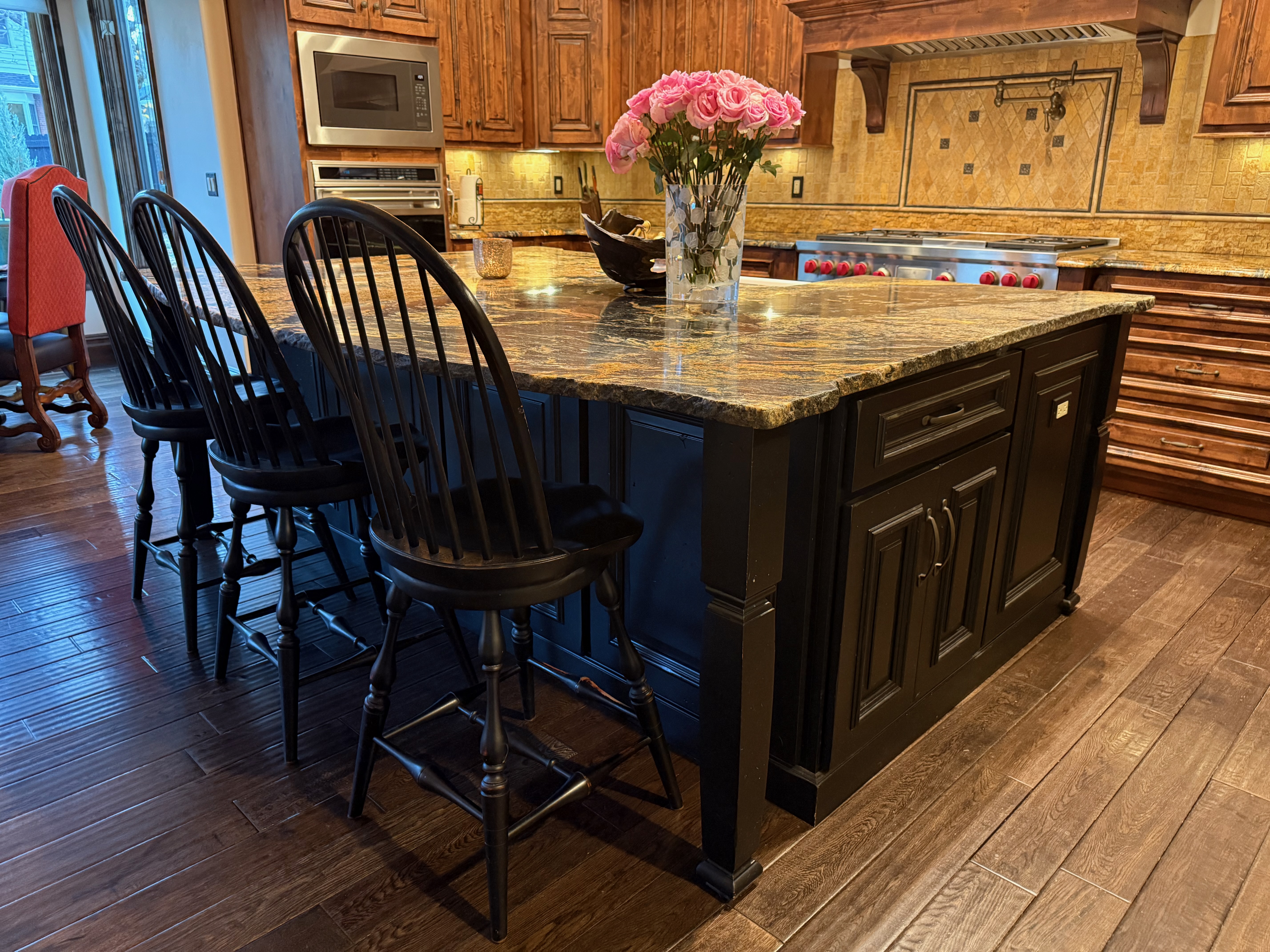 High-end Custom-made Knotty Alder Wood Kitchen Cabinetry with a contrasting black island. The cabinet drawers have the soft close feature with dove-tailed drawers. This Kitchen package comes with top-of-the-line Wolf range, oven and Sub-Zero Appliances. Stunning dramatic very durable Magma Gold granite countertops. The island has a “Shaw” apron/Farmhouse sink. This kitchen package will be ready to be removed Saturday January 17th 2026 by a qualified buyer or licensed contractors are available to hire. Price for the set below.