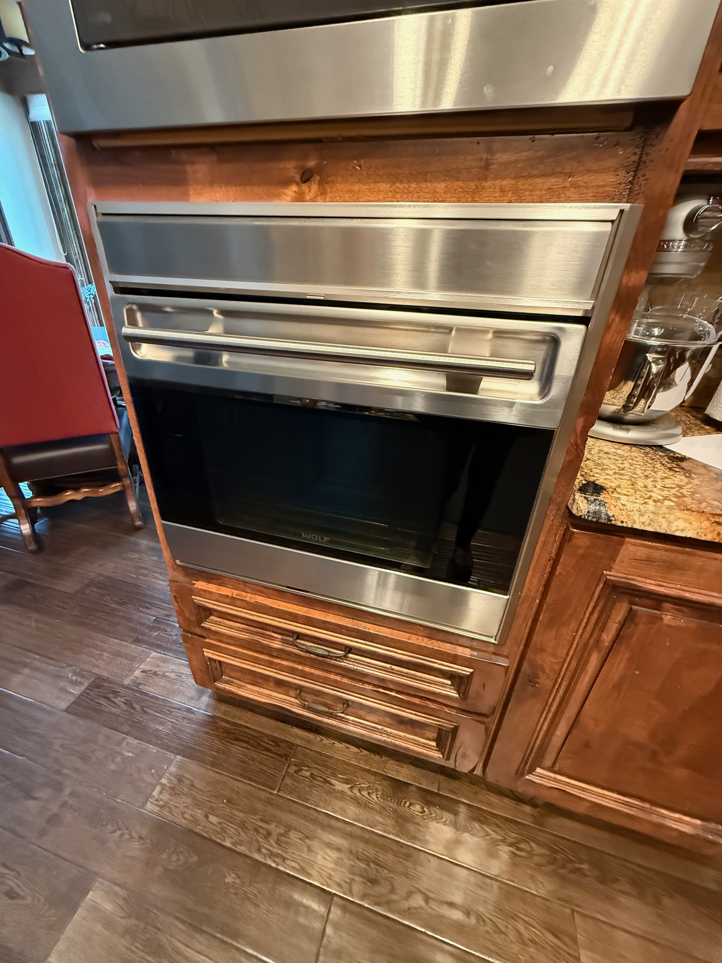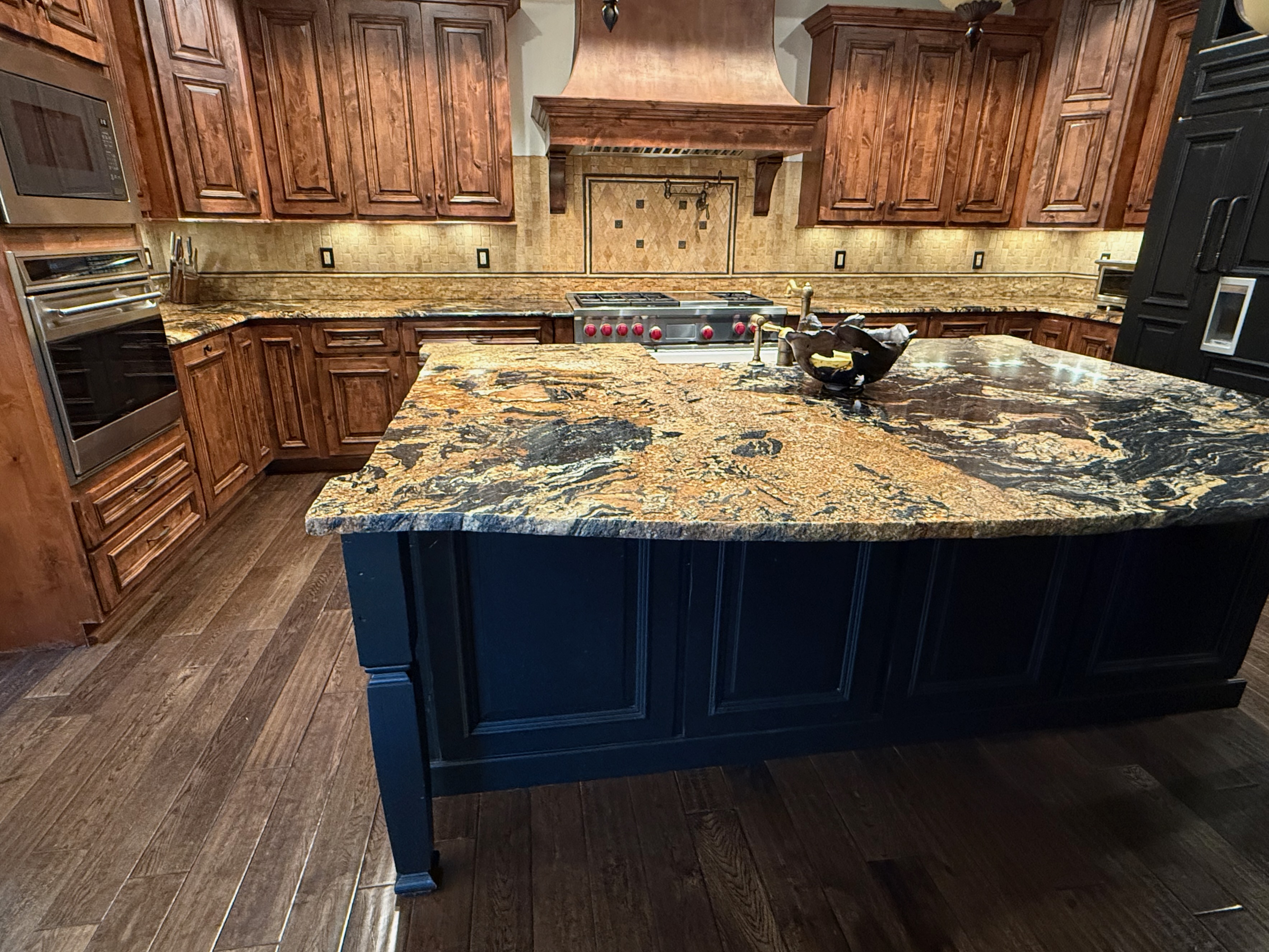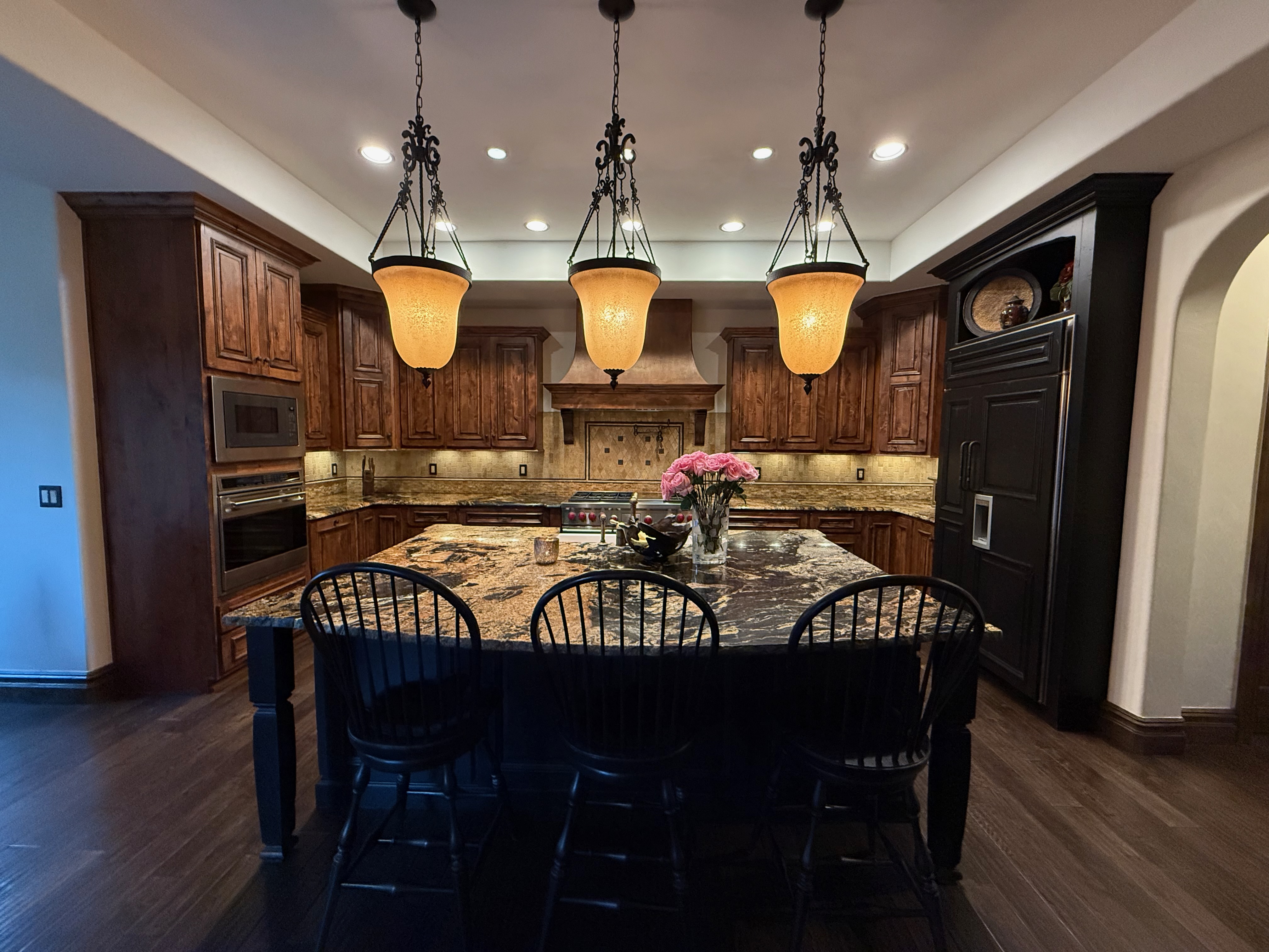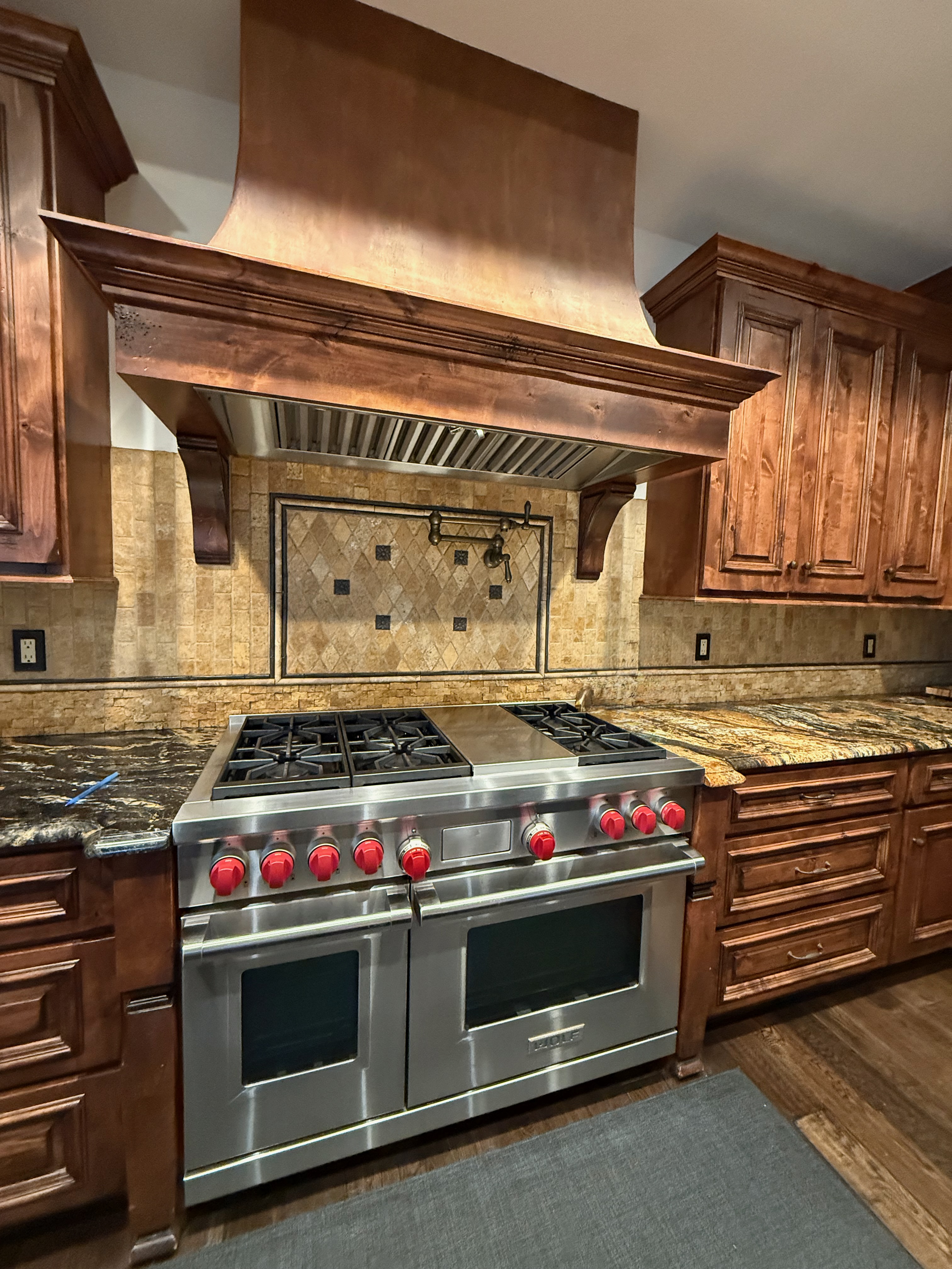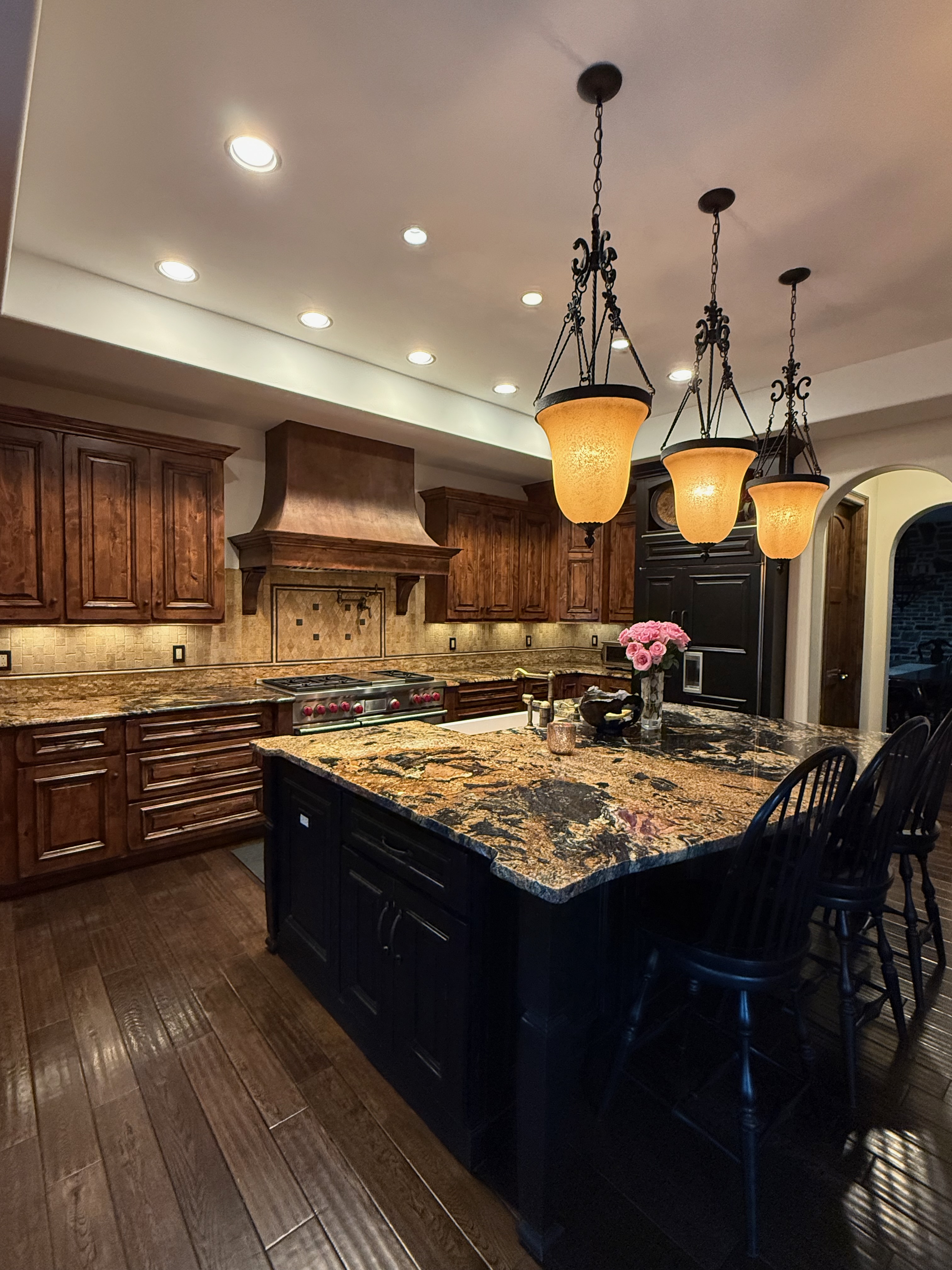 High-end Custom-made Knotty Alder Wood Kitchen Cabinetry with a contrasting black island. The cabinet drawers have the soft close feature with dove-tailed drawers. This Kitchen package comes with top-of-the-line Wolf range, oven and Sub-Zero Appliances. Stunning dramatic very durable Magma Gold granite countertops. The island has a “Shaw” apron/Farmhouse sink. This kitchen package will be ready to be removed Saturday January 17th 2026 by a qualified buyer or licensed contractors are available to hire. Price for the set below.