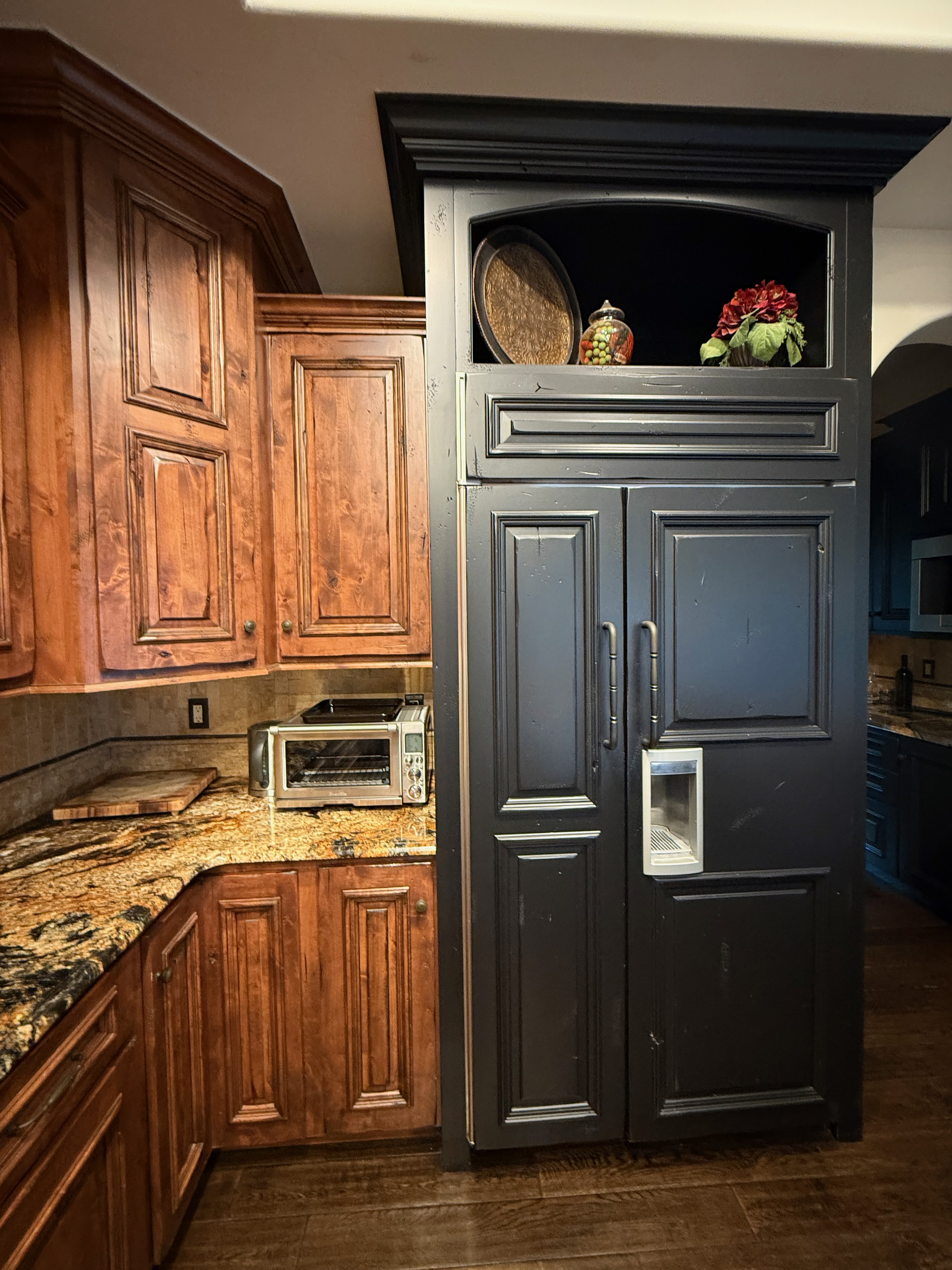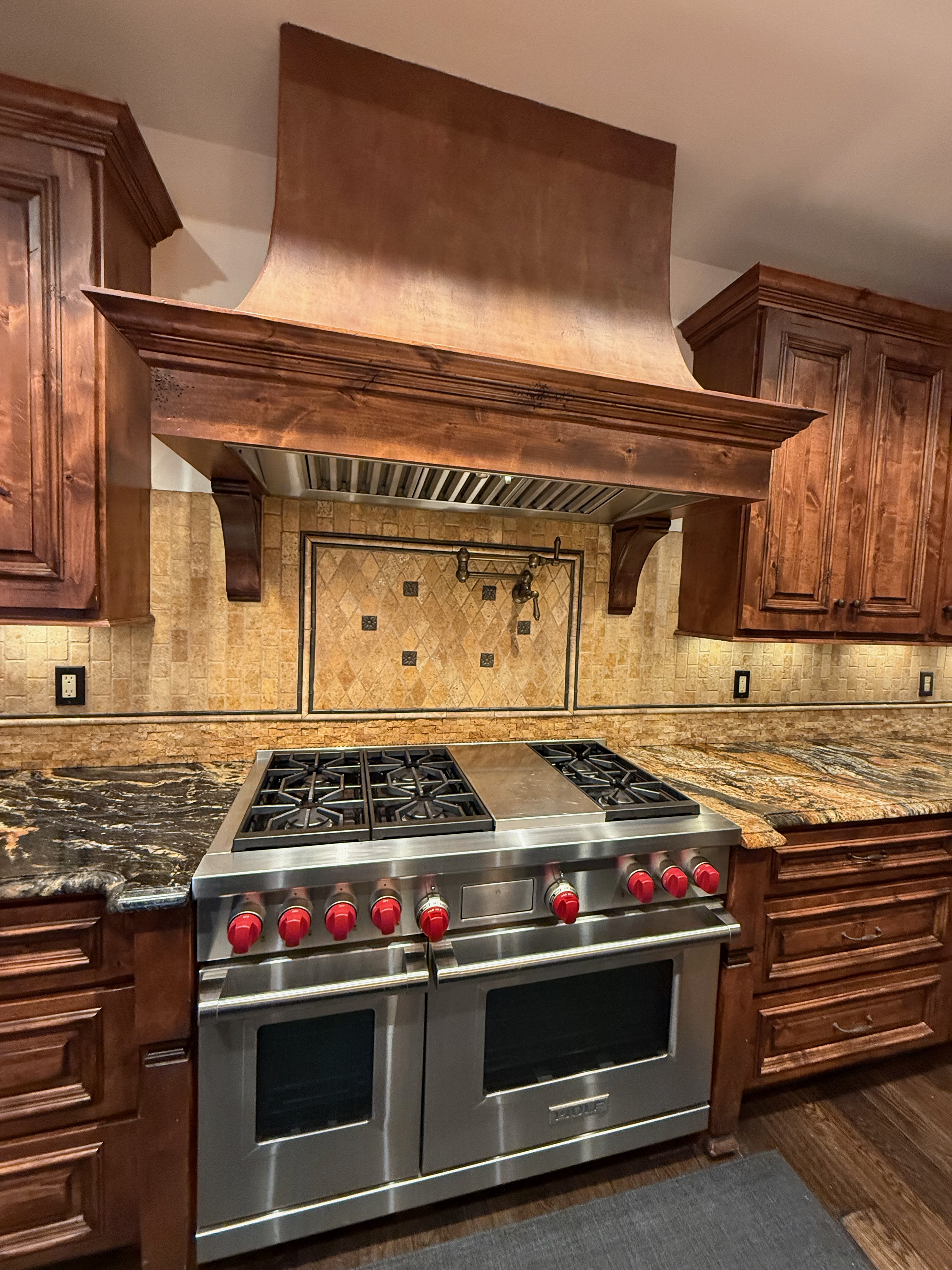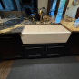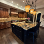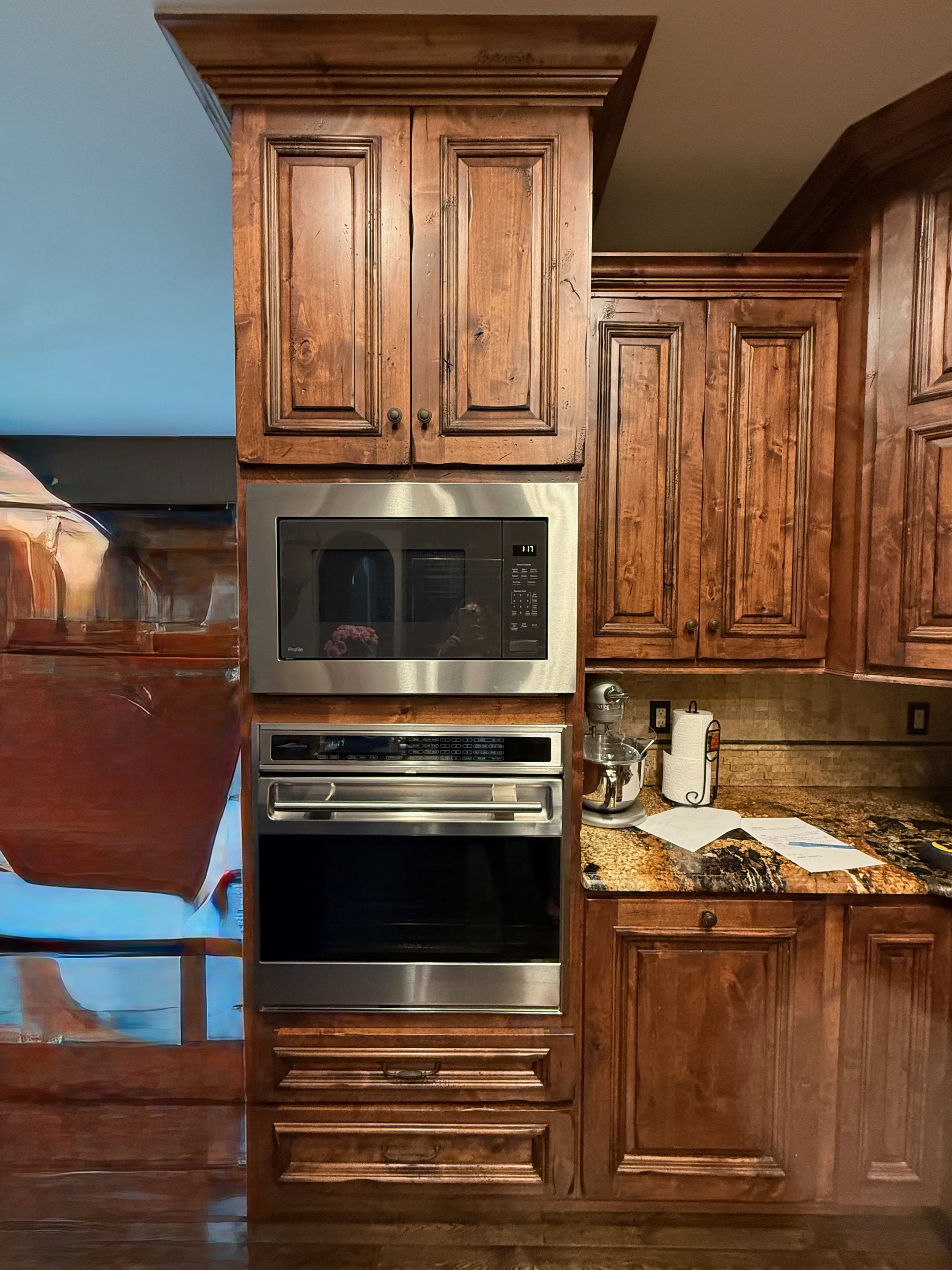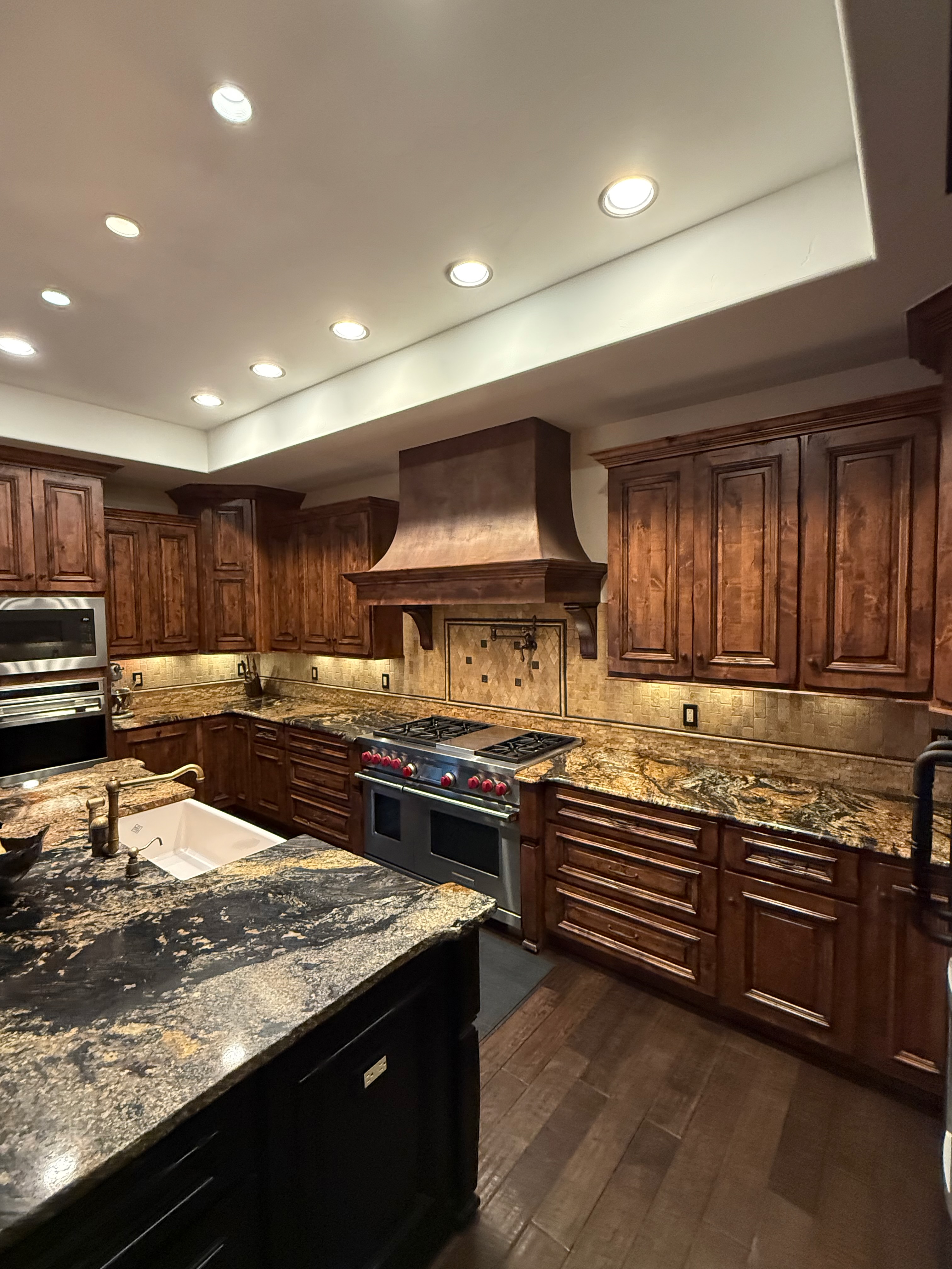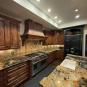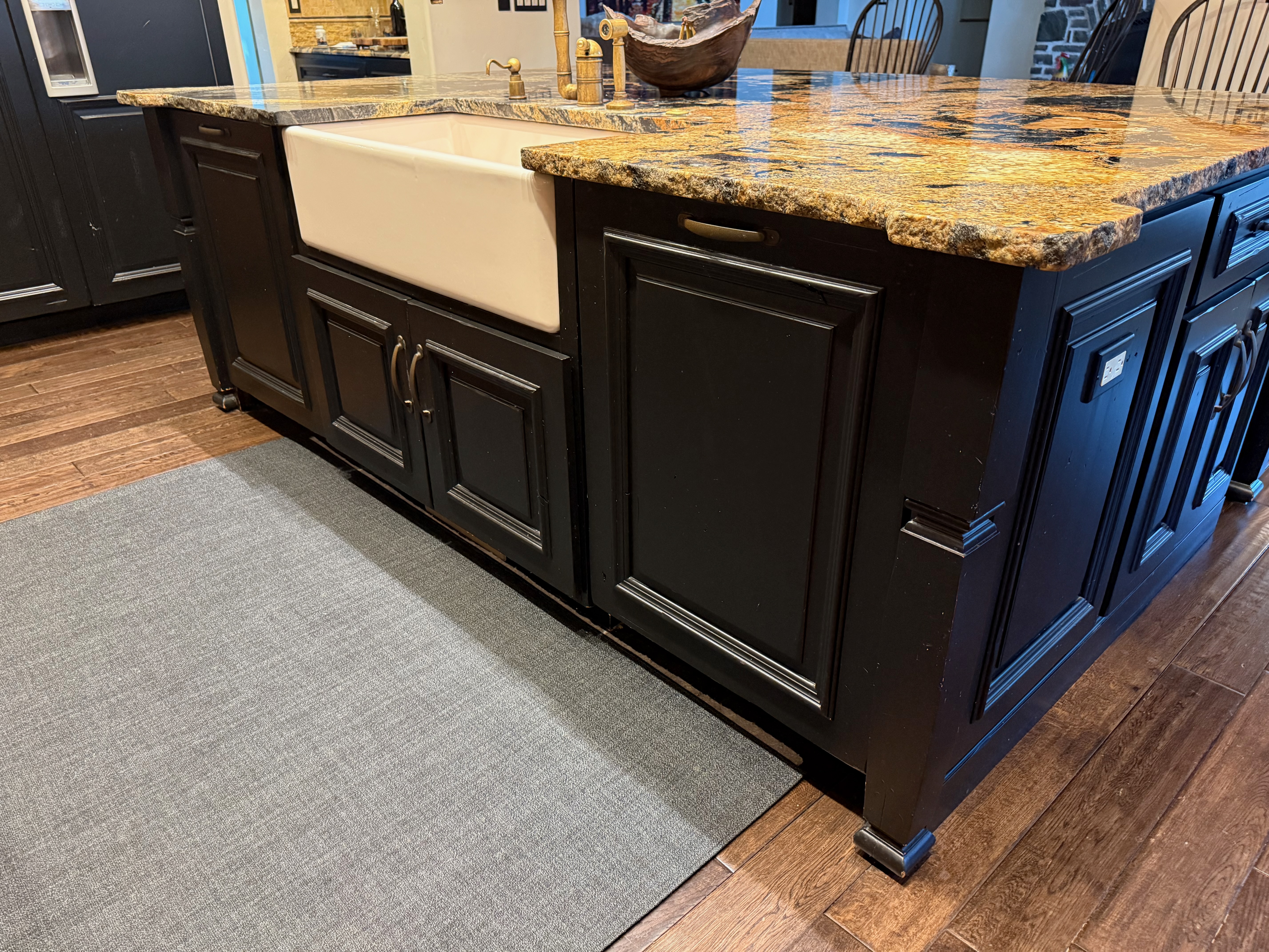 High-end Custom-made Knotty Alder Wood Kitchen Cabinetry with a contrasting black island. The cabinet drawers have the soft close feature with dove-tailed drawers. This Kitchen package comes with top-of-the-line Wolf range, oven and Sub-Zero Appliances. Stunning dramatic very durable Magma Gold granite countertops. The island has a “Shaw” apron/Farmhouse sink. This kitchen package will be ready to be removed Saturday January 17th 2026 by a qualified buyer or licensed contractors are available to hire. Price for the set below.