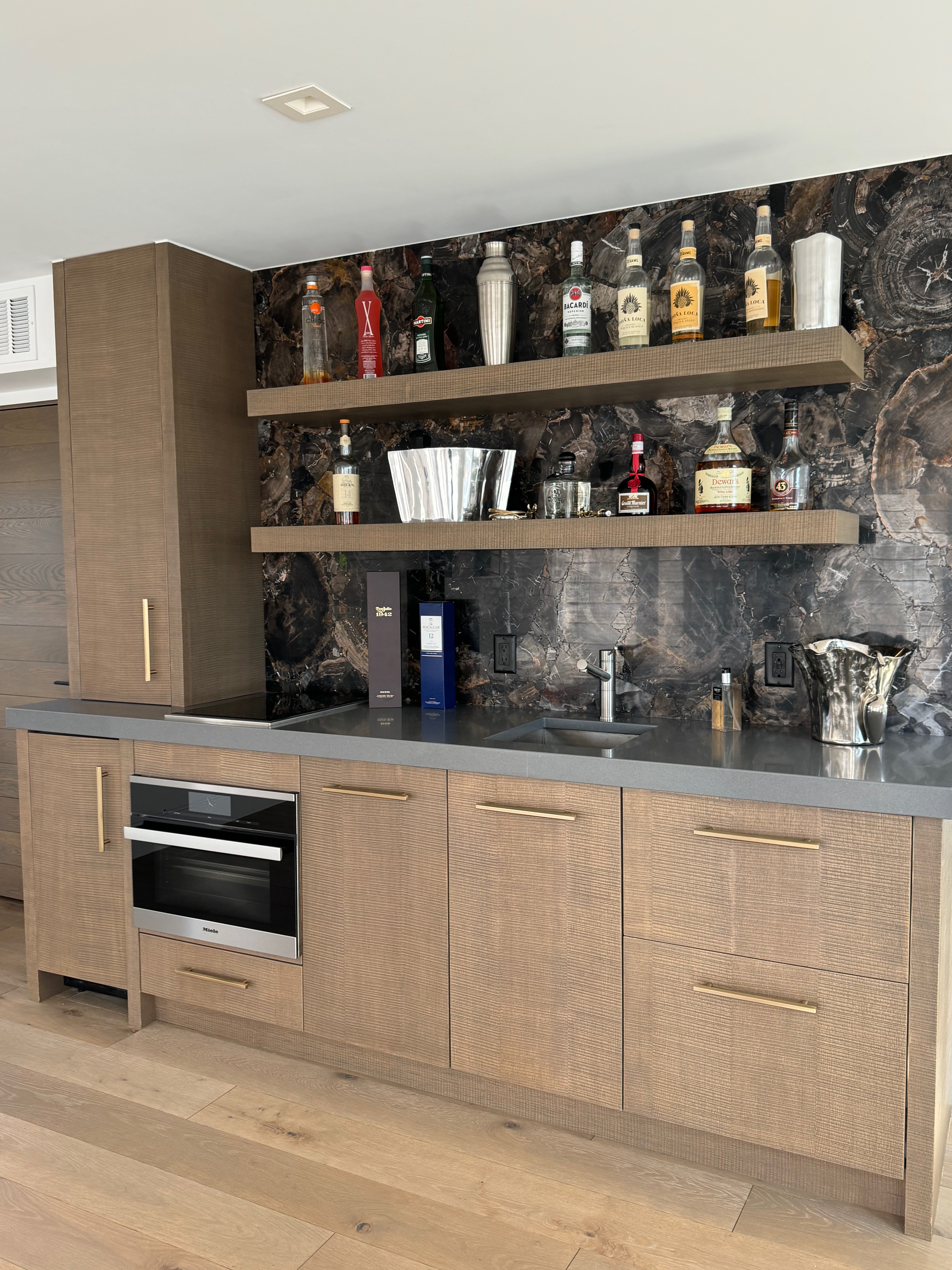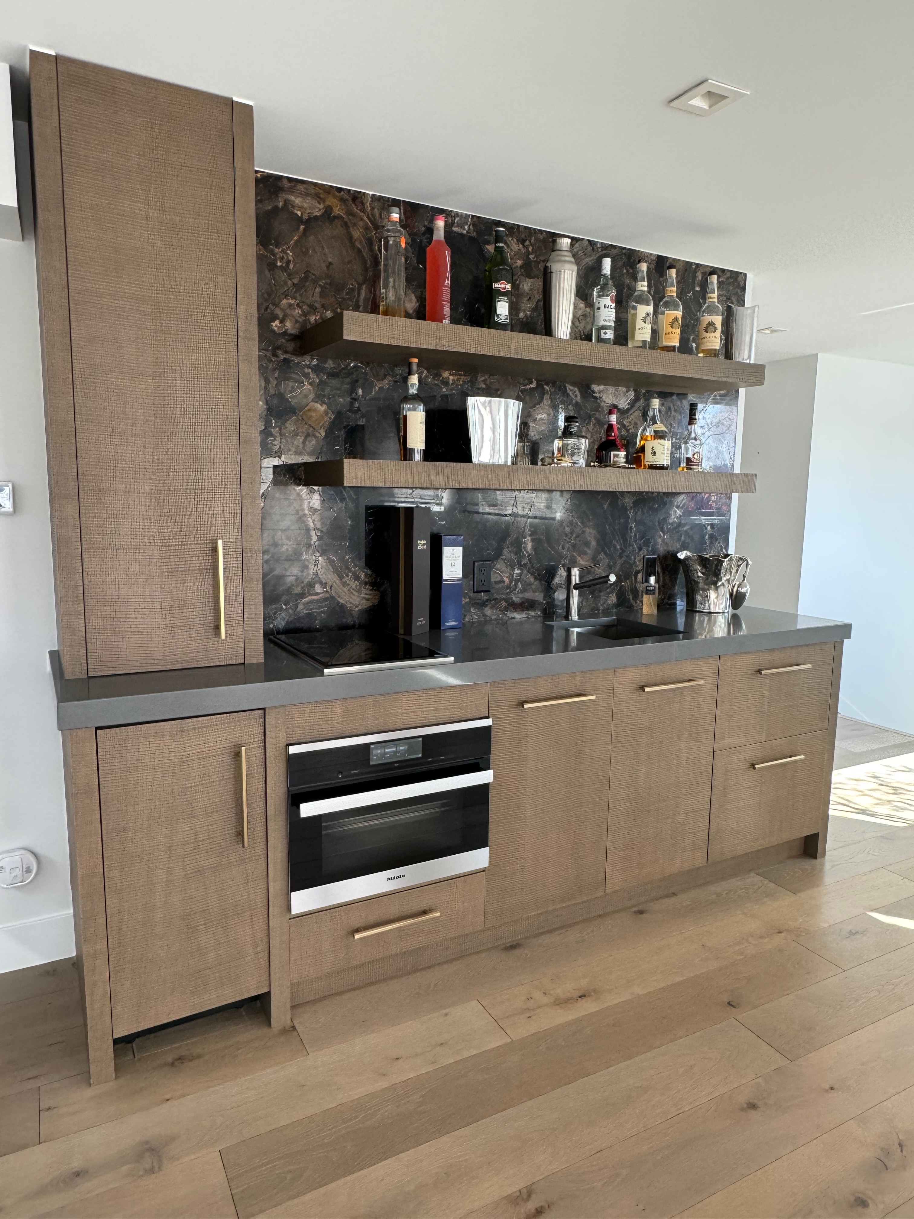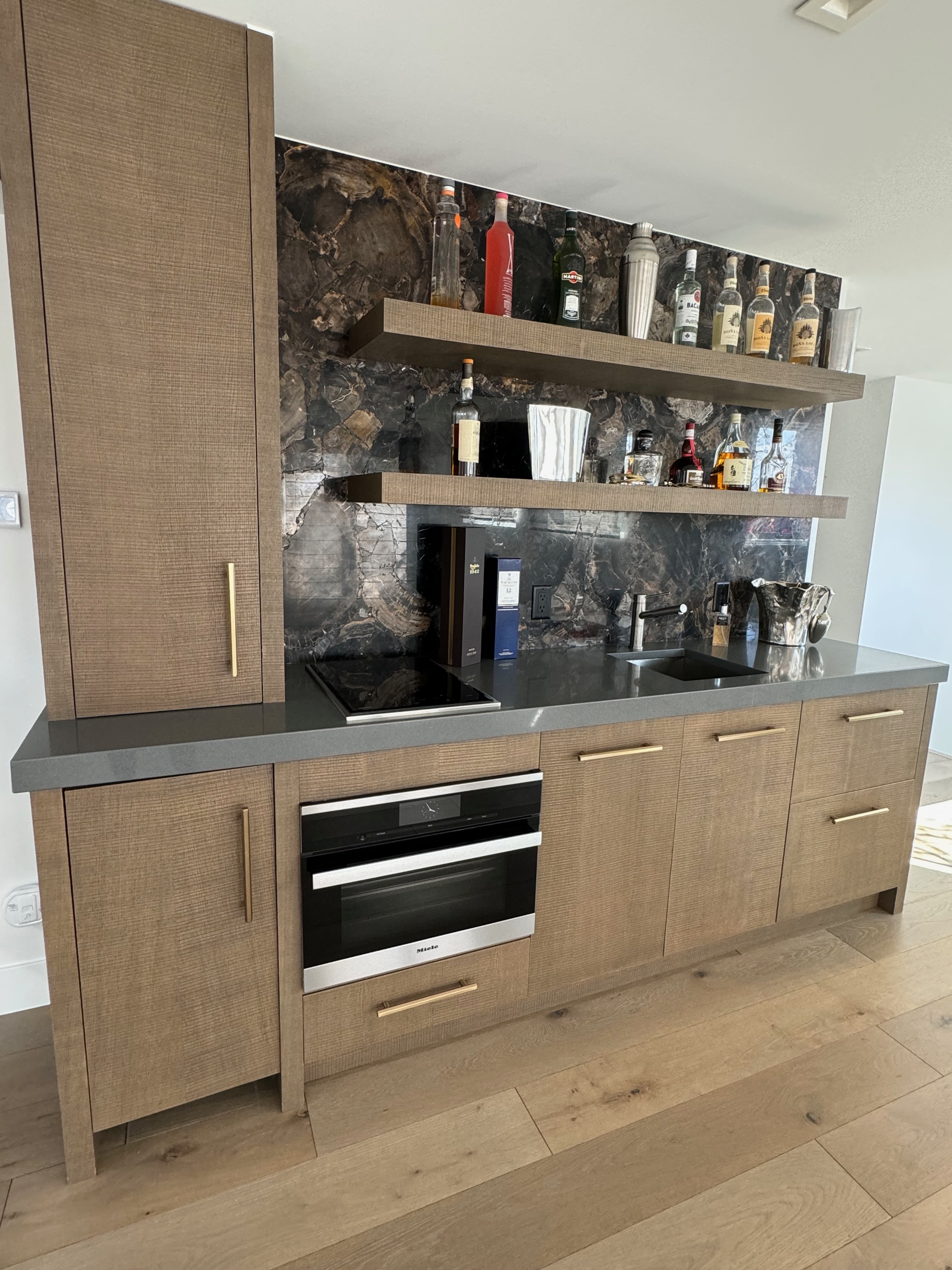 Stunning very high-end William Ohs wet bar cabinetry in a vertical grain re-sawn white oak veneer with a custom brown with flat sheen finish with raking. The cabinets are dovetail and soft-close. Like new, Only 6 years old! The wet bar appliances include a Sub-Zero refrigerator drawers, ice maker, Wolf induction cooktop, Miele steam oven and dishwasher. The wet bar has a gorgeous onyx wall backsplash with shelving.The wet bar matches the kitchen package and master suite also for sale from the same house. The wet bar has been carefully removed by licensed contractors and moved to storage. Drawings attached. Price for the package below.