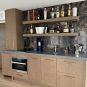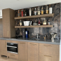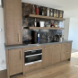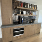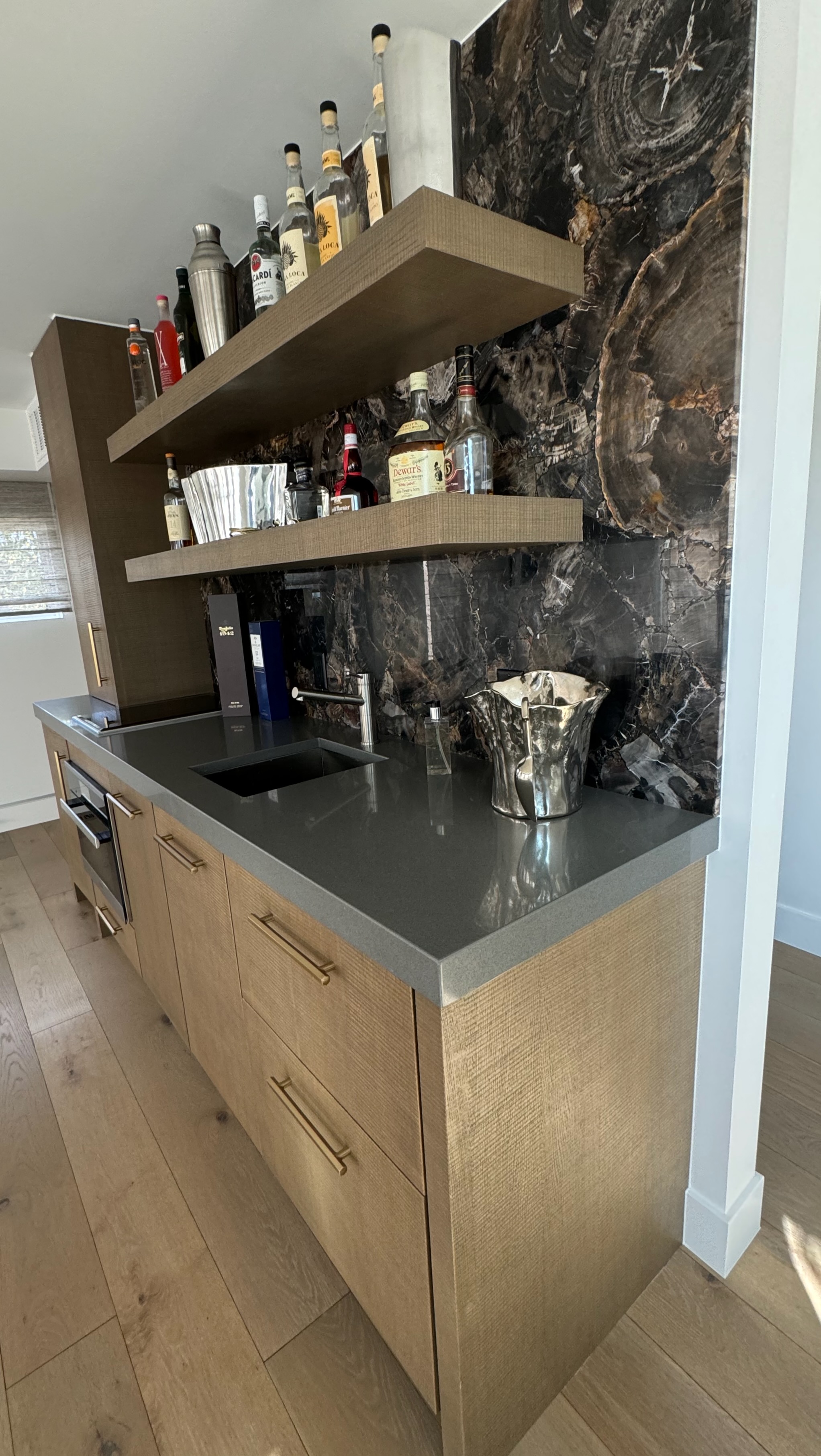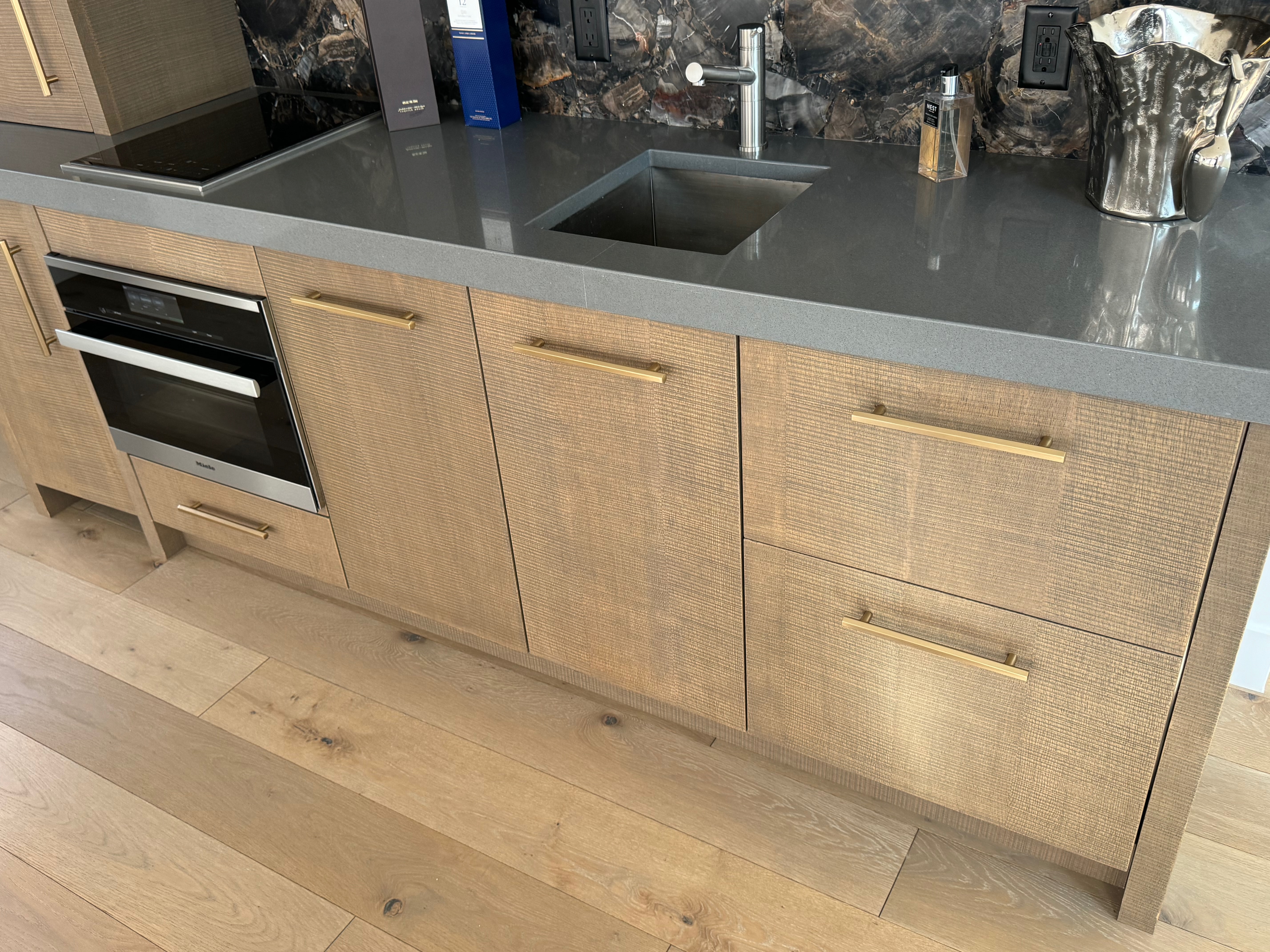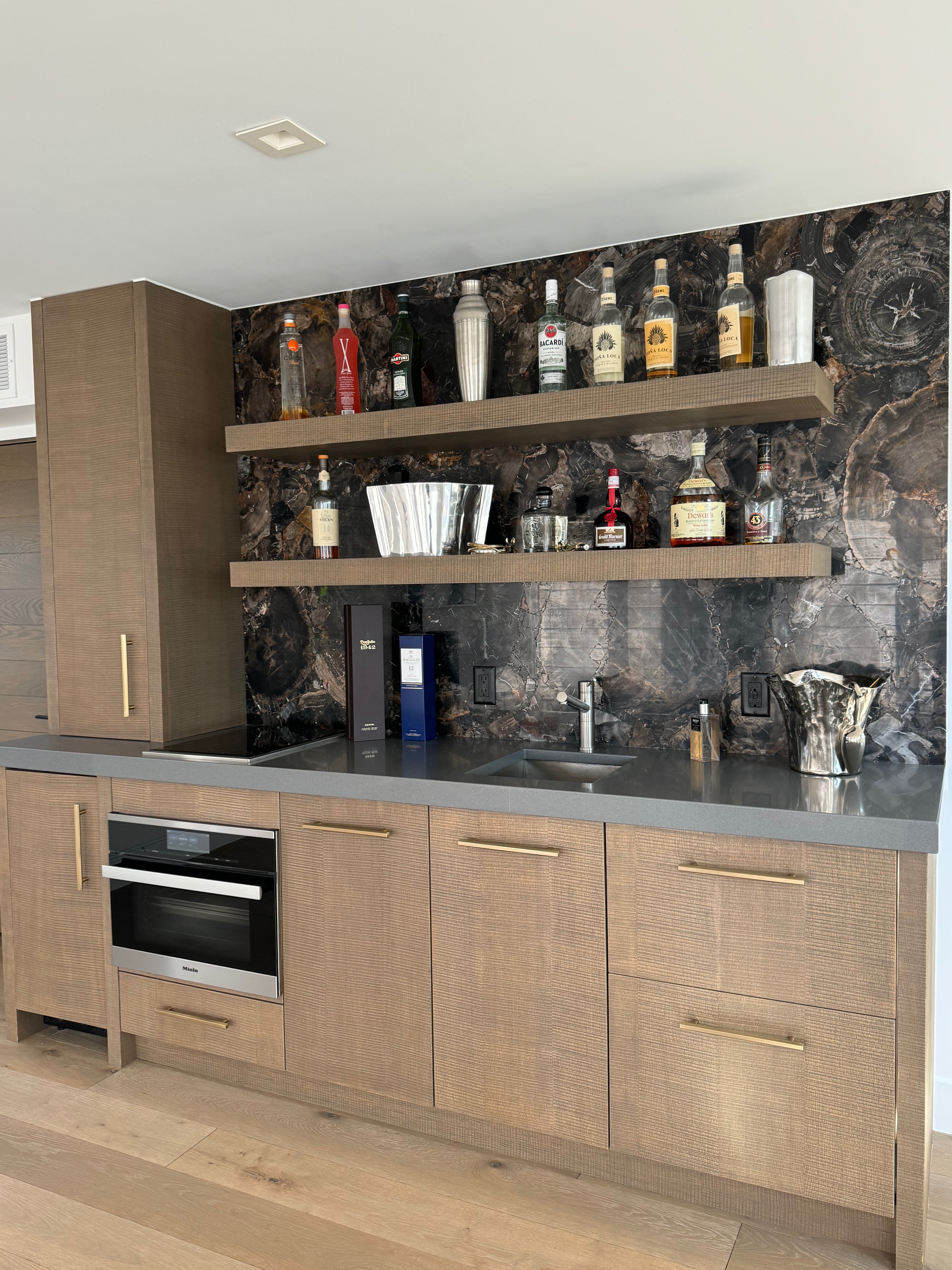 Stunning very high-end William Ohs wet bar cabinetry in a vertical grain re-sawn white oak veneer with a custom brown with flat sheen finish with raking. The cabinets are dovetail and soft-close. Like new, Only 6 years old! The wet bar appliances include a Sub-Zero refrigerator drawers, ice maker, Wolf induction cooktop, Miele steam oven and dishwasher. The wet bar has a gorgeous onyx wall backsplash with shelving.The wet bar matches the kitchen package and master suite also for sale from the same house. The wet bar has been carefully removed by licensed contractors and moved to storage. Drawings attached. Price for the package below.