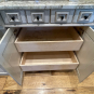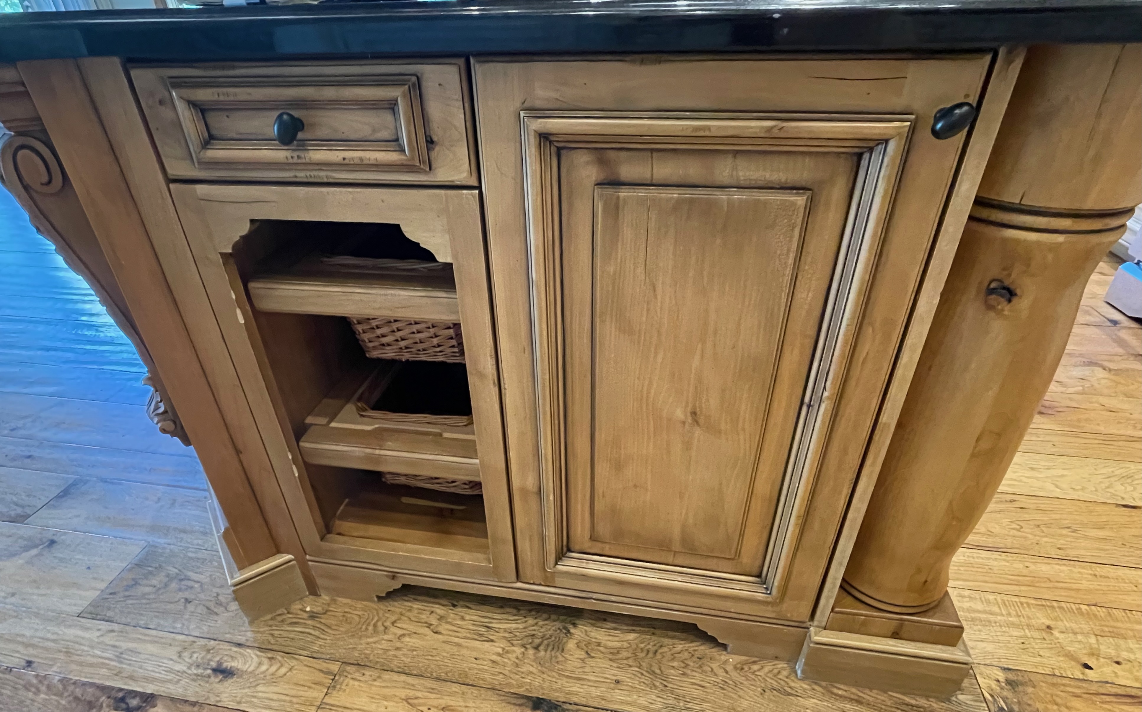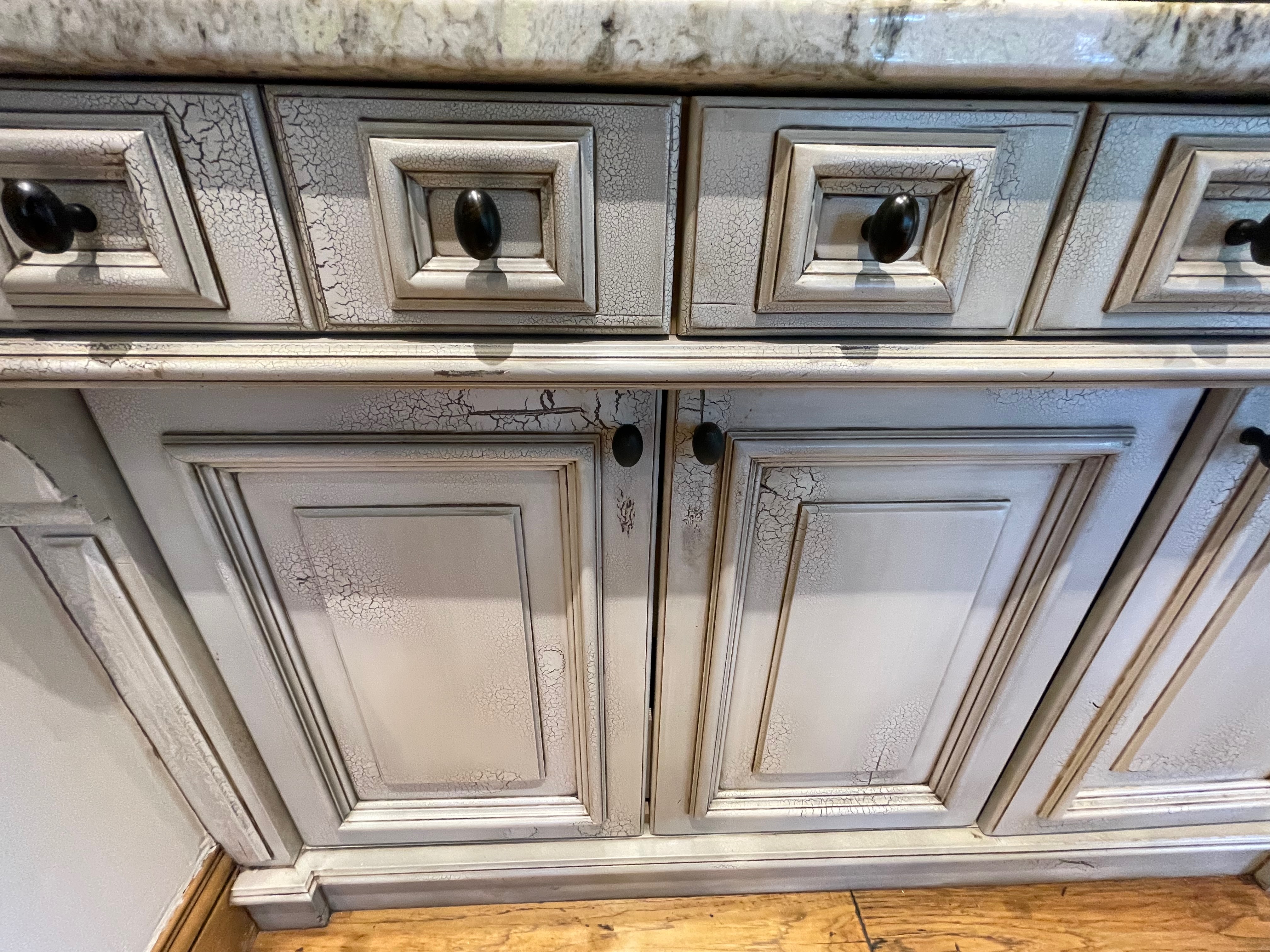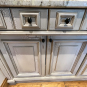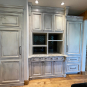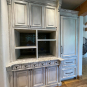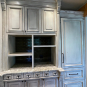1-Three door wall/counter cabinet (bottom looks like drawers but is door) Dim.: 21” w/25 ½” w with filler and finish panels x 35”h cab. only/64” without crown/72”h x w/crown x 13” d