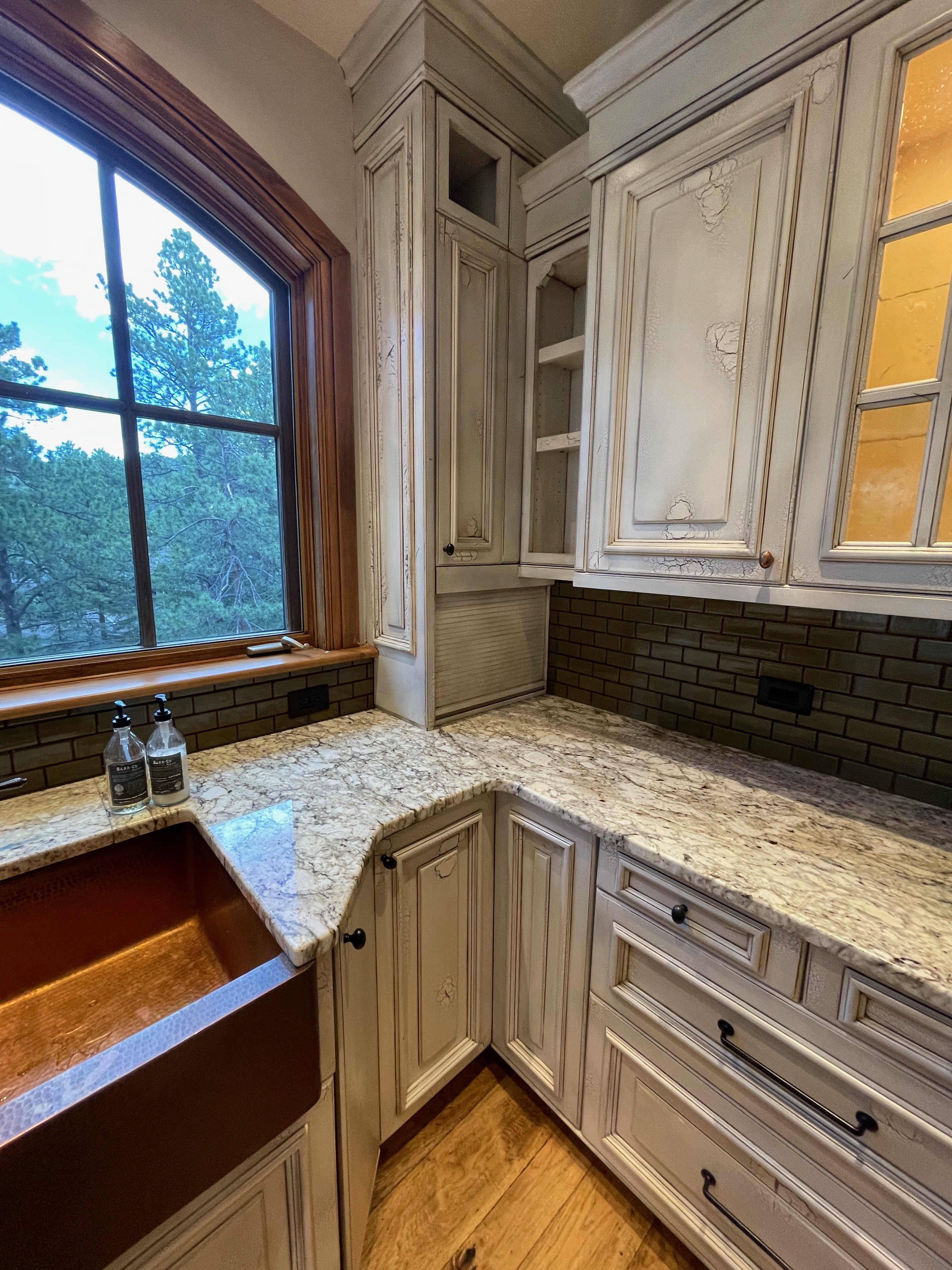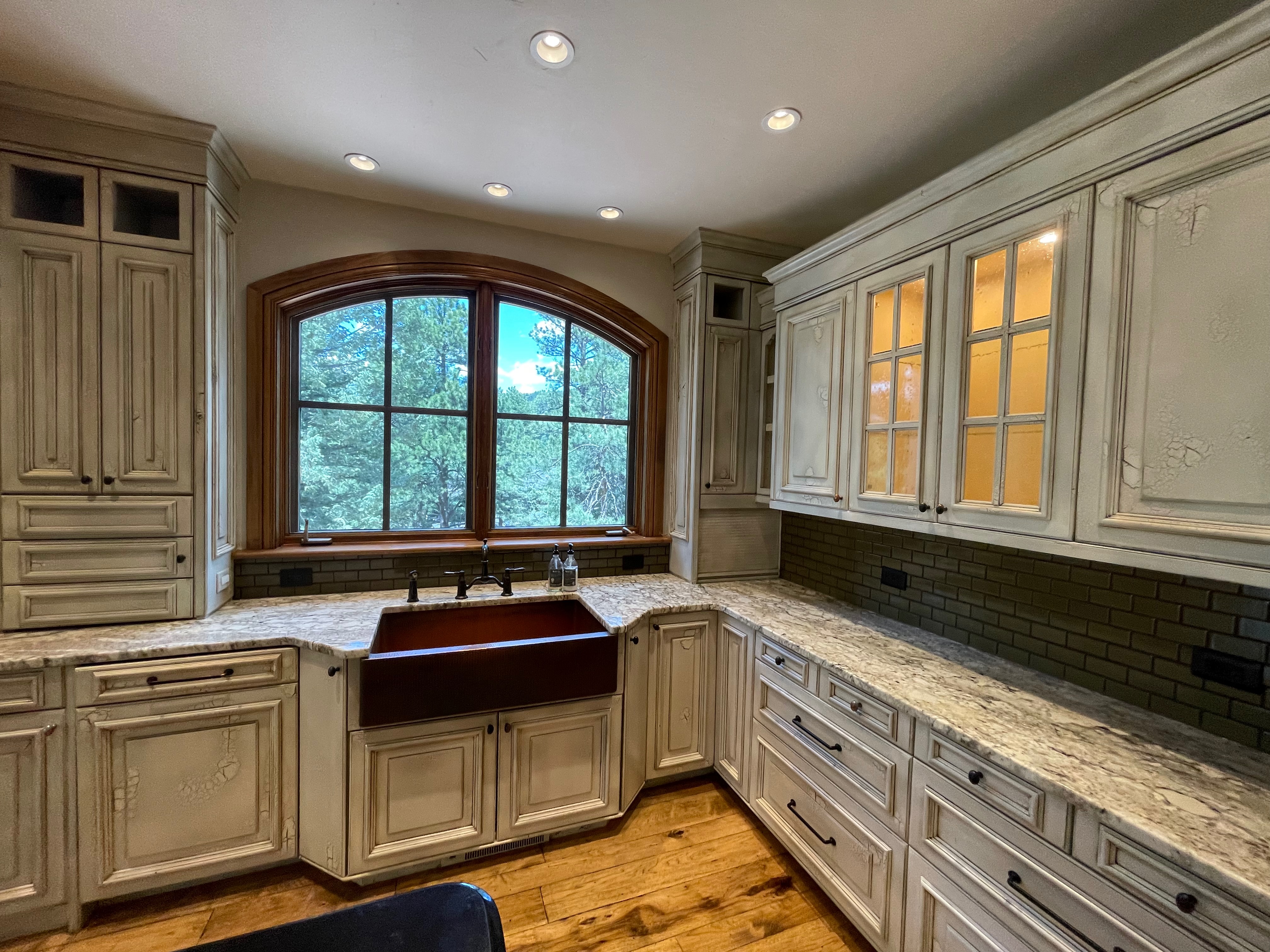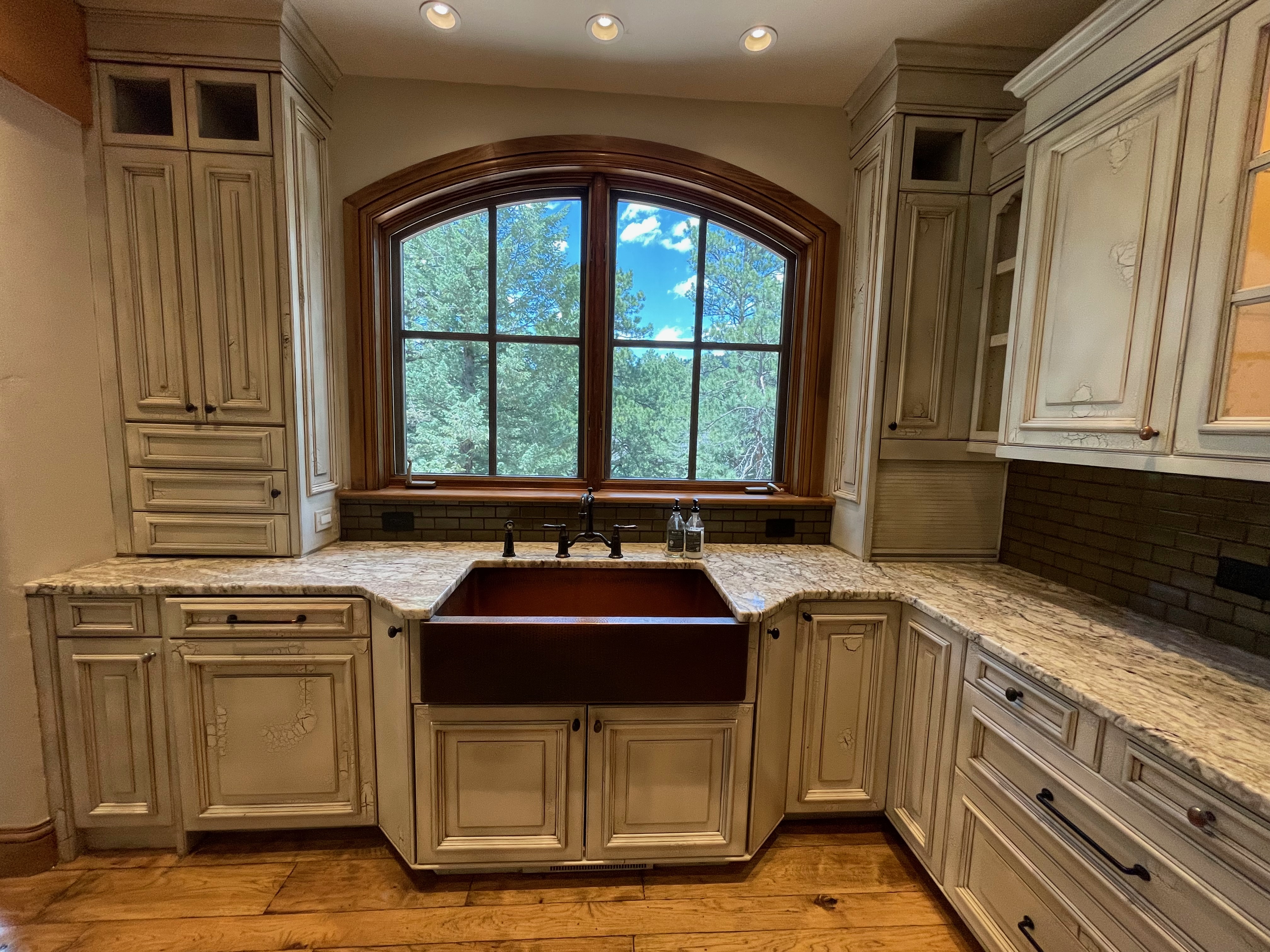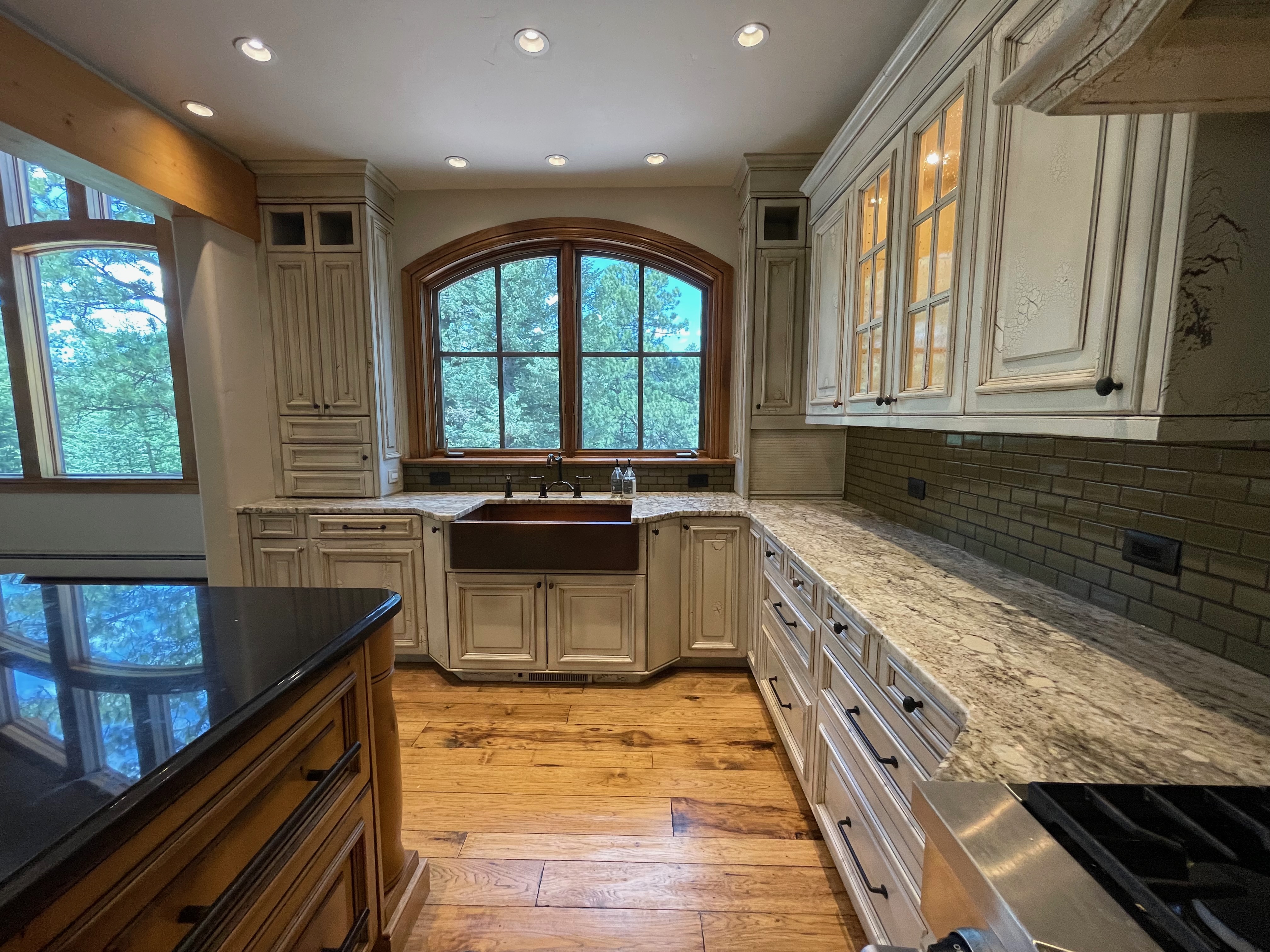 Nice kitchen cabinets with Sub-Zero refrigerator bottom freezer and under counter refrigerator drawers, KitchenAid Range and Bosch dishwasher. The island is natural knotty alder cabinets with the perimeter cabinetry being the same knotty alder cabinets painted manufactured by Genesis innovations, llc. The kitchen comes with a beautiful copper farmhouse sink.