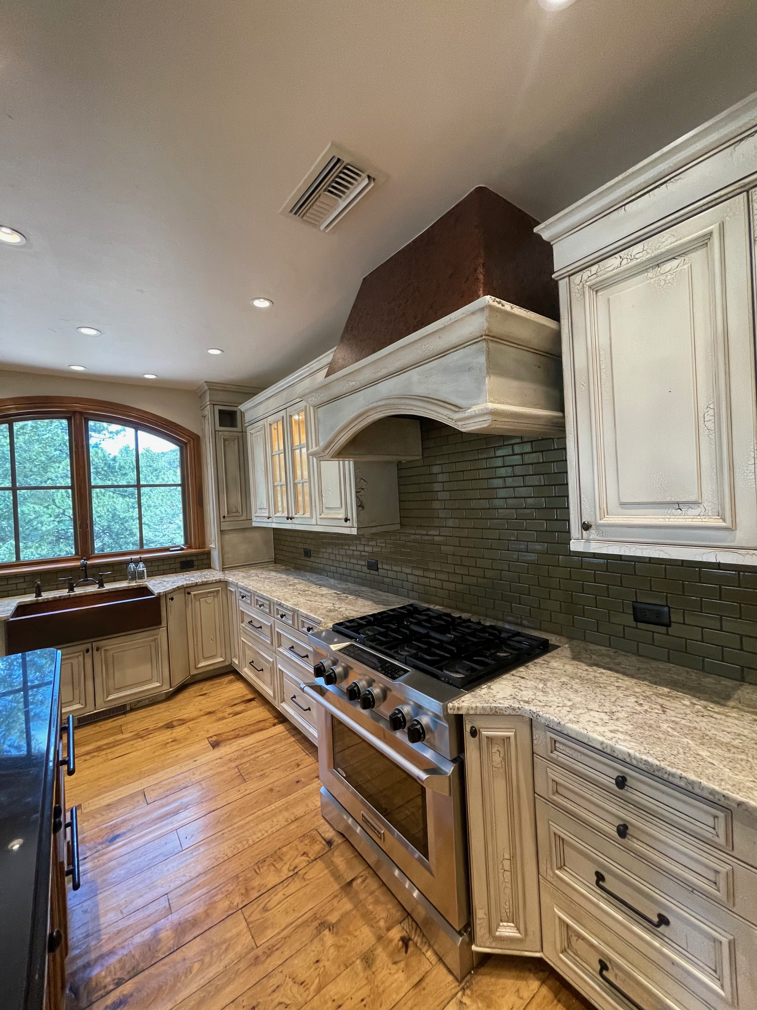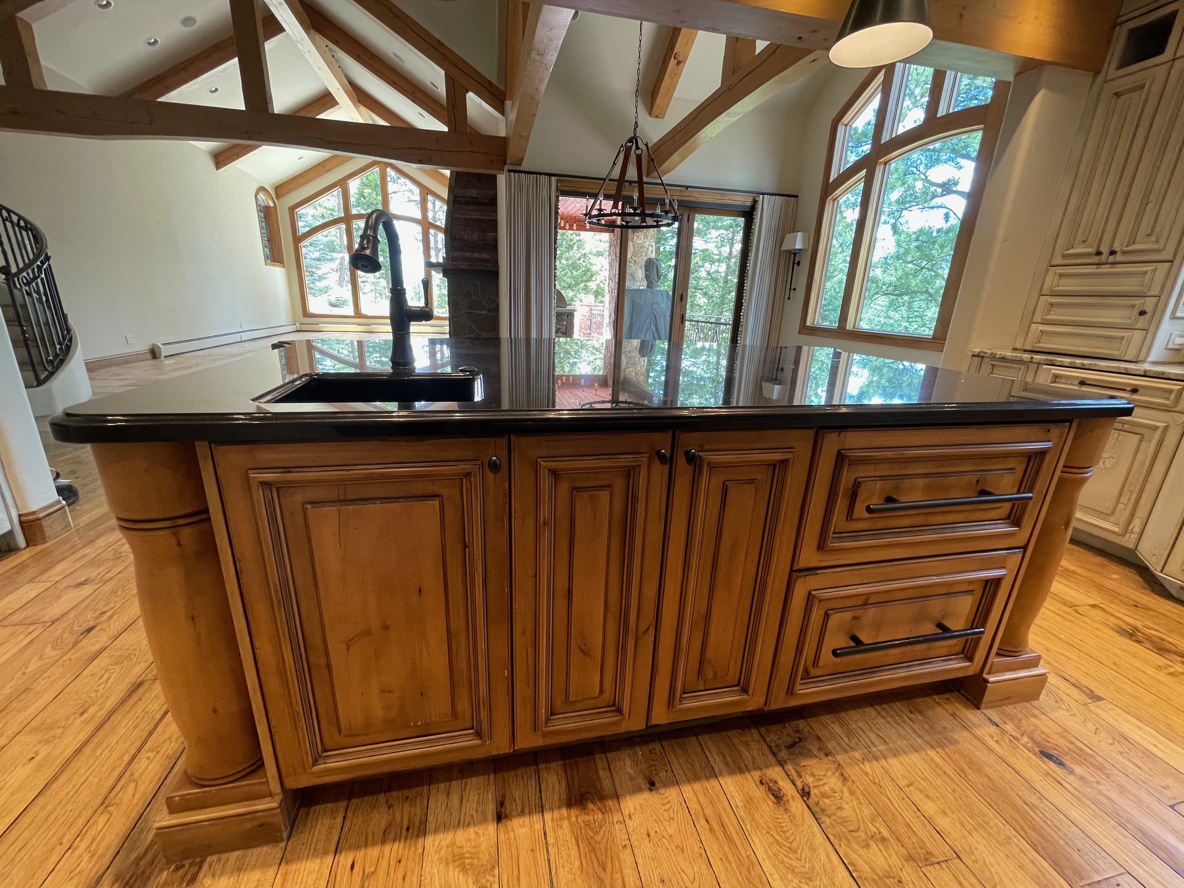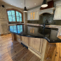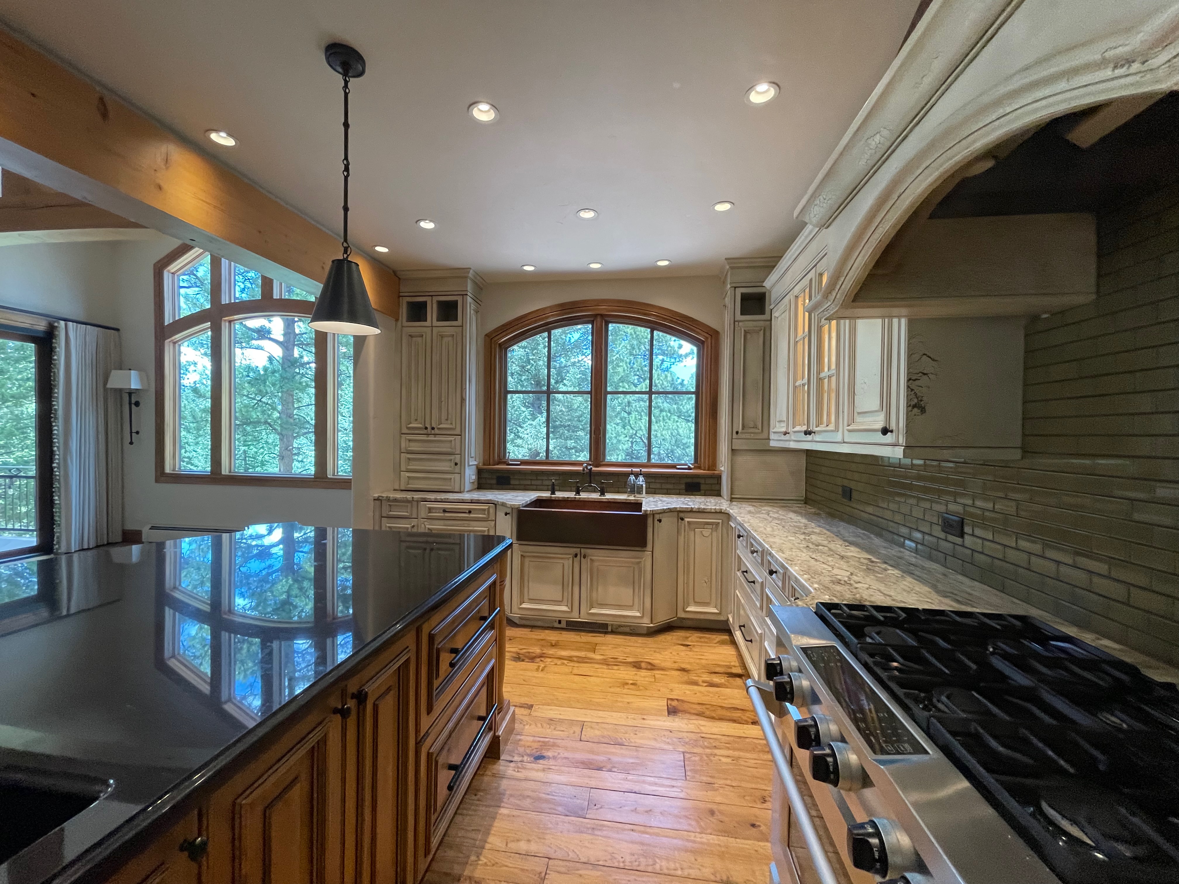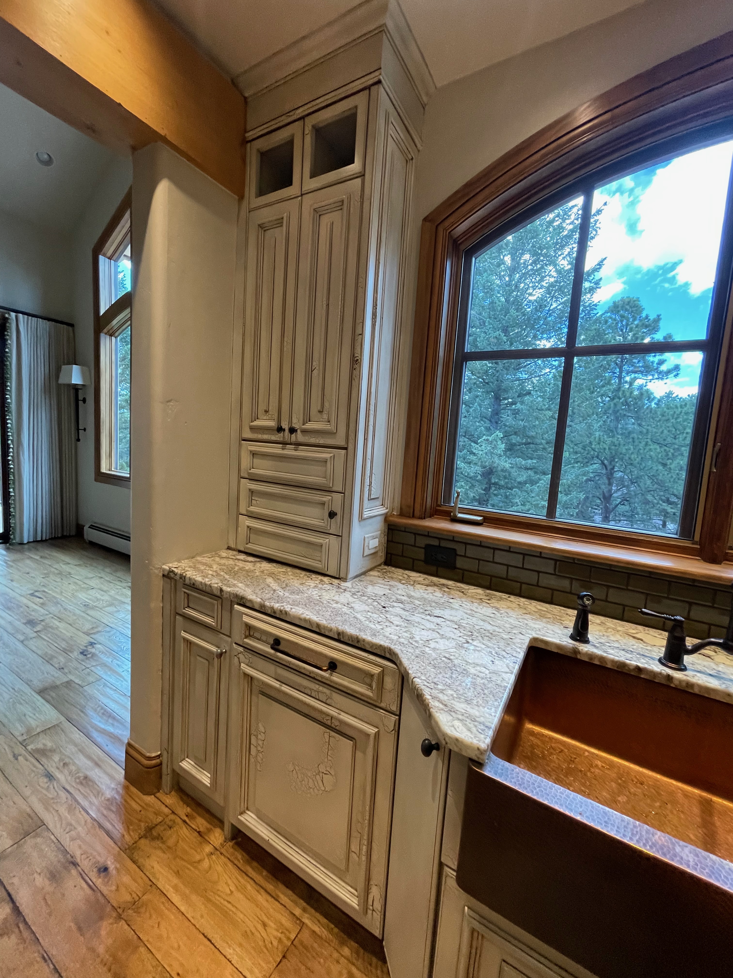Nice kitchen cabinets with Sub-Zero refrigerator bottom freezer and under counter refrigerator drawers, KitchenAid Range and Bosch dishwasher. The island is natural knotty alder cabinets with the perimeter cabinetry being the same knotty alder cabinets painted manufactured by Genesis innovations, llc. The kitchen comes with a beautiful copper farmhouse sink.