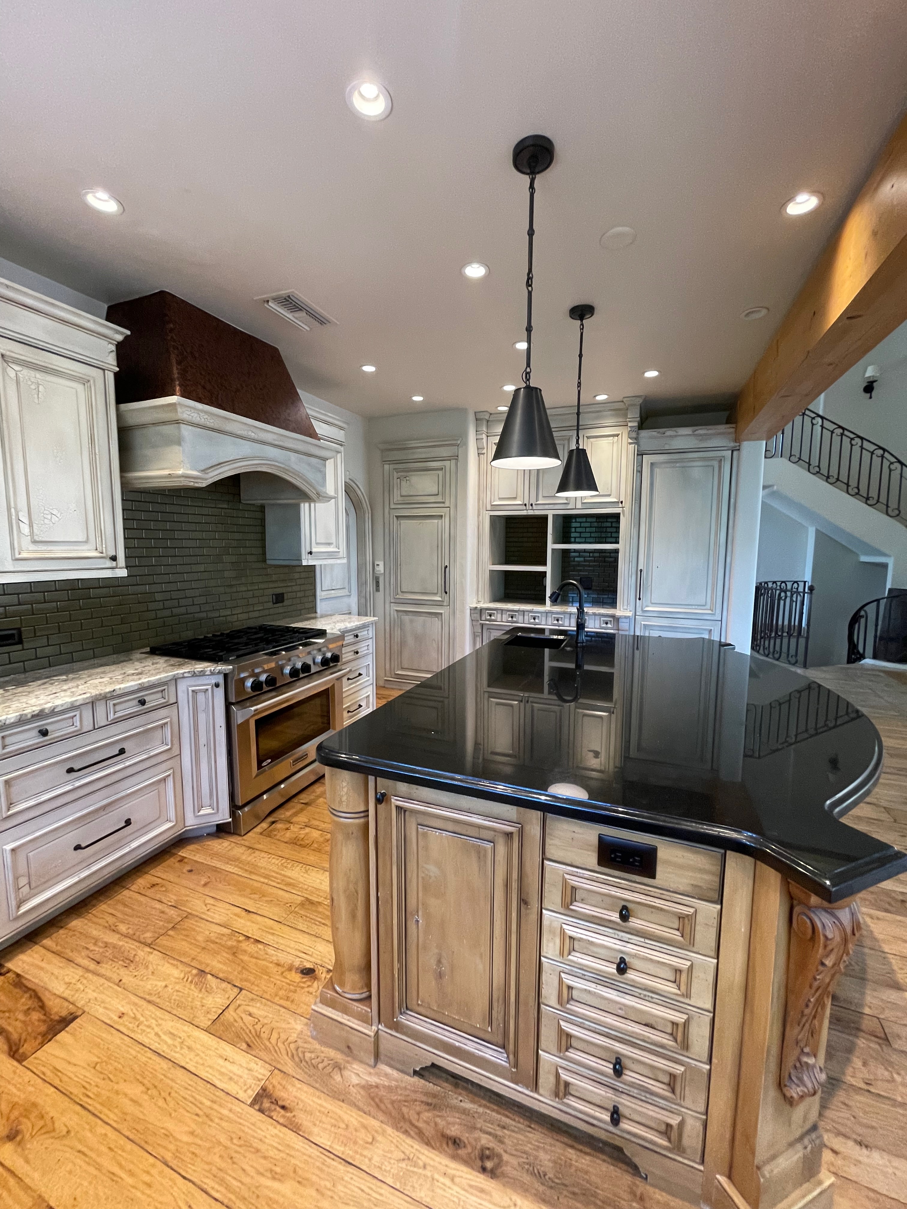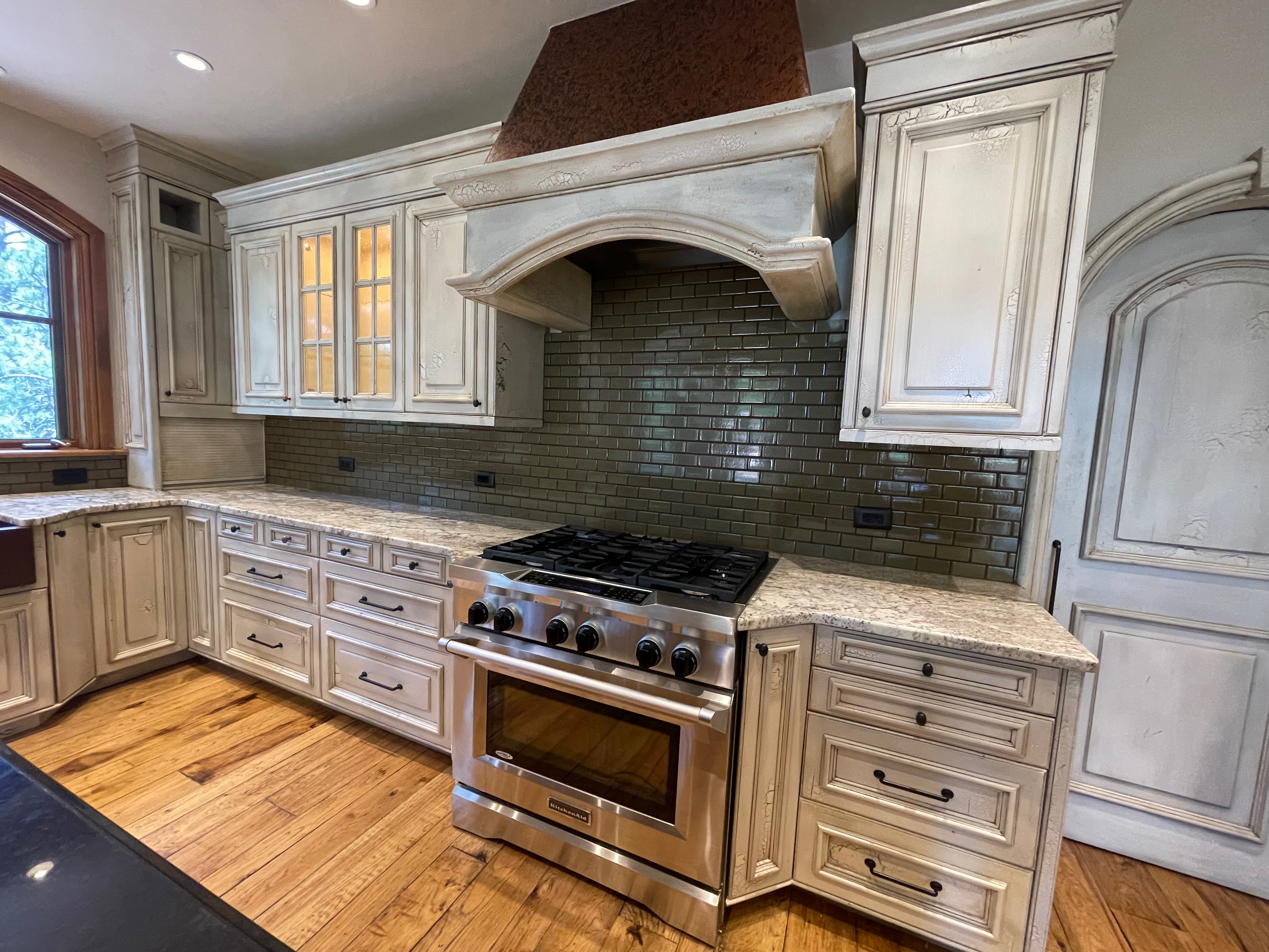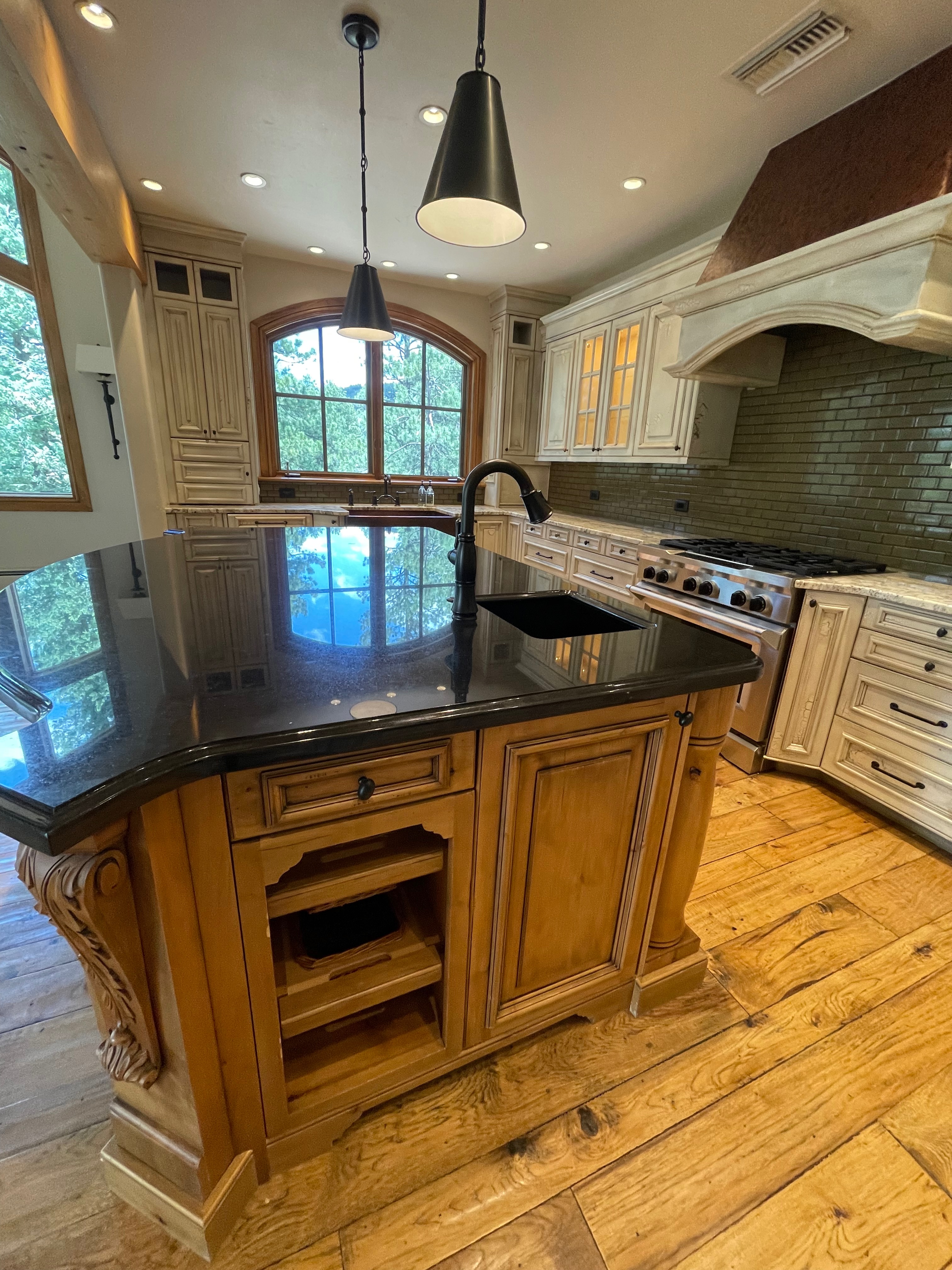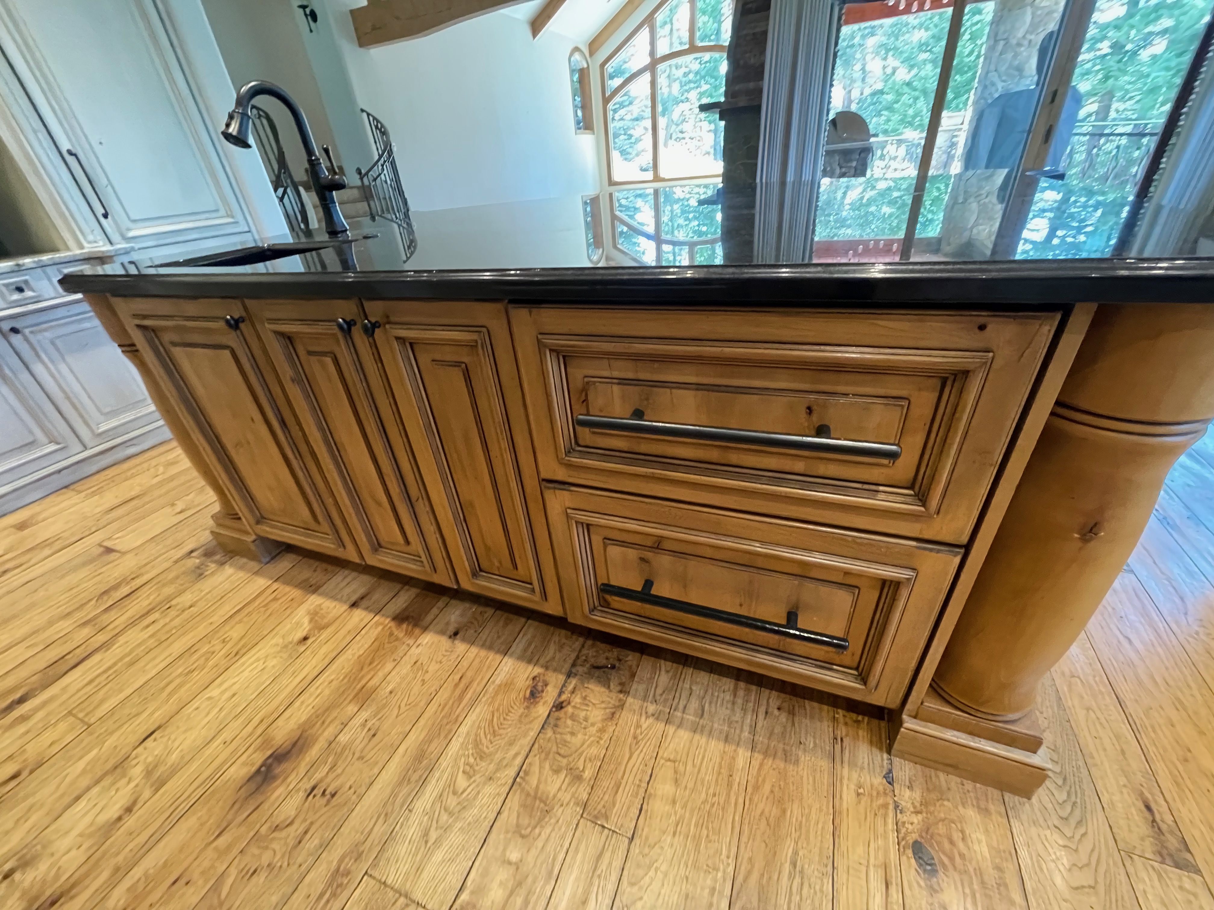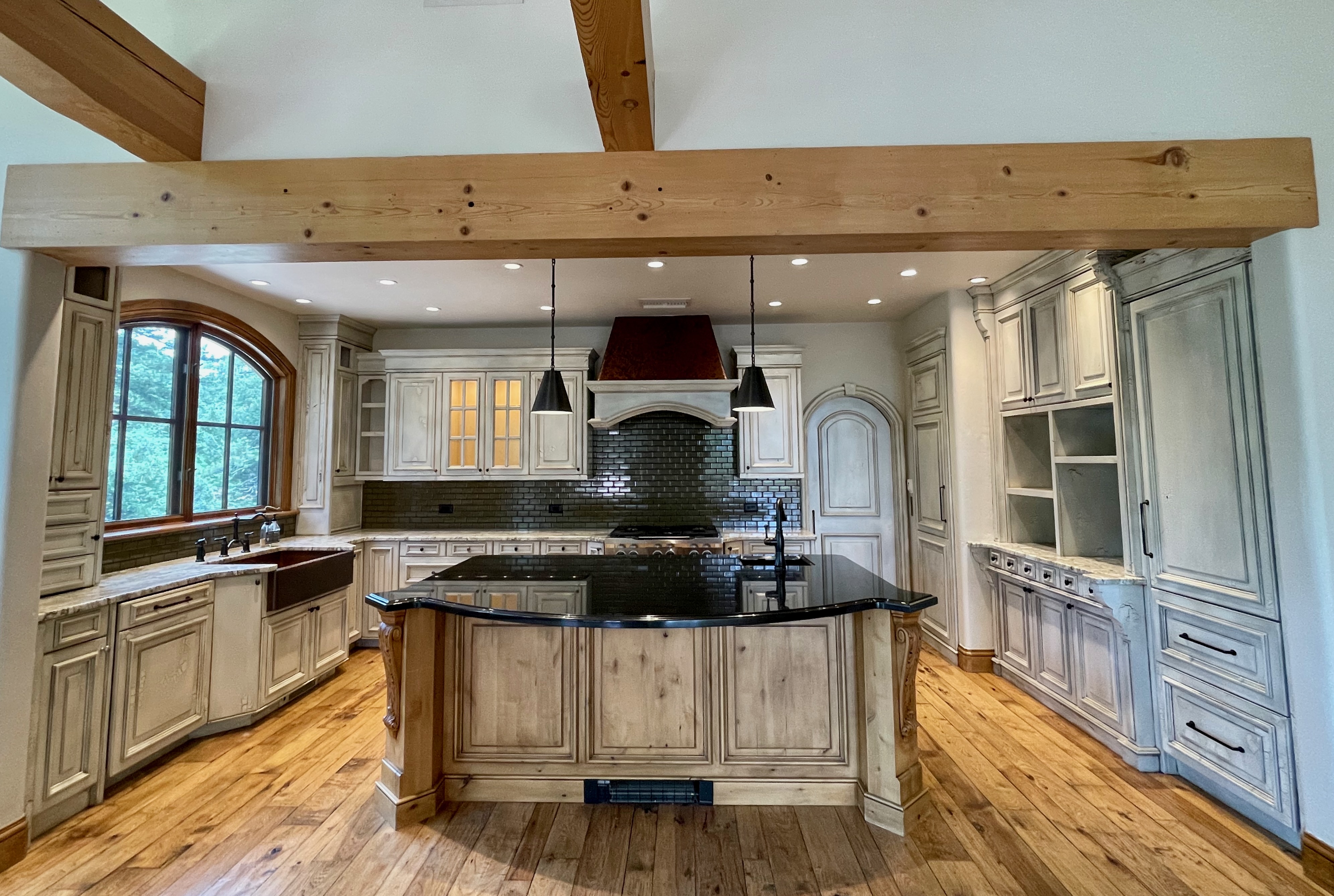 Nice kitchen cabinets with Sub-Zero refrigerator bottom freezer and under counter refrigerator drawers, KitchenAid Range and Bosch dishwasher. The island is natural knotty alder cabinets with the perimeter cabinetry being the same knotty alder cabinets painted manufactured by Genesis innovations, llc. The kitchen comes with a beautiful copper farmhouse sink.