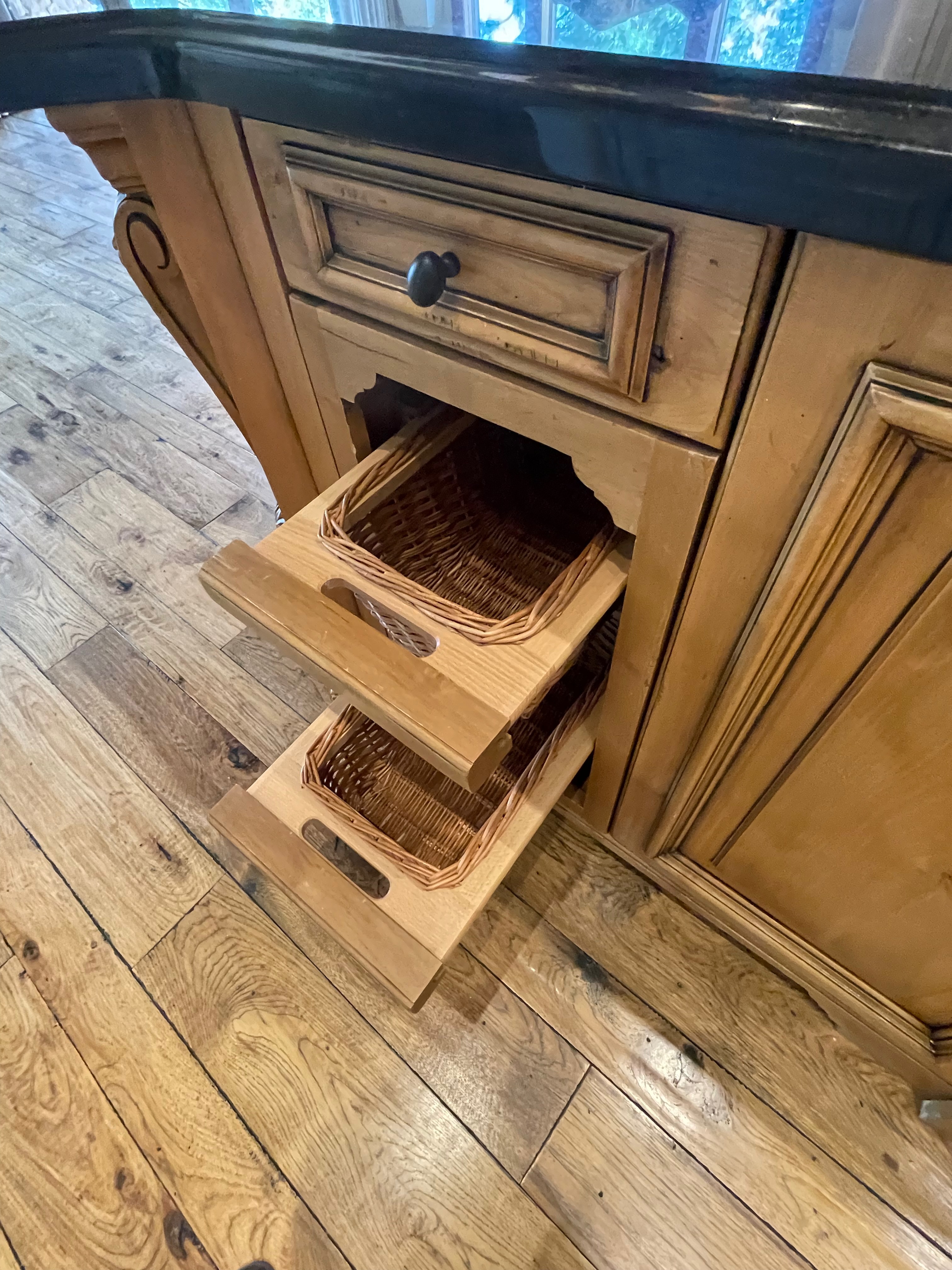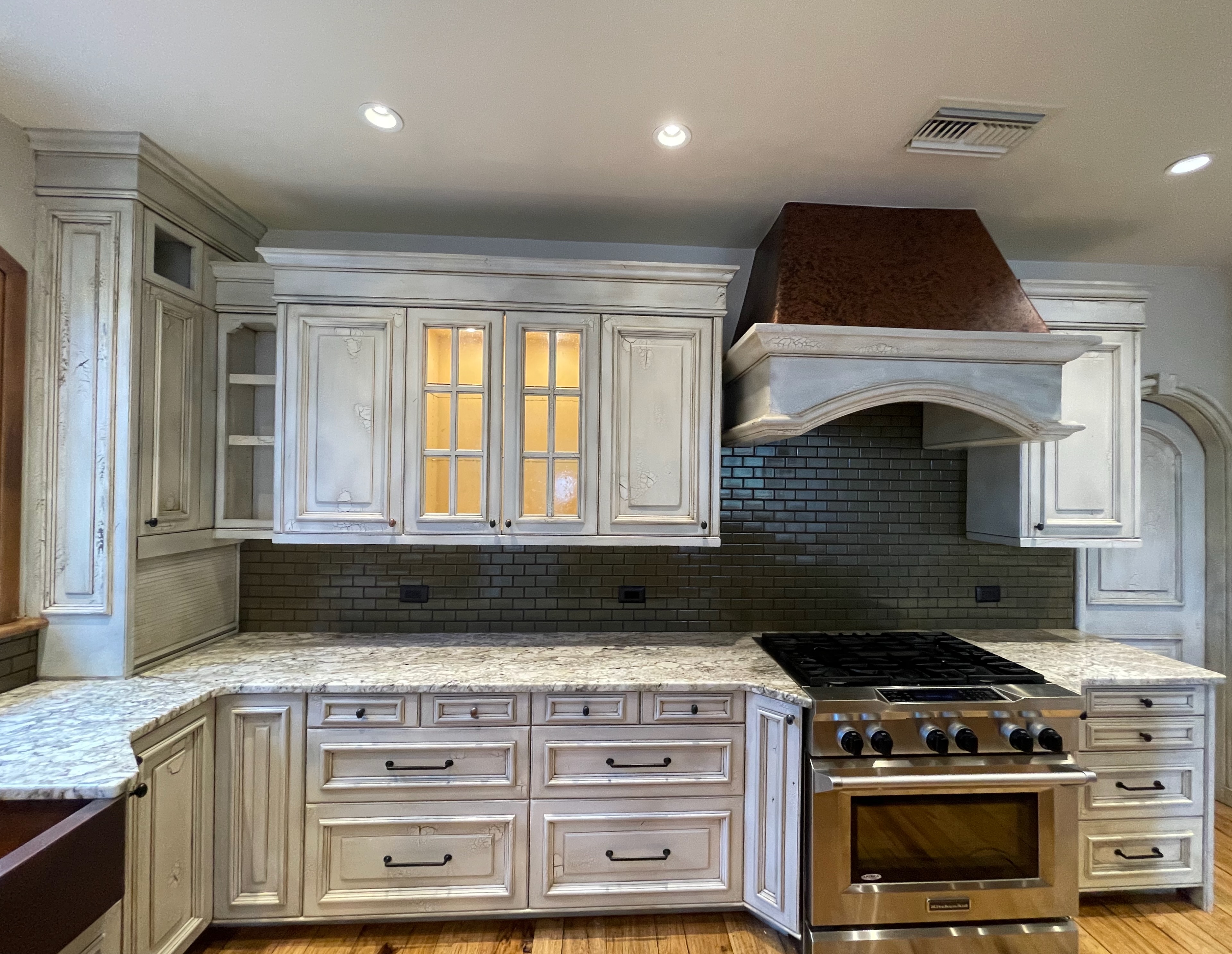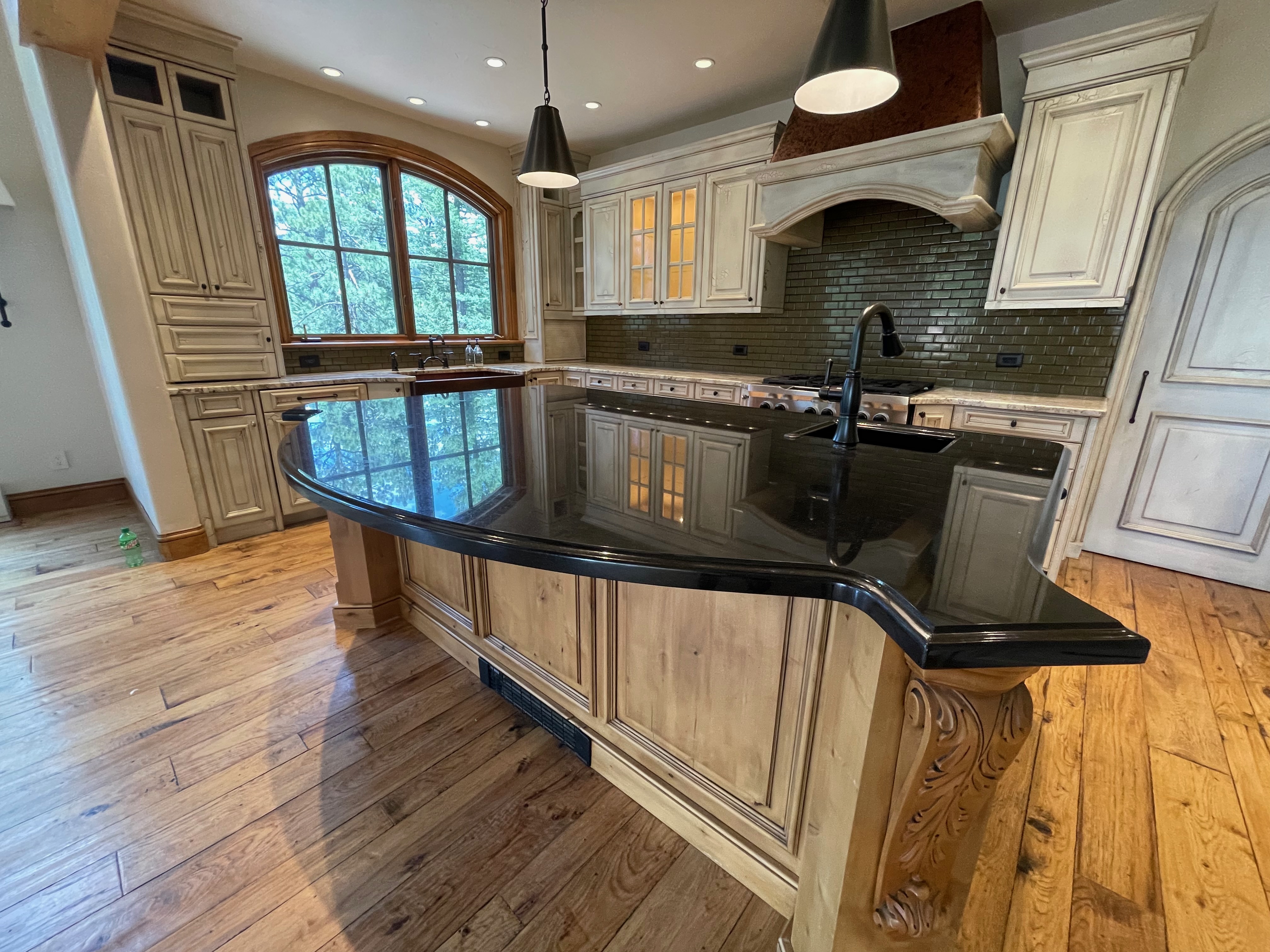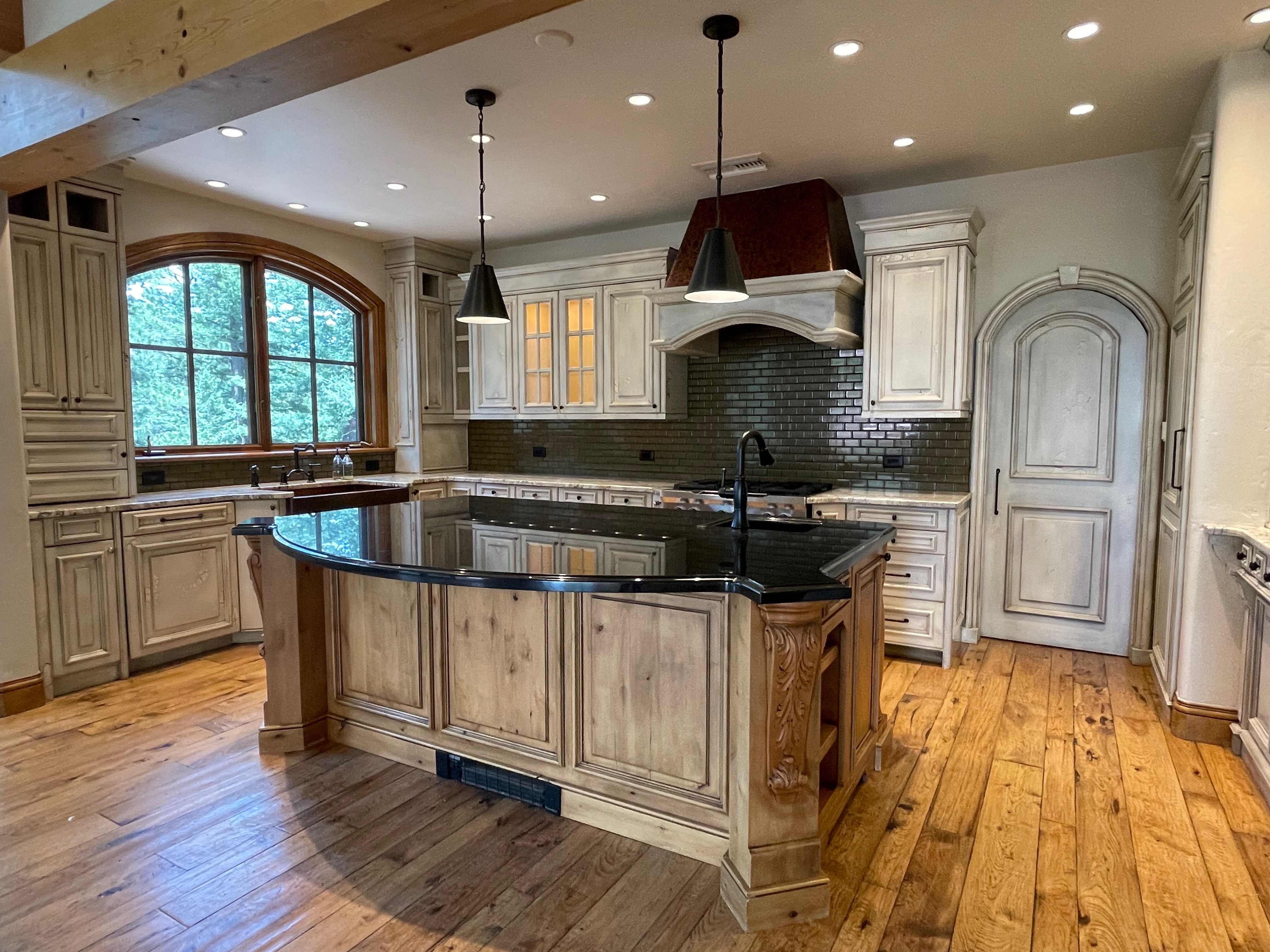 Nice kitchen cabinets with Sub-Zero refrigerator bottom freezer and under counter refrigerator drawers, KitchenAid Range and Bosch dishwasher. The island is natural knotty alder cabinets with the perimeter cabinetry being the same knotty alder cabinets painted manufactured by Genesis innovations, llc. The kitchen comes with a beautiful copper farmhouse sink.