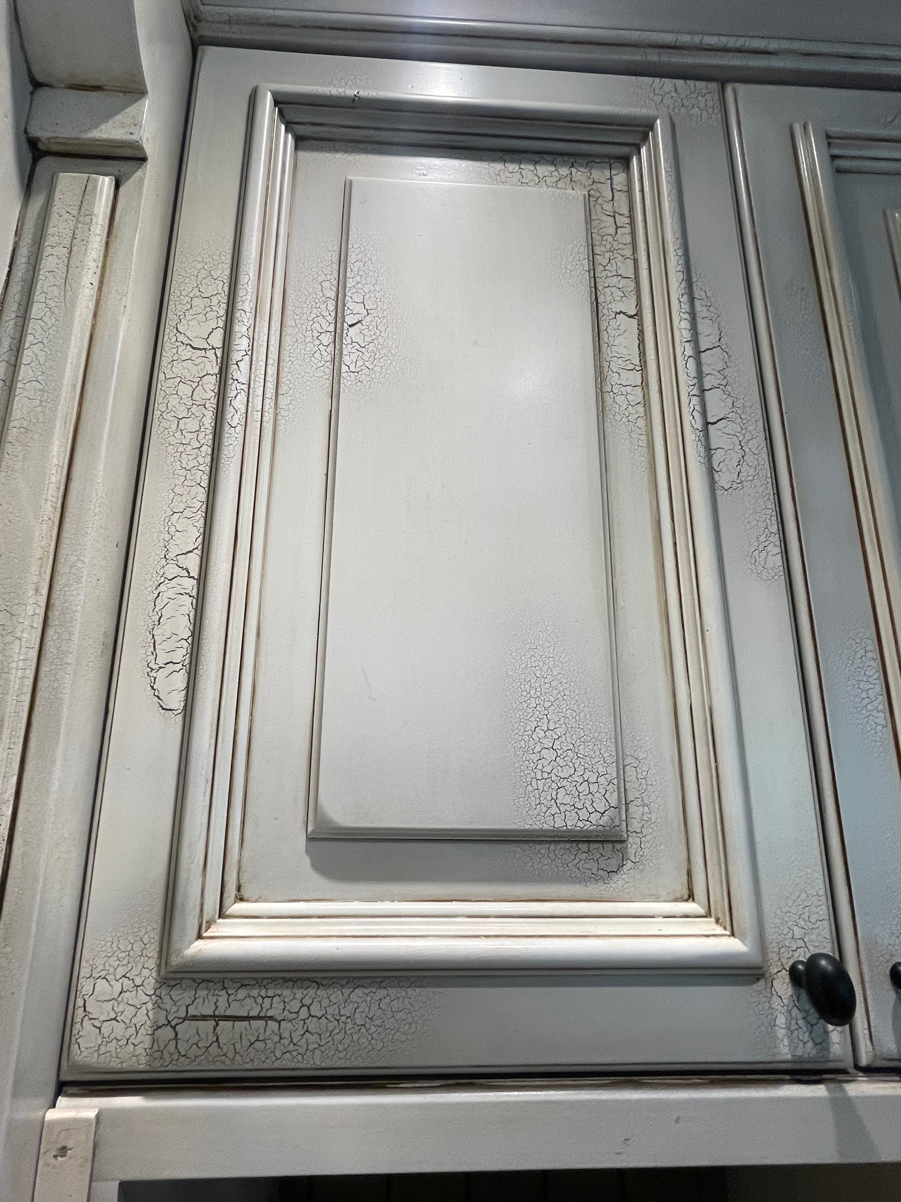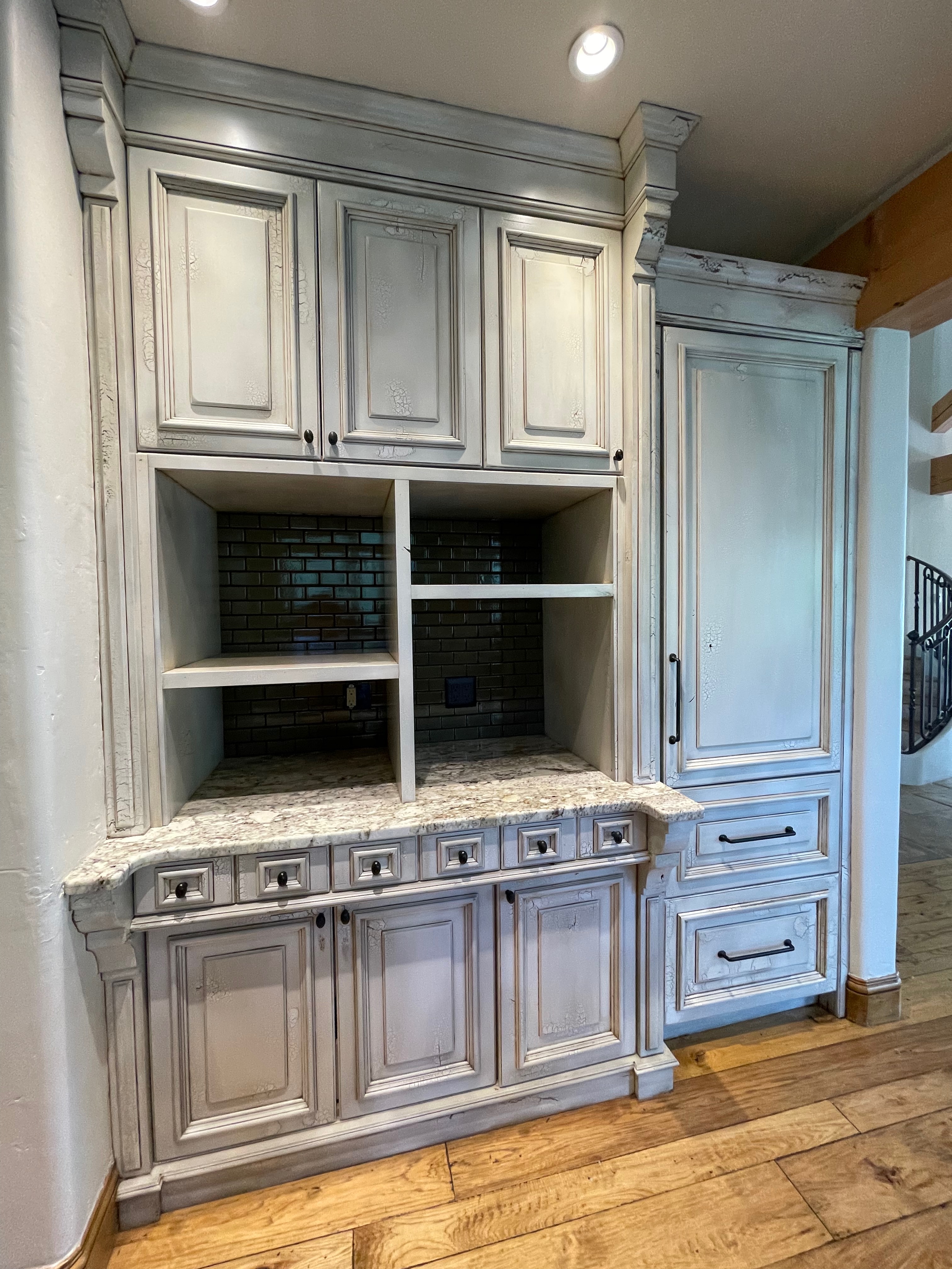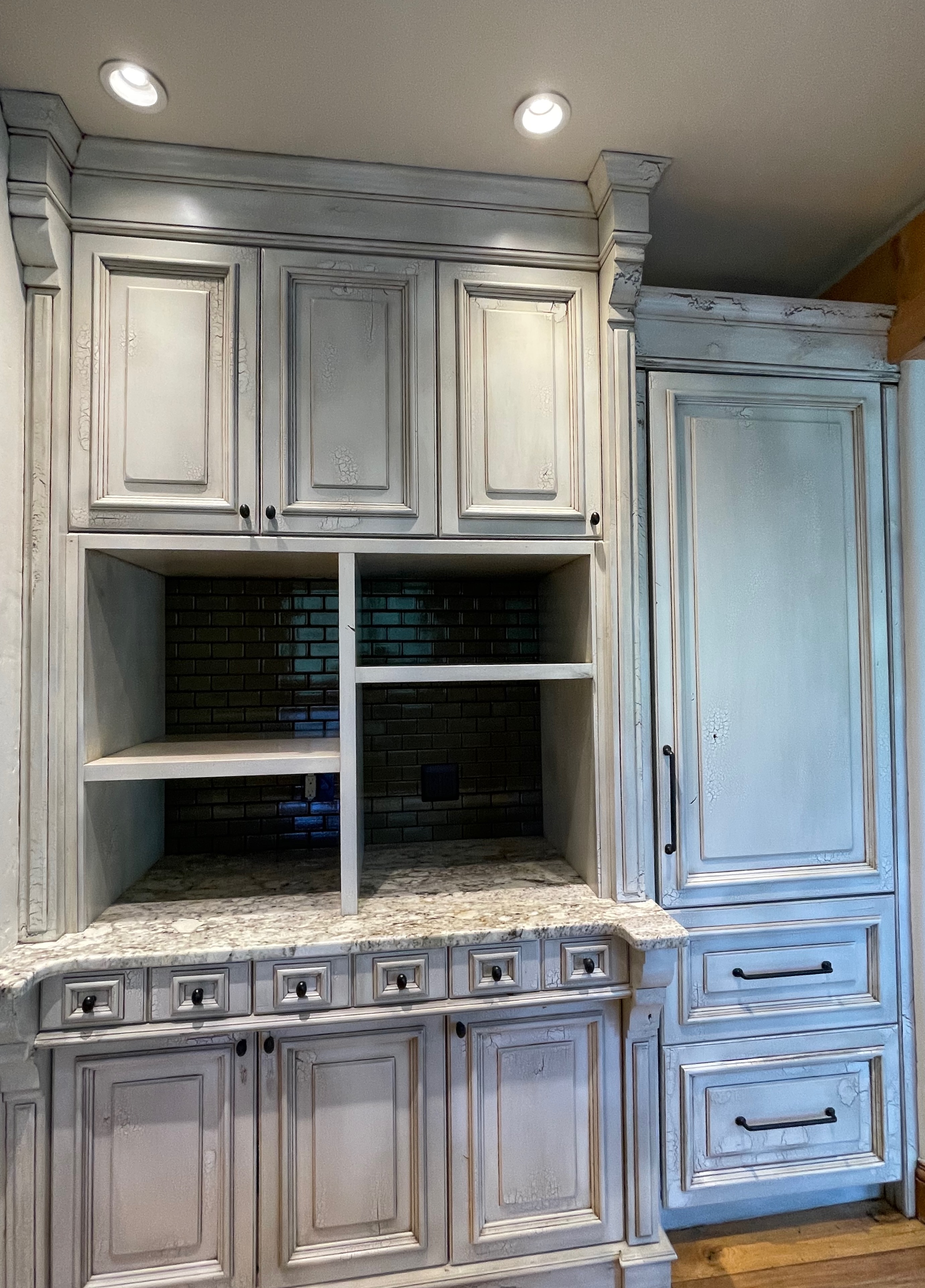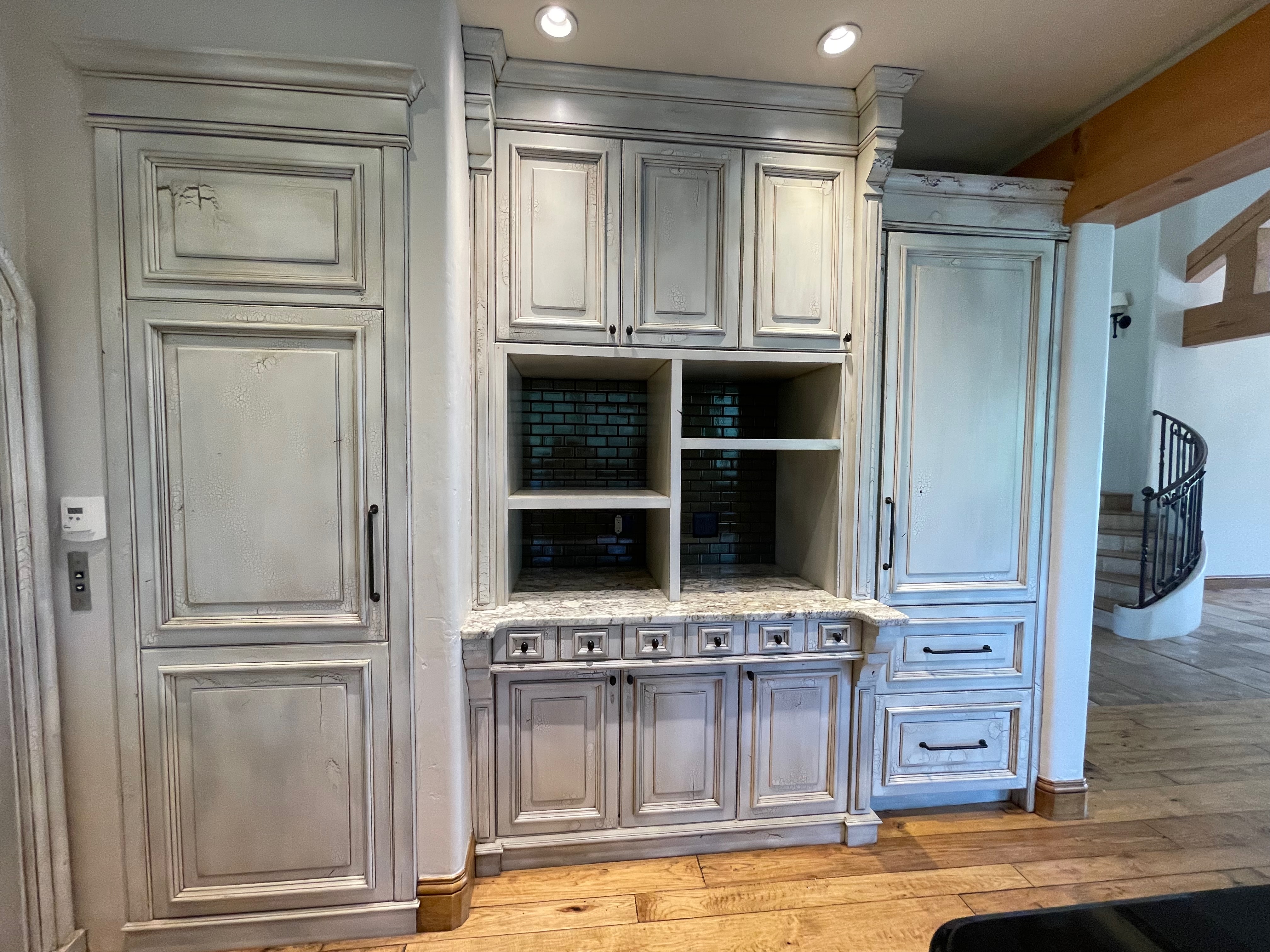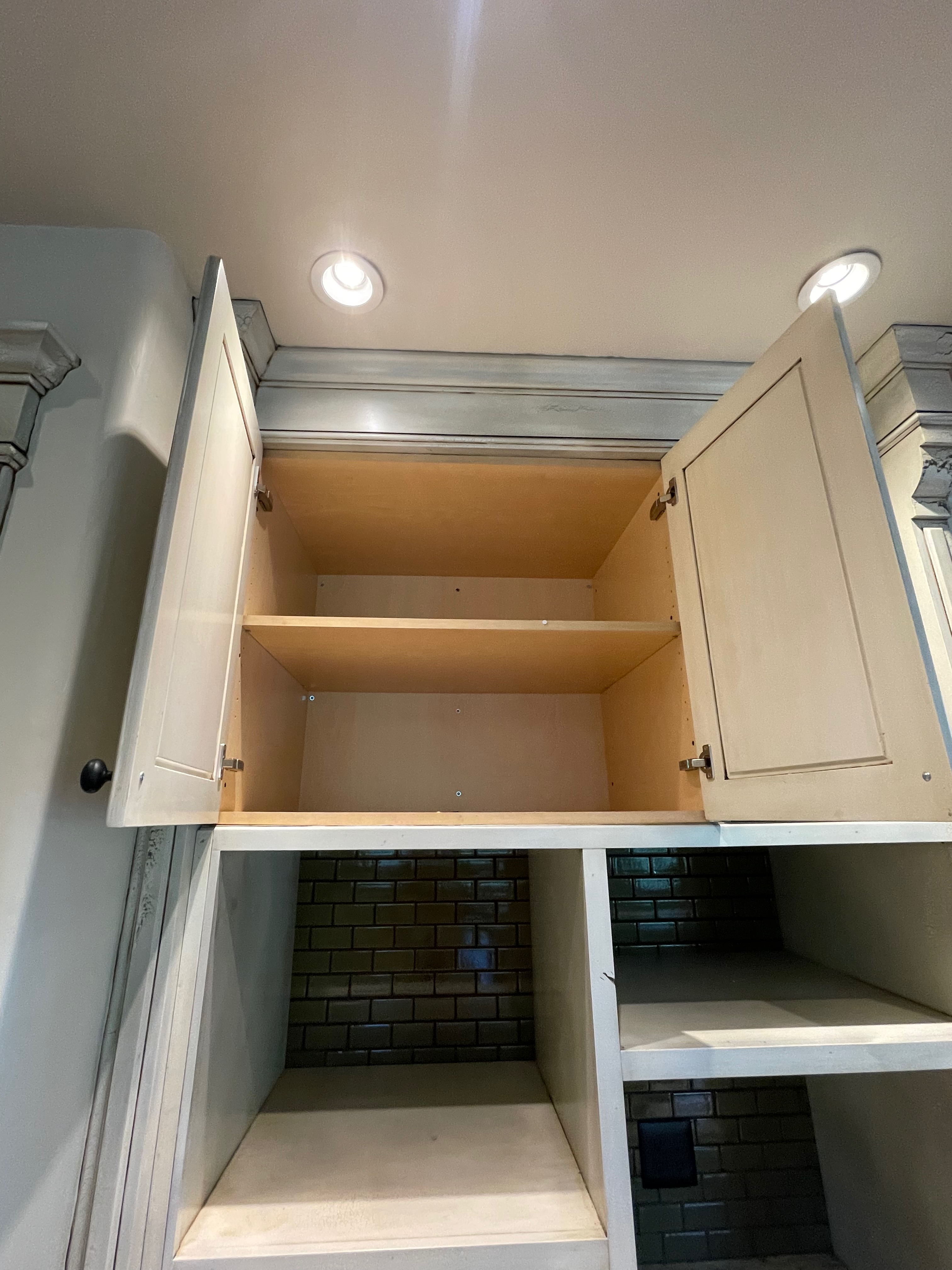 1-Two door wall cabinet on the refrigerator wall Dim.:34“w x 28 1/4“h/36”h w/crown x 24“d