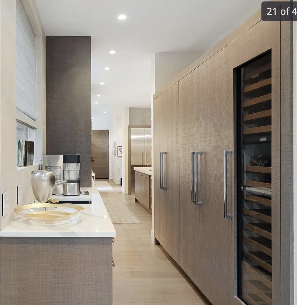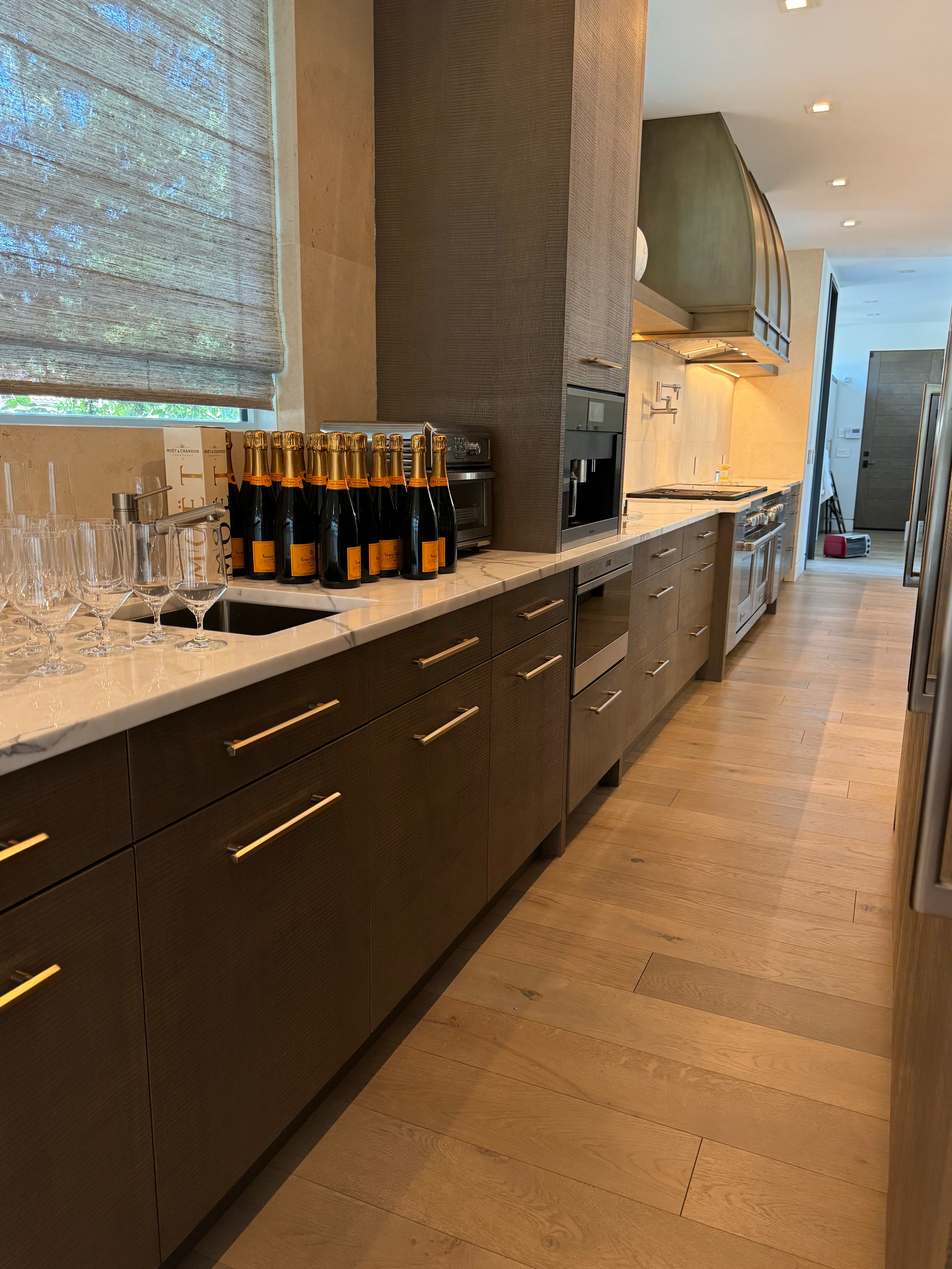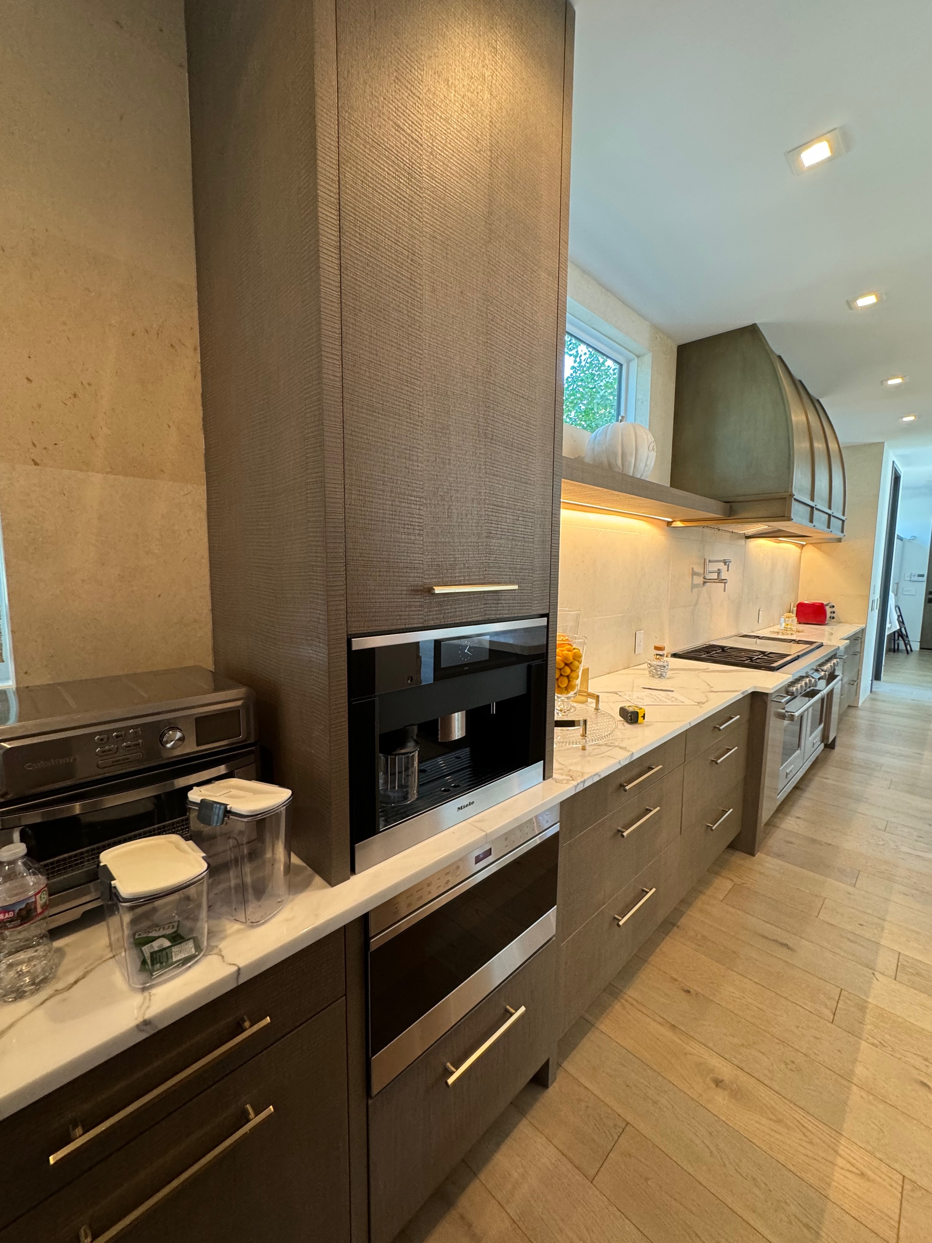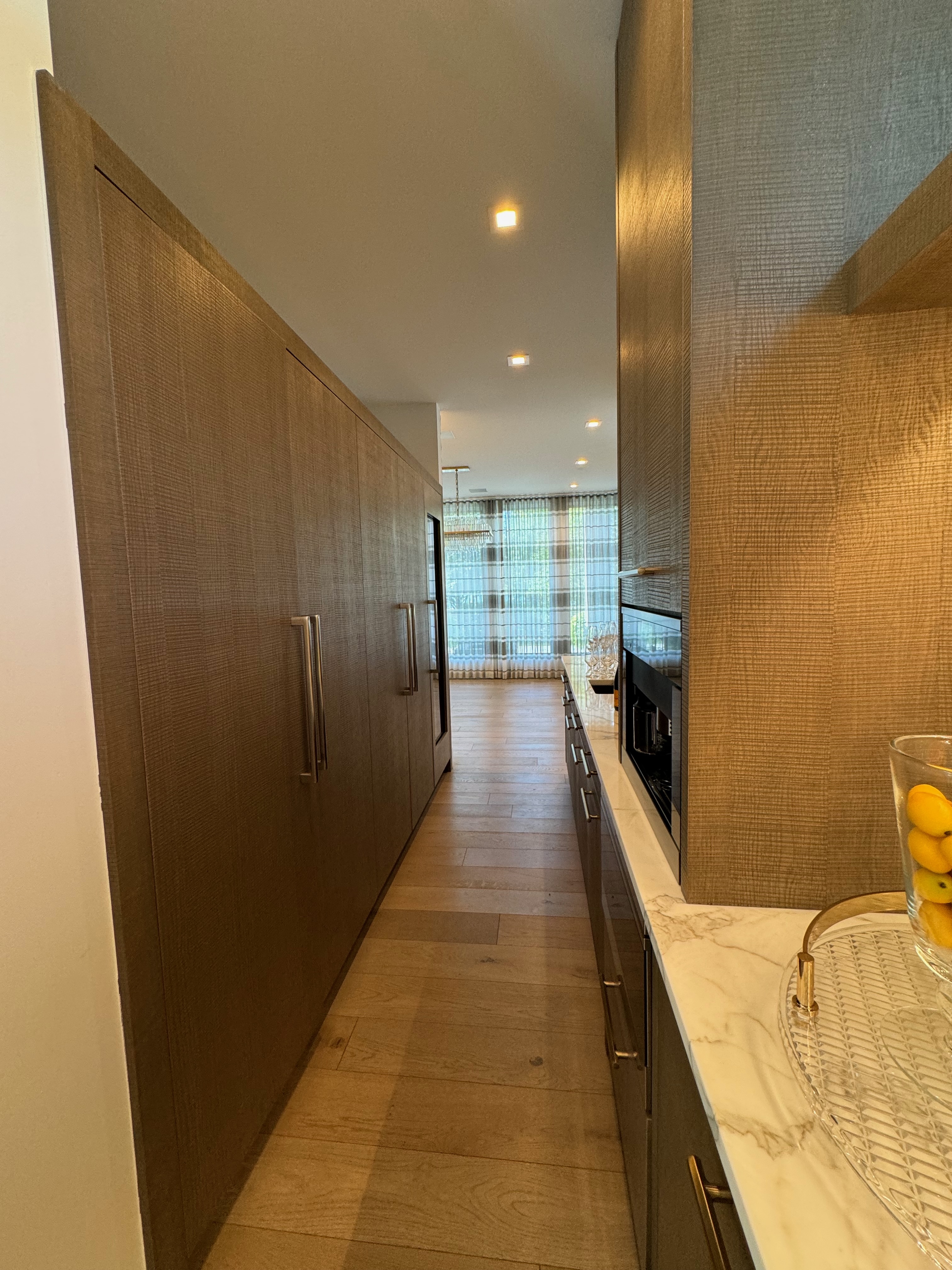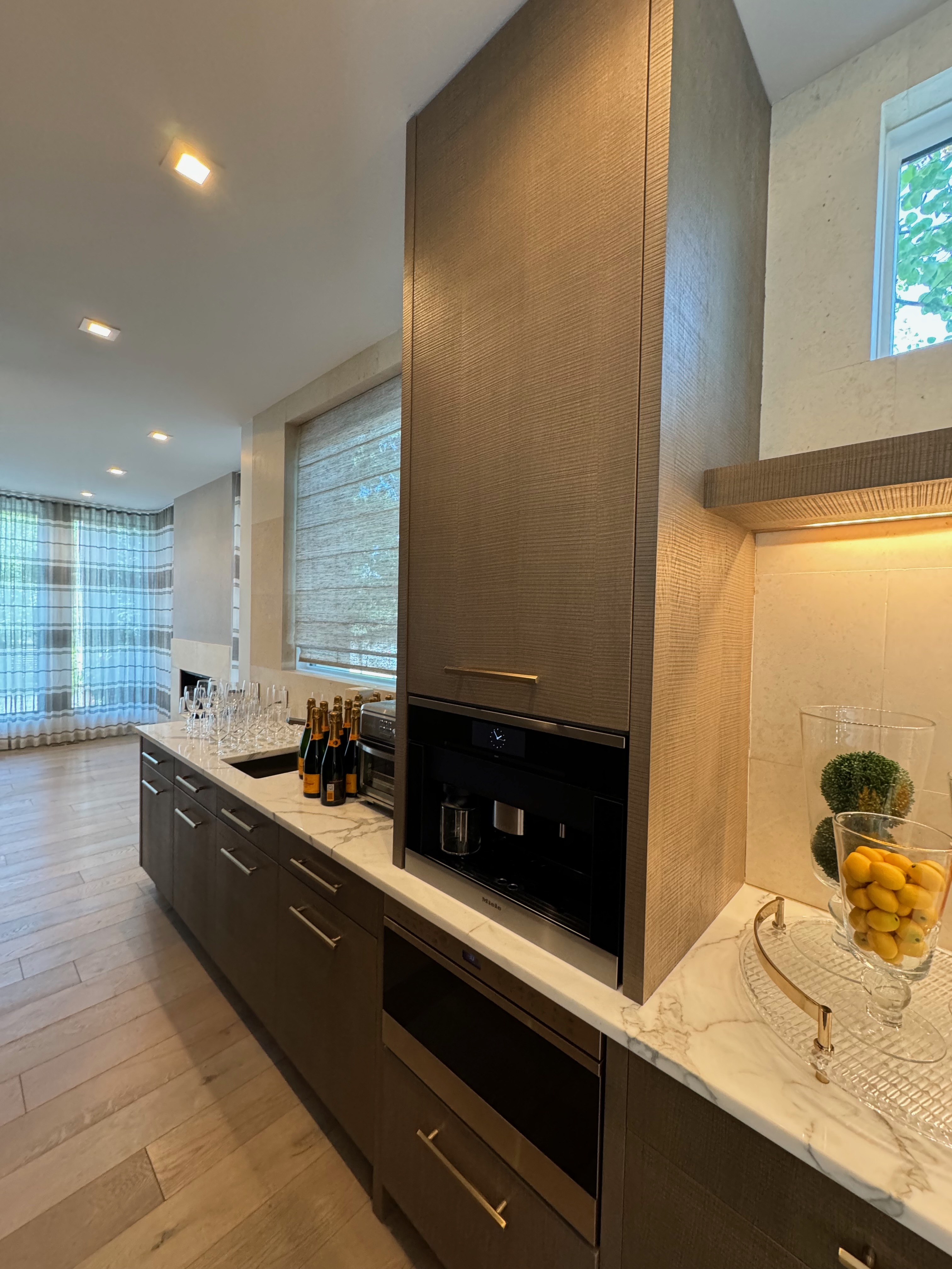 Stunning! Very high-end William Ohs Kitchen cabinetry in a vertical grain re-sawn white oak veneer with a custom brown with flat sheen finish with raking. Like new, Only 6 years old! The drawers are dovetail, soft-close with full extension and Emtek door/ drawer Hex pulls. The Kitchen package includes a 48” Wolf Stainless Steel dual fuel range, Sub-Zero Refrigerator and Freezer columns + other appliances. The kitchen has gorgeous marble countertops with a marble waterfall island as a focal point along with a stunning one of a kind custom made William Ohs glass door and leather wrapped bar! The kitchen also comes with tall pantry cabinets and a matching desk. The kitchen package has been carefully removed by licensed contractors and moved to storage. Drawings can be emailed. Price for the package below.