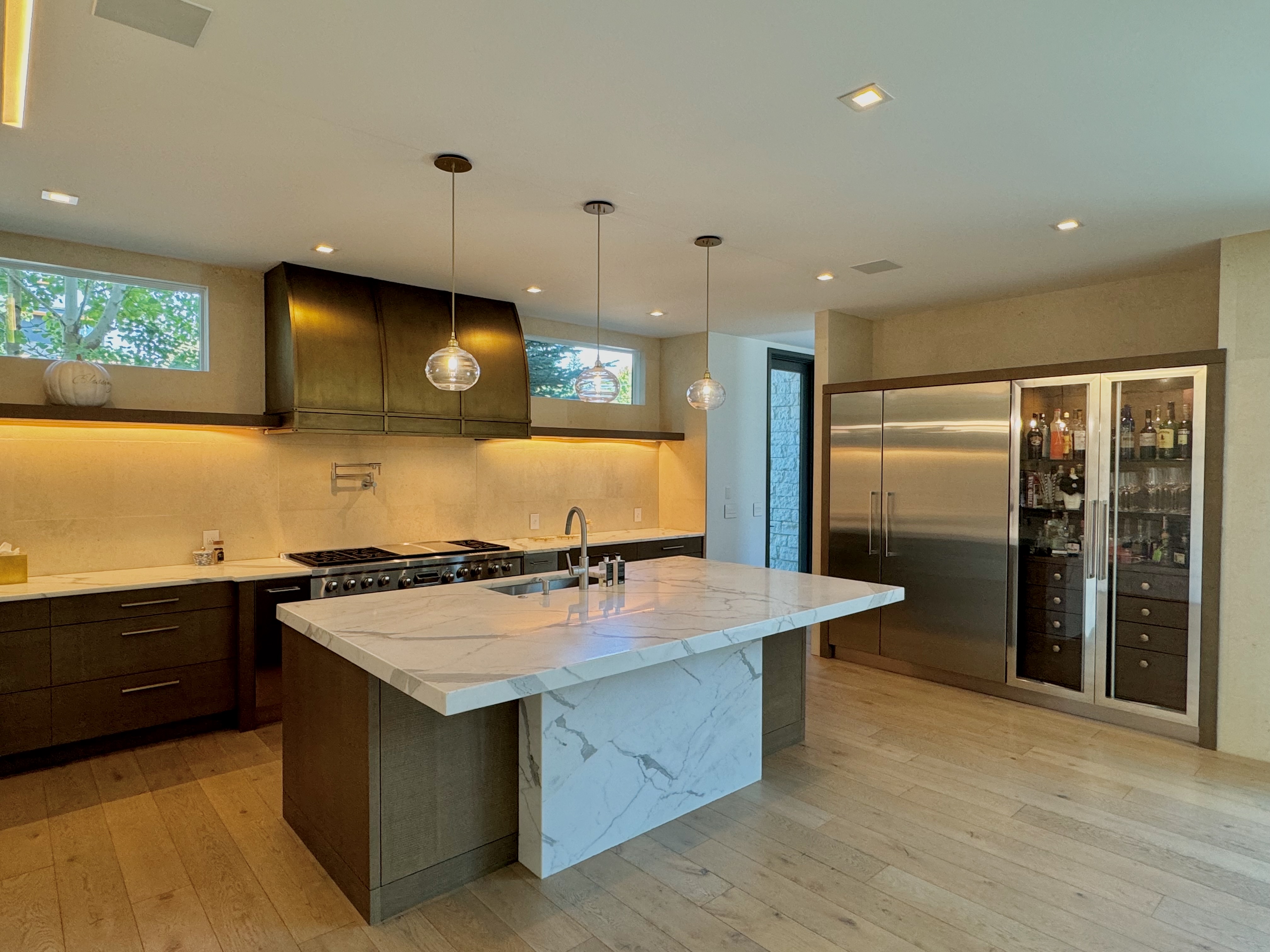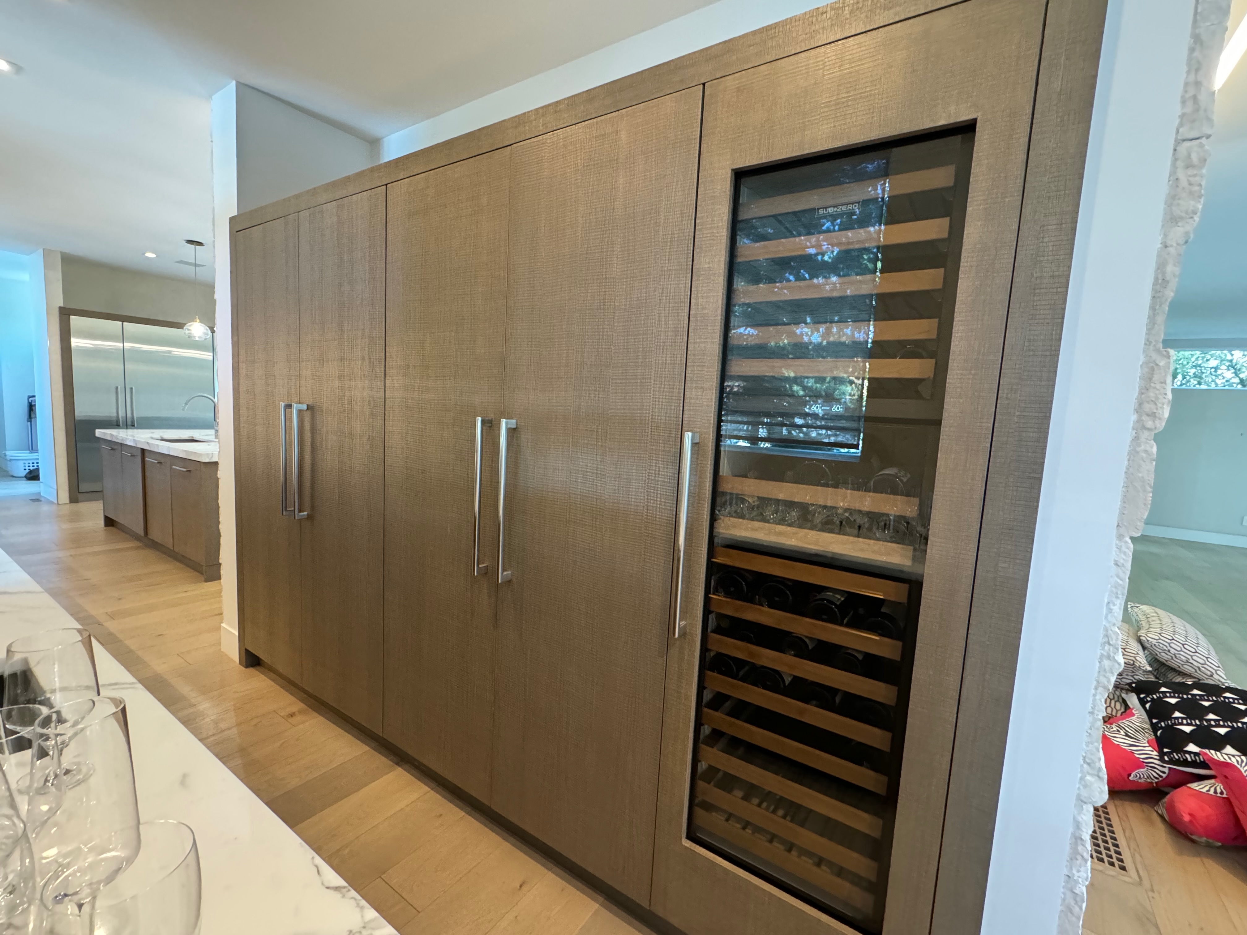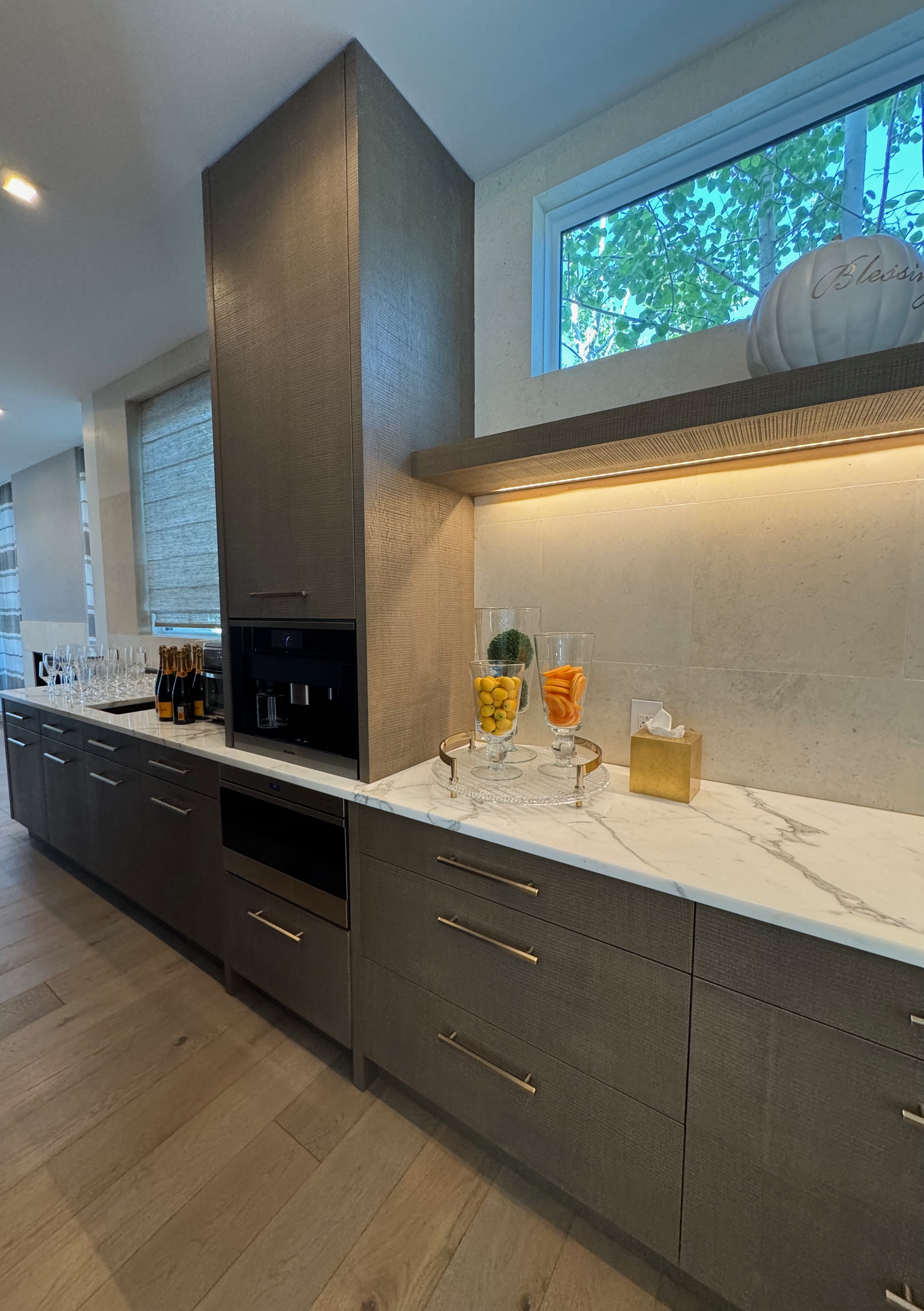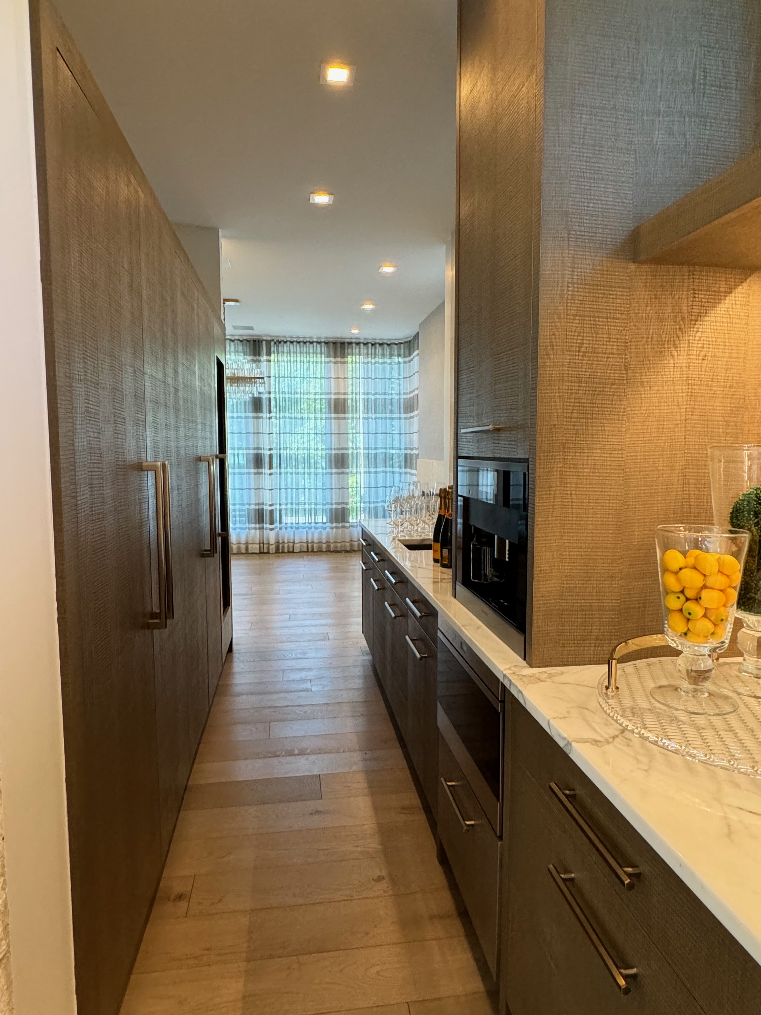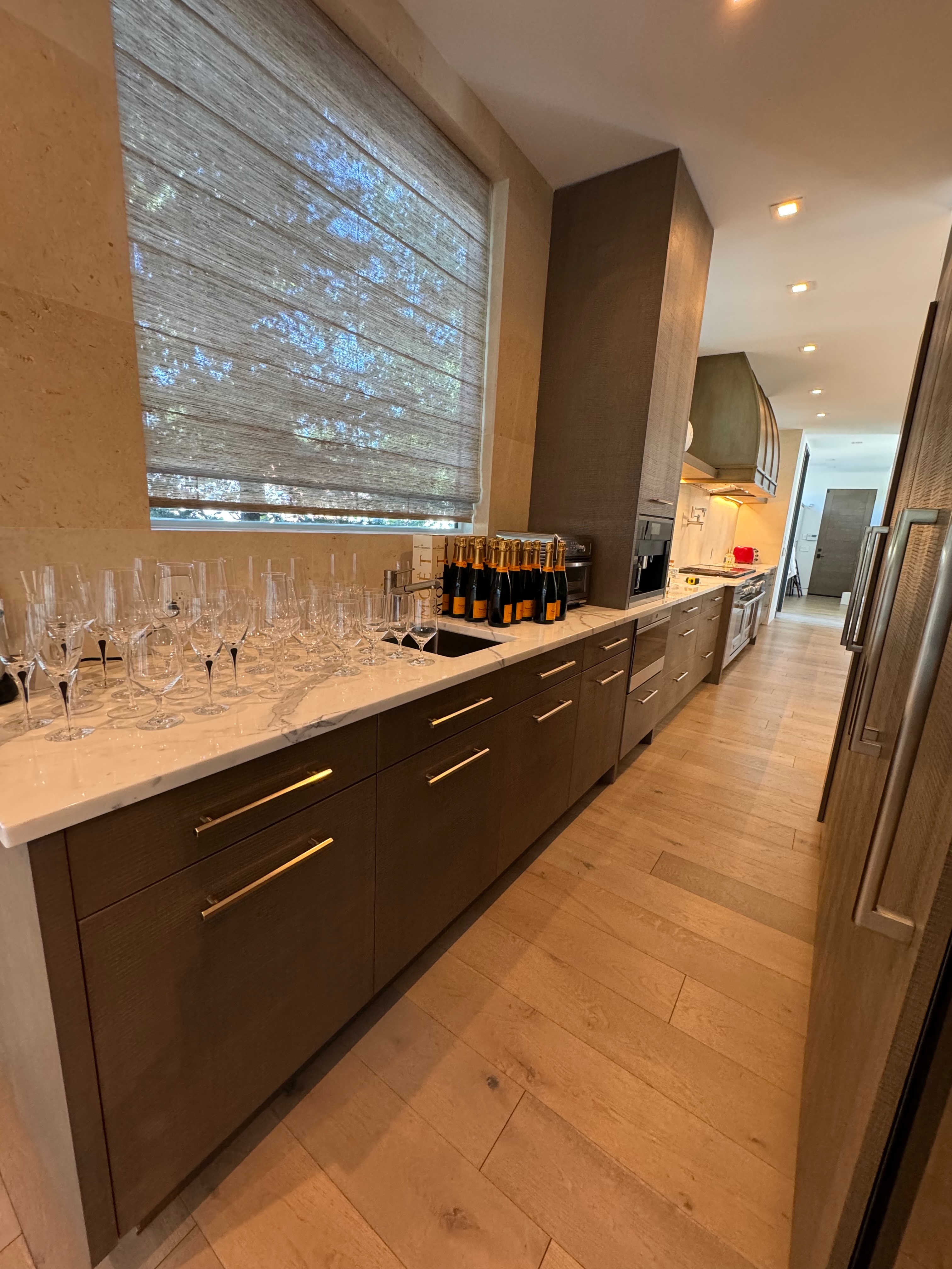 Stunning! Very high-end William Ohs Kitchen cabinetry in a vertical grain re-sawn white oak veneer with a custom brown with flat sheen finish with raking. Like new, Only 6 years old! The drawers are dovetail, soft-close with full extension and Emtek door/ drawer Hex pulls. The Kitchen package includes a 48” Wolf Stainless Steel dual fuel range, Sub-Zero Refrigerator and Freezer columns + other appliances. The kitchen has gorgeous marble countertops with a marble waterfall island as a focal point along with a stunning one of a kind custom made William Ohs glass door and leather wrapped bar! The kitchen also comes with tall pantry cabinets and a matching desk. The kitchen package has been carefully removed by licensed contractors and moved to storage. Drawings can be emailed. Price for the package below.