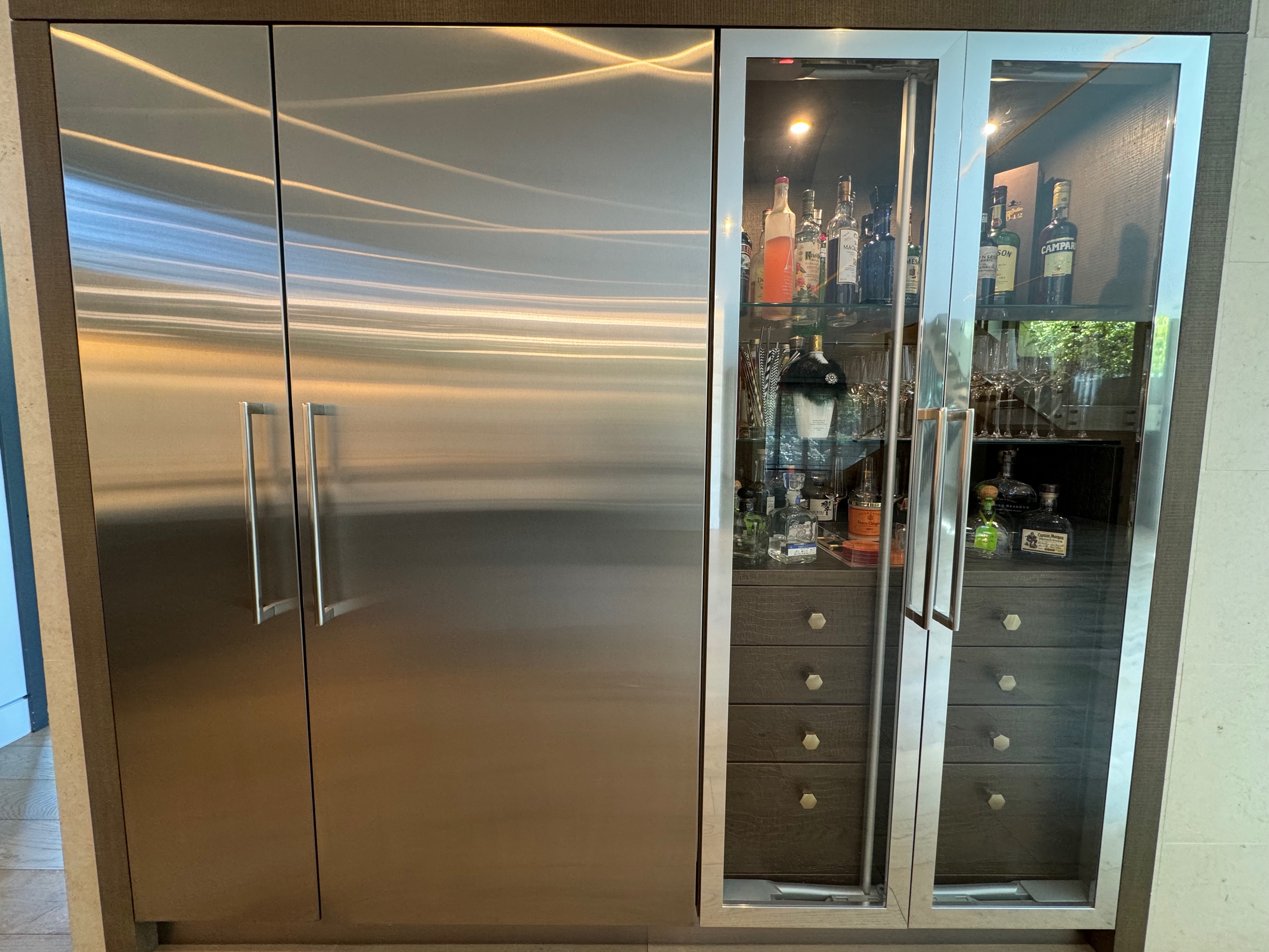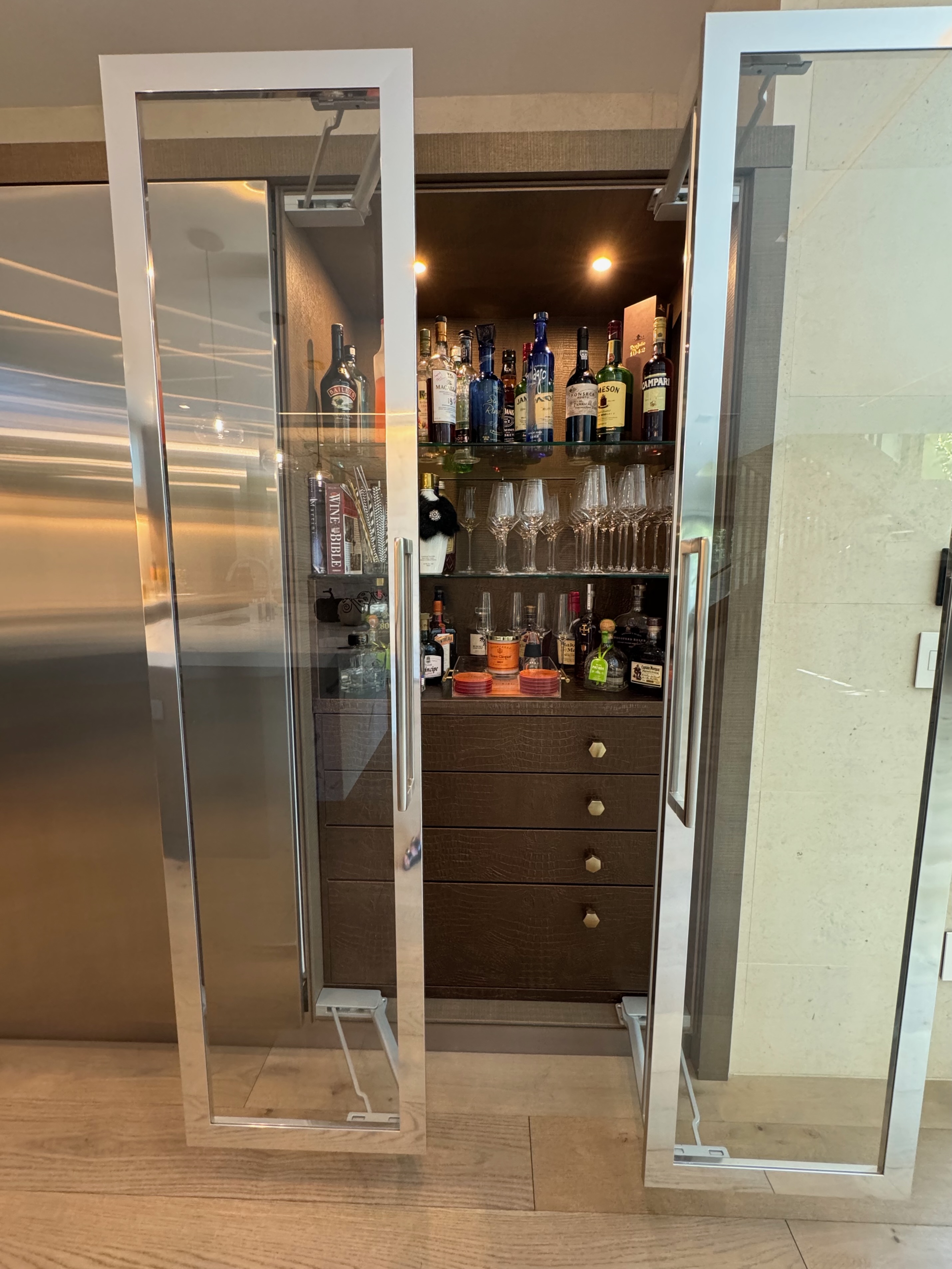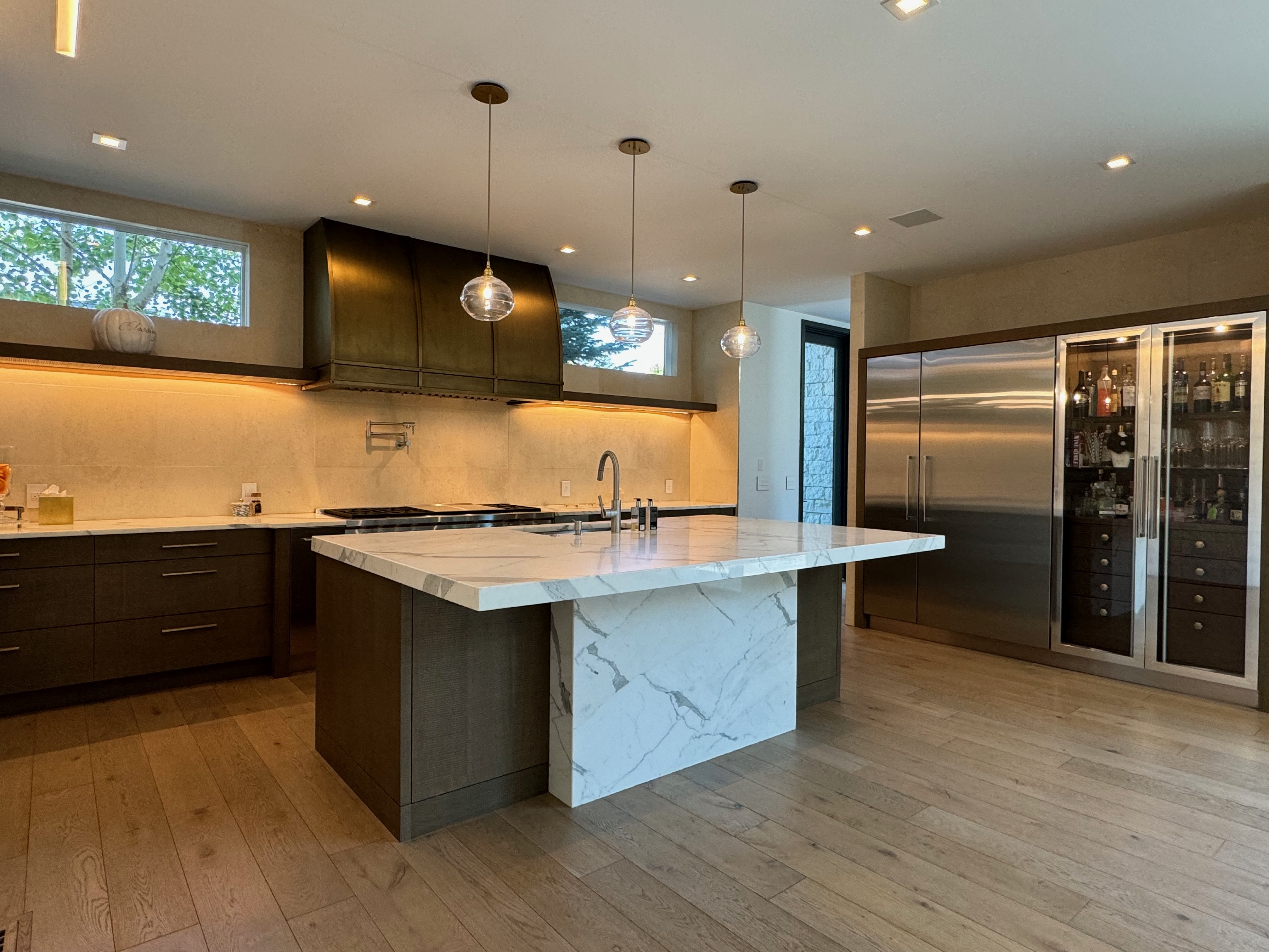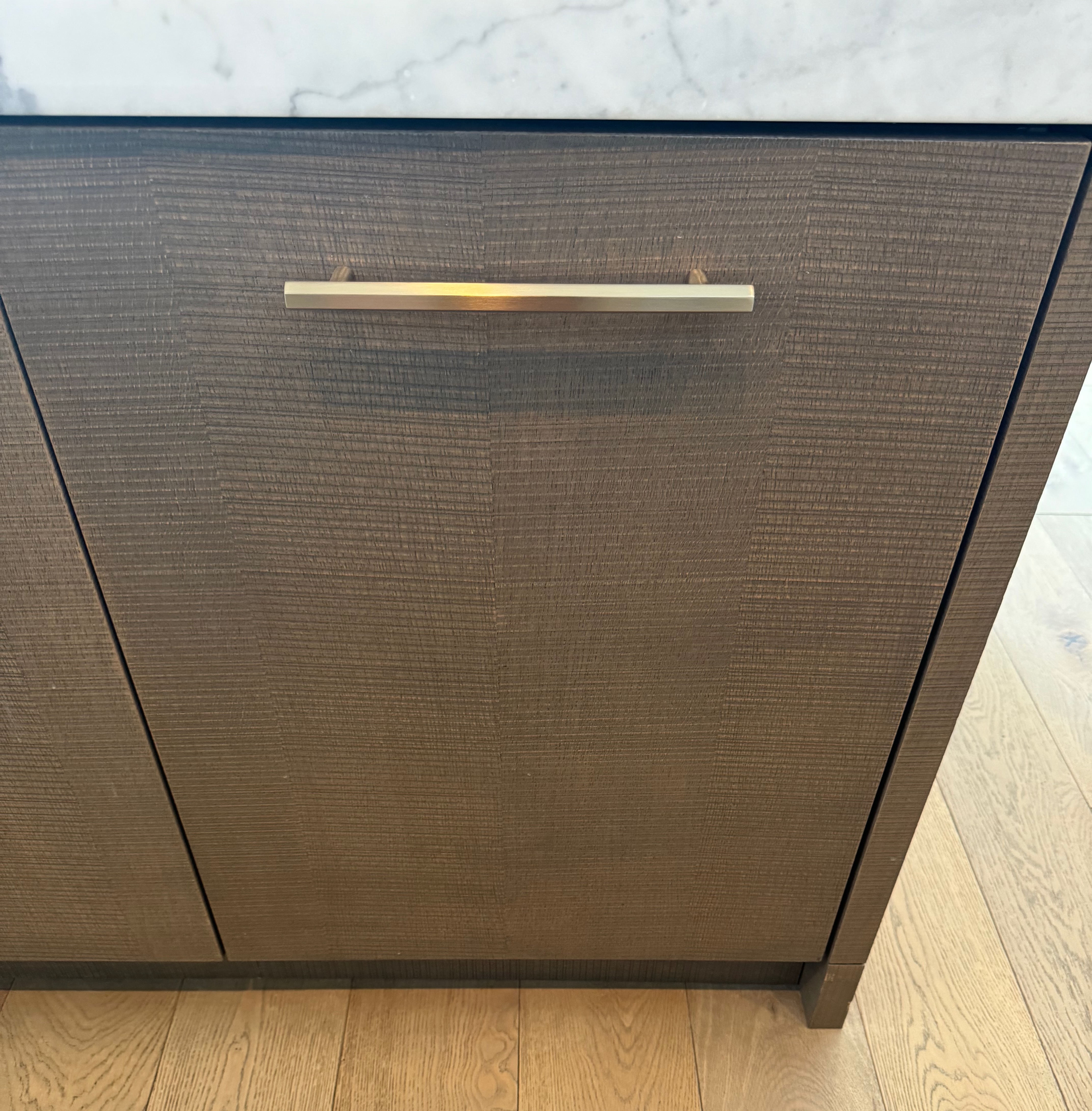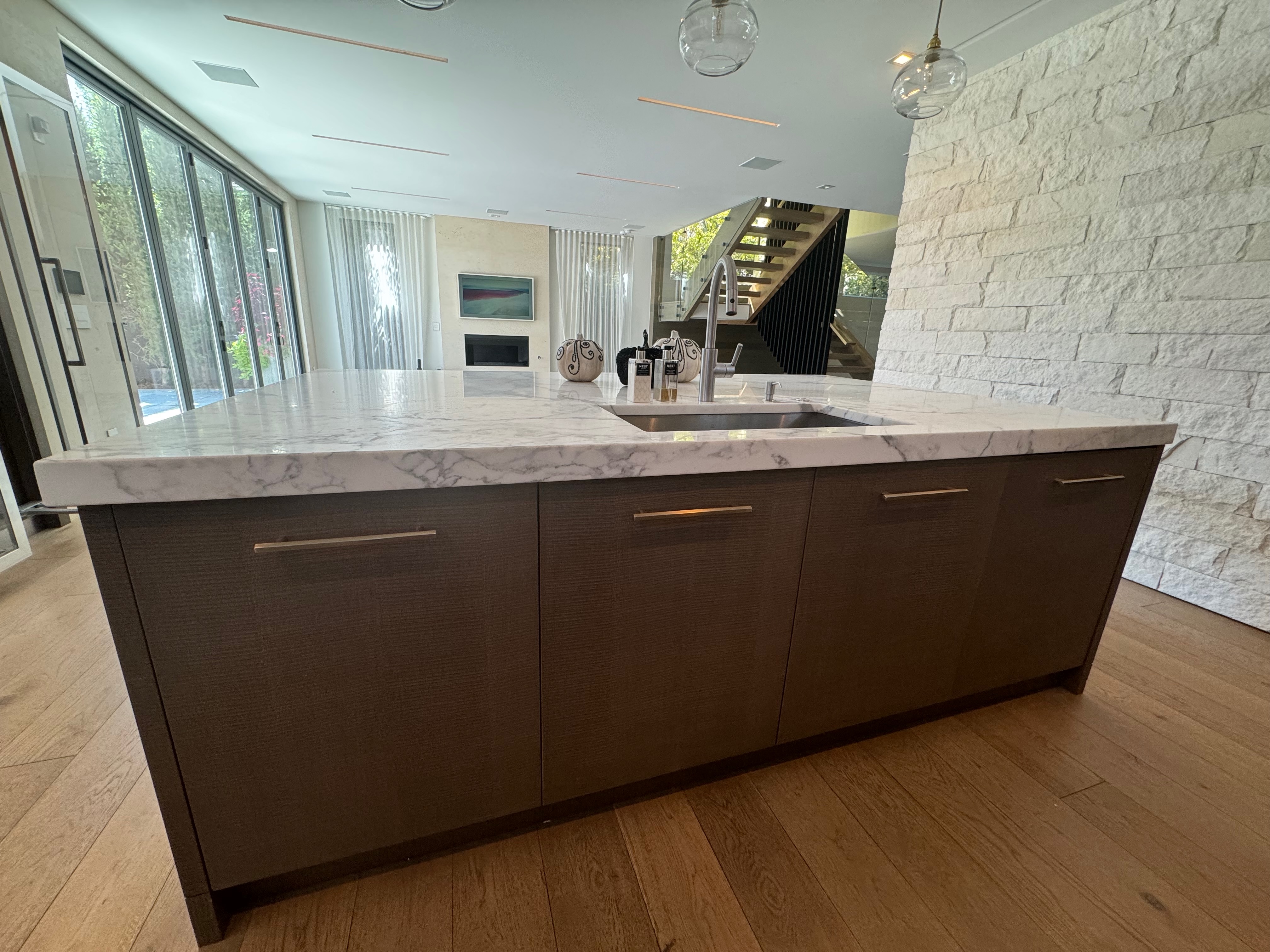 Stunning! Very high-end William Ohs Kitchen cabinetry in a vertical grain re-sawn white oak veneer with a custom brown with flat sheen finish with raking. Like new, Only 6 years old! The drawers are dovetail, soft-close with full extension and Emtek door/ drawer Hex pulls. The Kitchen package includes a 48” Wolf Stainless Steel dual fuel range, Sub-Zero Refrigerator and Freezer columns + other appliances. The kitchen has gorgeous marble countertops with a marble waterfall island as a focal point along with a stunning one of a kind custom made William Ohs glass door and leather wrapped bar! The kitchen also comes with tall pantry cabinets and a matching desk. The kitchen package has been carefully removed by licensed contractors and moved to storage. Drawings can be emailed. Price for the package below.