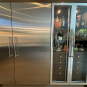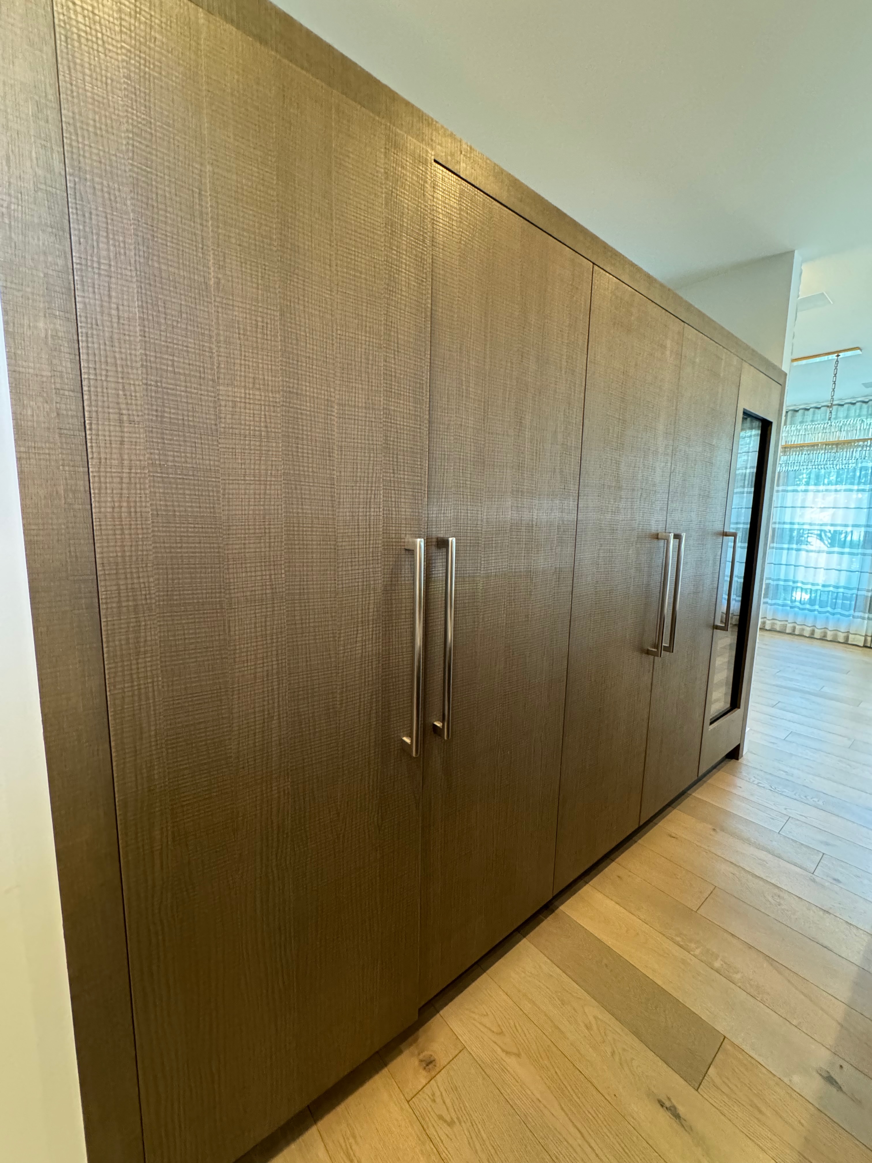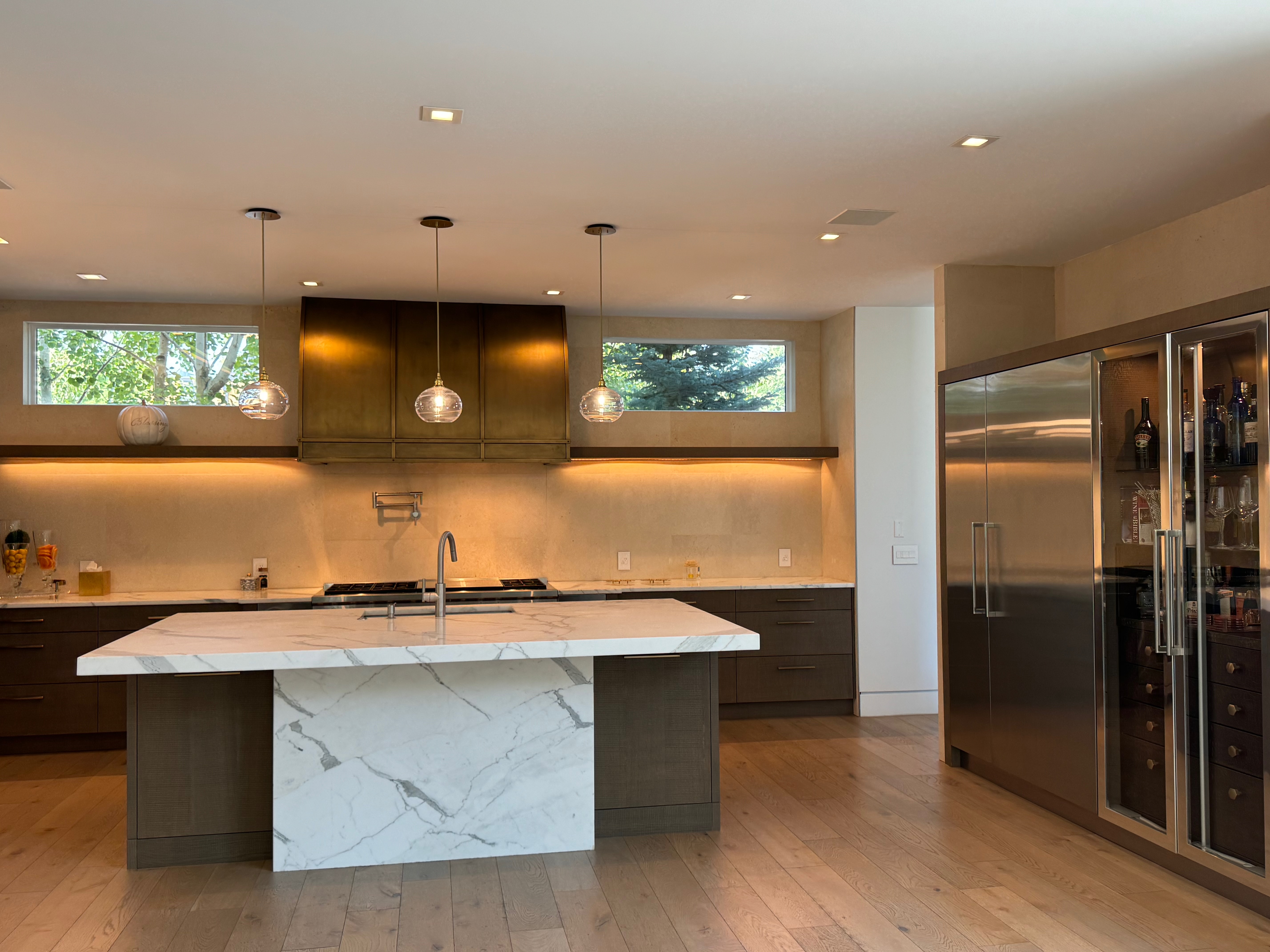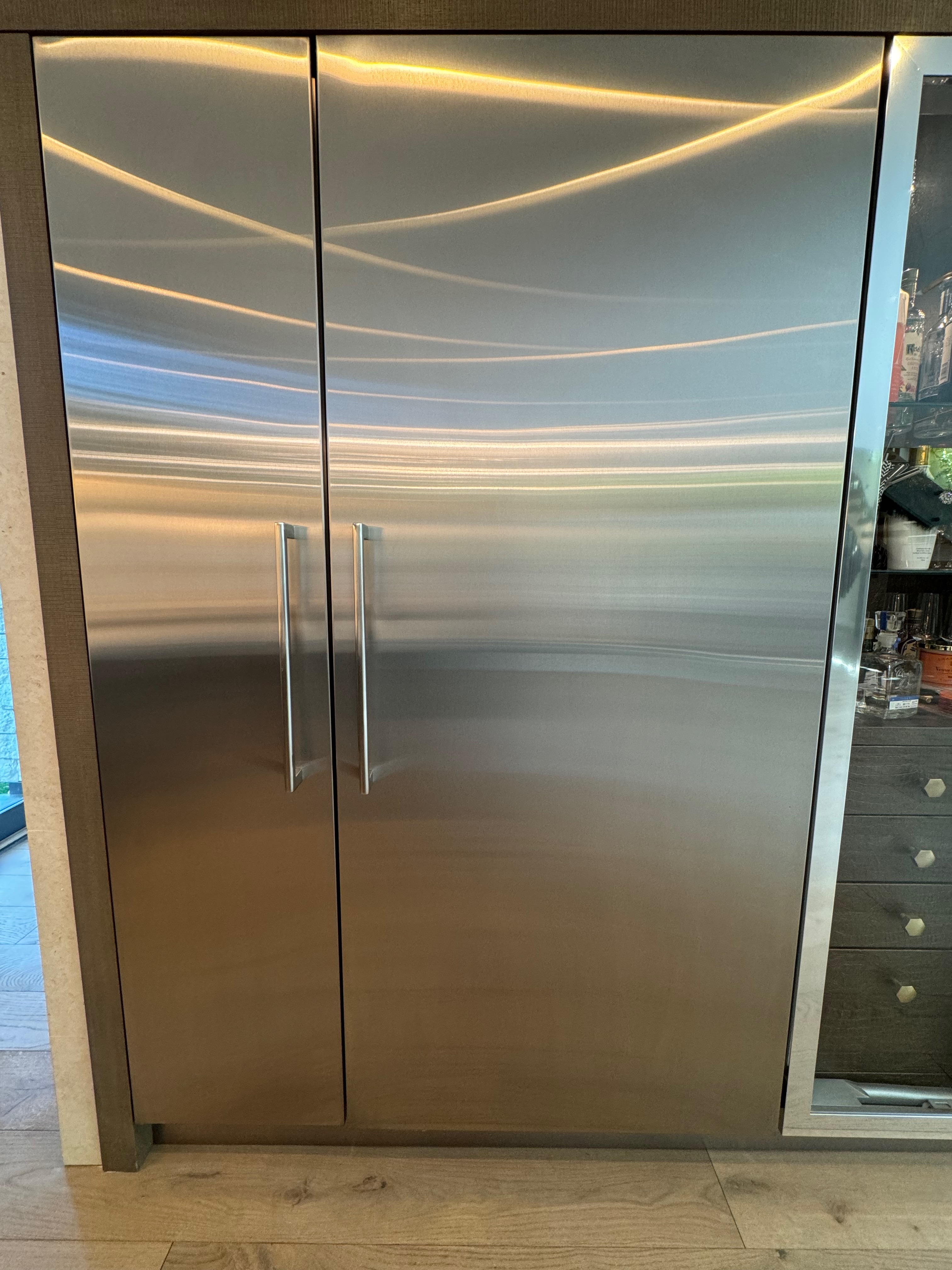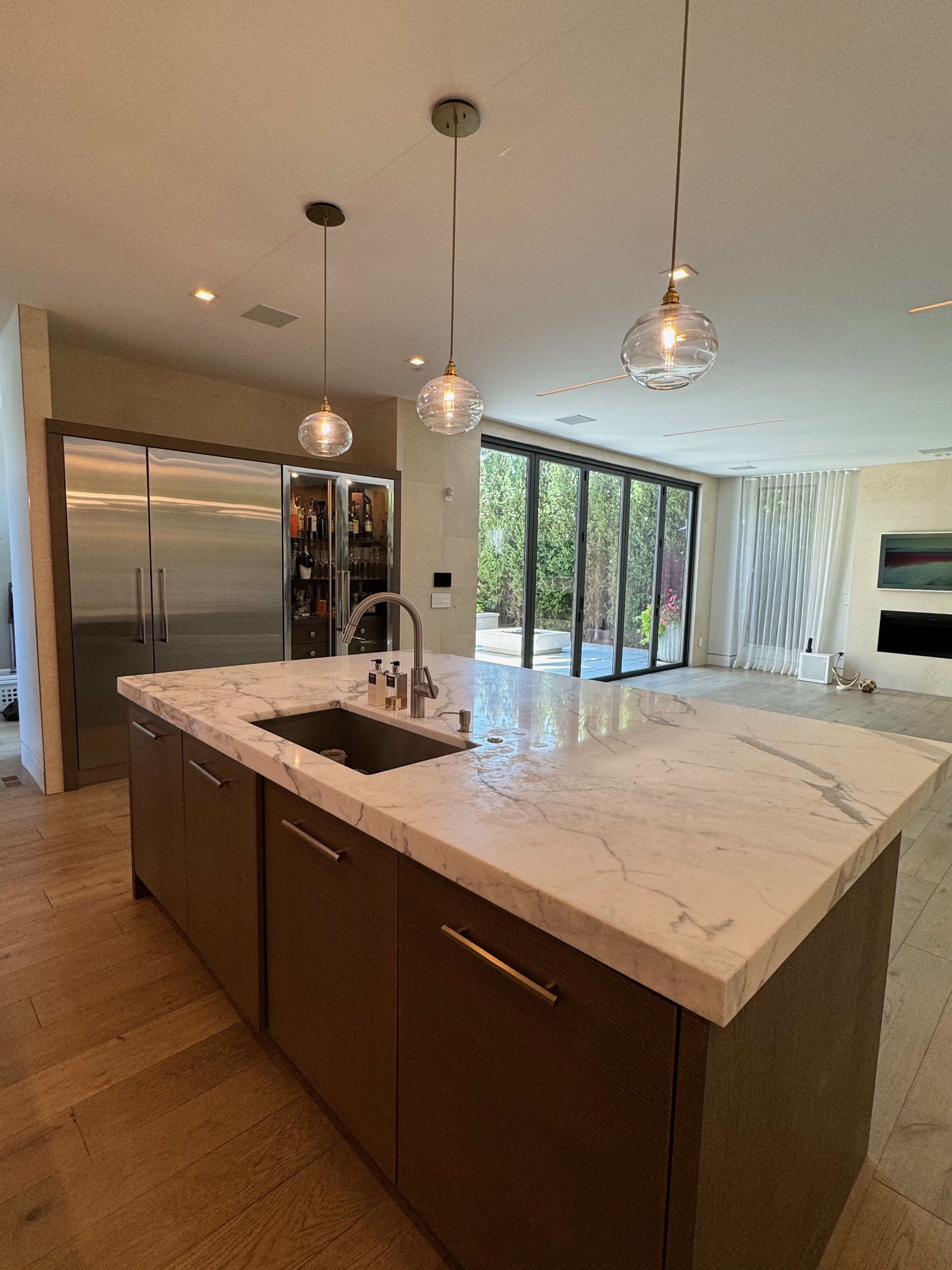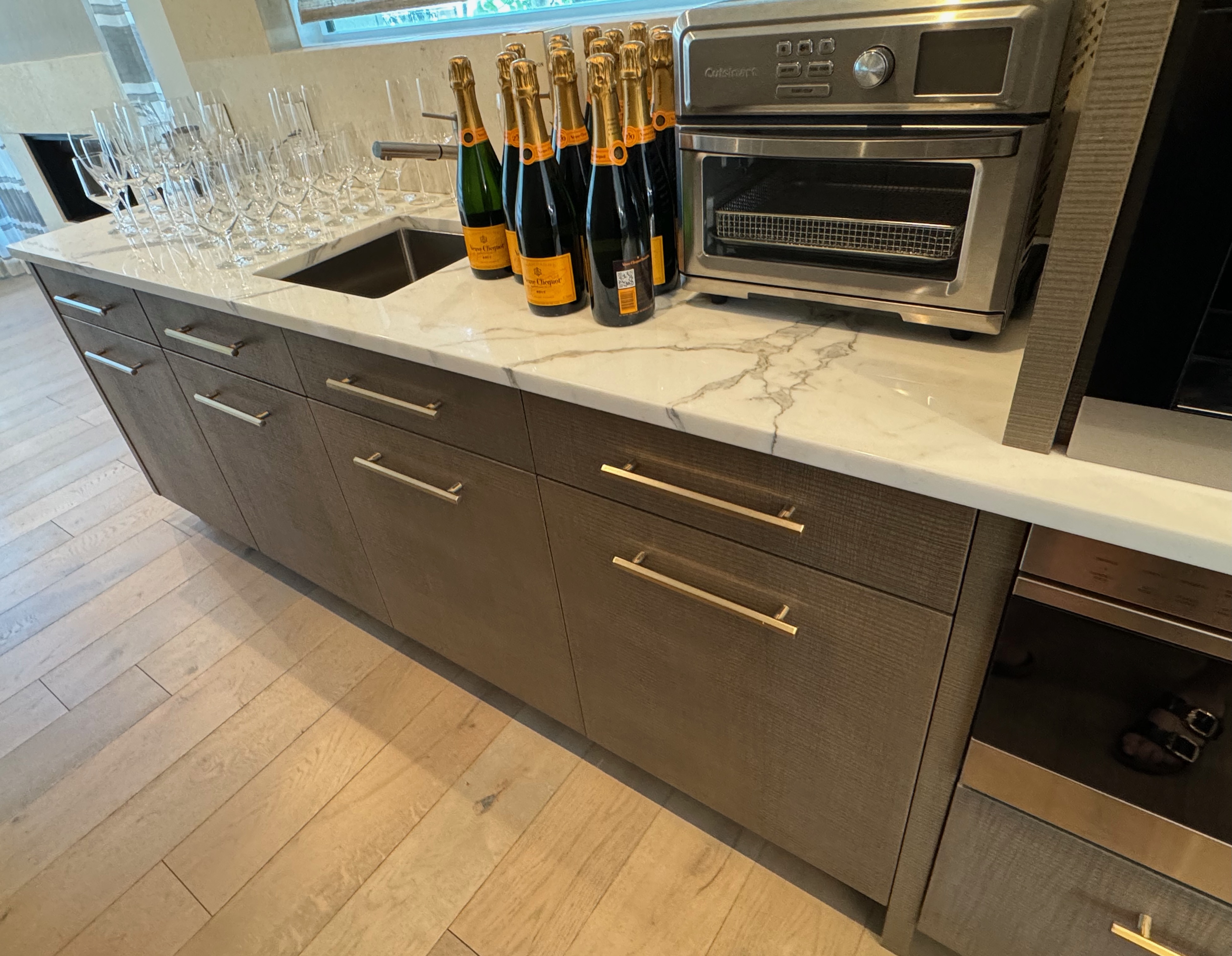 Stunning! Very high-end William Ohs Kitchen cabinetry in a vertical grain re-sawn white oak veneer with a custom brown with flat sheen finish with raking. Like new, Only 6 years old! The drawers are dovetail, soft-close with full extension and Emtek door/ drawer Hex pulls. The Kitchen package includes a 48” Wolf Stainless Steel dual fuel range, Sub-Zero Refrigerator and Freezer columns + other appliances. The kitchen has gorgeous marble countertops with a marble waterfall island as a focal point along with a stunning one of a kind custom made William Ohs glass door and leather wrapped bar! The kitchen also comes with tall pantry cabinets and a matching desk. The kitchen package has been carefully removed by licensed contractors and moved to storage. Drawings can be emailed. Price for the package below.