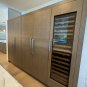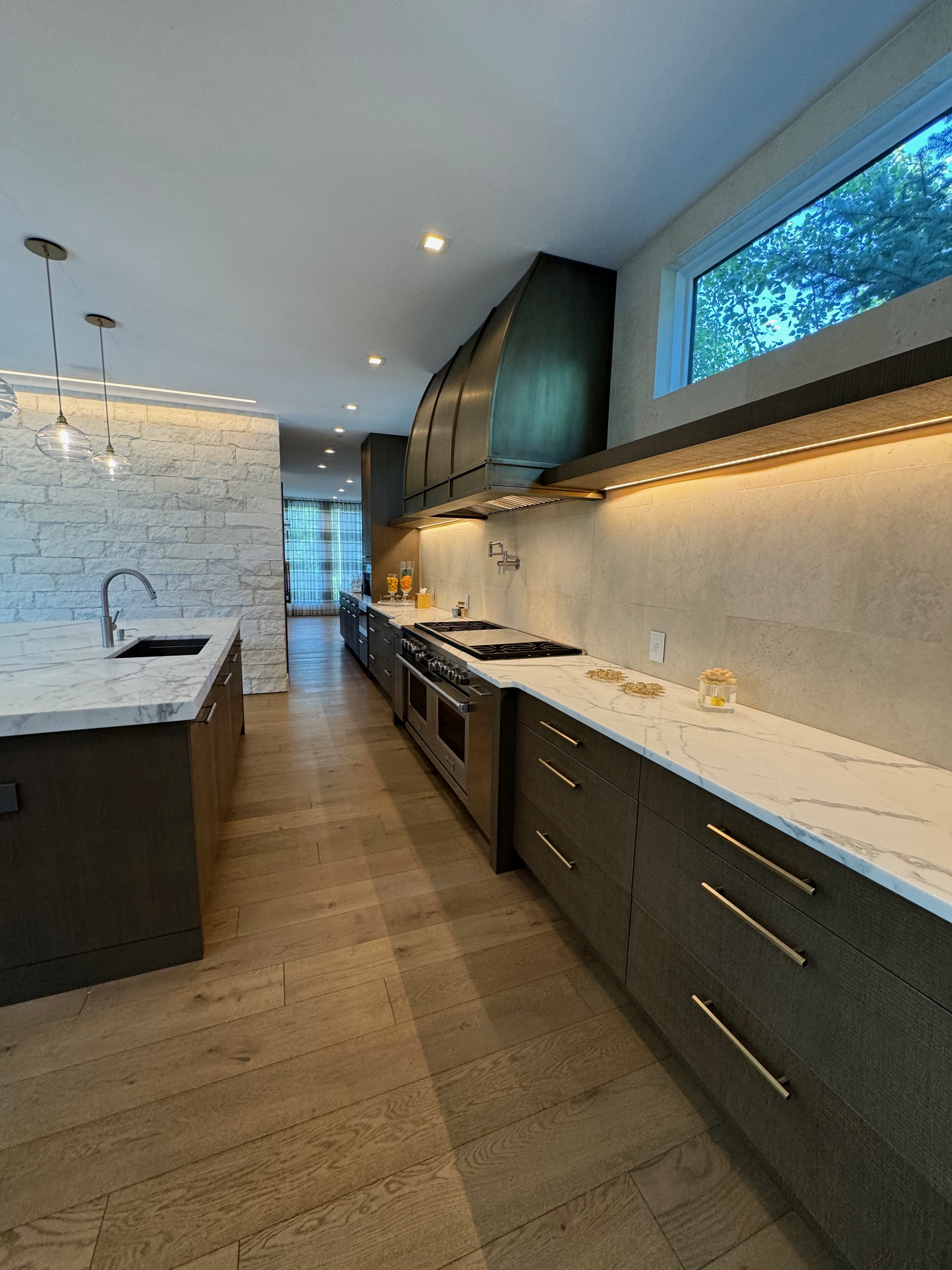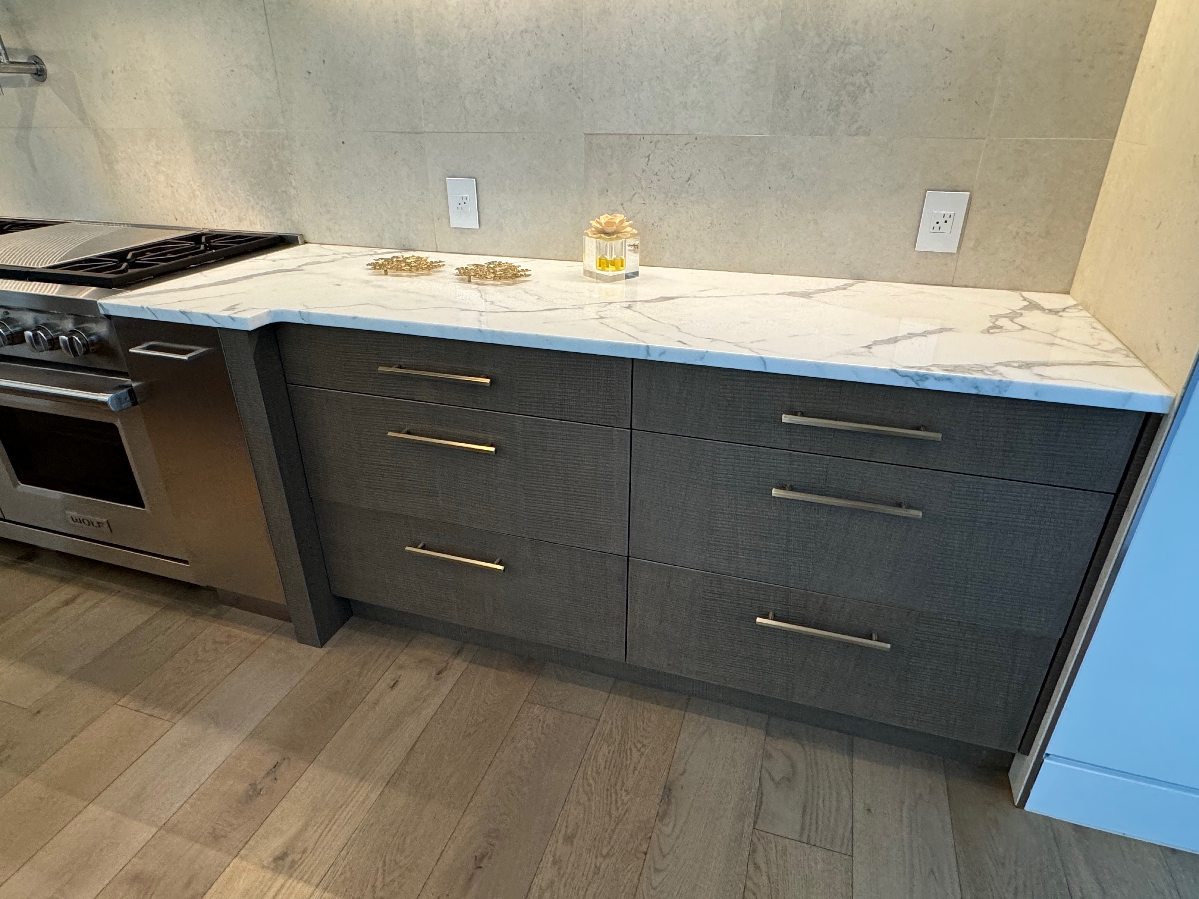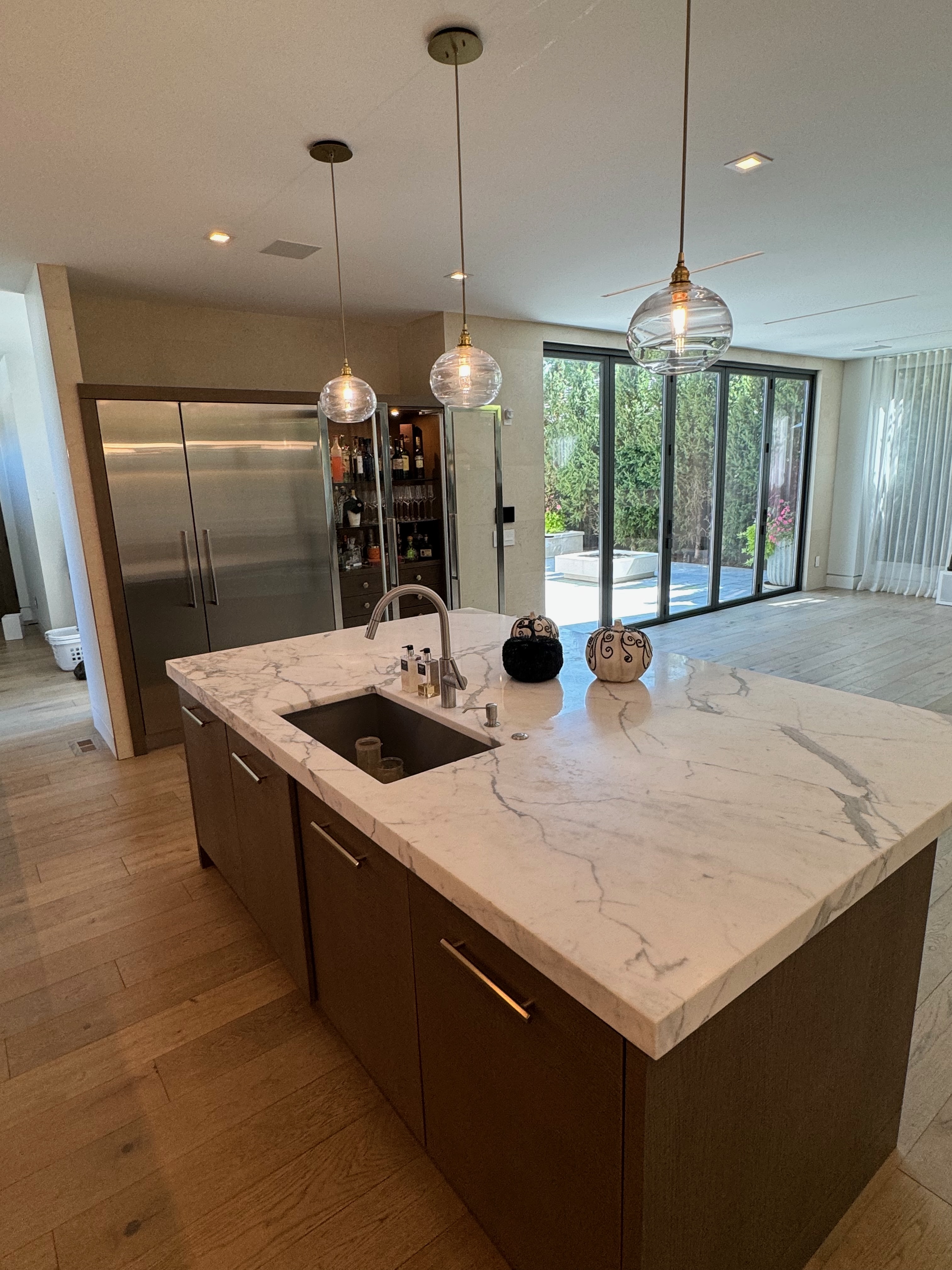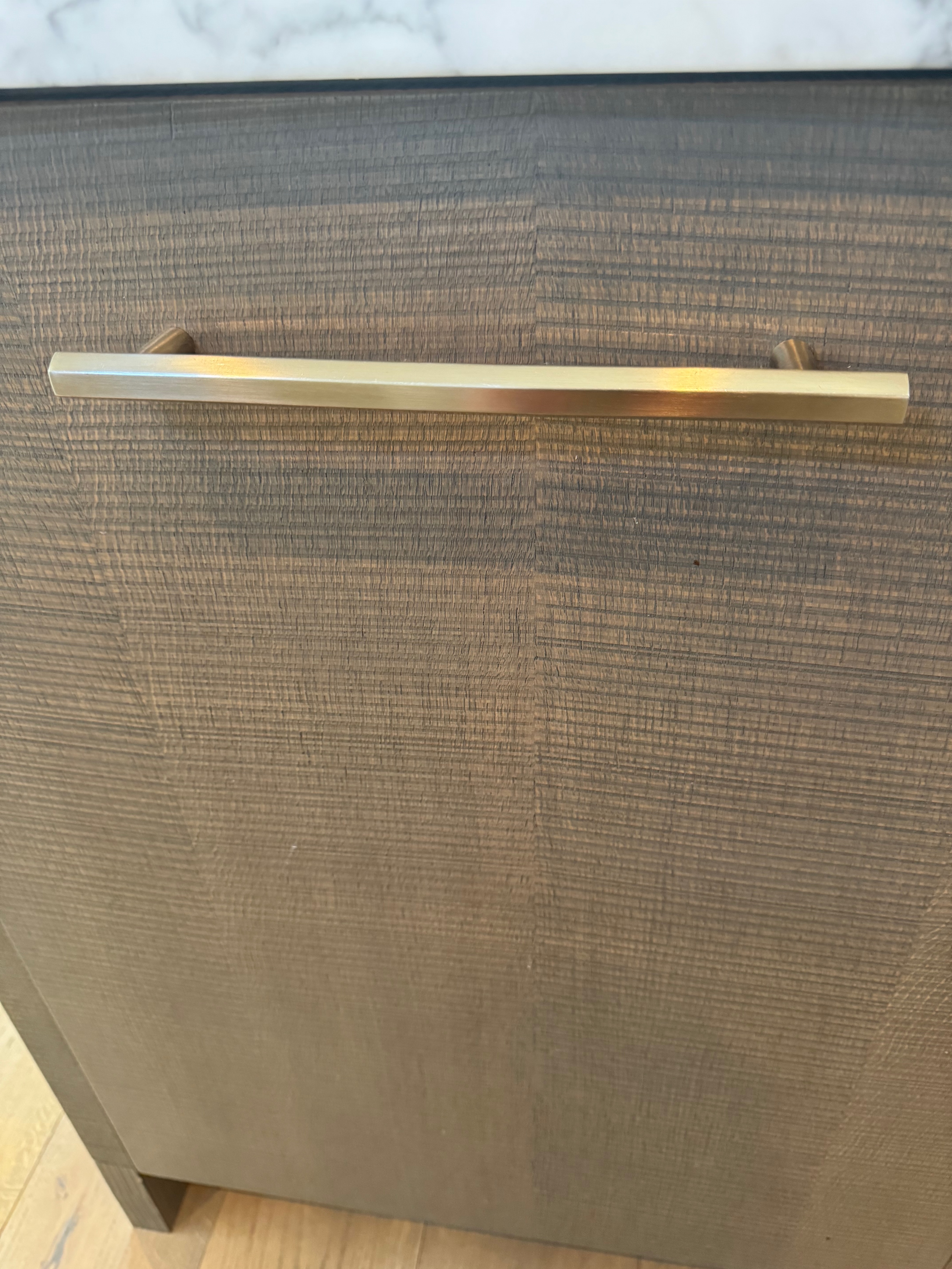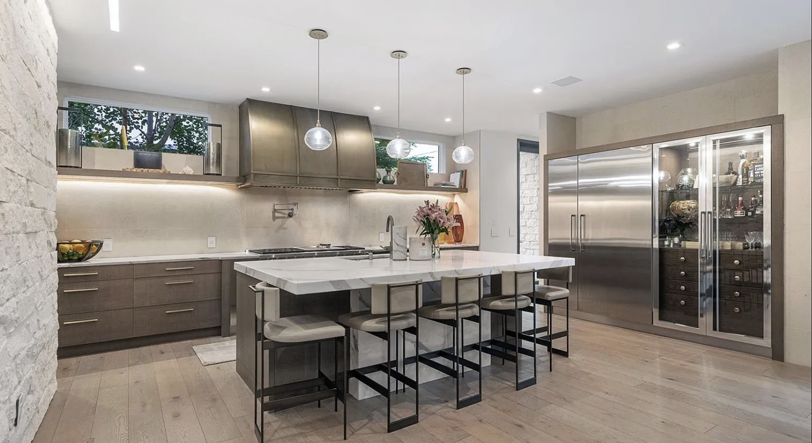 Stunning! Very high-end William Ohs Kitchen cabinetry in a vertical grain re-sawn white oak veneer with a custom brown with flat sheen finish with raking. Like new, Only 6 years old! The drawers are dovetail, soft-close with full extension and Emtek door/ drawer Hex pulls. The Kitchen package includes a 48” Wolf Stainless Steel dual fuel range, Sub-Zero Refrigerator and Freezer columns + other appliances. The kitchen has gorgeous marble countertops with a marble waterfall island as a focal point along with a stunning one of a kind custom made William Ohs glass door and leather wrapped bar! The kitchen also comes with tall pantry cabinets and a matching desk. The kitchen package has been carefully removed by licensed contractors and moved to storage. Drawings can be emailed. Price for the package below.