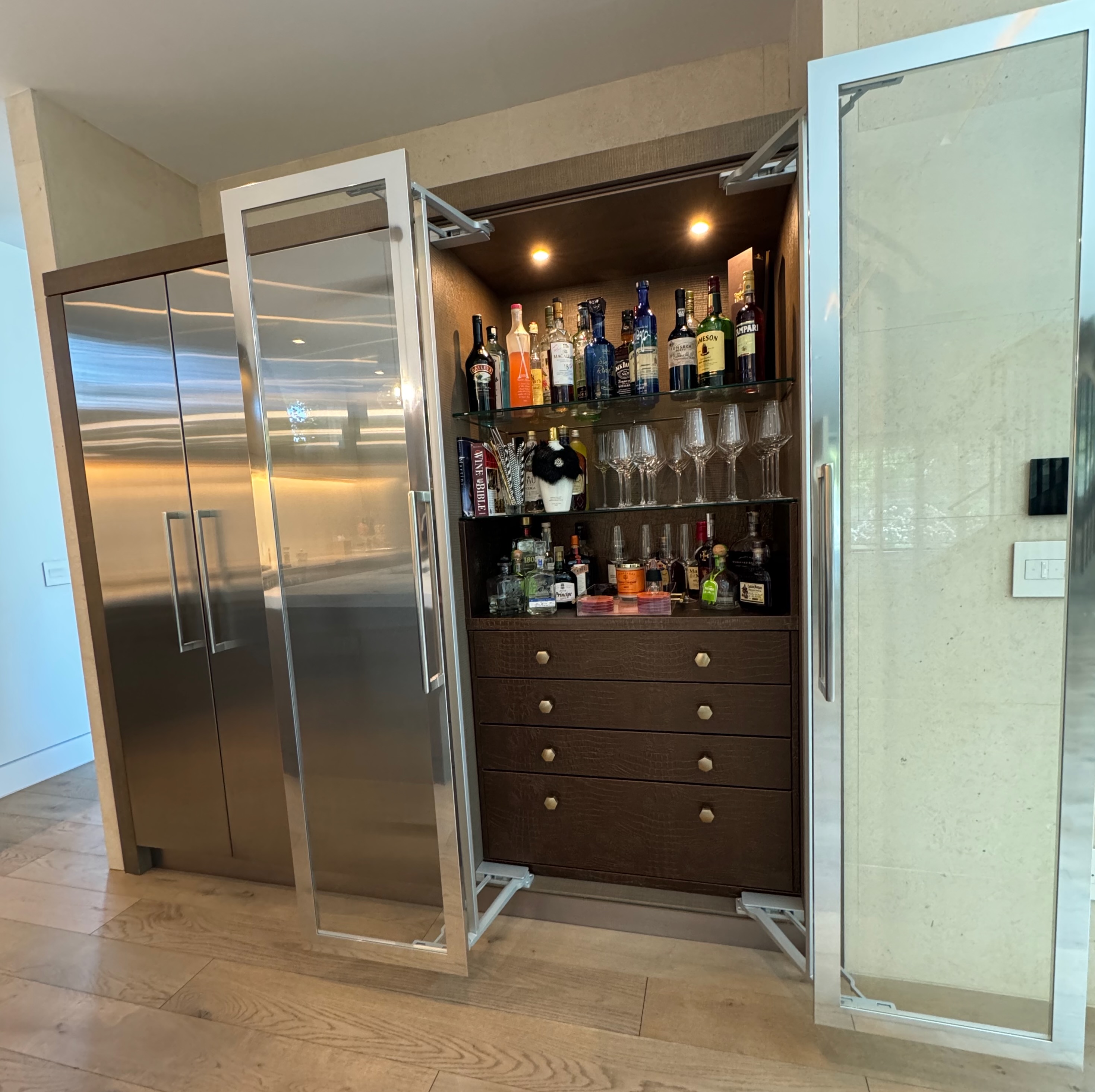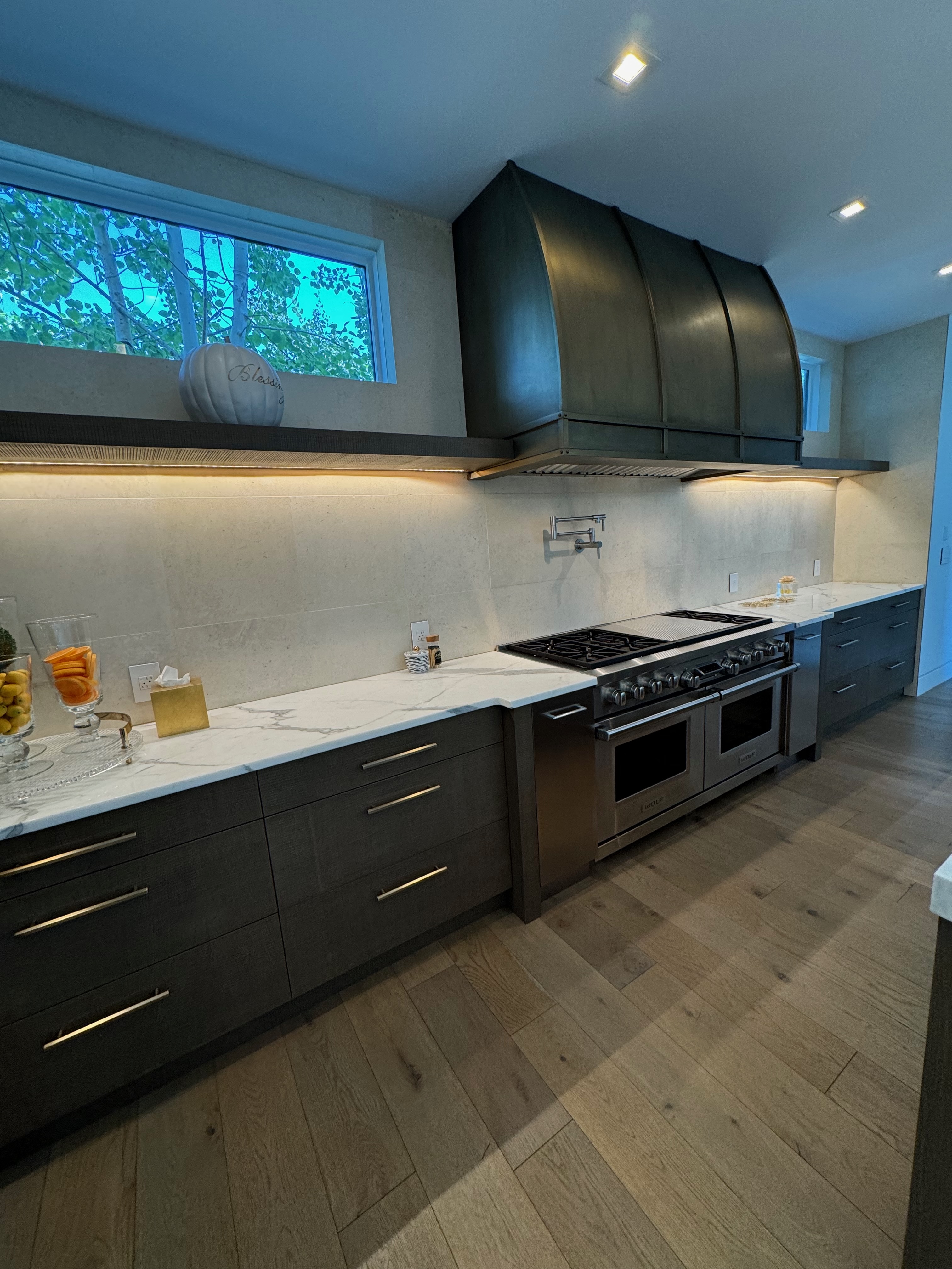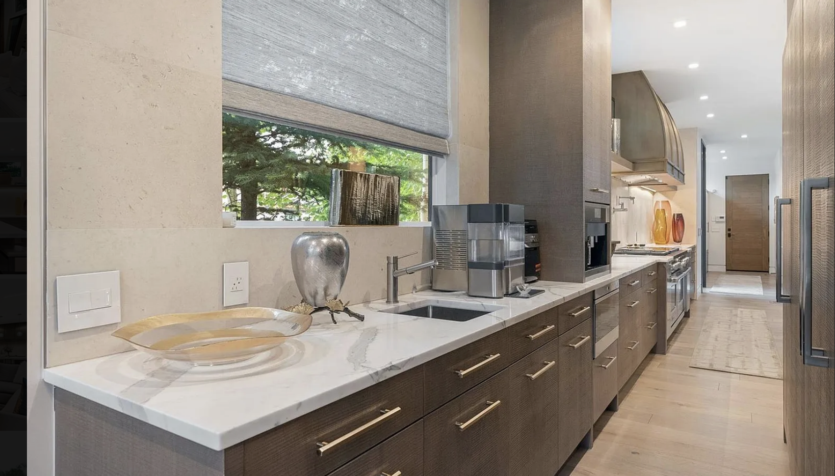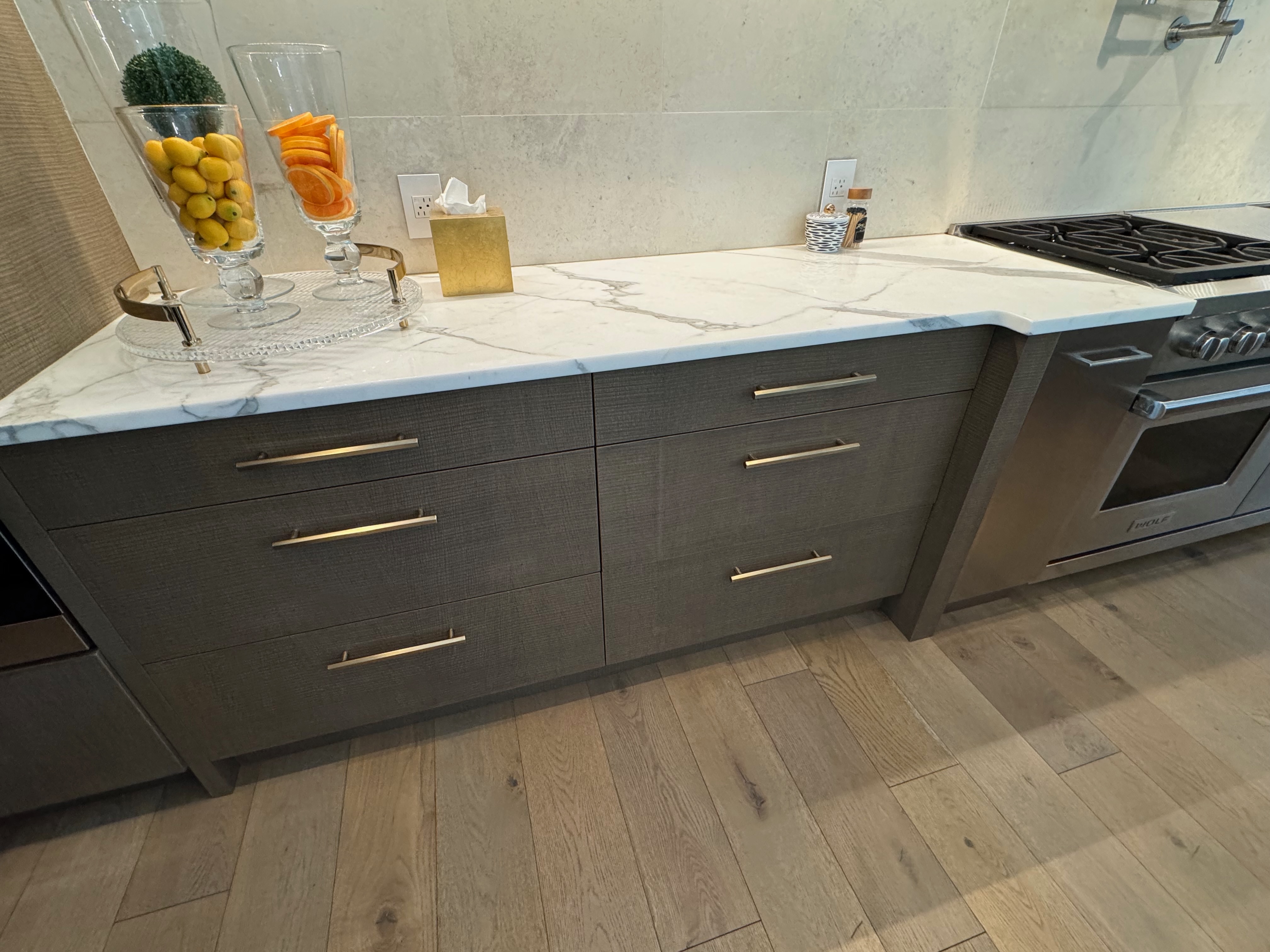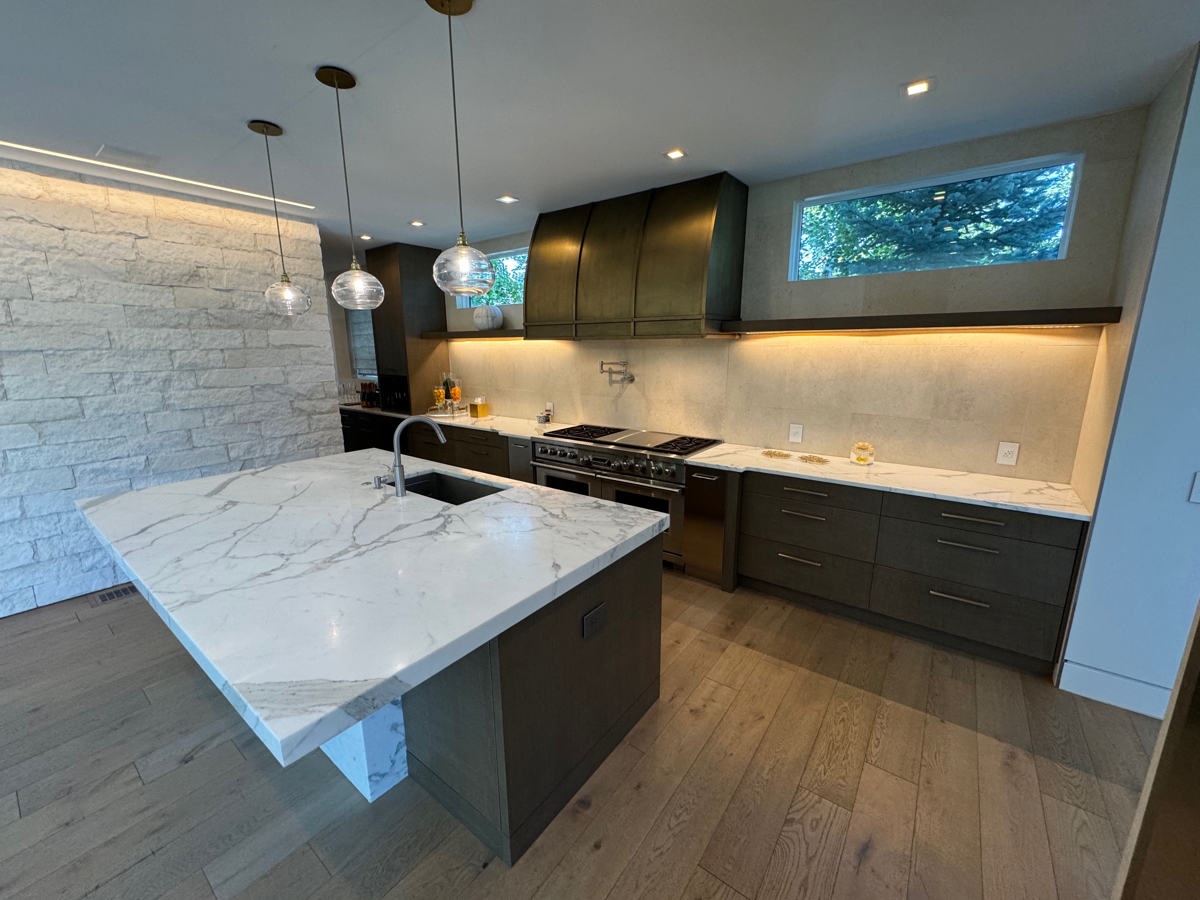 Stunning! Very high-end William Ohs Kitchen cabinetry in a vertical grain re-sawn white oak veneer with a custom brown with flat sheen finish with raking. Like new, Only 6 years old! The drawers are dovetail, soft-close with full extension and Emtek door/ drawer Hex pulls. The Kitchen package includes a 48” Wolf Stainless Steel dual fuel range, Sub-Zero Refrigerator and Freezer columns + other appliances. The kitchen has gorgeous marble countertops with a marble waterfall island as a focal point along with a stunning one of a kind custom made William Ohs glass door and leather wrapped bar! The kitchen also comes with tall pantry cabinets and a matching desk. The kitchen package has been carefully removed by licensed contractors and moved to storage. Drawings can be emailed. Price for the package below.