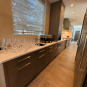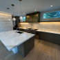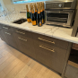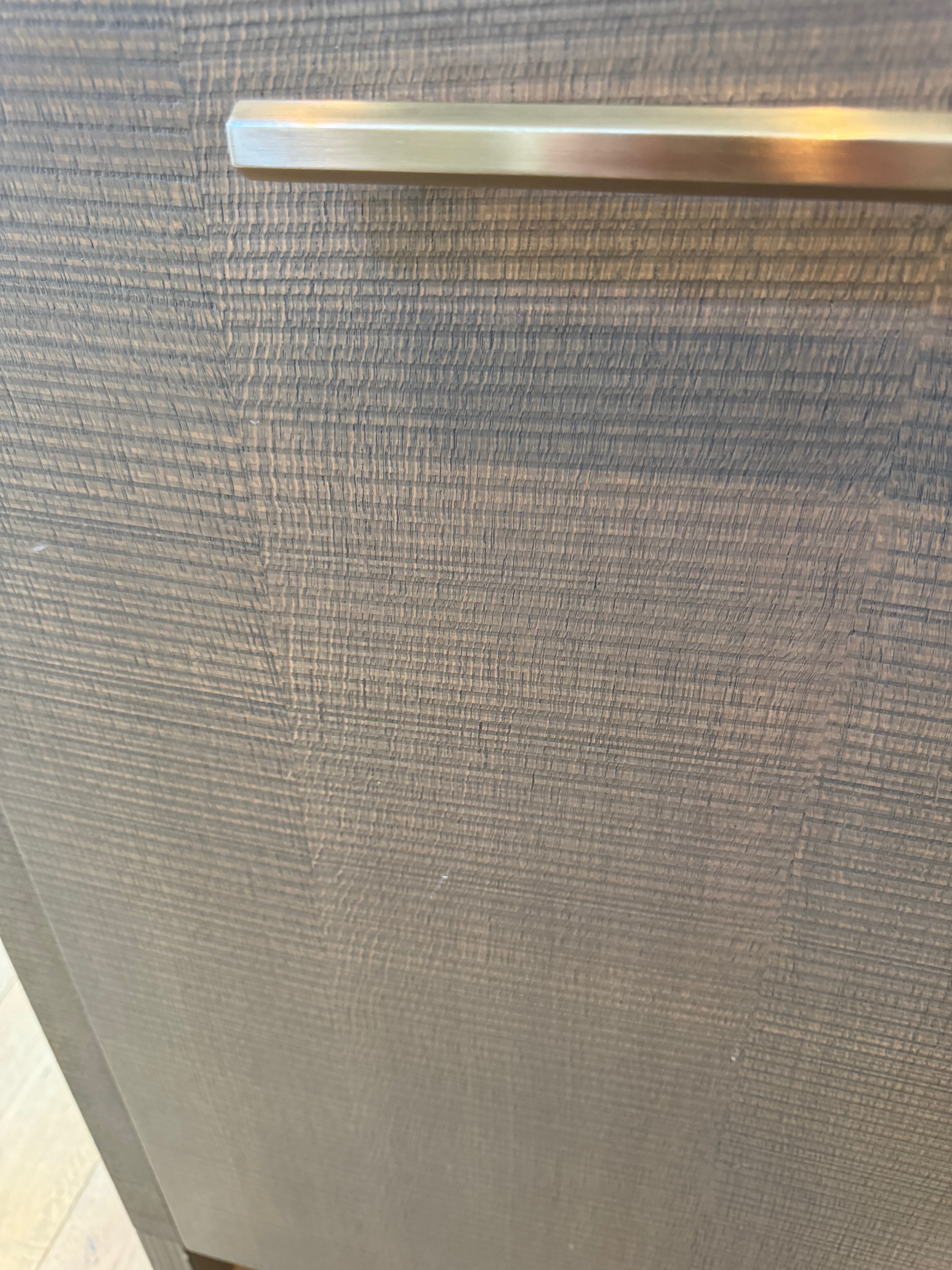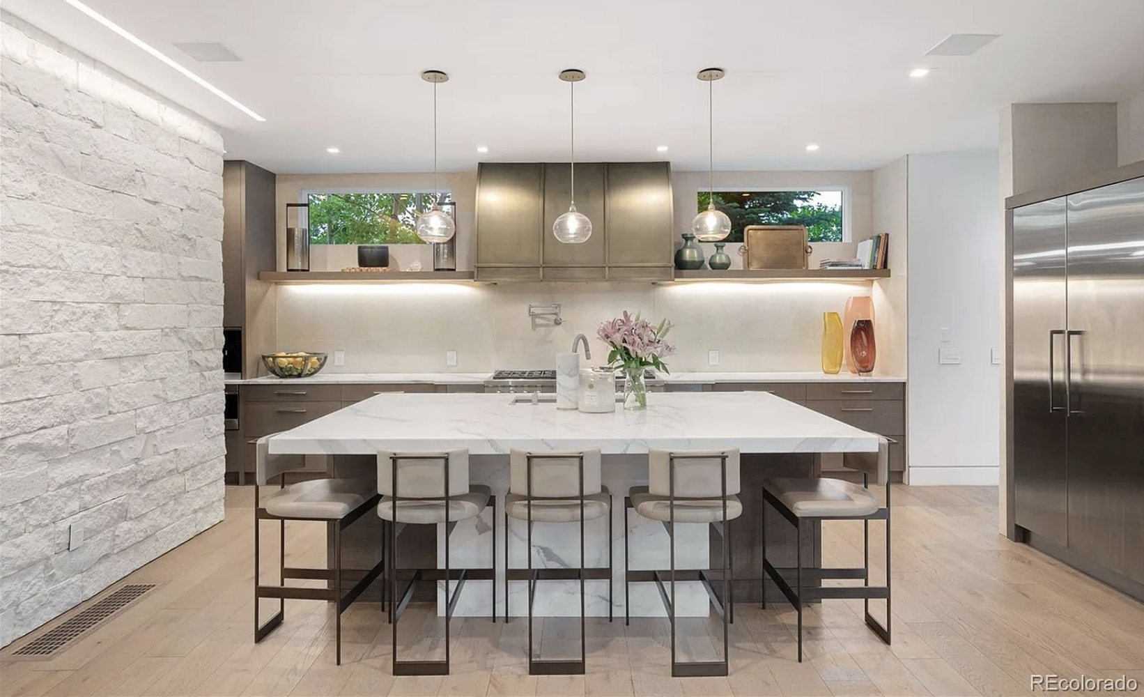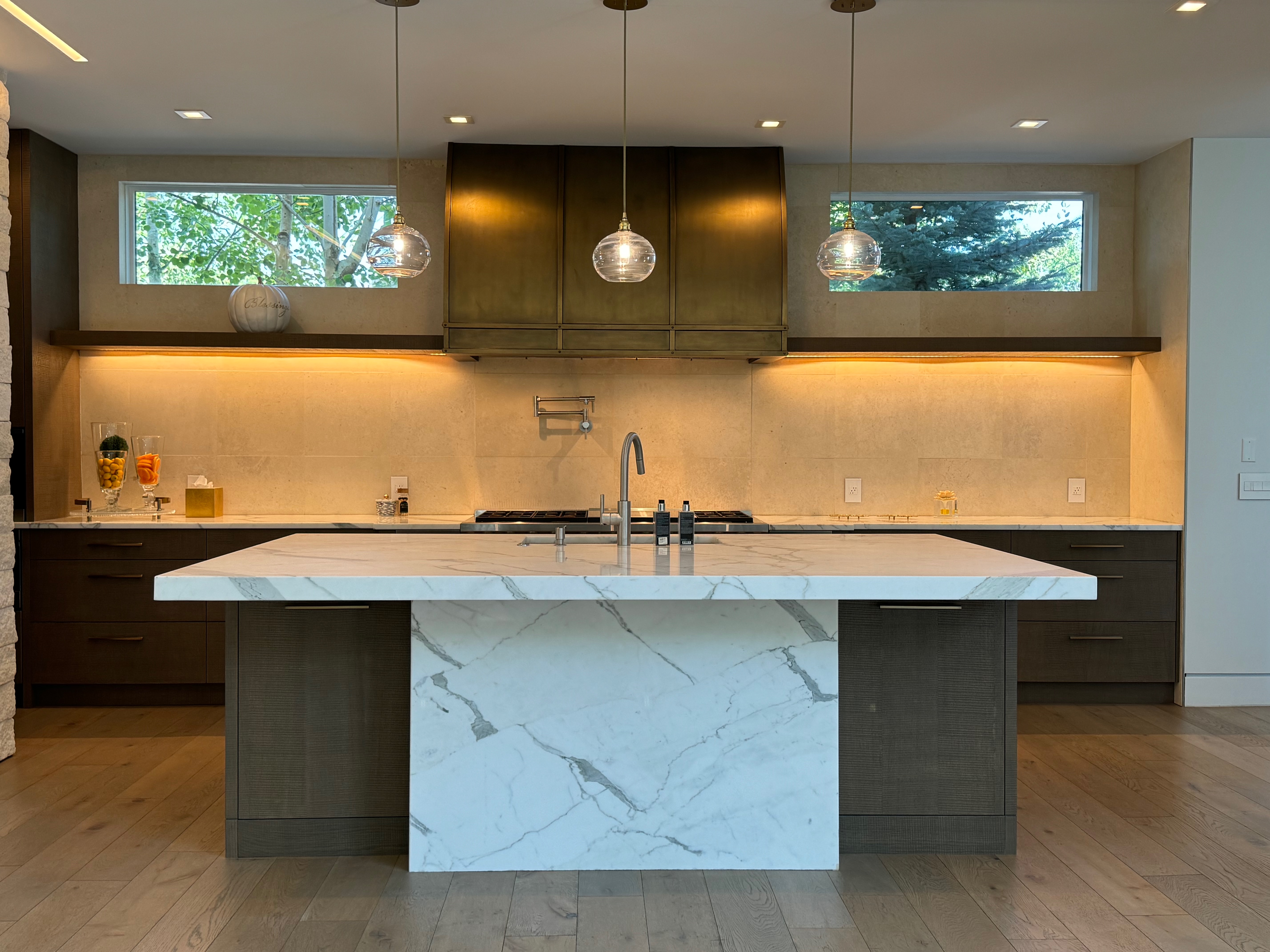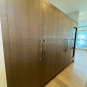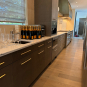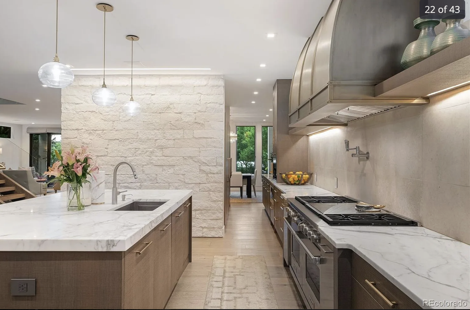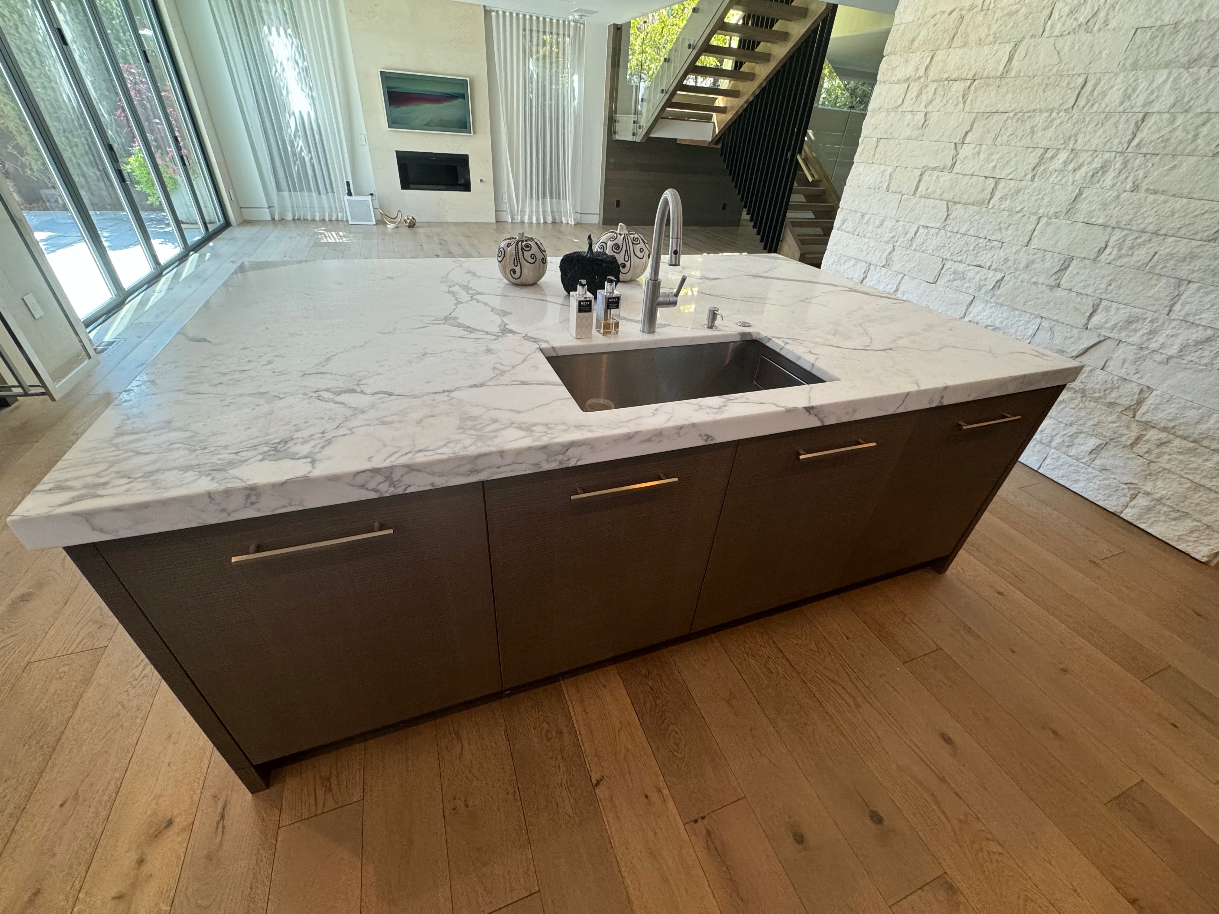 Stunning! Very high-end William Ohs Kitchen cabinetry in a vertical grain re-sawn white oak veneer with a custom brown with flat sheen finish with raking. Like new, Only 6 years old! The drawers are dovetail, soft-close with full extension and Emtek door/ drawer Hex pulls. The Kitchen package includes a 48” Wolf Stainless Steel dual fuel range, Sub-Zero Refrigerator and Freezer columns + other appliances. The kitchen has gorgeous marble countertops with a marble waterfall island as a focal point along with a stunning one of a kind custom made William Ohs glass door and leather wrapped bar! The kitchen also comes with tall pantry cabinets and a matching desk. The kitchen package has been carefully removed by licensed contractors and moved to storage. Drawings can be emailed. Price for the package below.