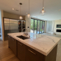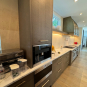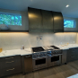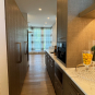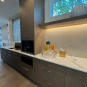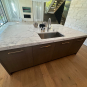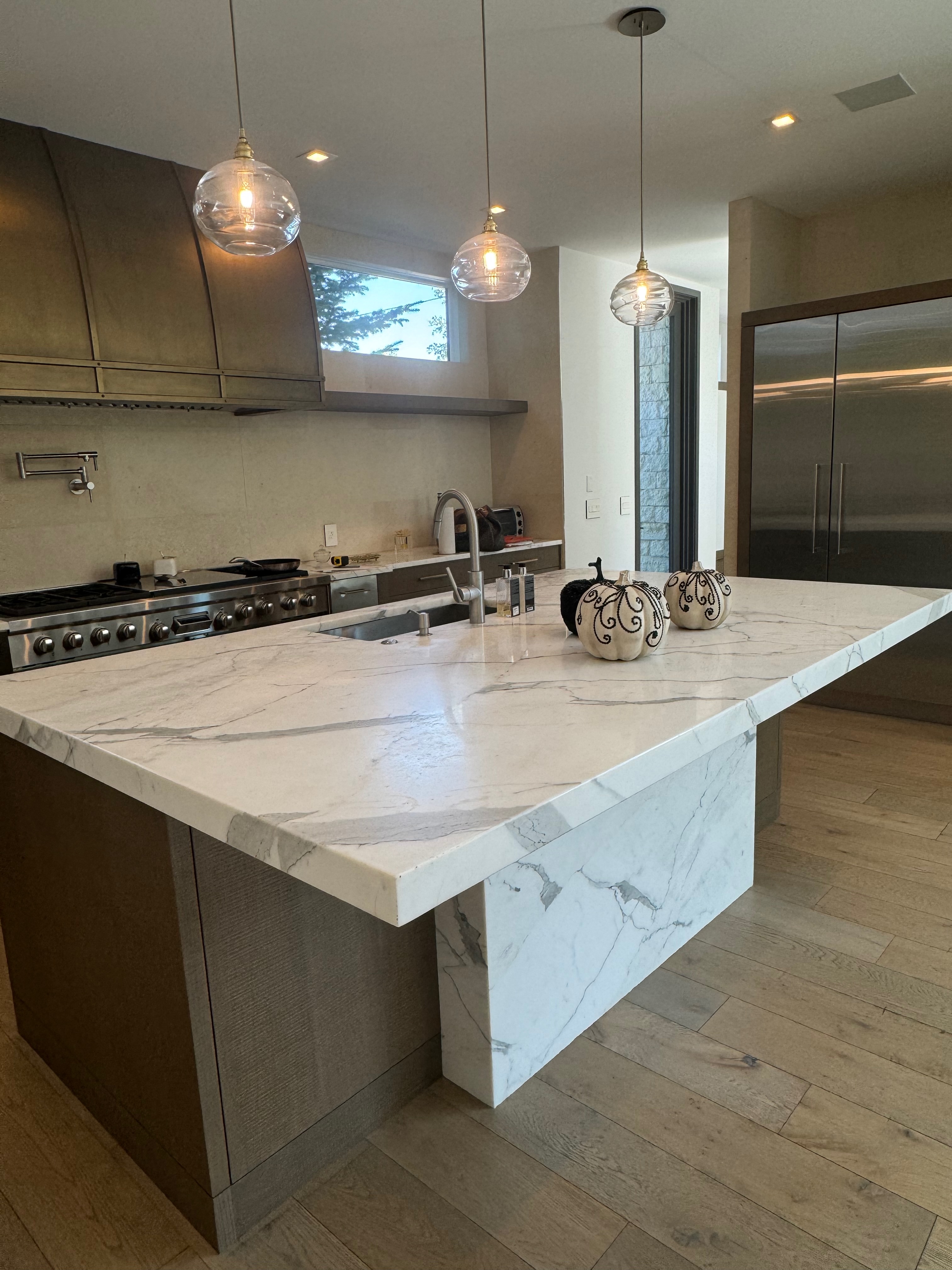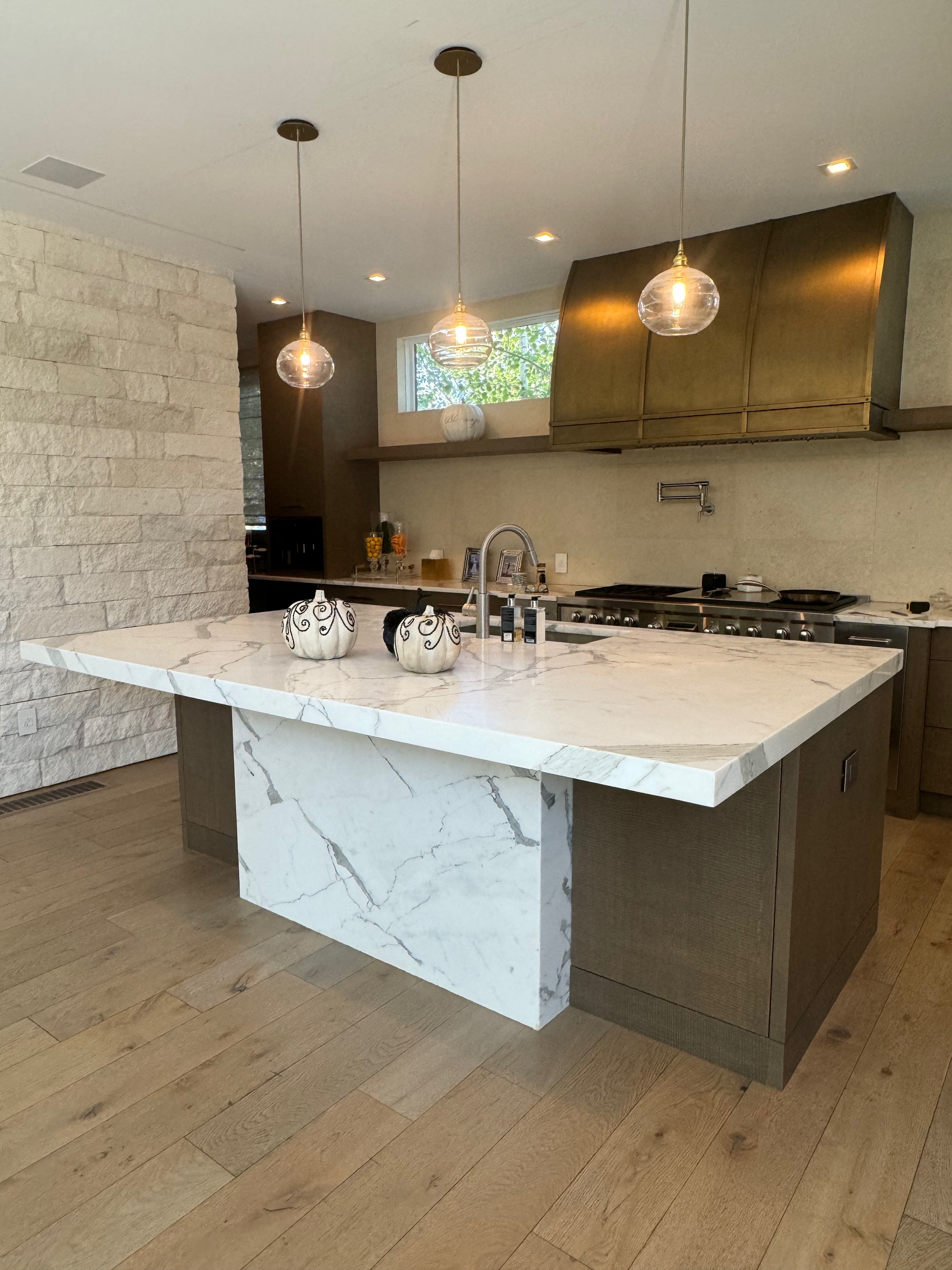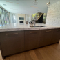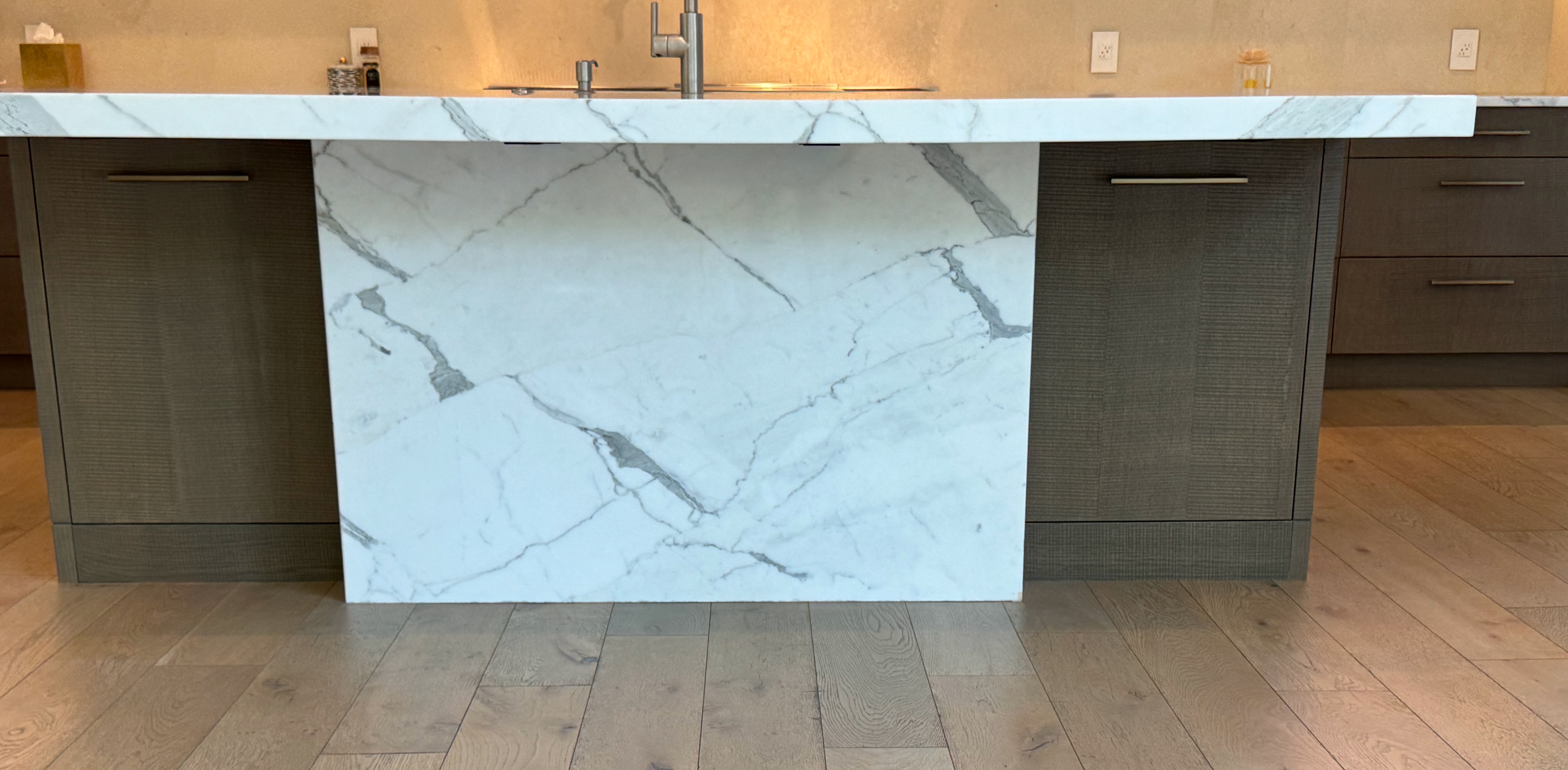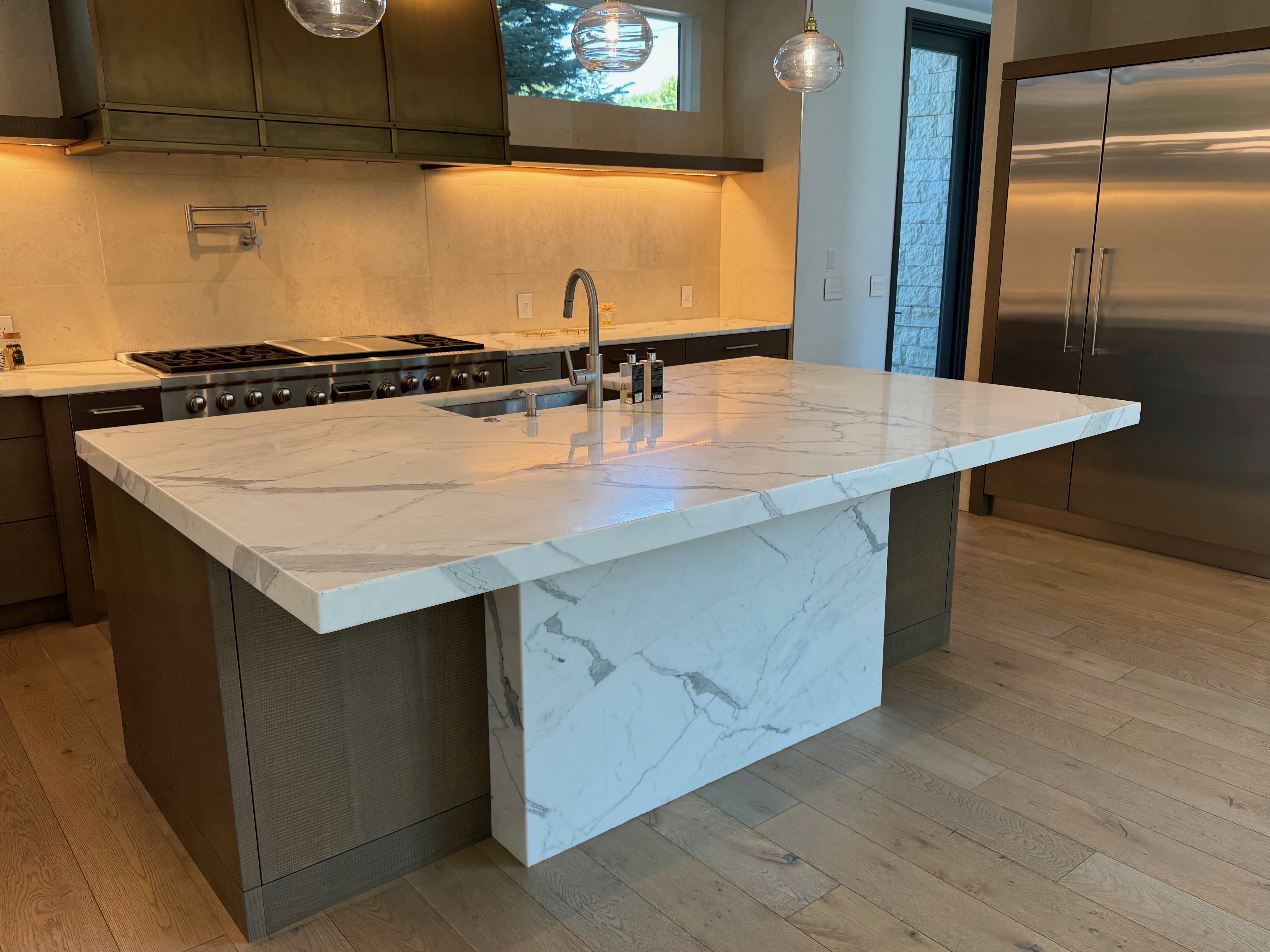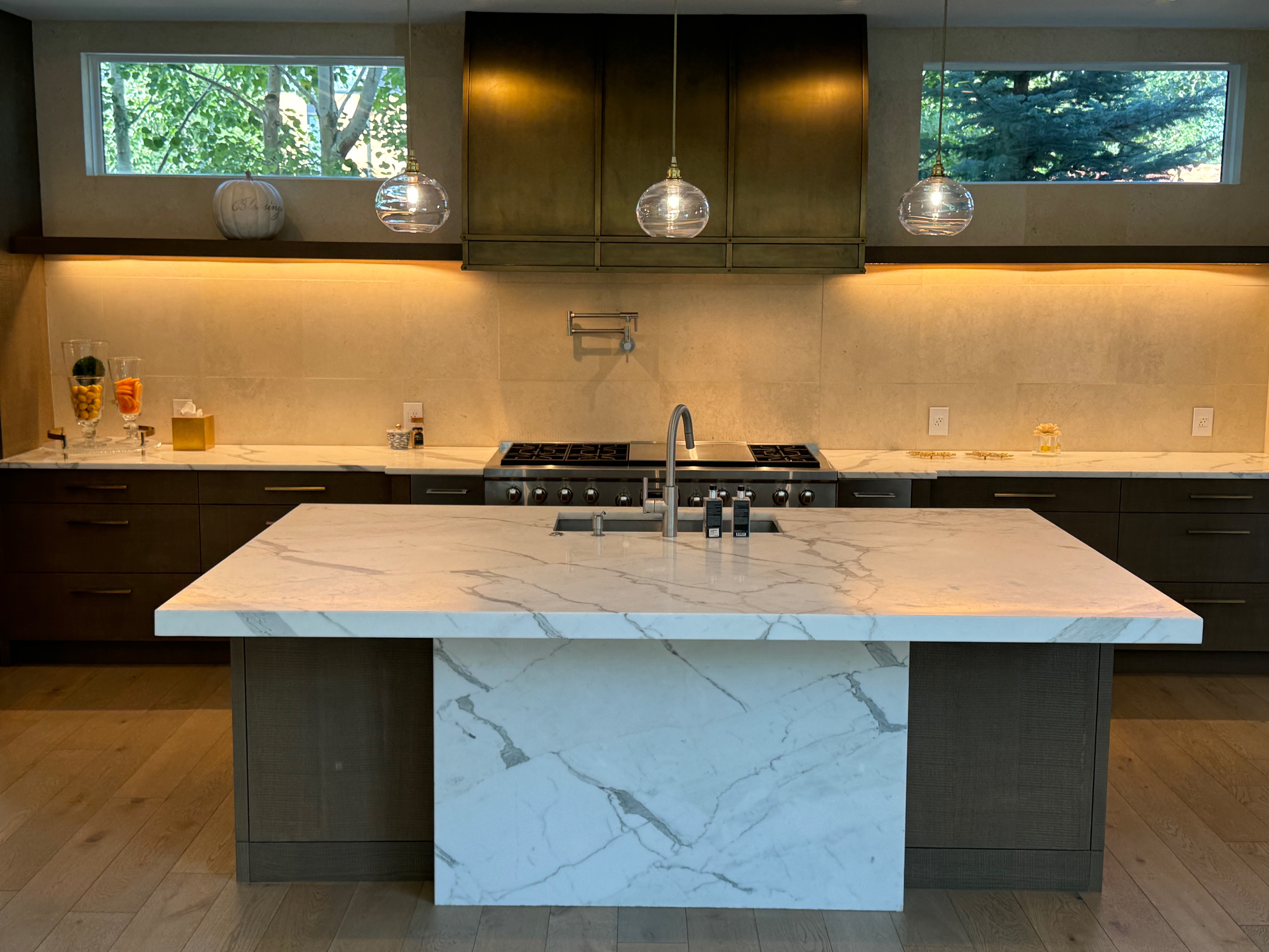 Stunning! Very high-end William Ohs Kitchen cabinetry in a vertical grain re-sawn white oak veneer with a custom brown with flat sheen finish with raking. Like new, Only 6 years old! The drawers are dovetail, soft-close with full extension and Emtek door/ drawer Hex pulls. The Kitchen package includes a 48” Wolf Stainless Steel dual fuel range, Sub-Zero Refrigerator and Freezer columns + other appliances. The kitchen has gorgeous marble countertops with a marble waterfall island as a focal point along with a stunning one of a kind custom made William Ohs glass door and leather wrapped bar! The kitchen also comes with tall pantry cabinets and a matching desk. The kitchen package has been carefully removed by licensed contractors and moved to storage. Drawings can be emailed. Price for the package below.