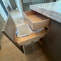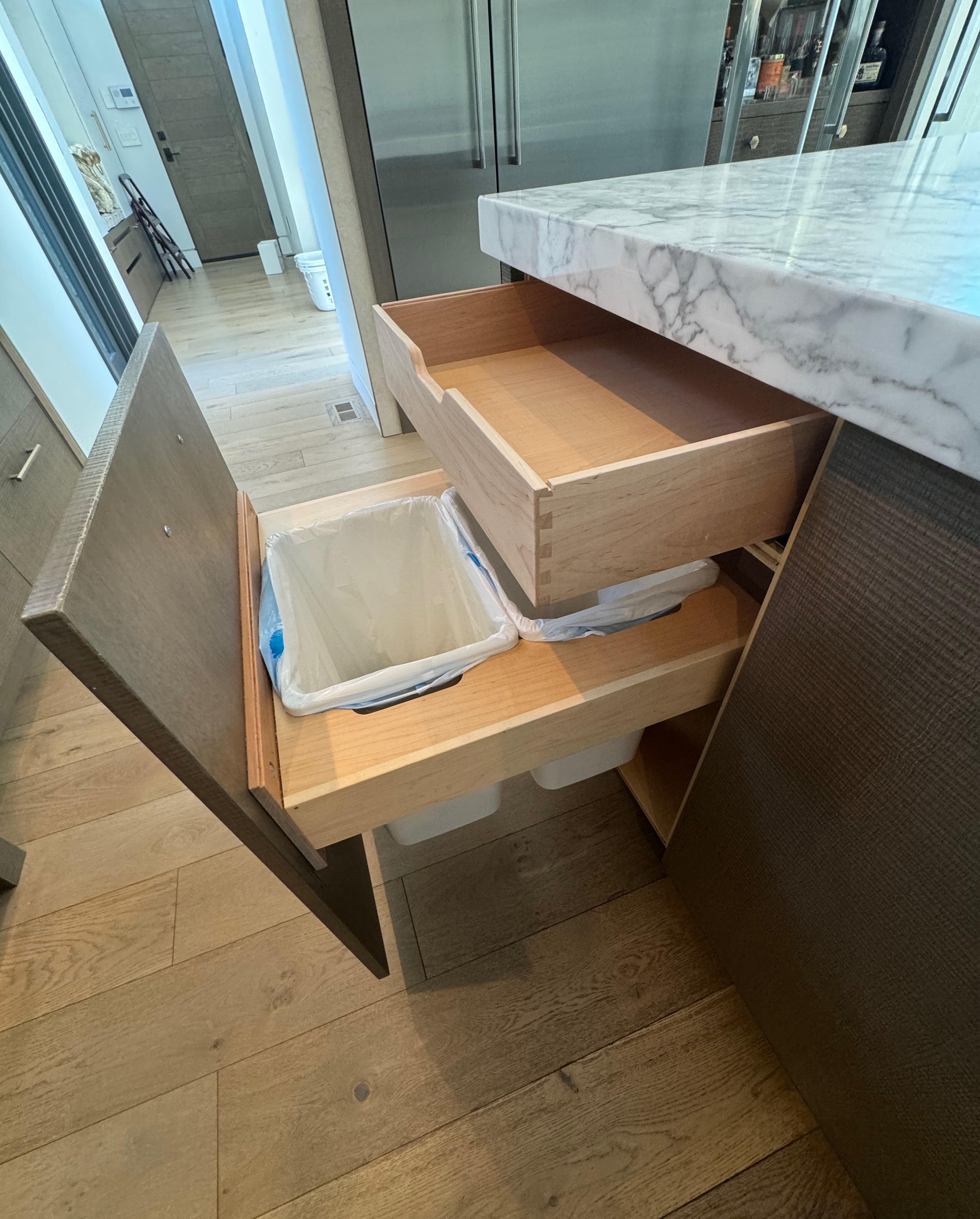 1-One pull-out door with two trash cans base cabinets Dim.: 24”w x 36”h x 24”d