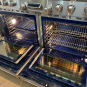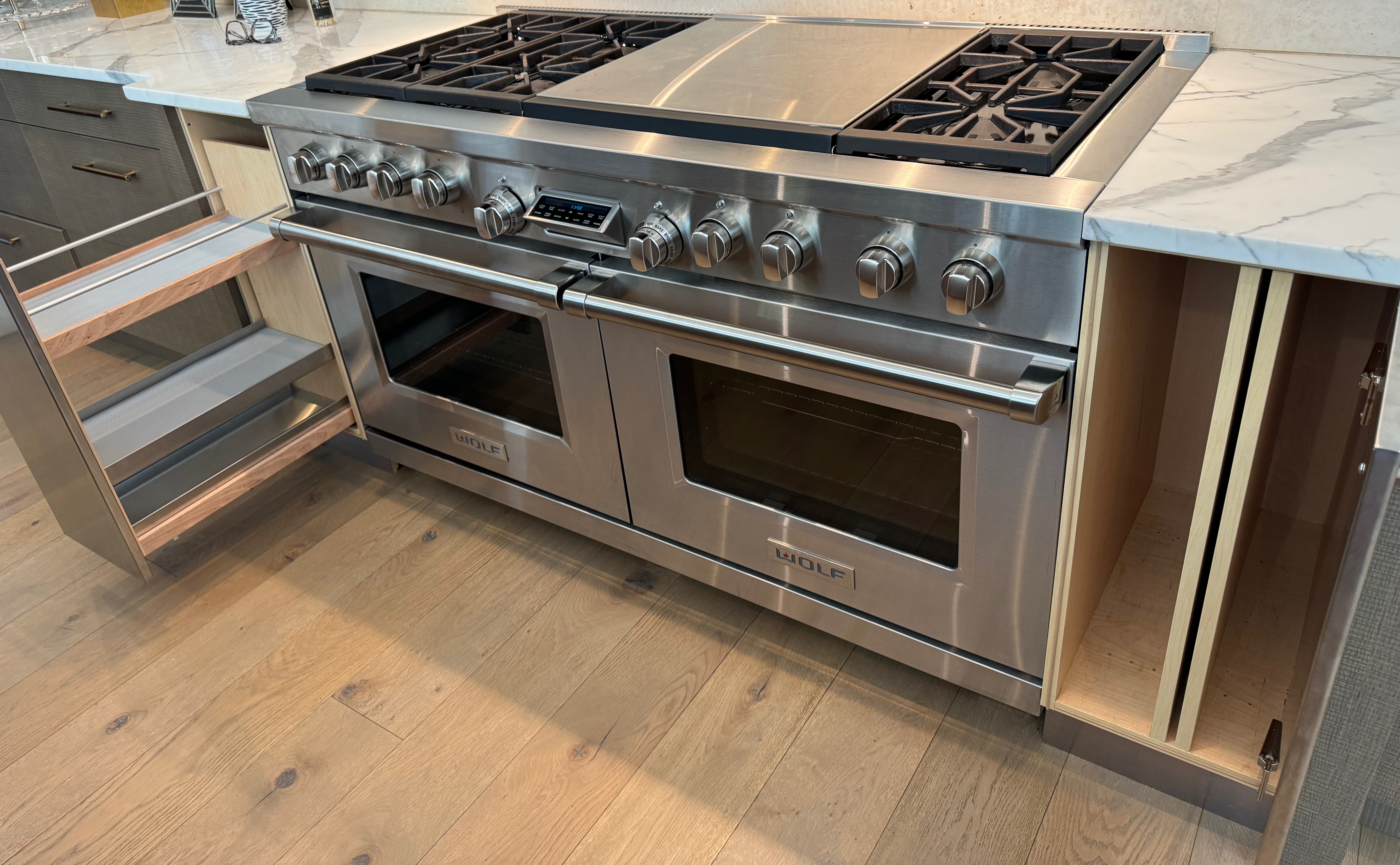 2-One door pull-out Stainless-Steel front cabinets on each side of the range. One has a spice rack the other has dividers for platters/cookie sheets Dim.: 12"w x 36"h x 24"d *3" pillars on each side framing the s/s cabinets and range